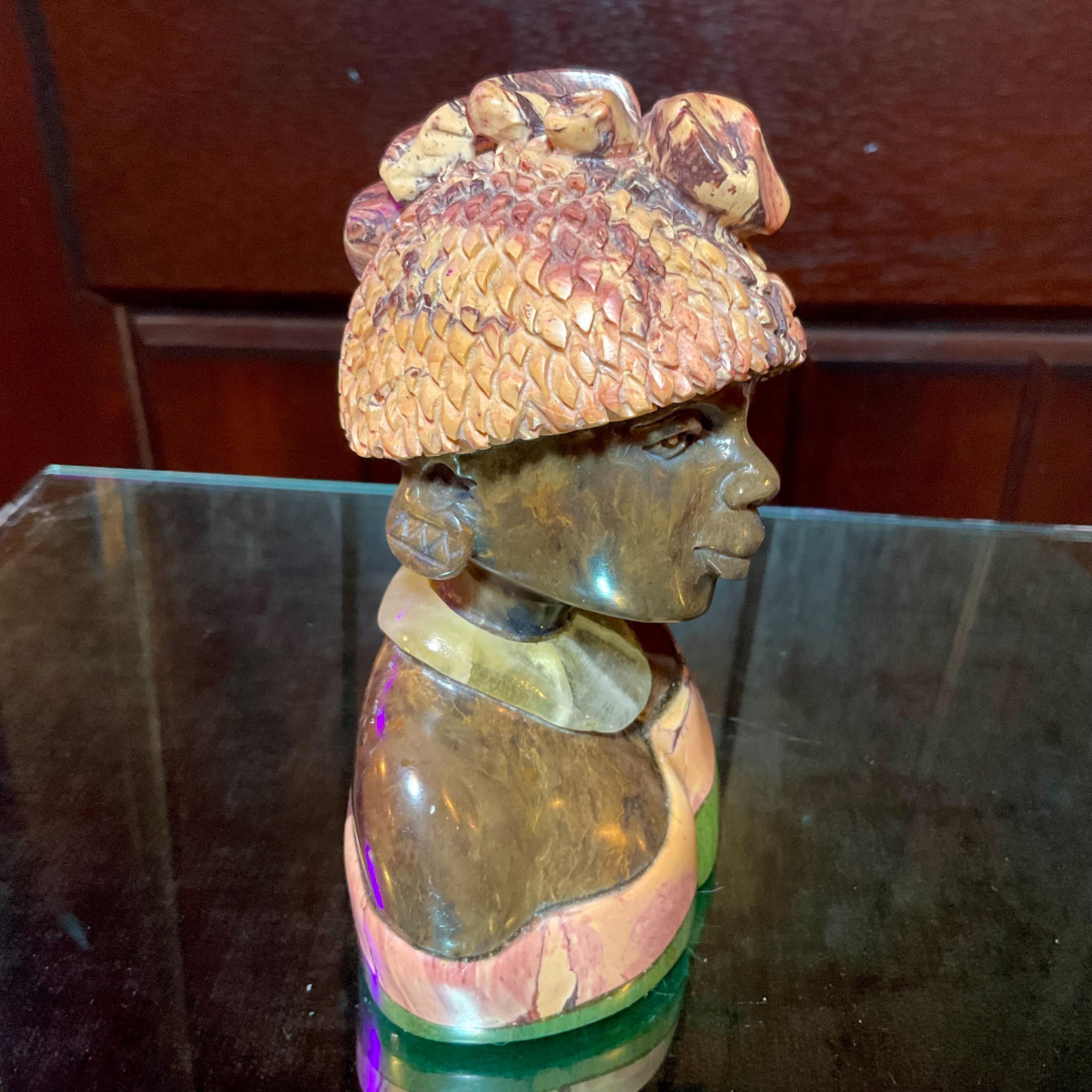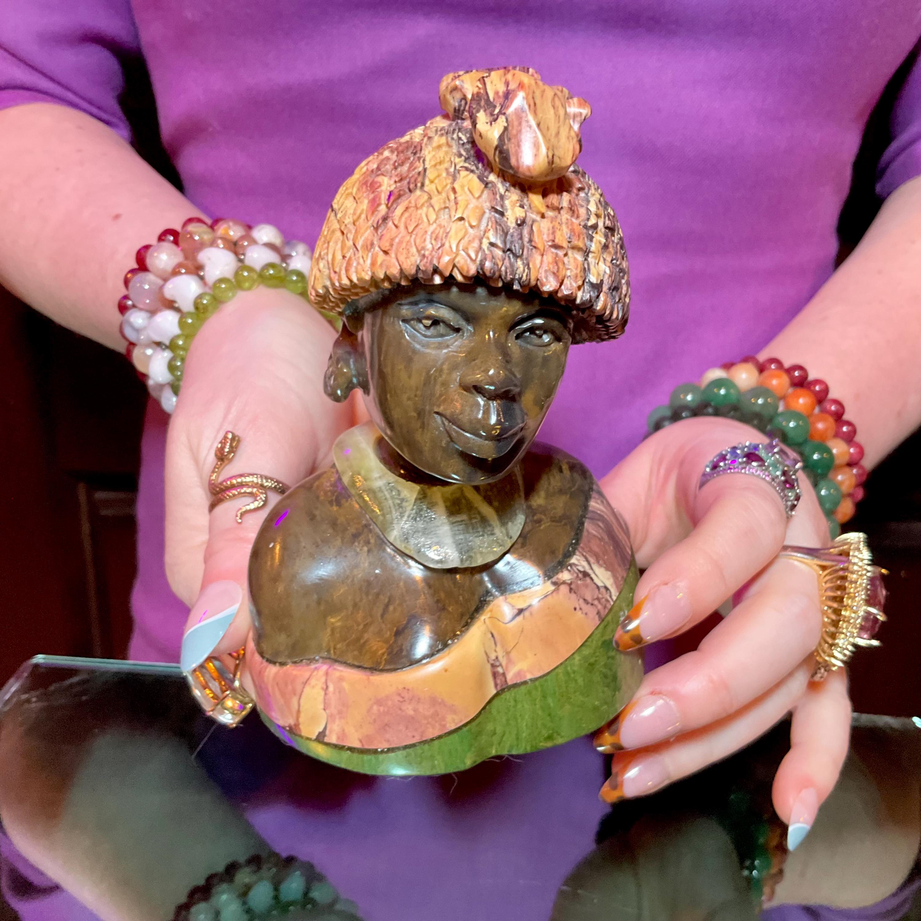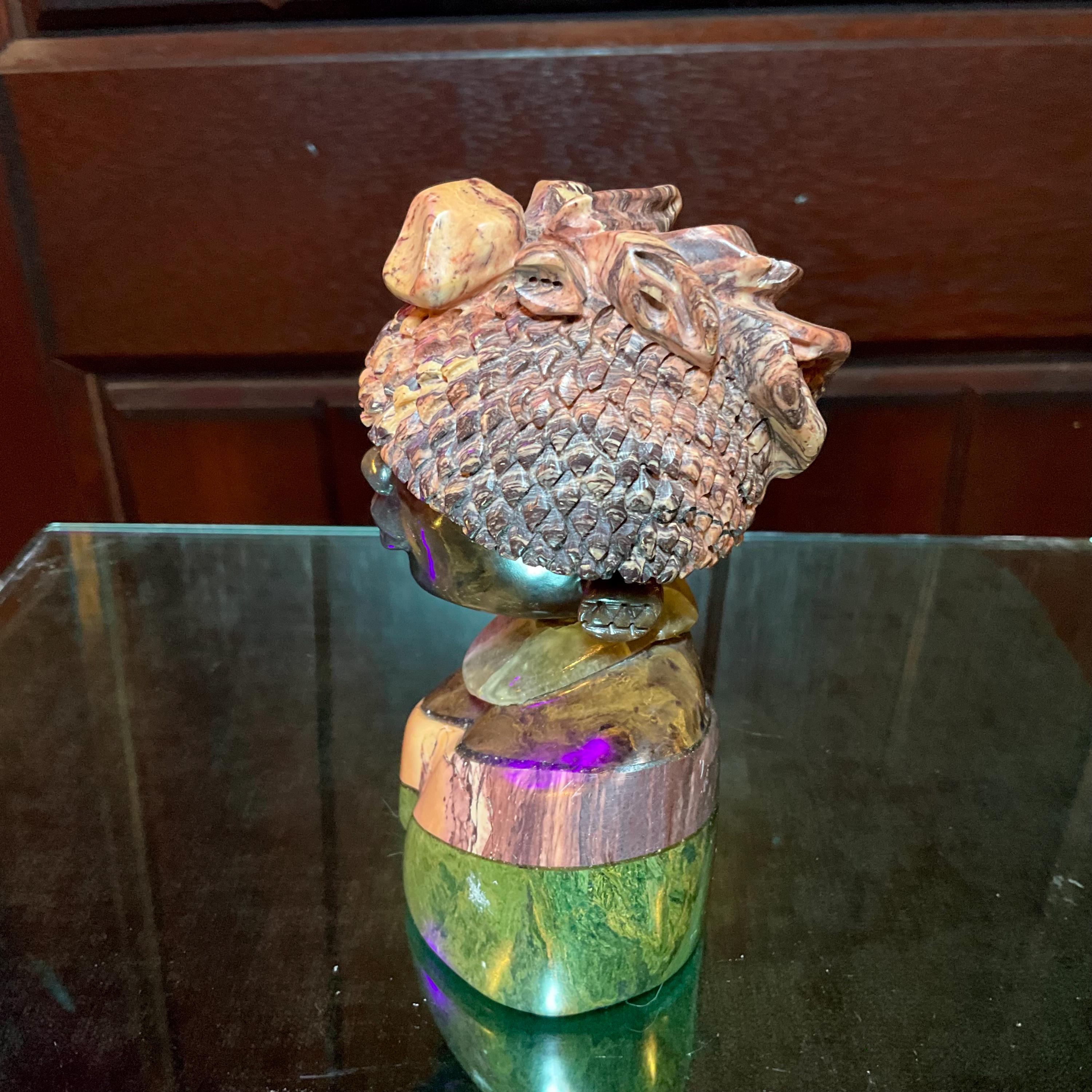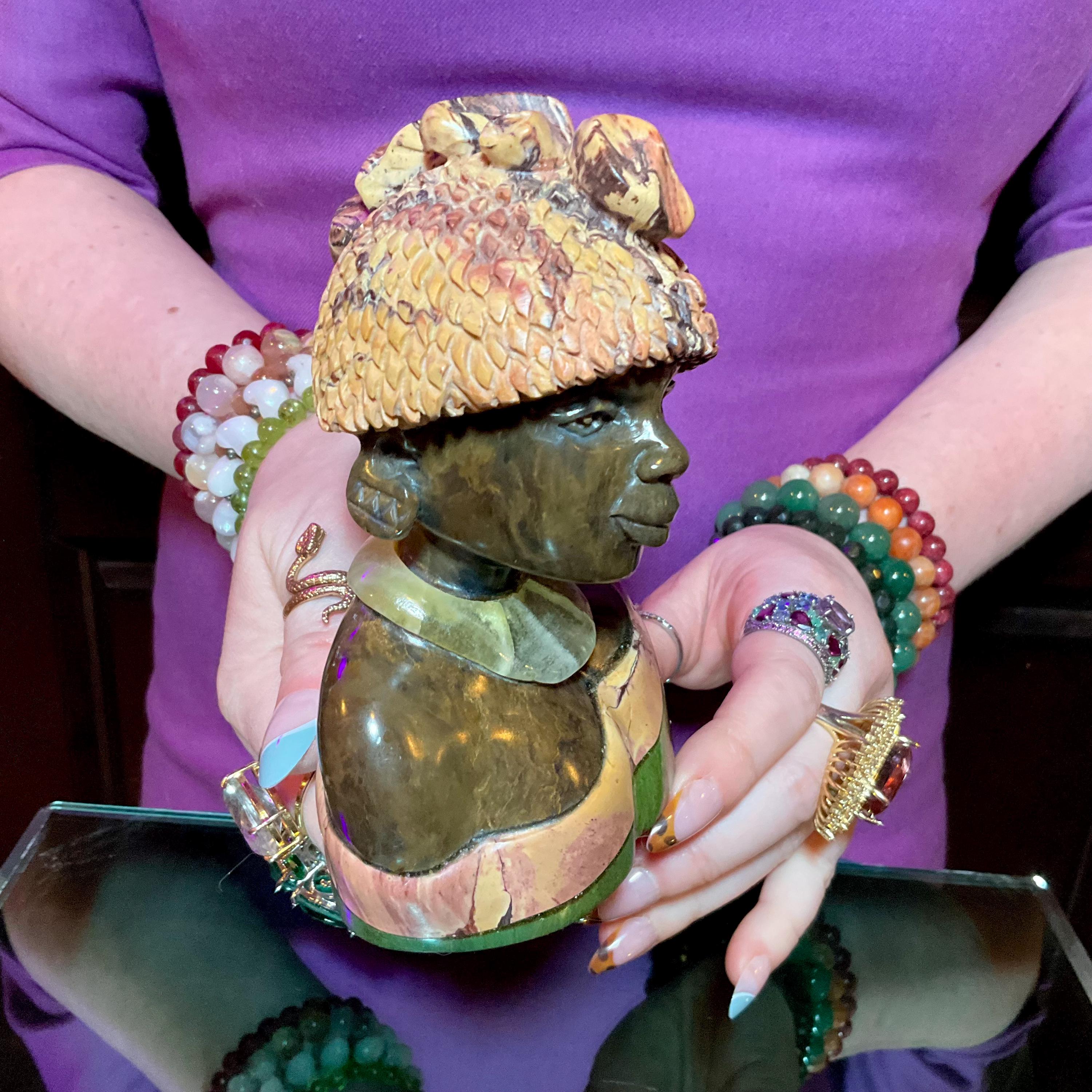 Vintage Serpentine Hand Carved Zimbabwean Witch Doctor Sculpture ~ 5" Tall ~ Swirling Green, White, Pink & Black Colors ~ Museum Quality