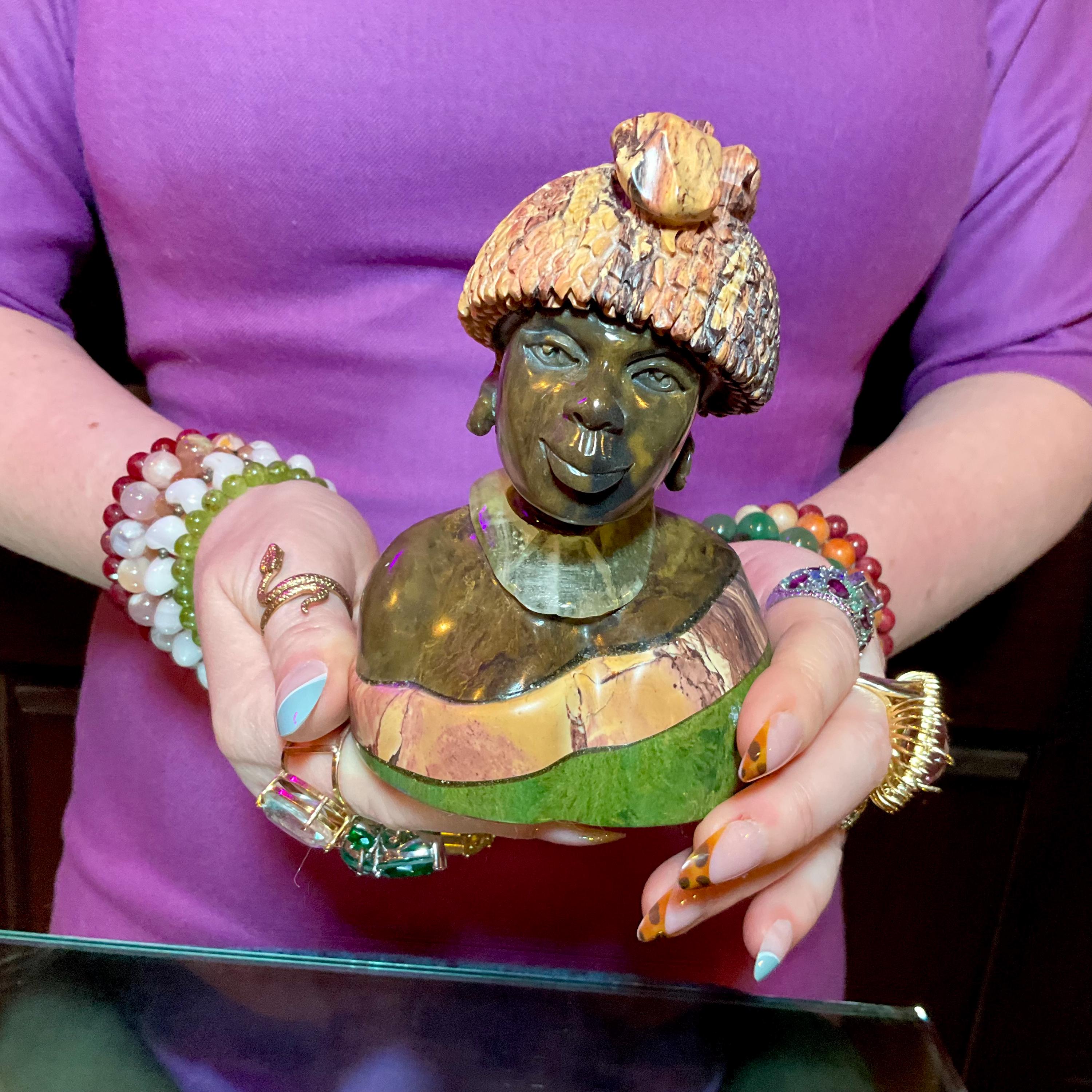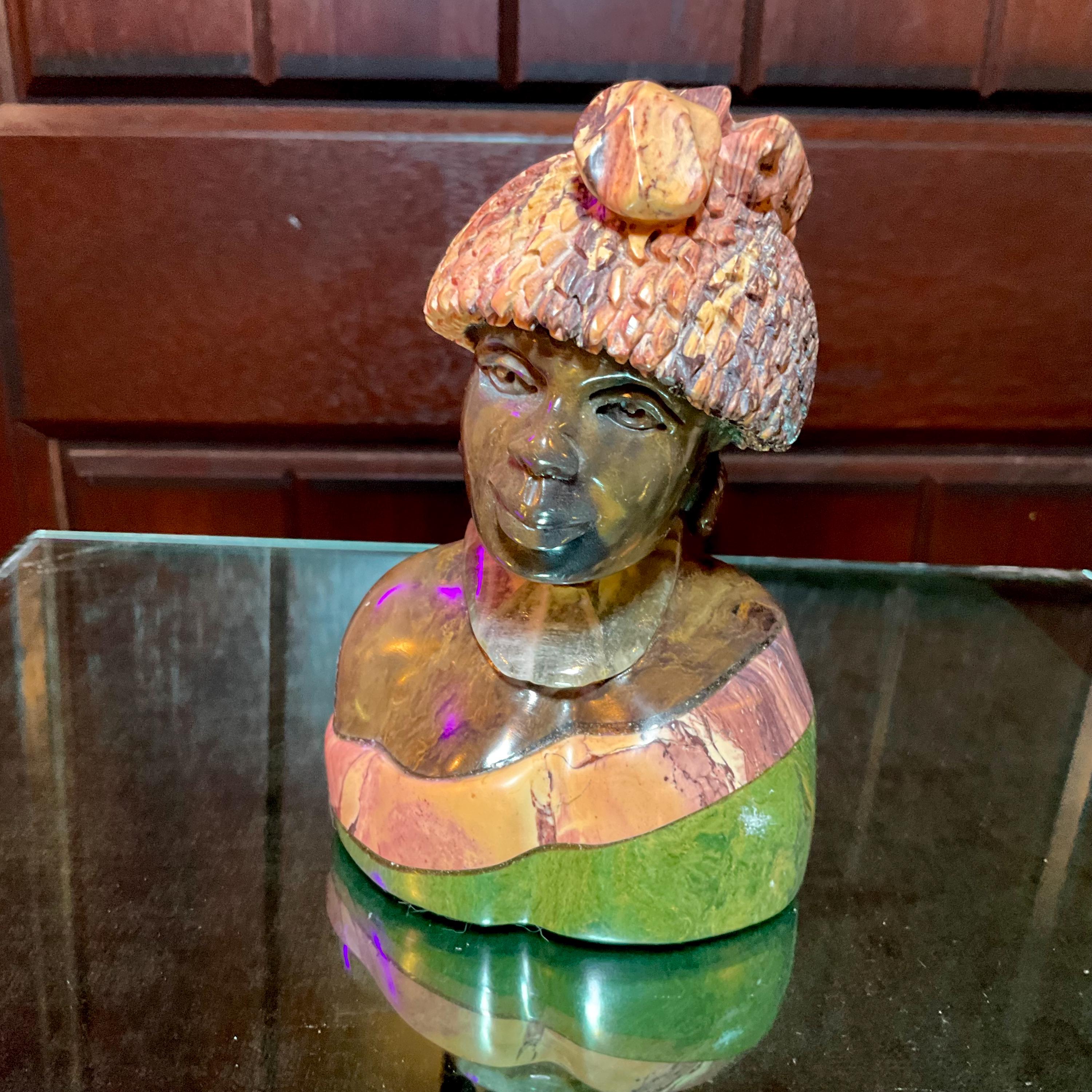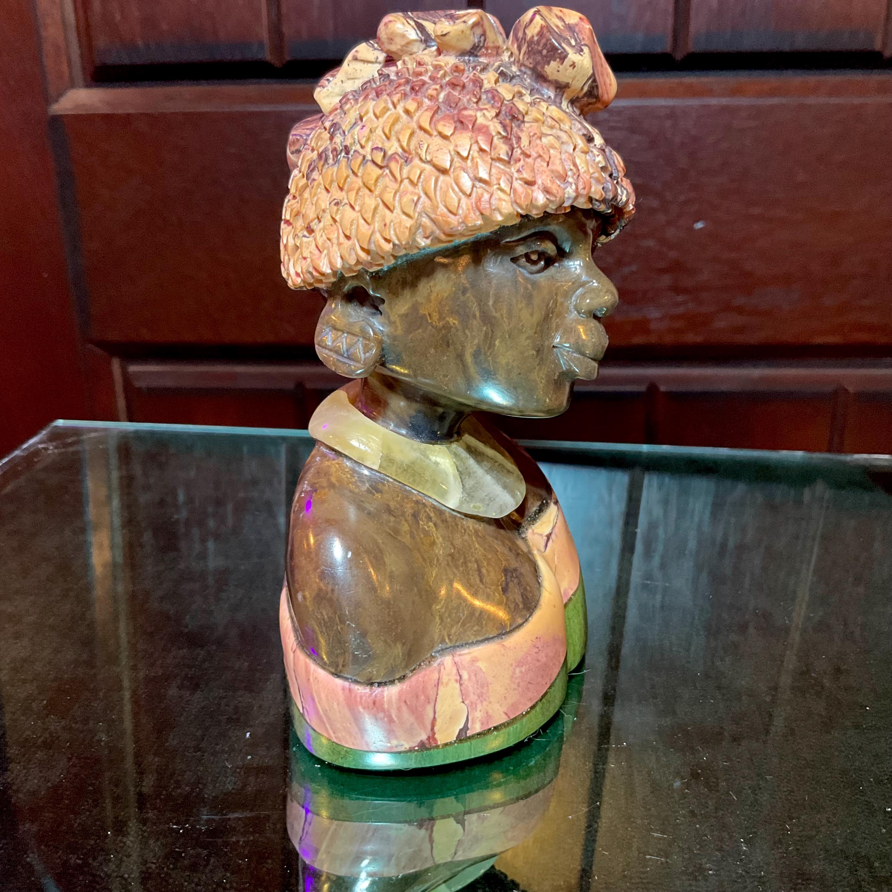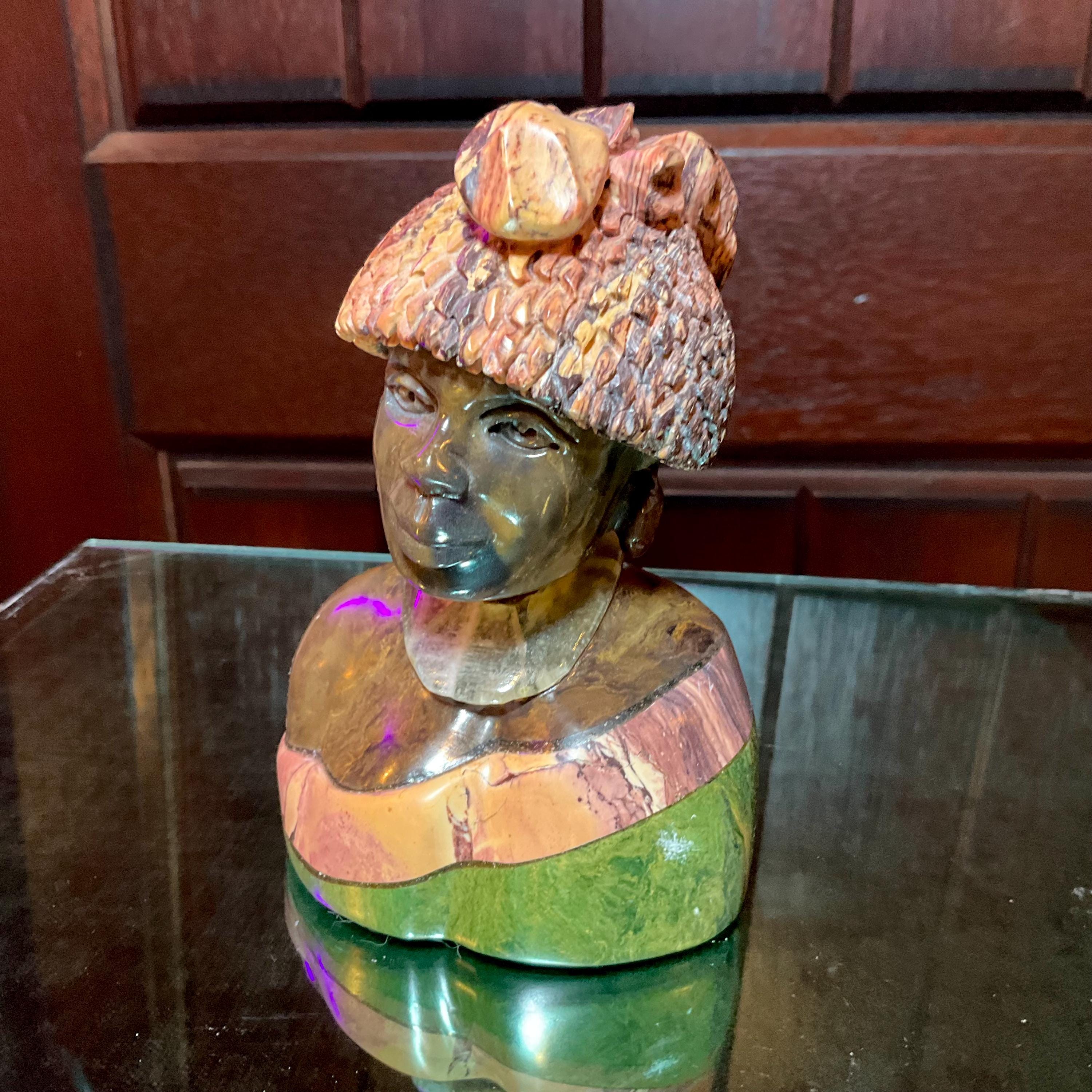 Vintage Serpentine Hand Carved Zimbabwean Witch Doctor Sculpture ~ 5" Tall ~ Swirling Green, White, Pink & Black Colors ~ Museum Quality