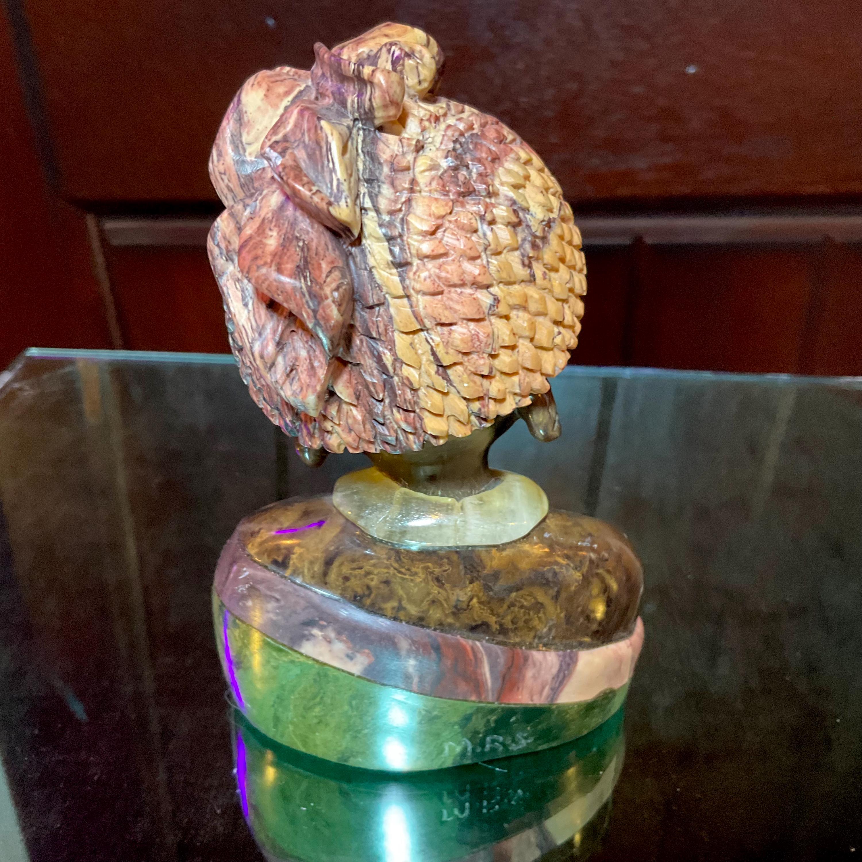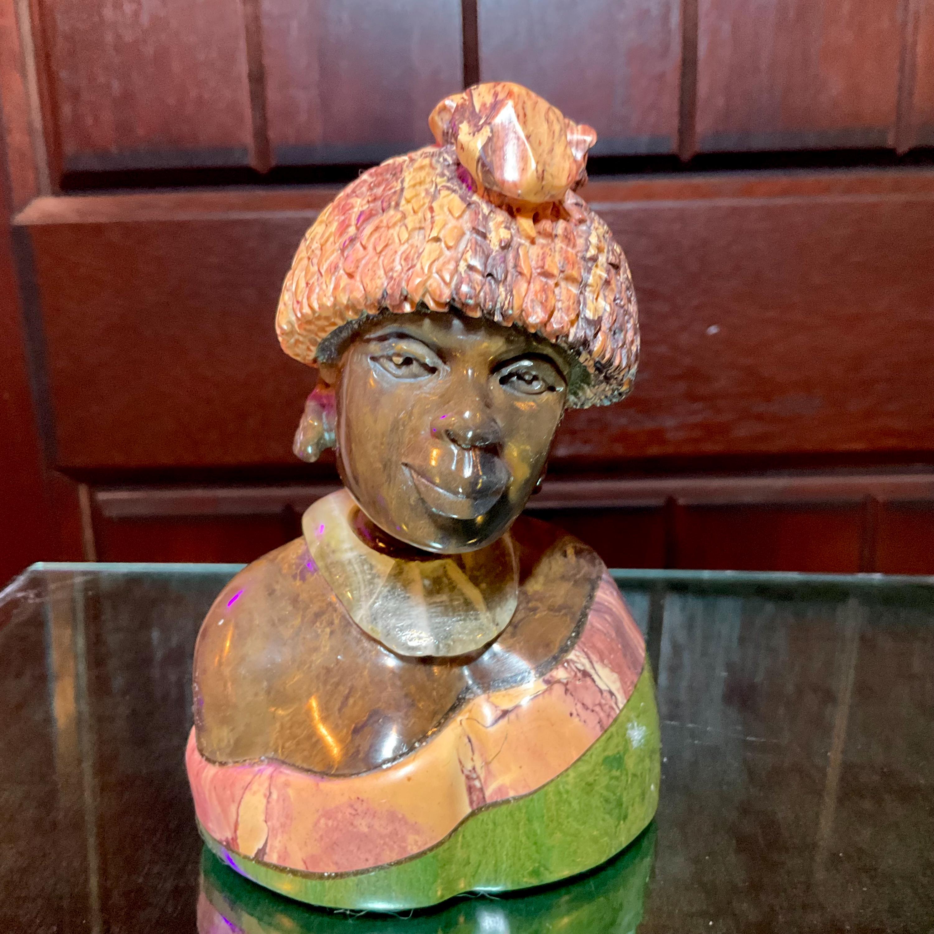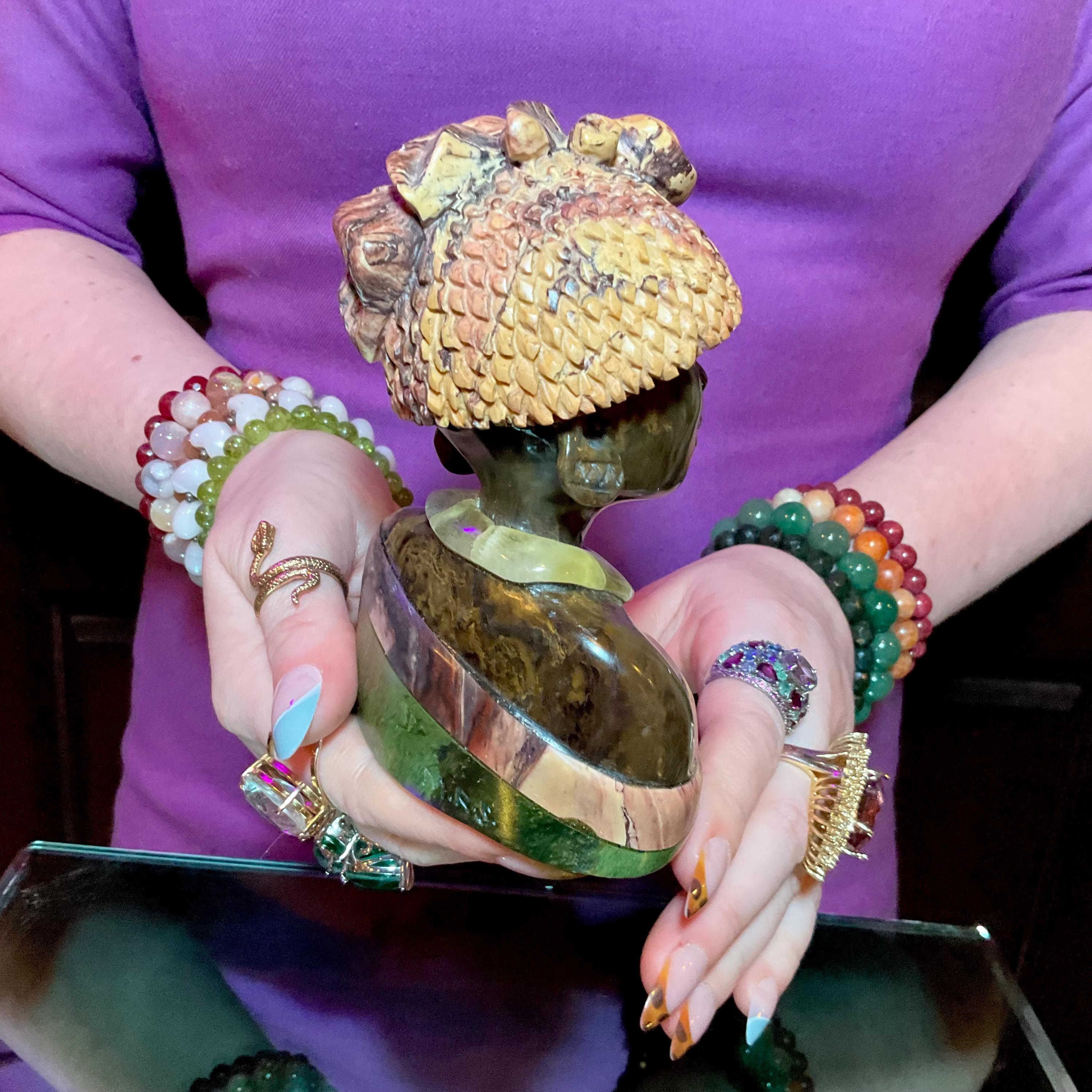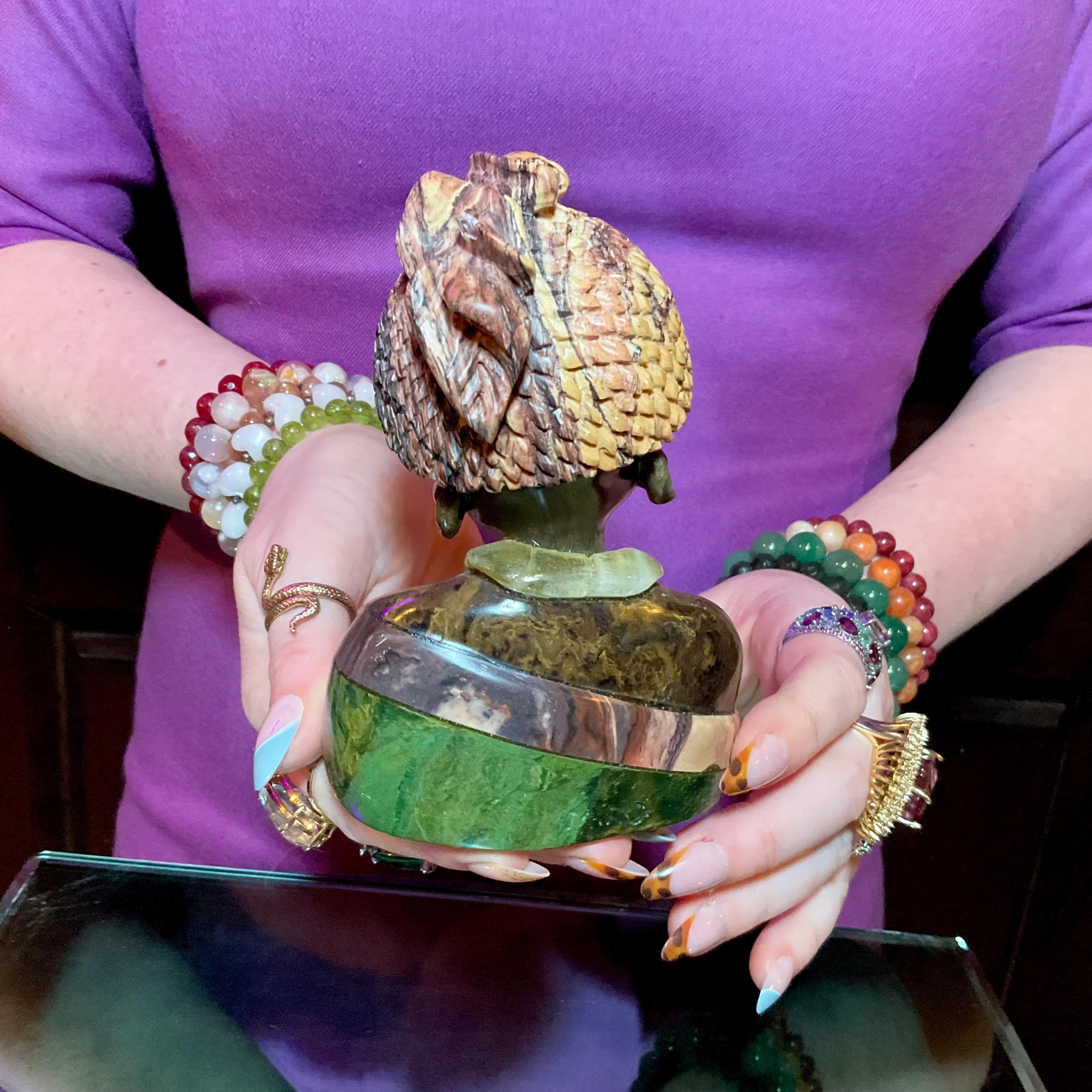 Vintage Serpentine Hand Carved Zimbabwean Witch Doctor Sculpture ~ 5" Tall ~ Swirling Green, White, Pink & Black Colors ~ Museum Quality