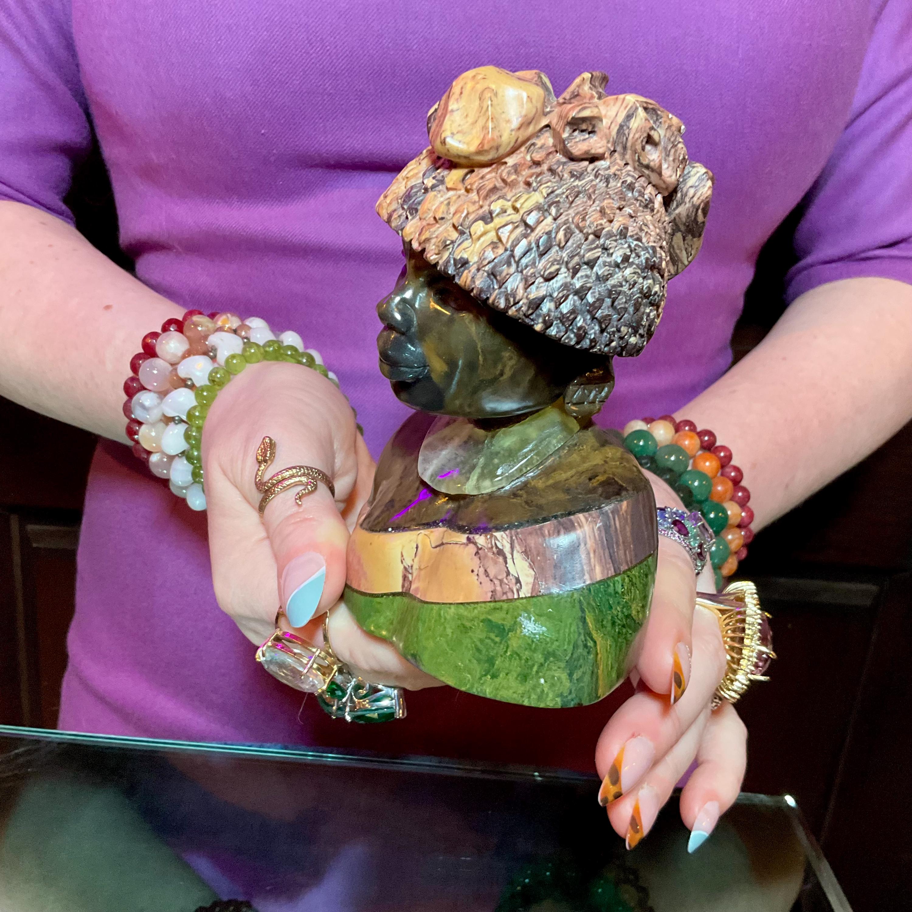 The beautifully layered stones are green Serpentine, pink Jasper, white Quartz, and Green Verdite so perfectly blended only a skilled Zimbabwean sculptor could create.