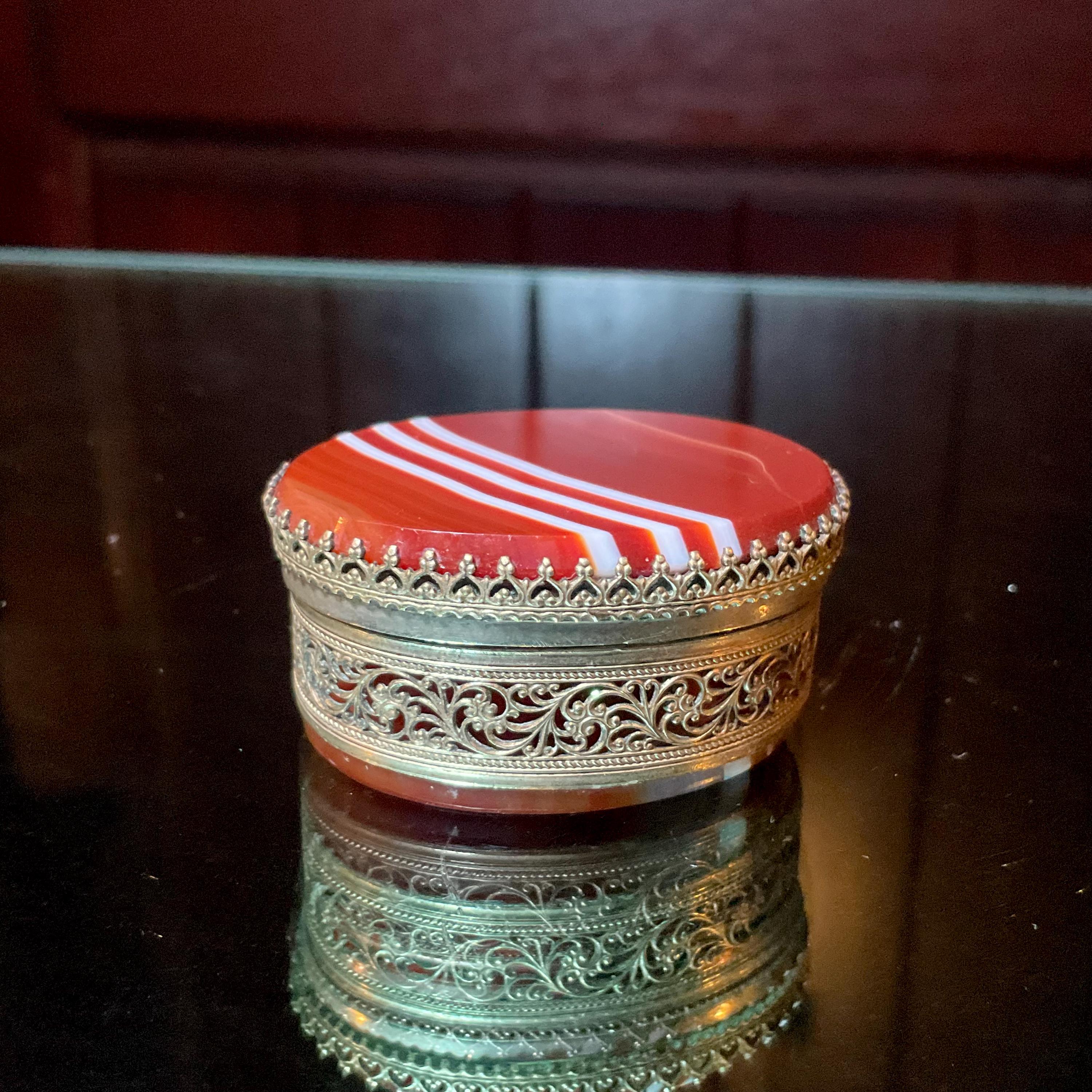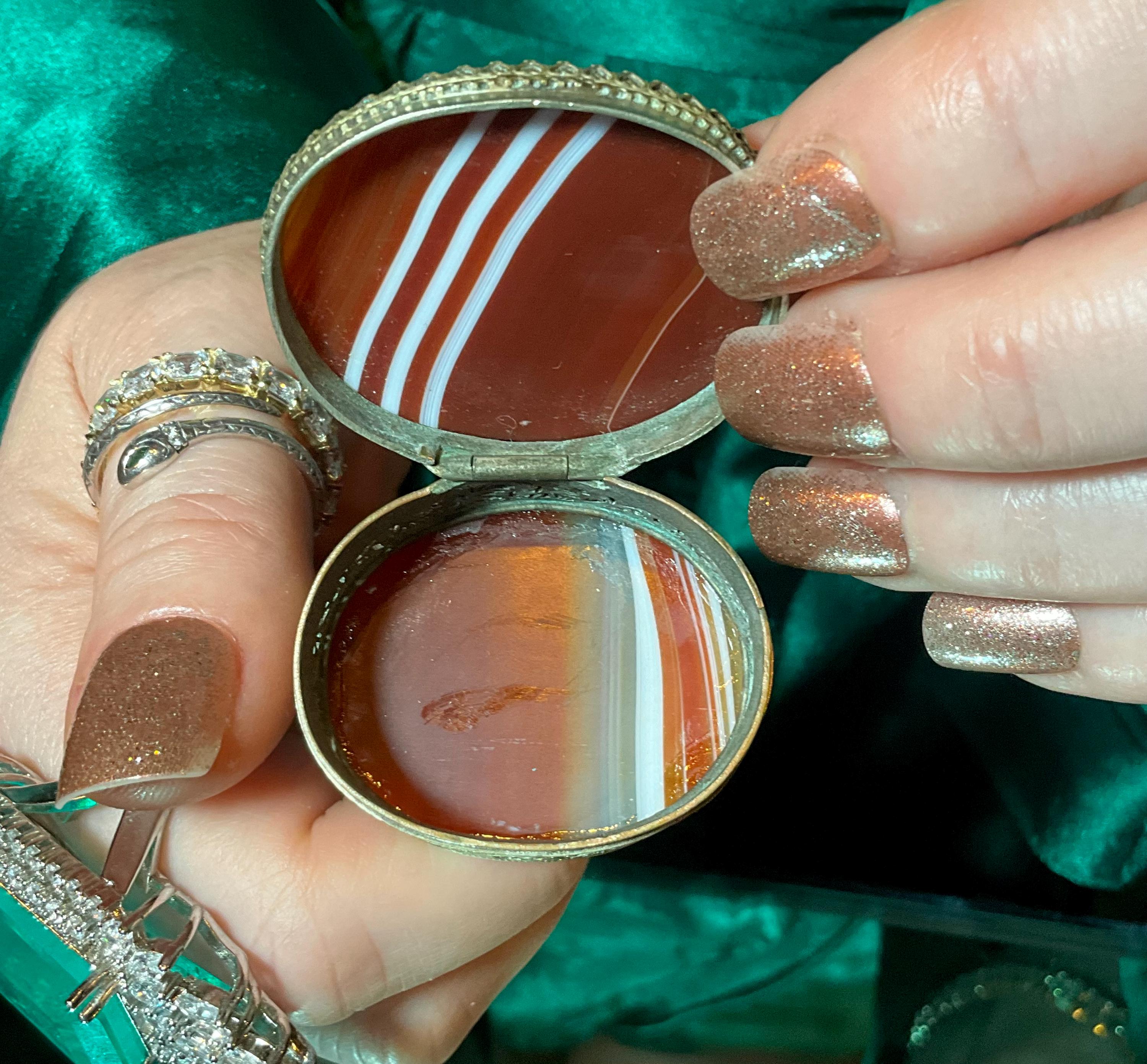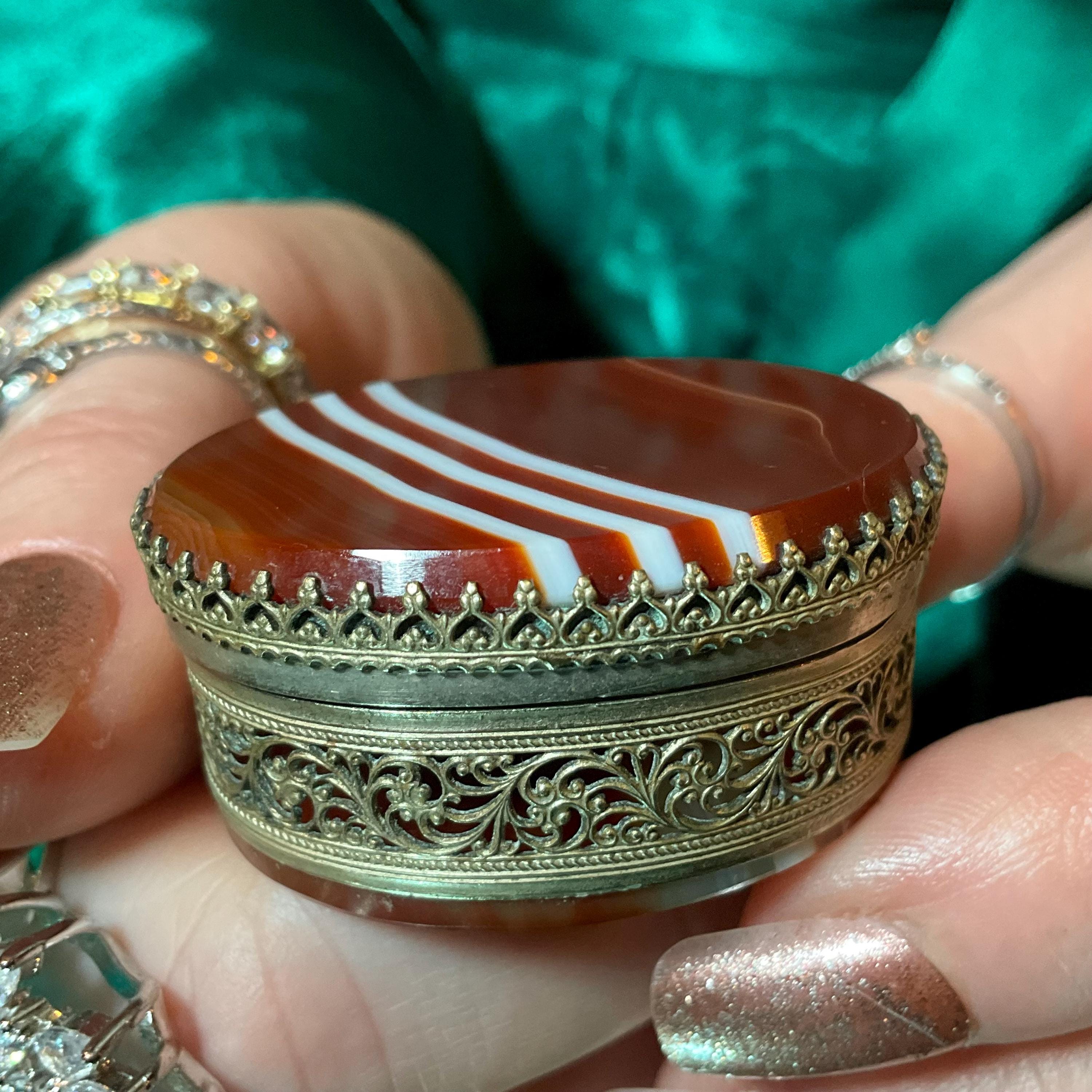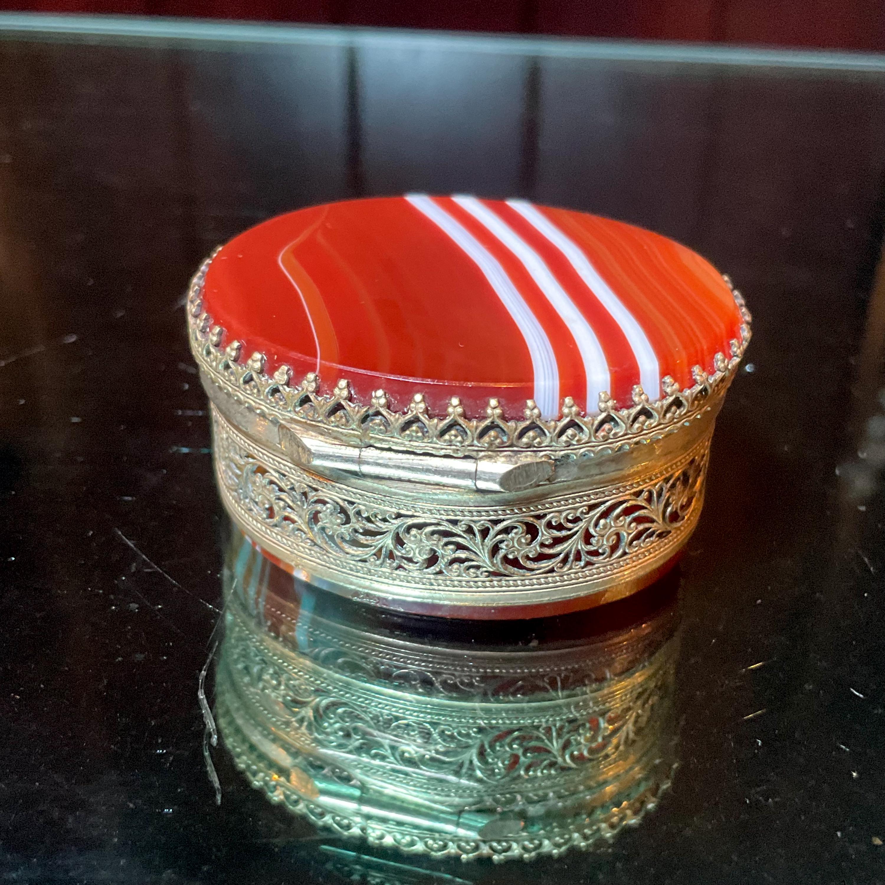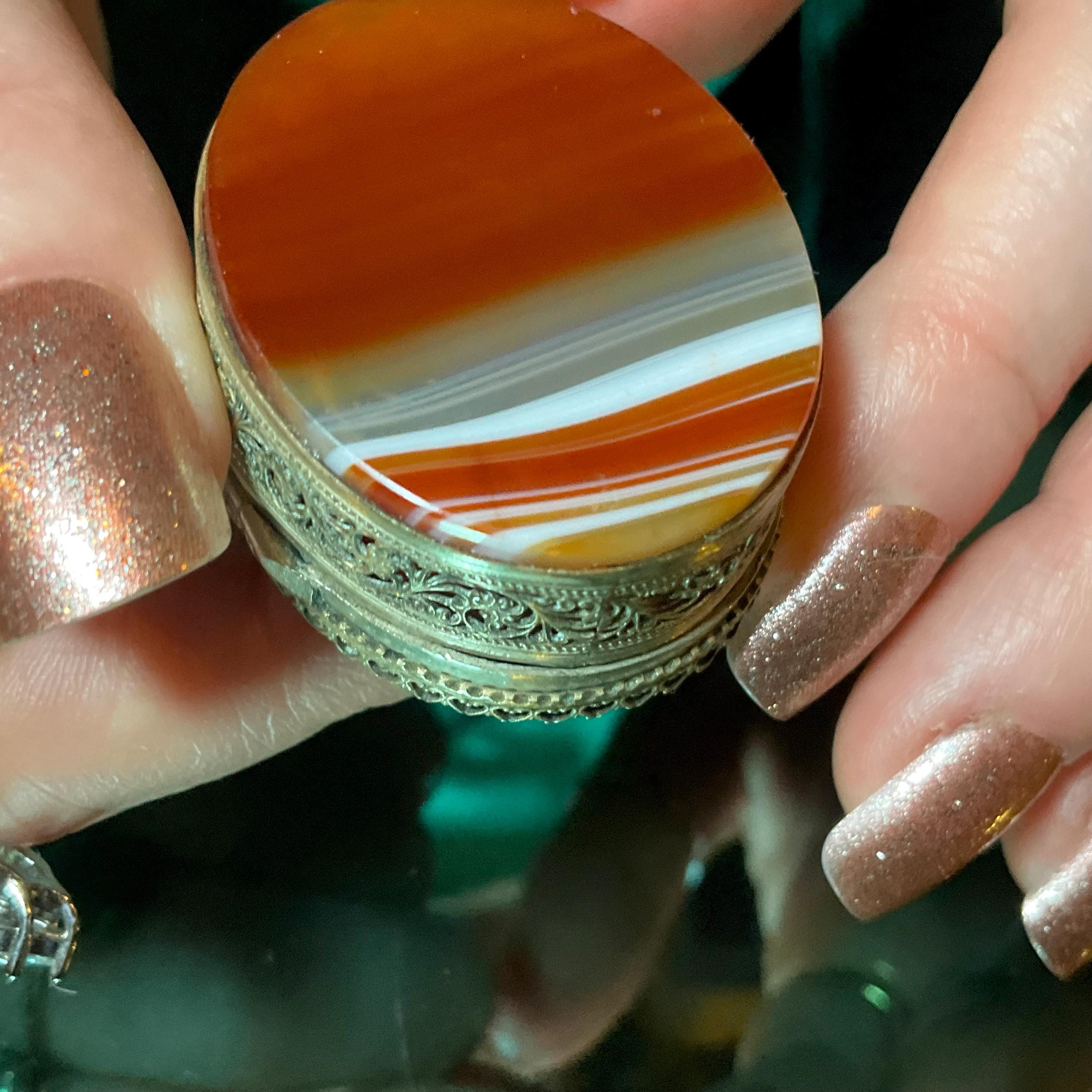 The Vintage Banded Agate Carnelian Pill Box and it is beautifully hand-crafted box with silver metal.