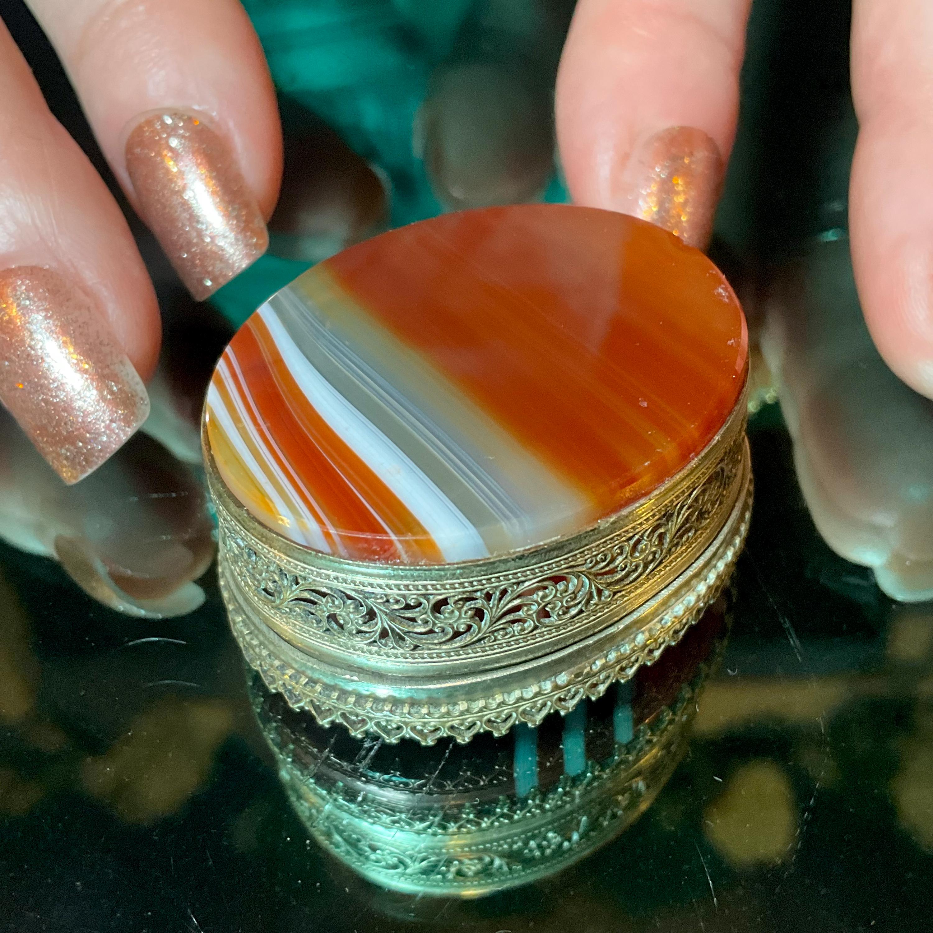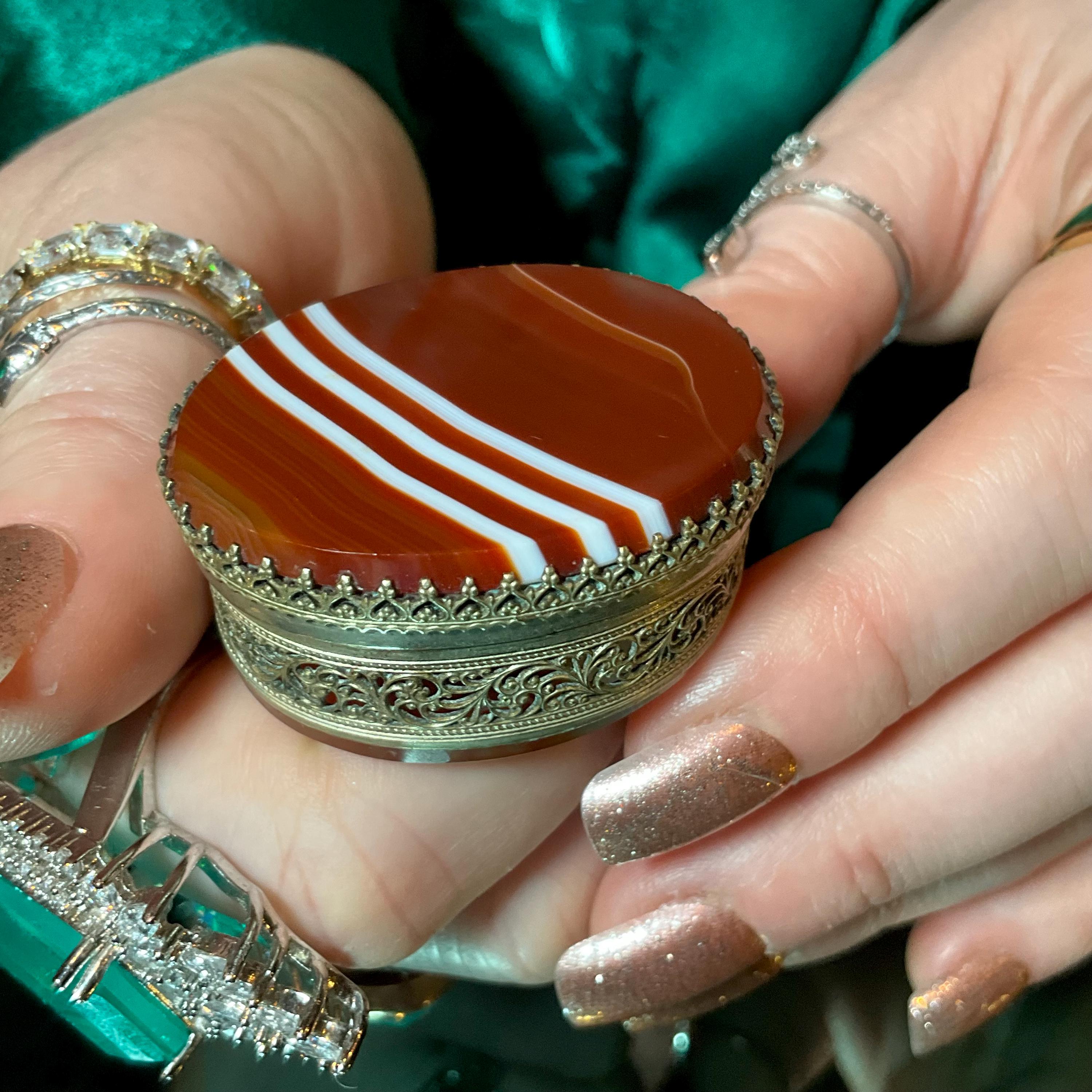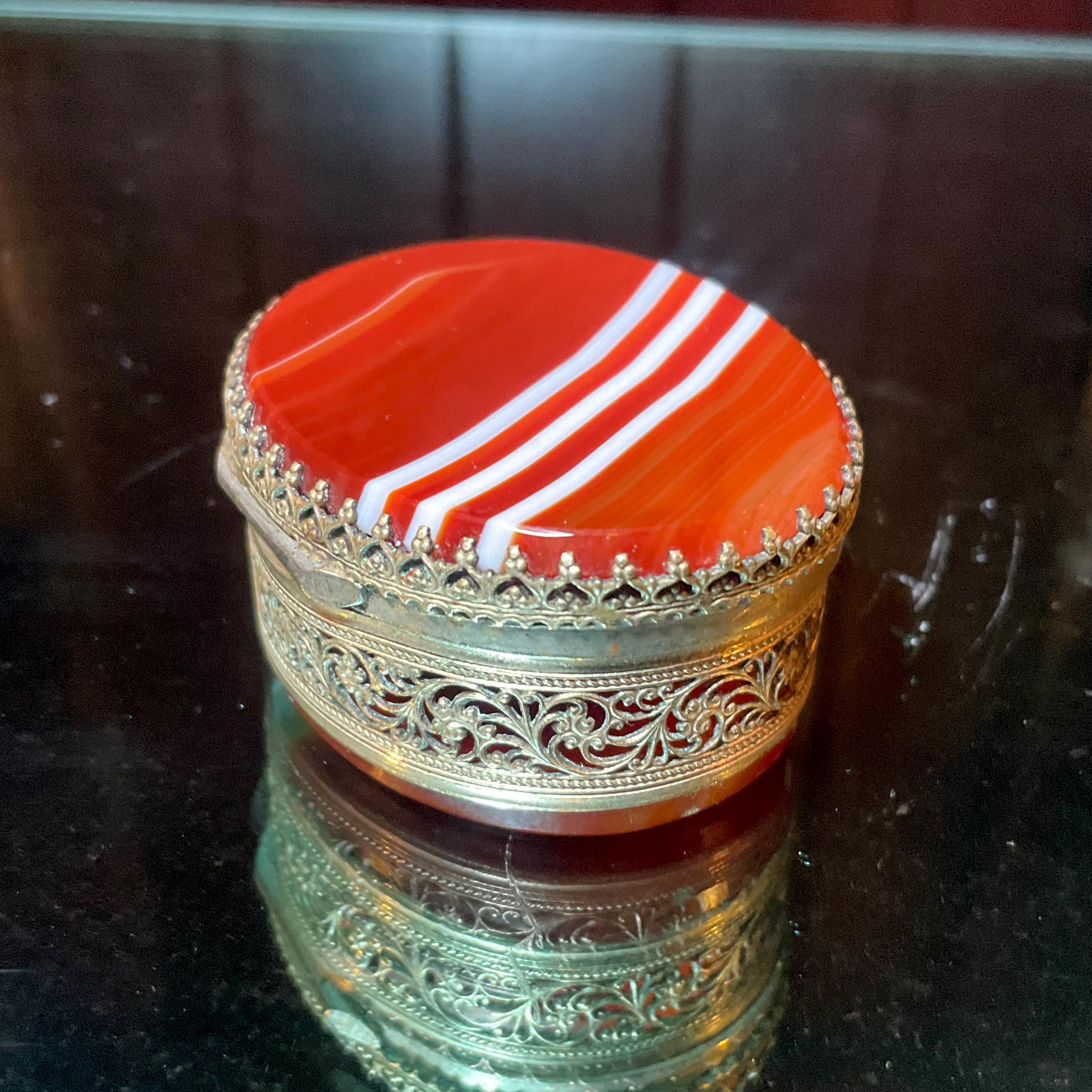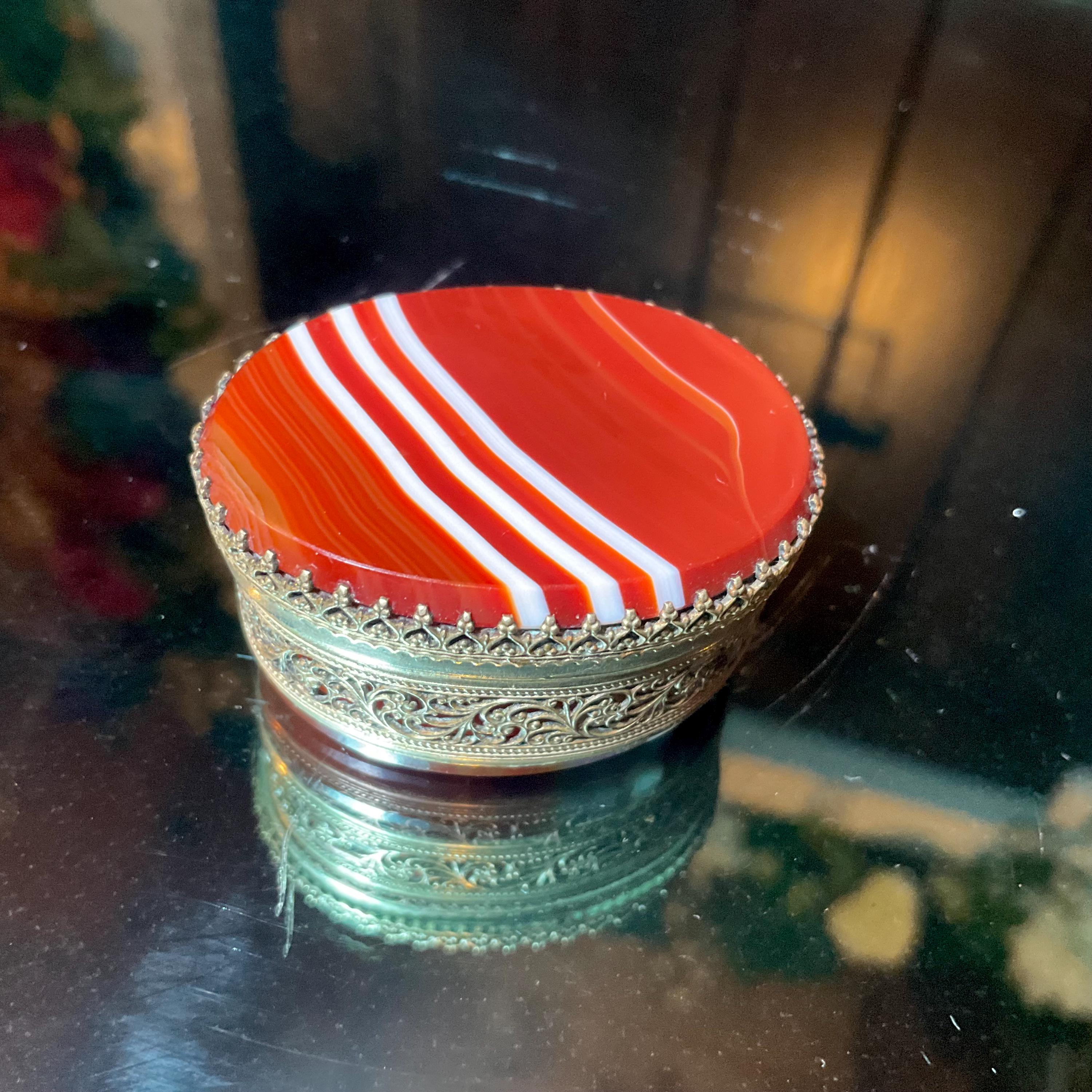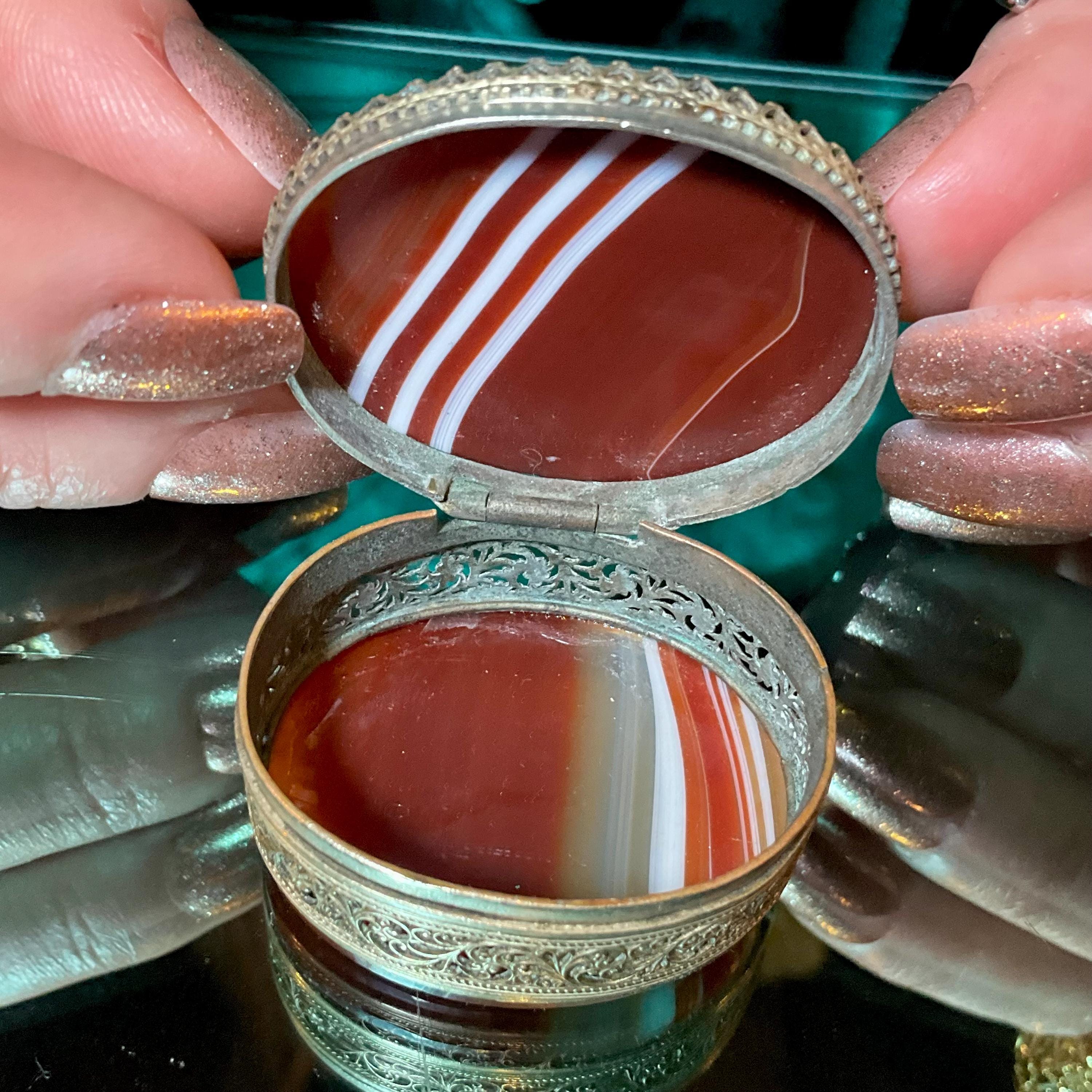 The Vintage Banded Agate Carnelian Pill Box and it is beautifully hand-crafted box with silver metal.