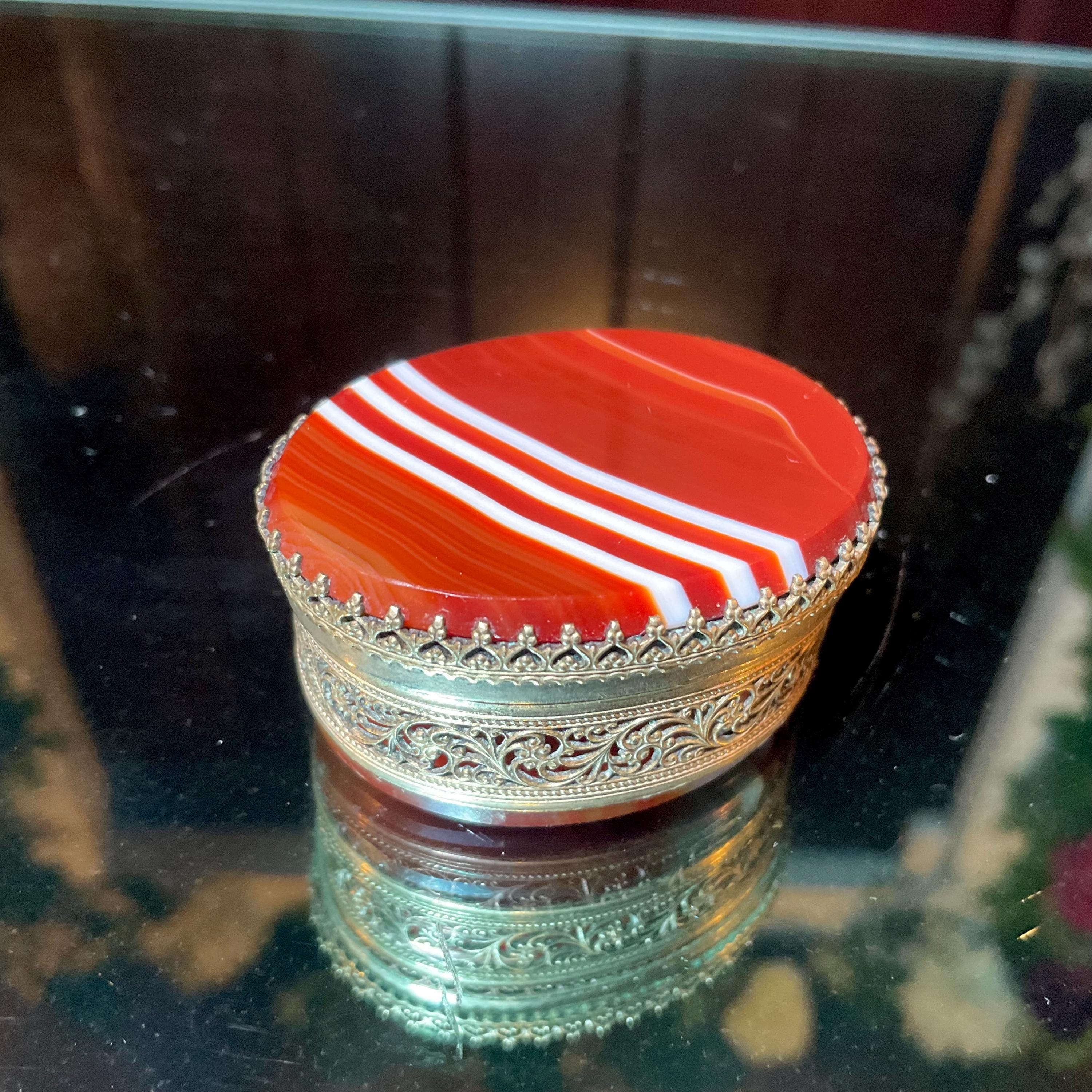 Agate Banded Carnelian Pill Box with Lid ~ 1 1/2" Long Two-Sided Vintage Antique Display Box ~ Swirling Red with White Stripes Fast Shipping