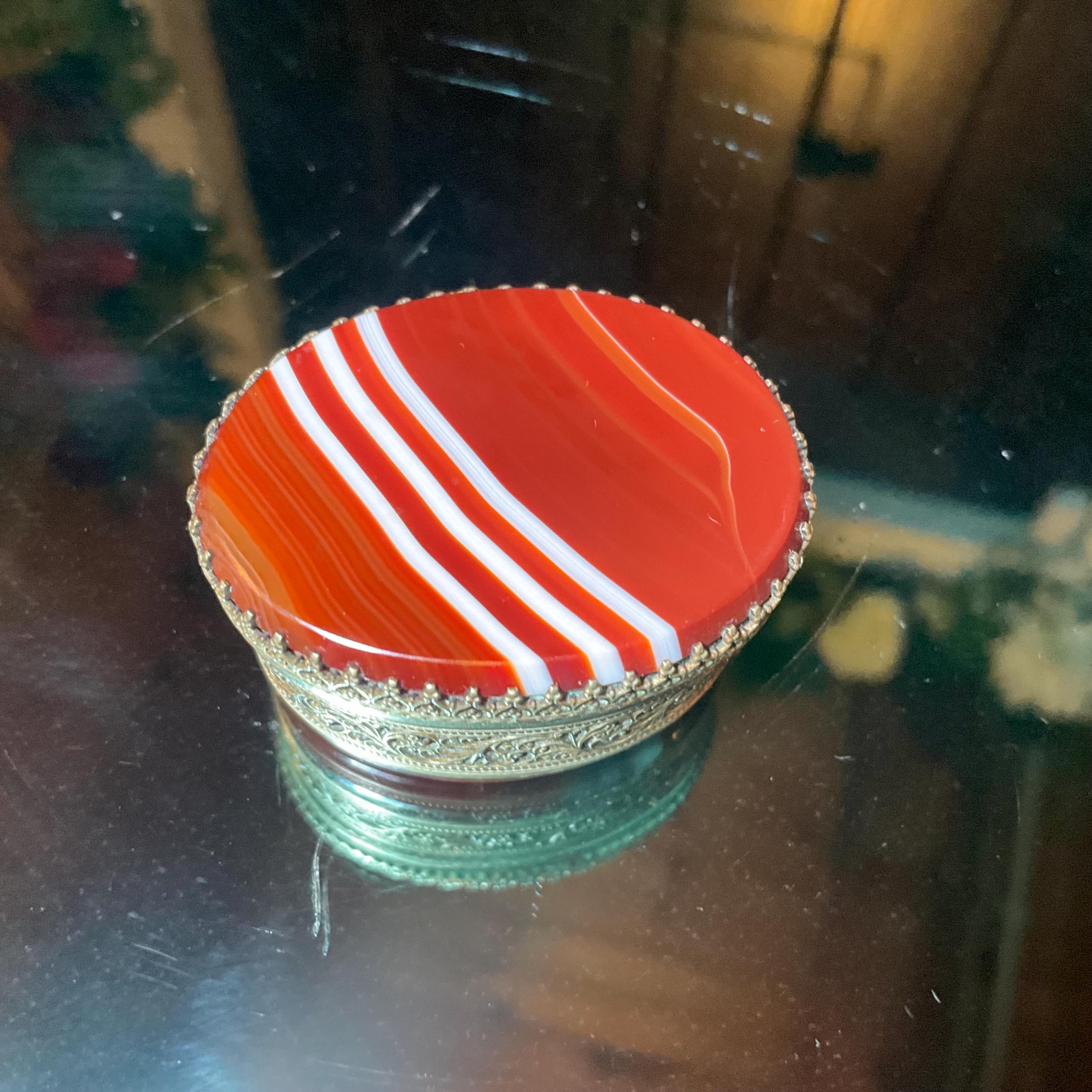 A beautiful miniature trinket or pill box piece having a transparent banded red agate / carnelian stone with a banded white stripe top, and with a matching agate bottom.