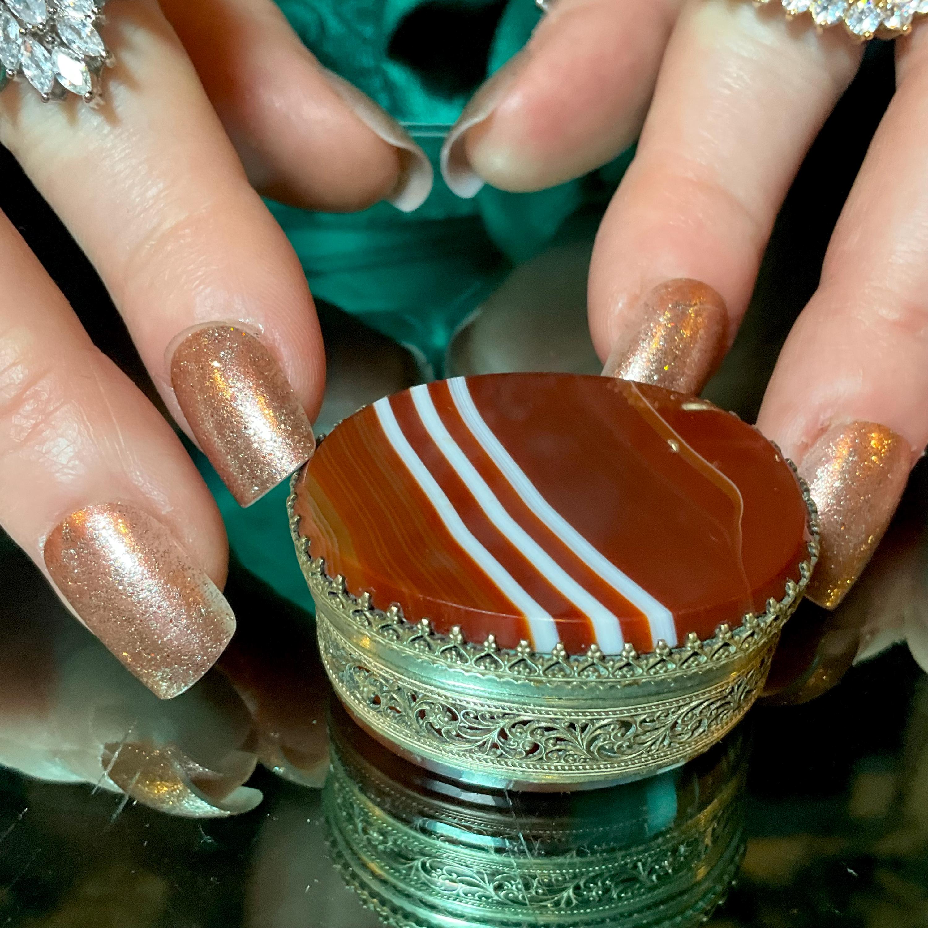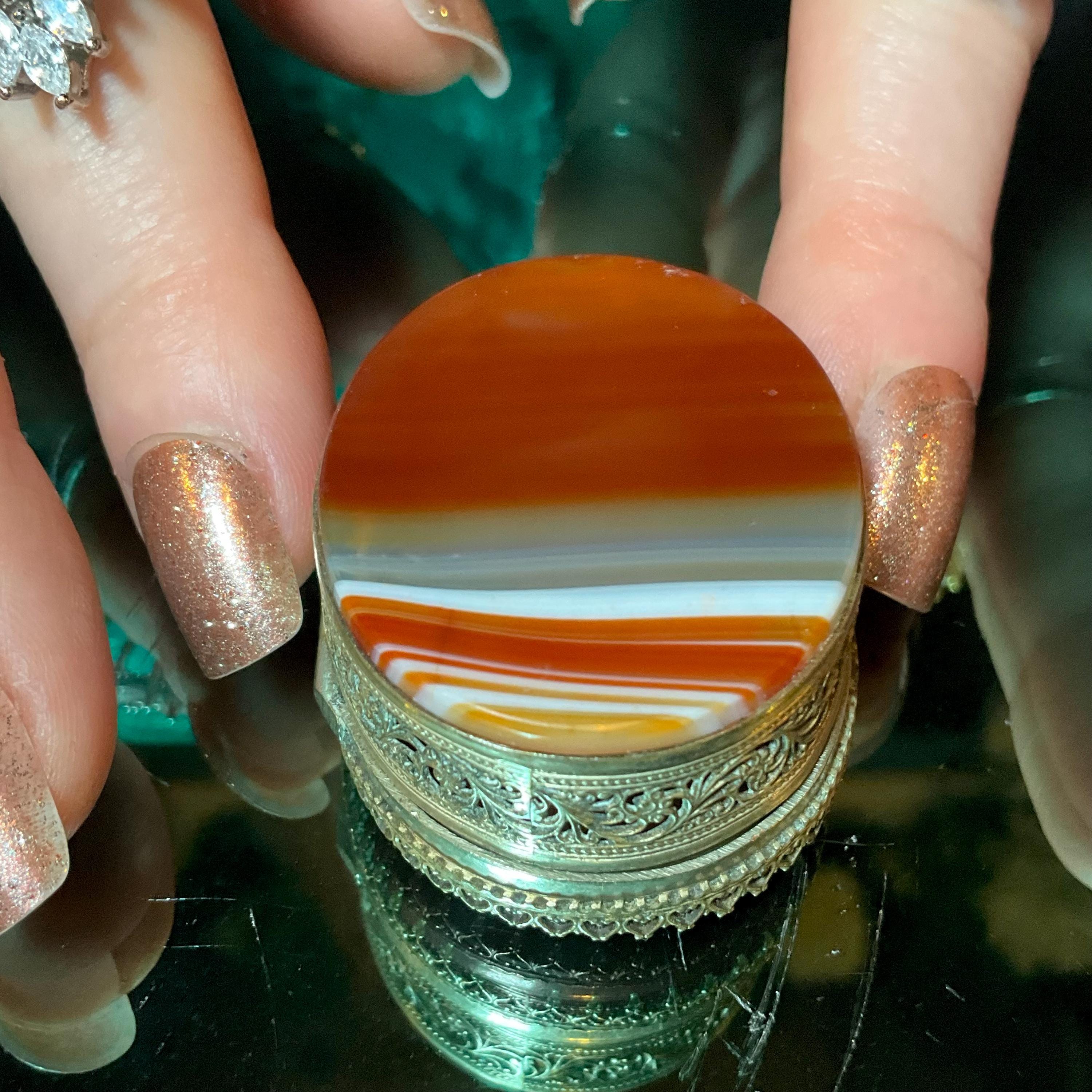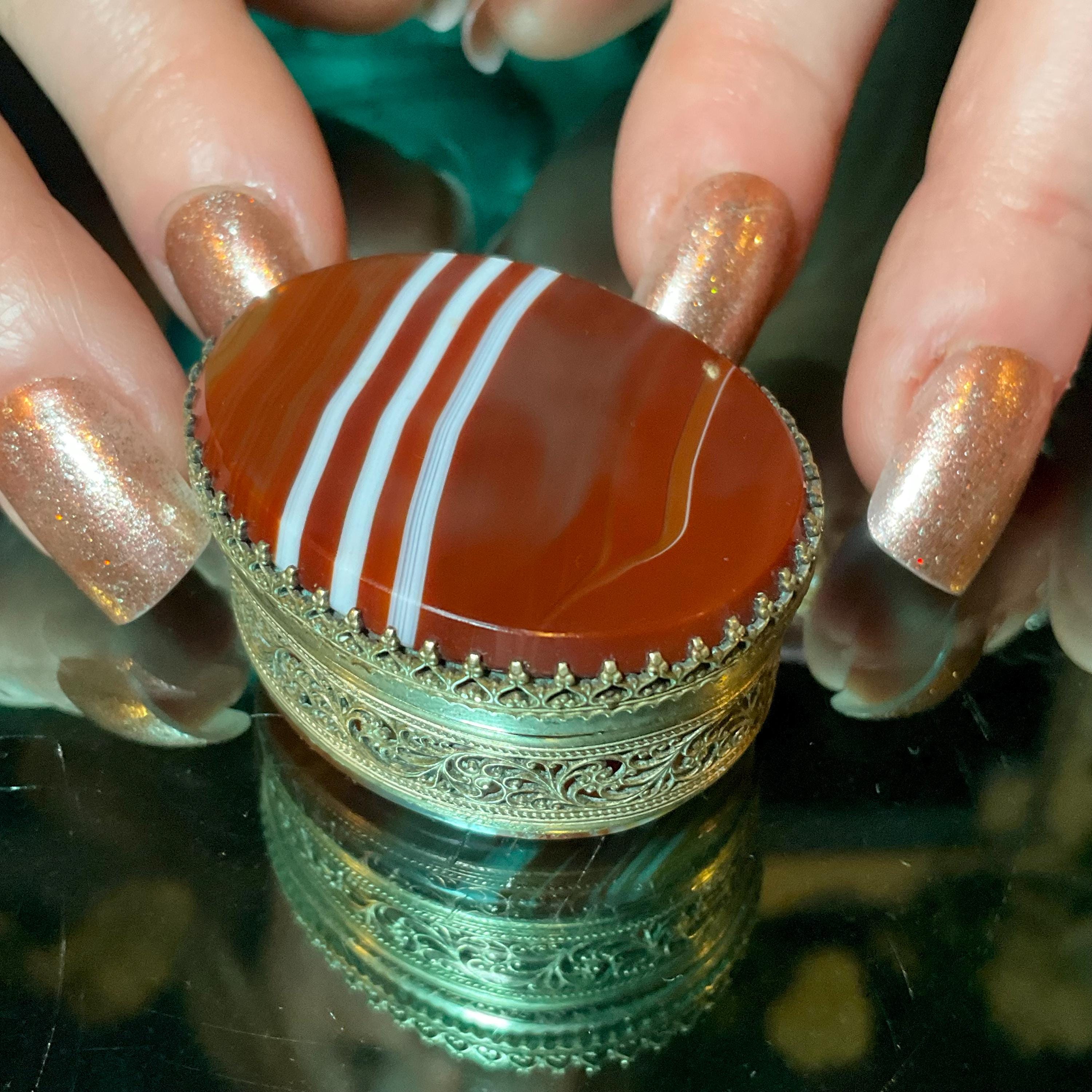 This Banded Agate Carnelian box is handmade beautifully detailed, and you can imagine how rare it is to get a Pill box handmade with the matching hand-crafted hinged lid with a matching agate bottom making this a true treasure.