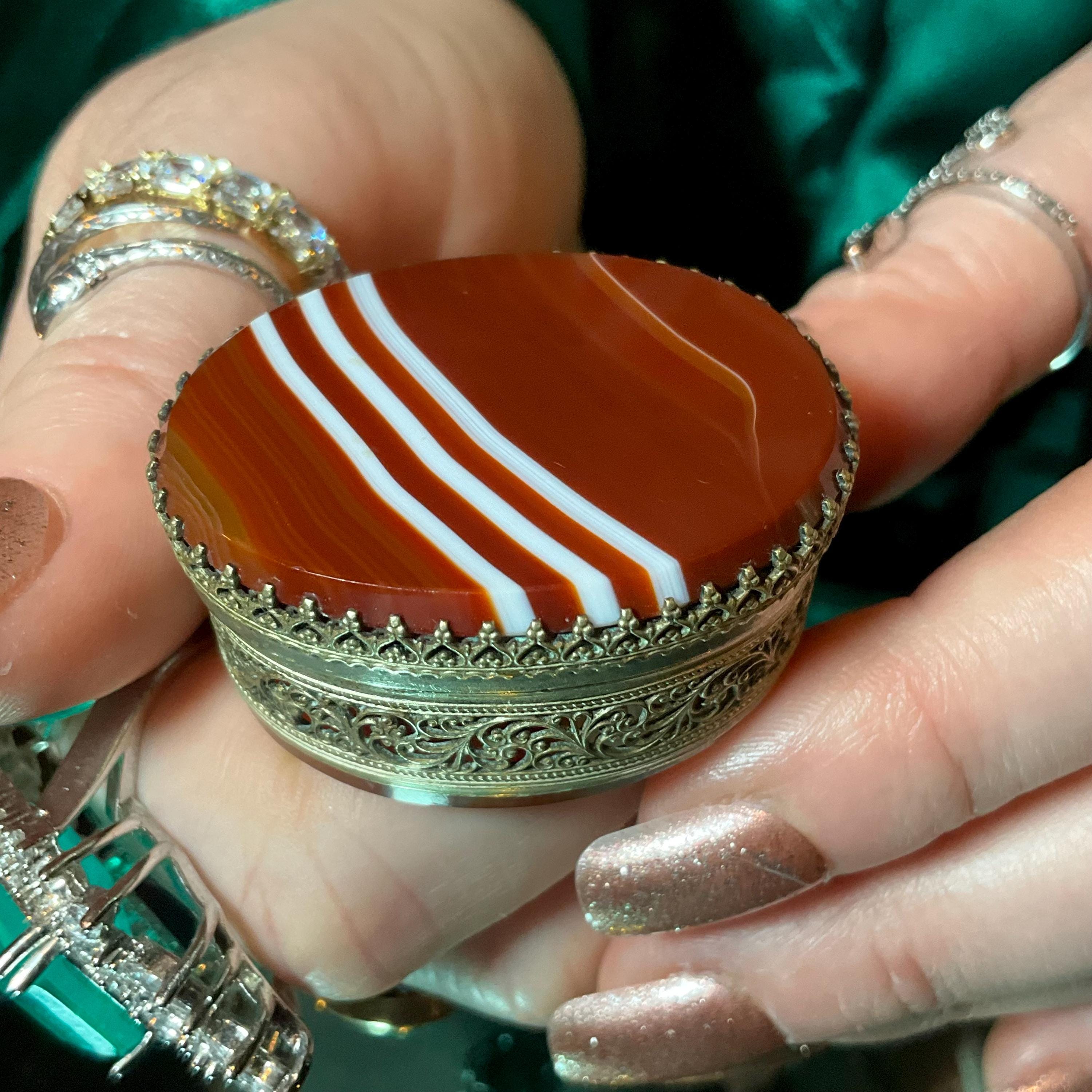 If you love vintage hand carved Agate Banded Carnelian, then this beautiful Pill Box is for you.