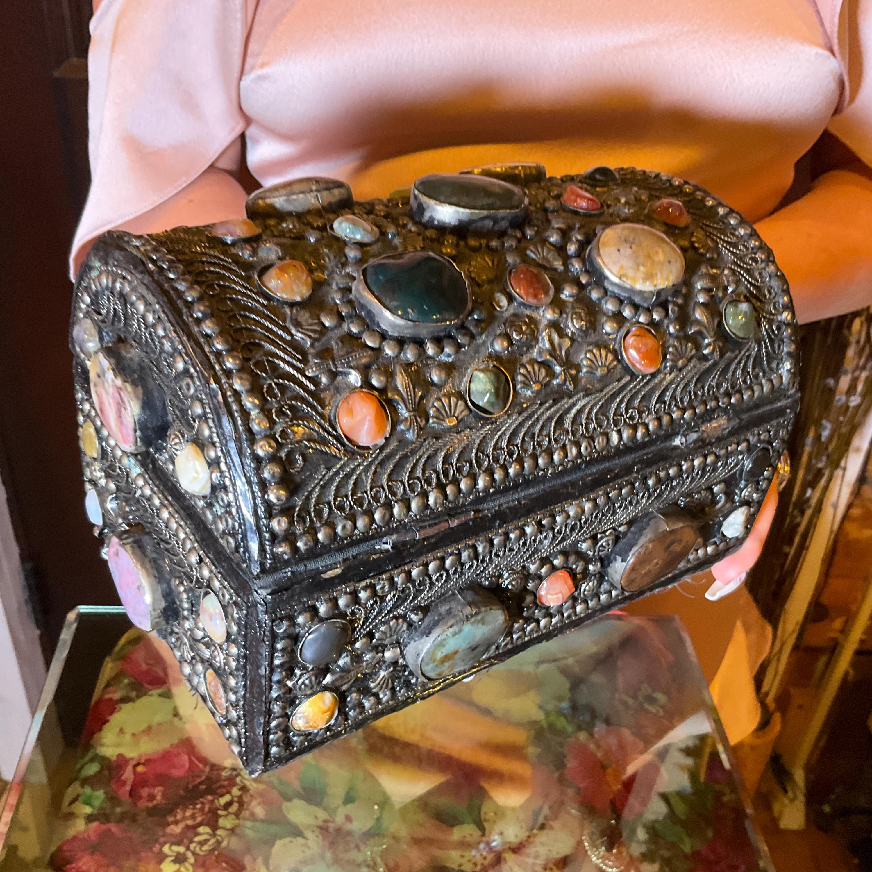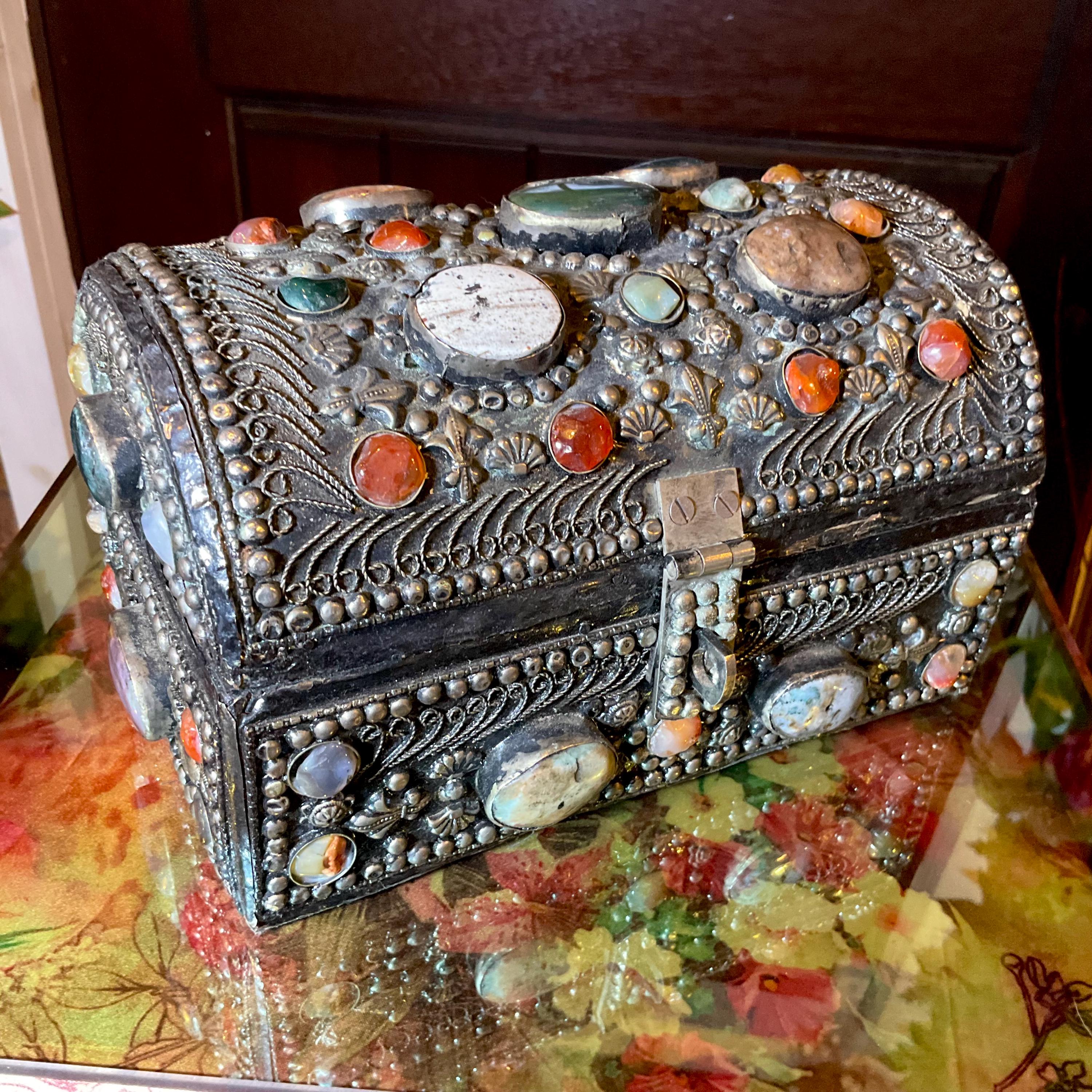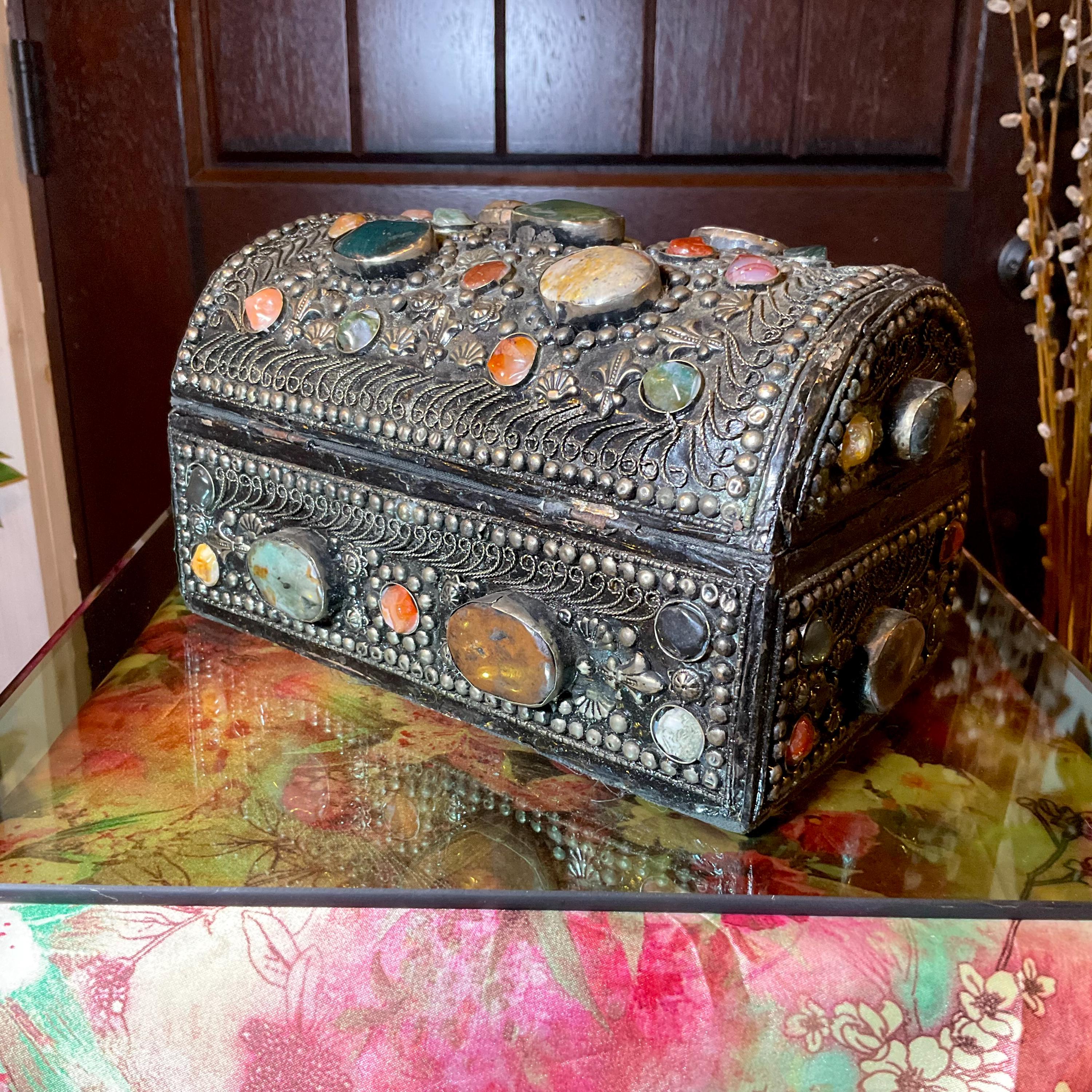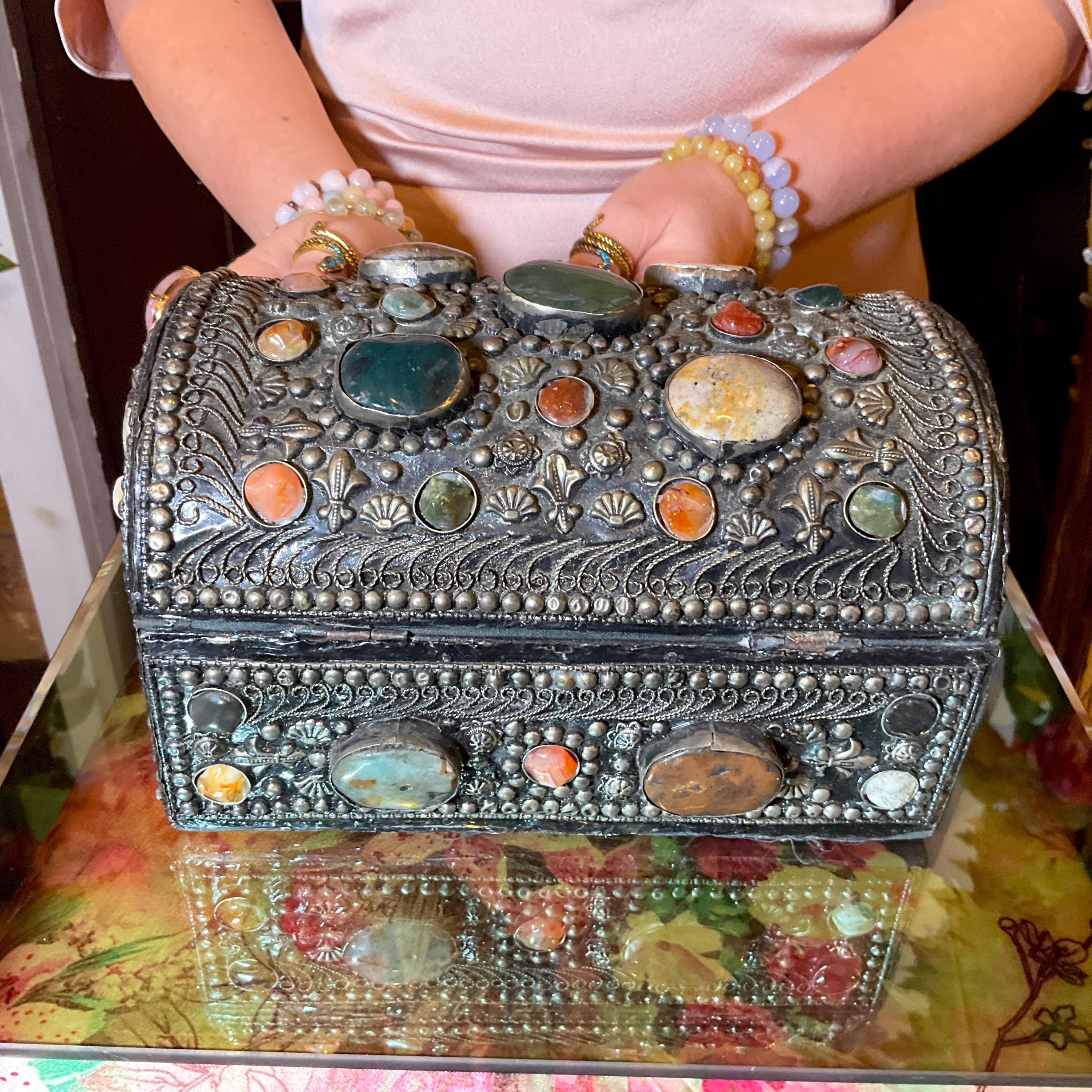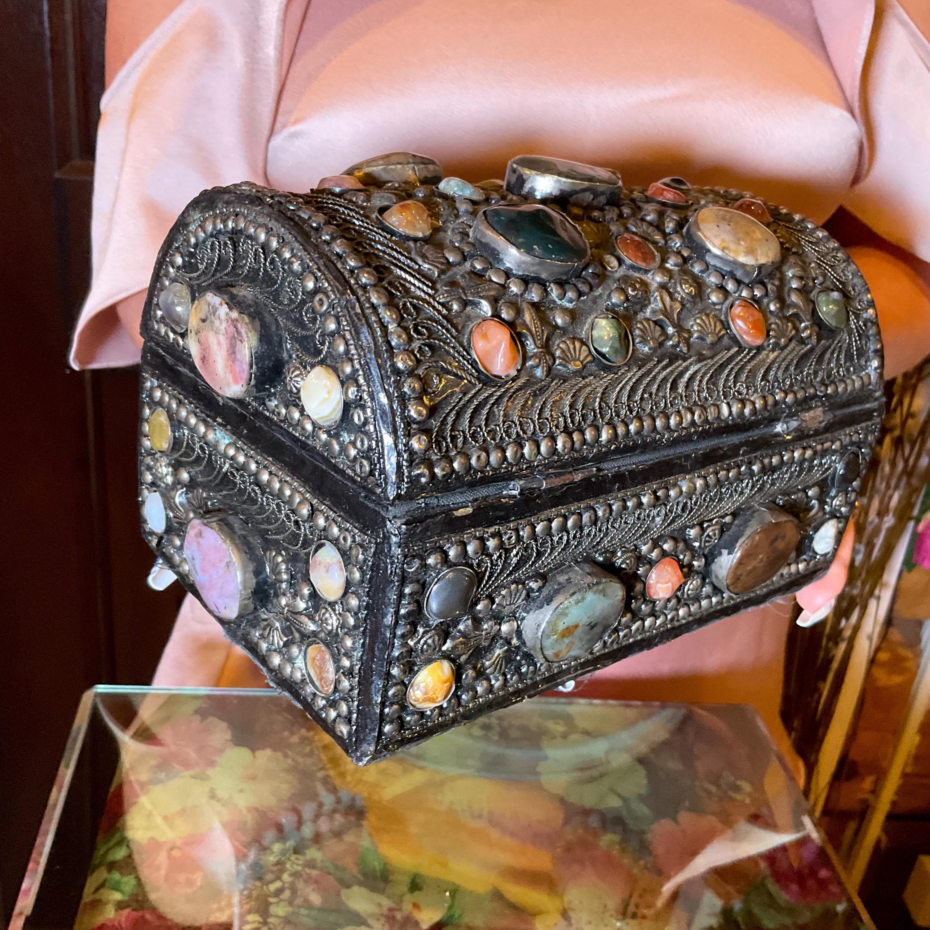 The Vintage Moroccan jewelry box is inlaid with semi-precious agate stones and covered with silvered metal filigree.