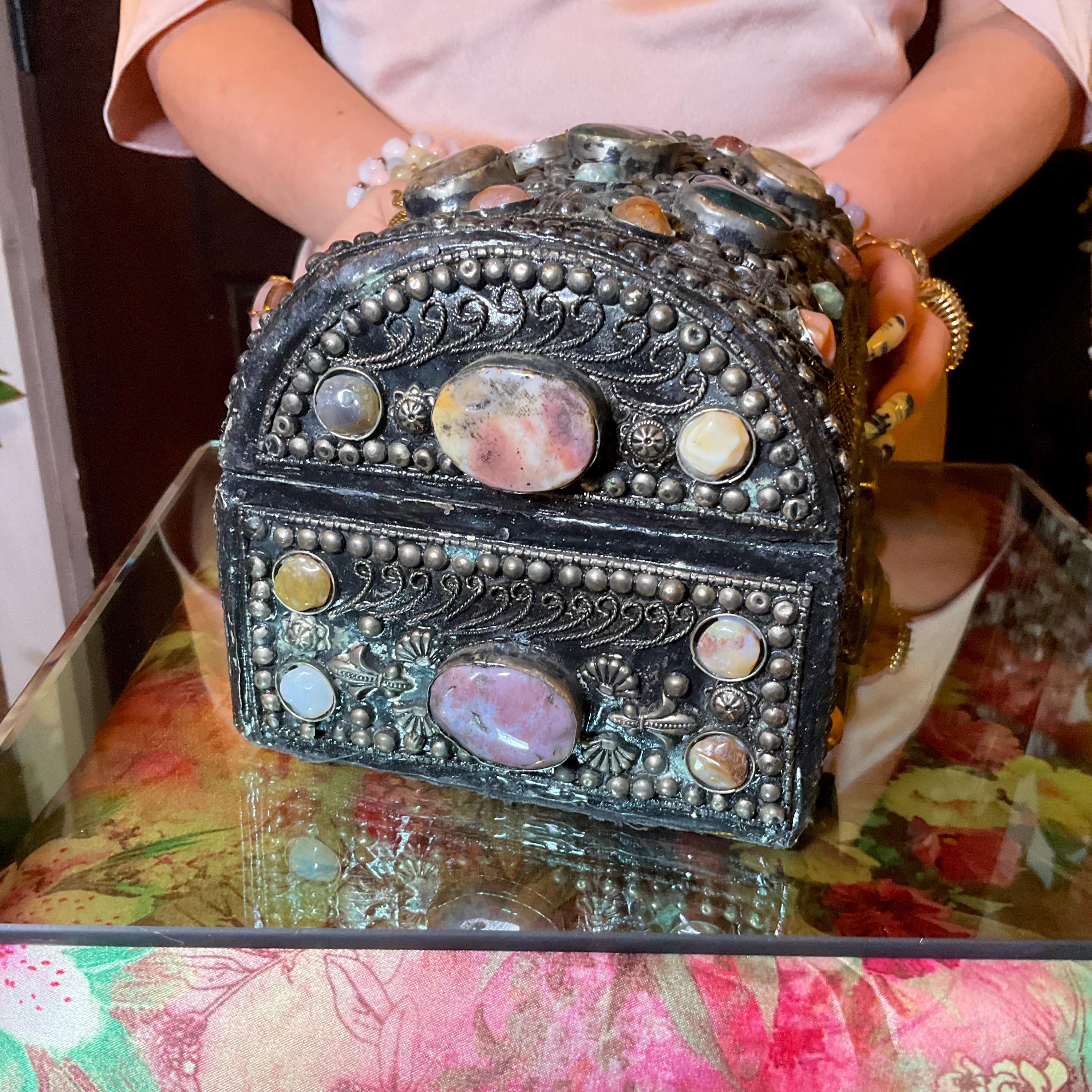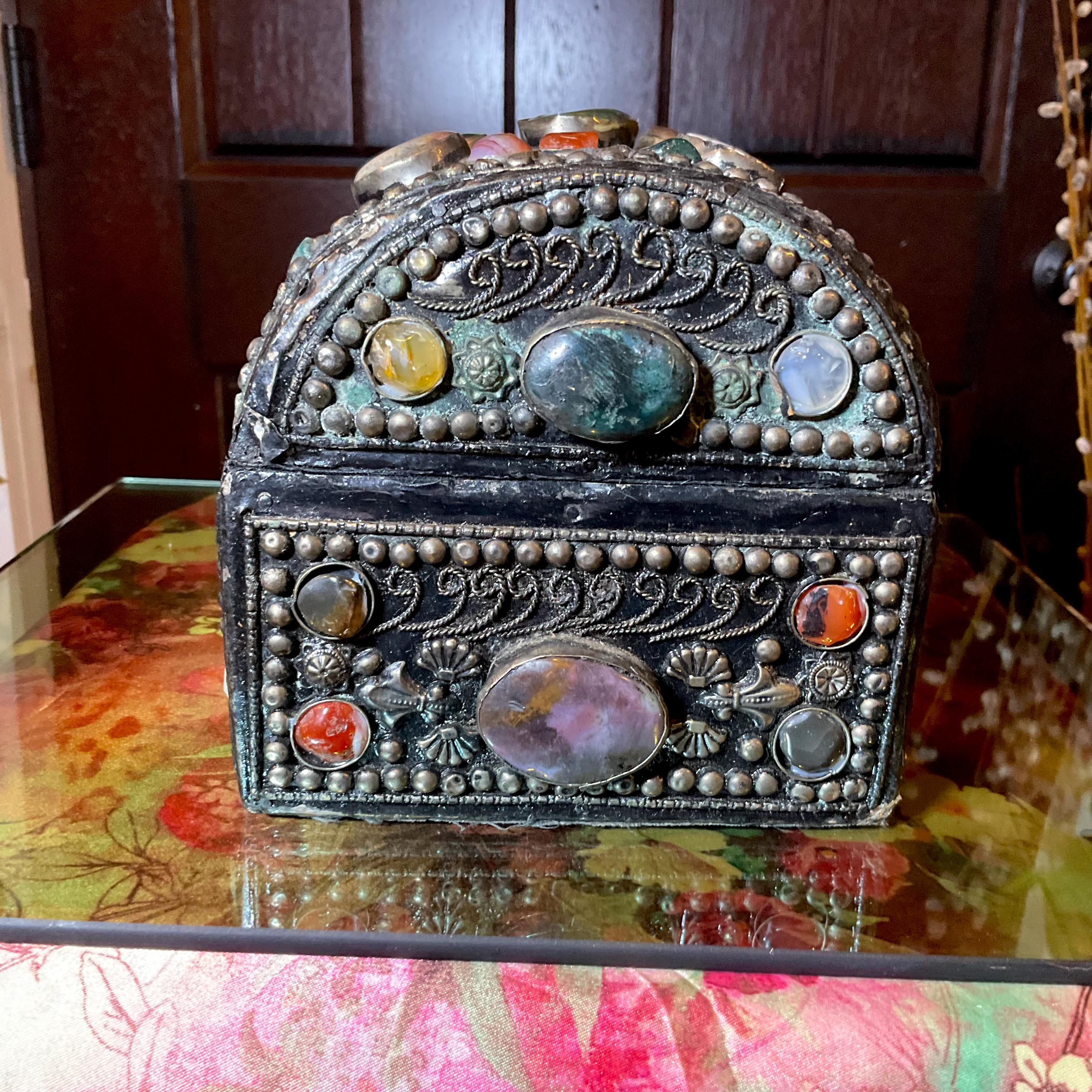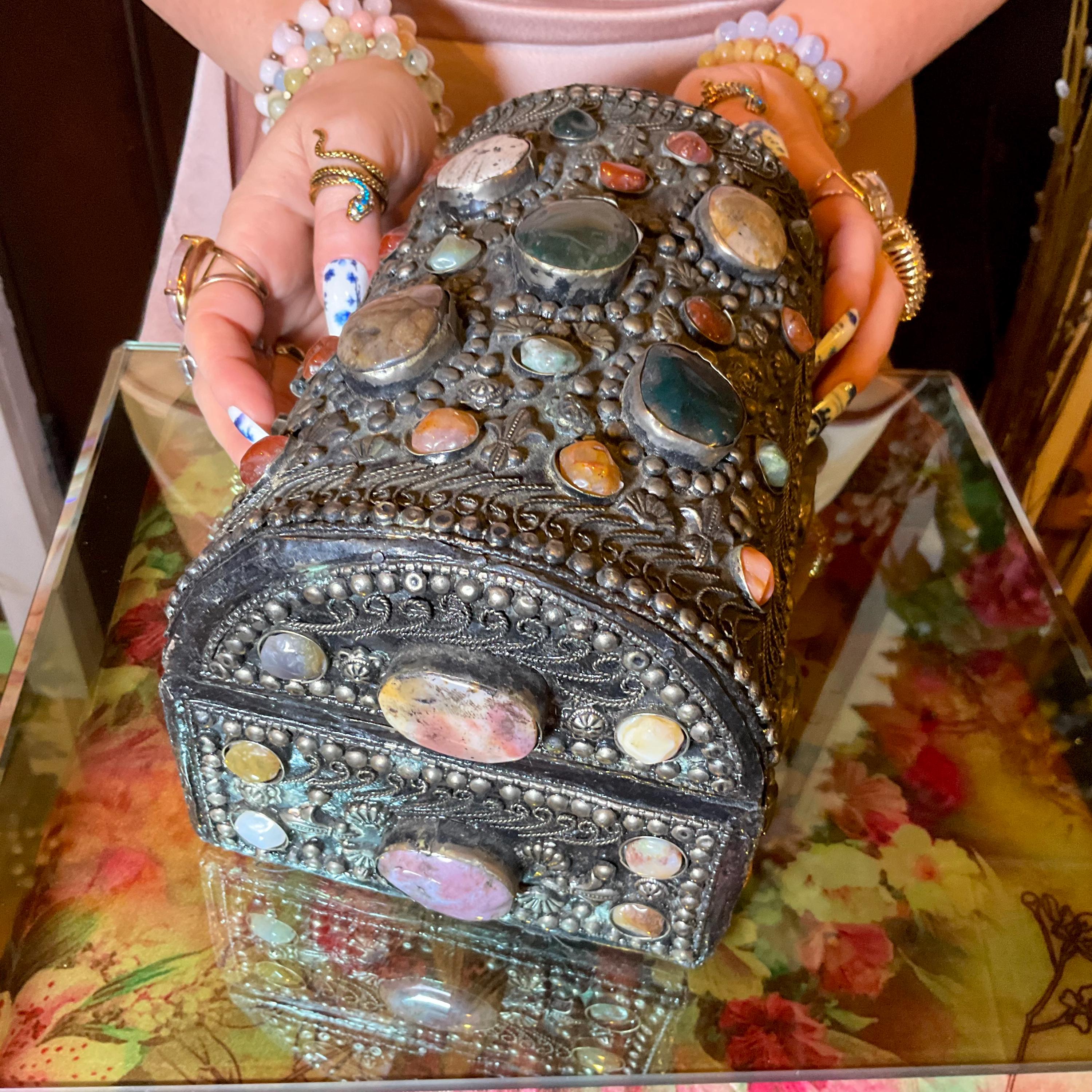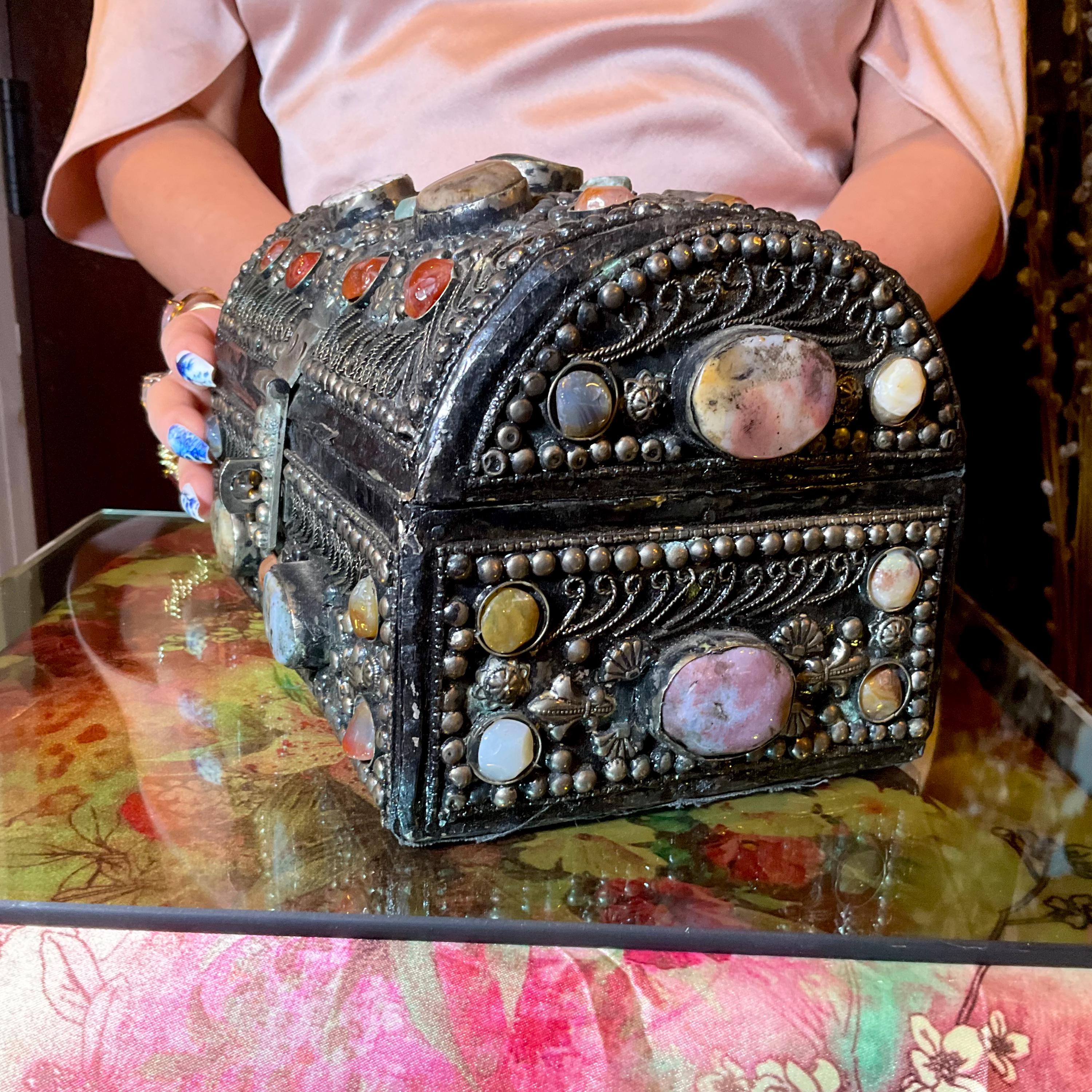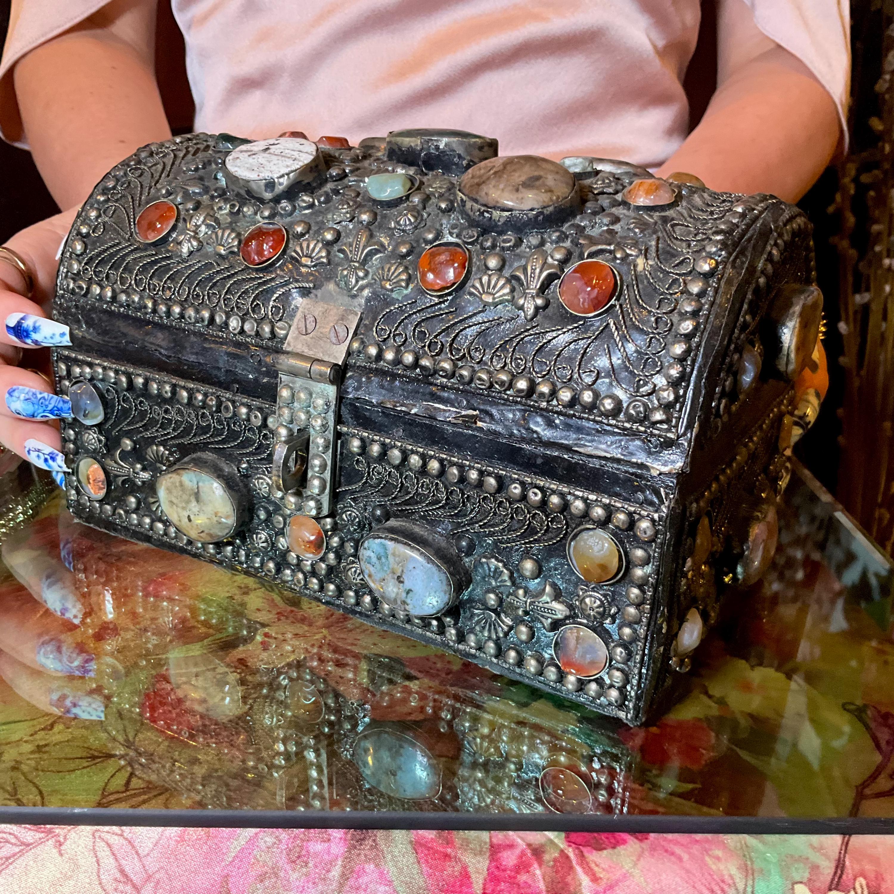 The Vintage Moroccan jewelry box is inlaid with semi-precious agate stones and covered with silvered metal filigree.