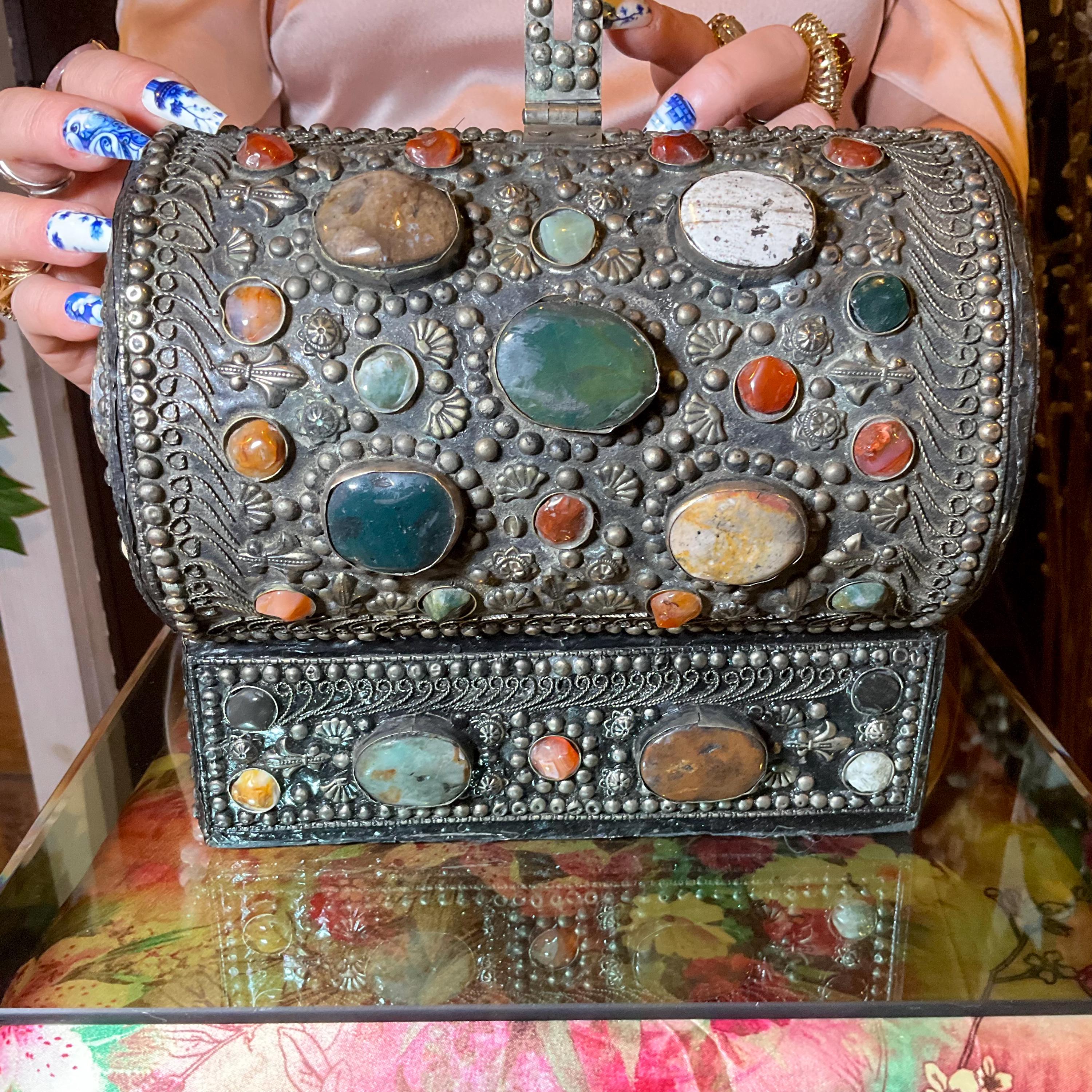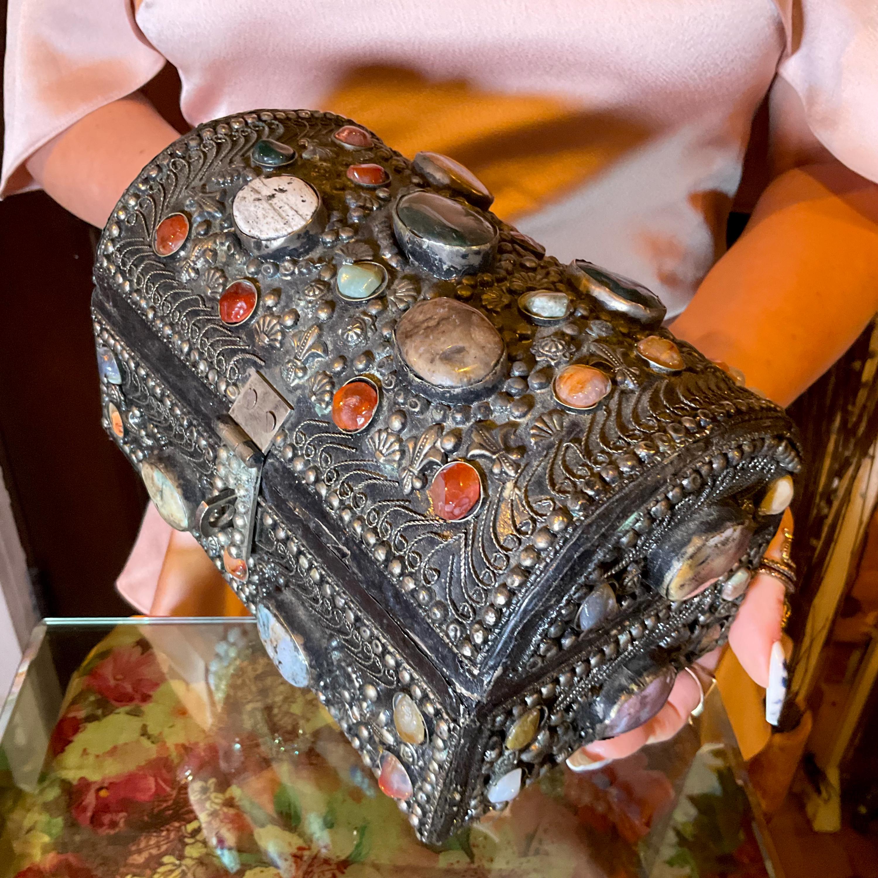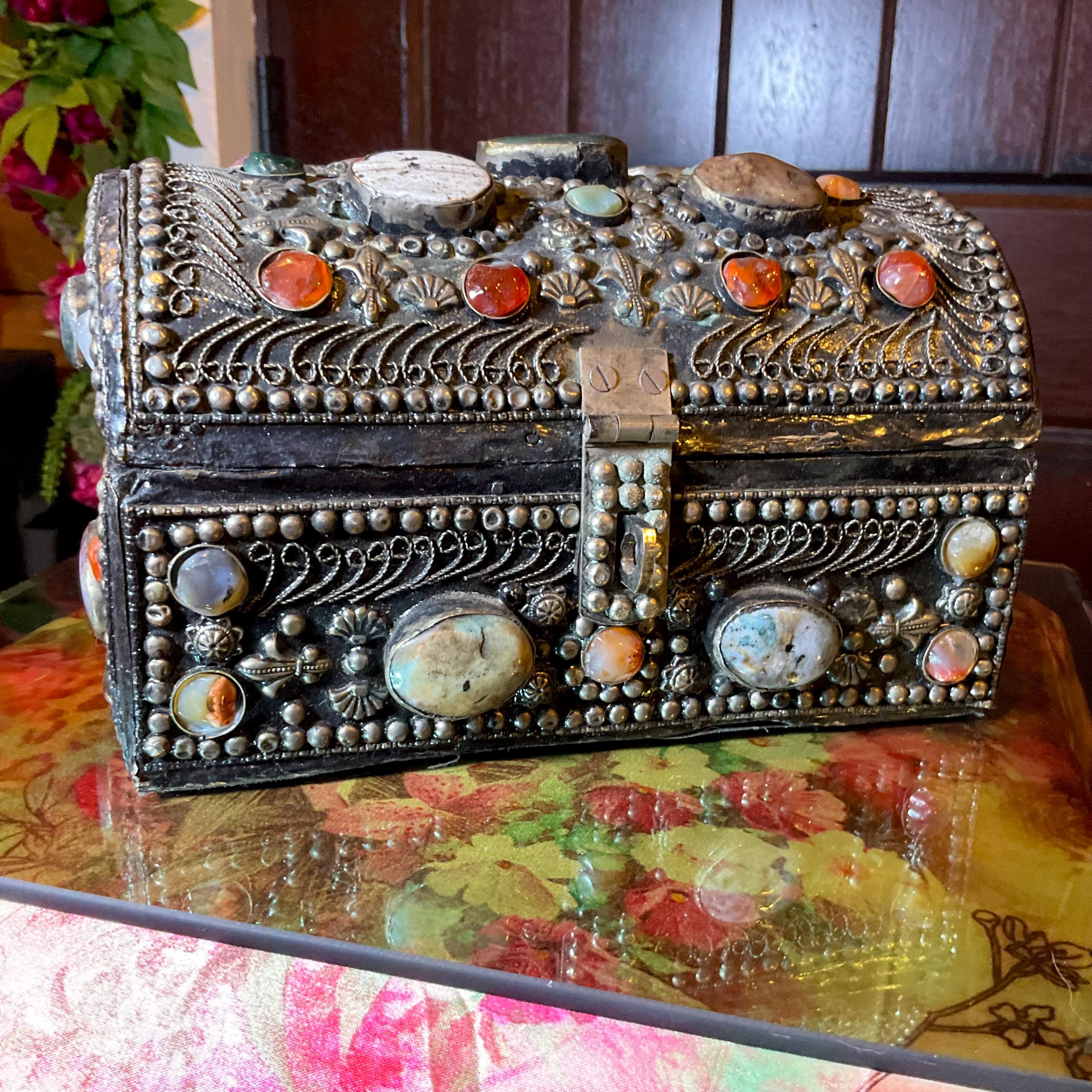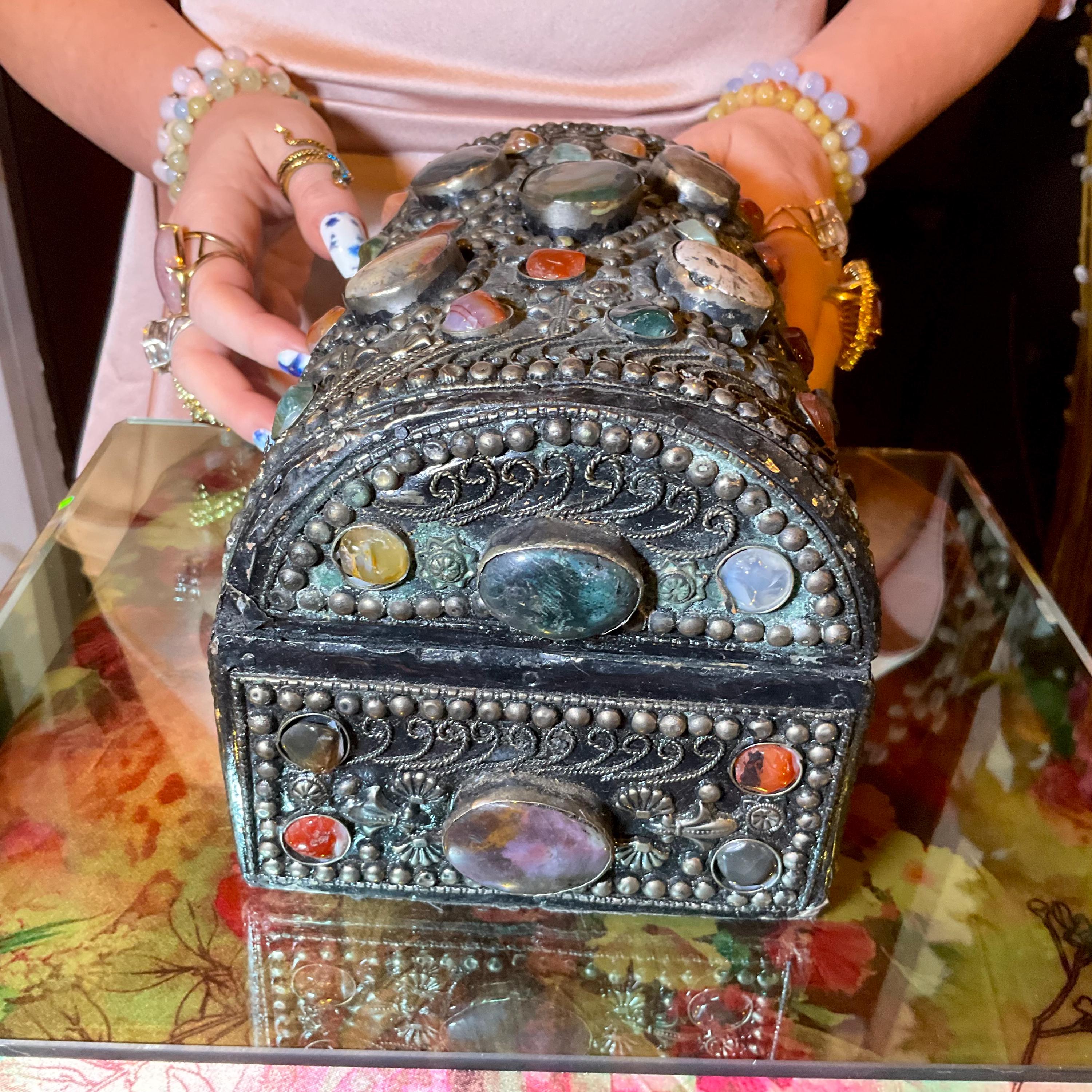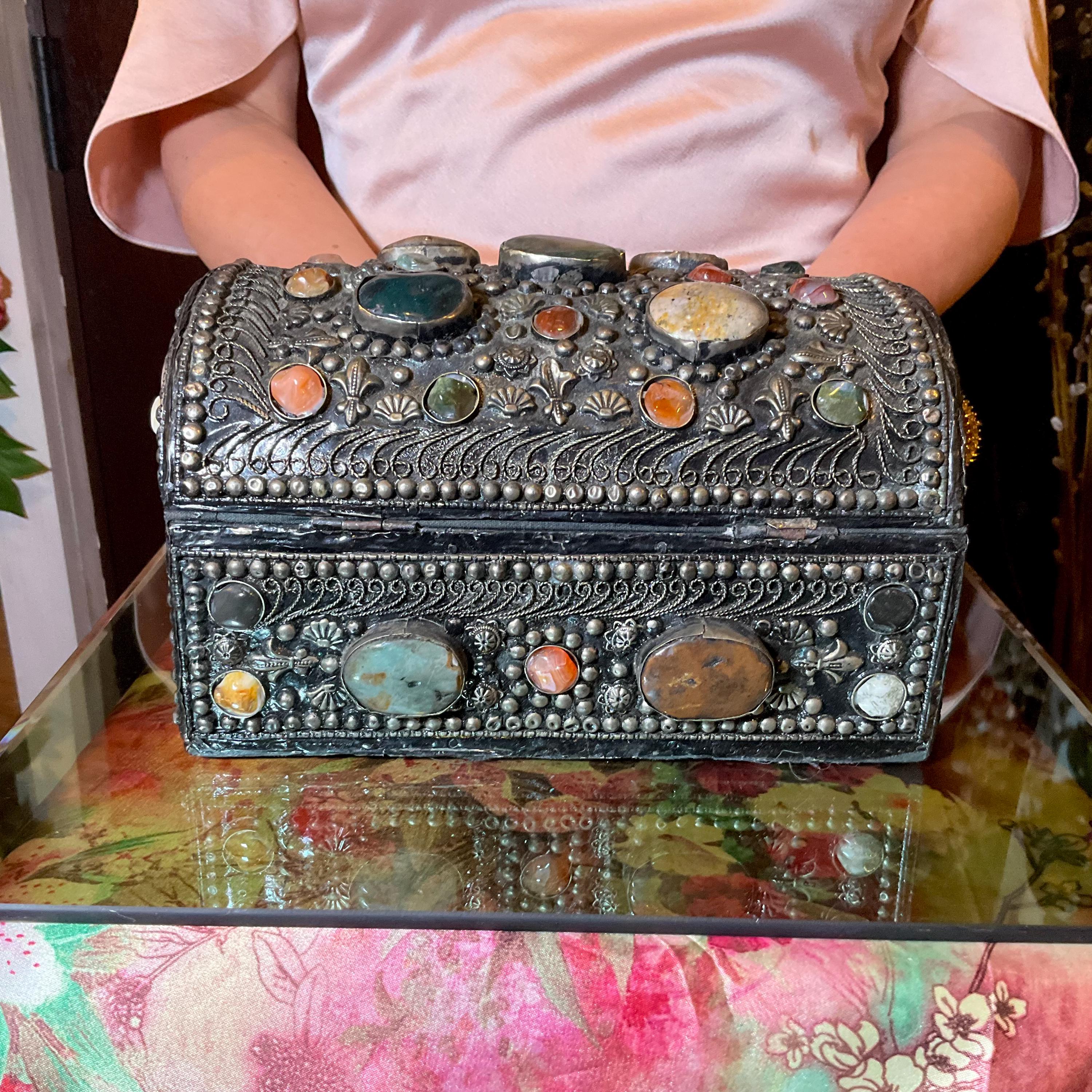 The Vintage Moroccan jewelry box is inlaid with semi-precious agate stones and covered with silvered metal filigree.