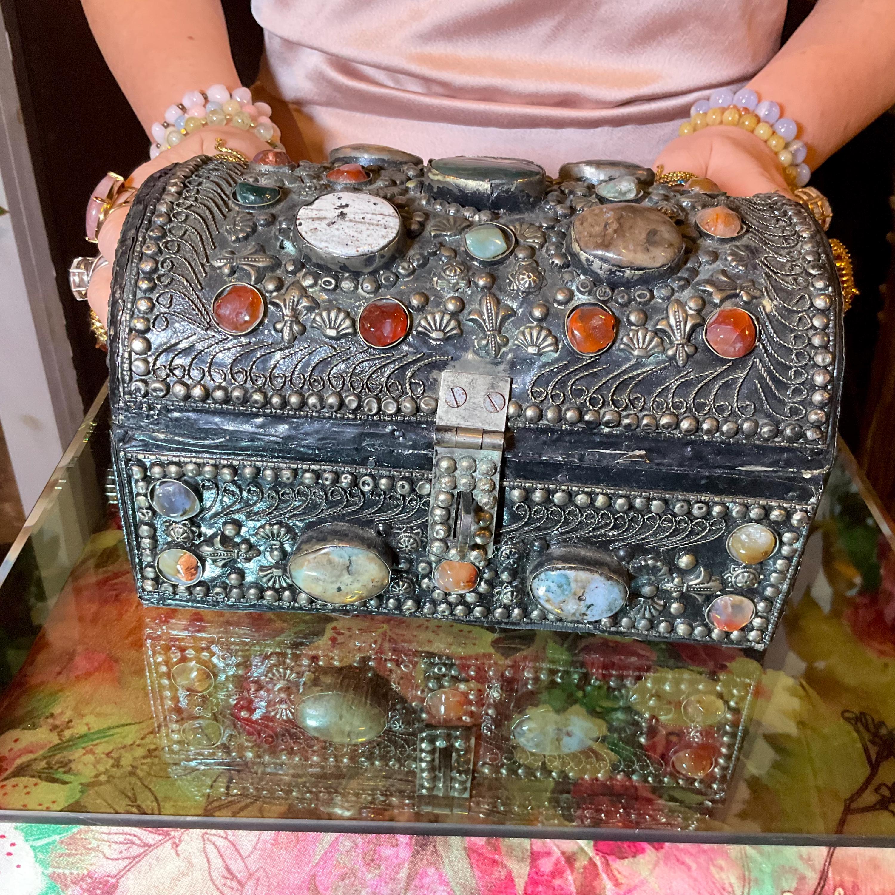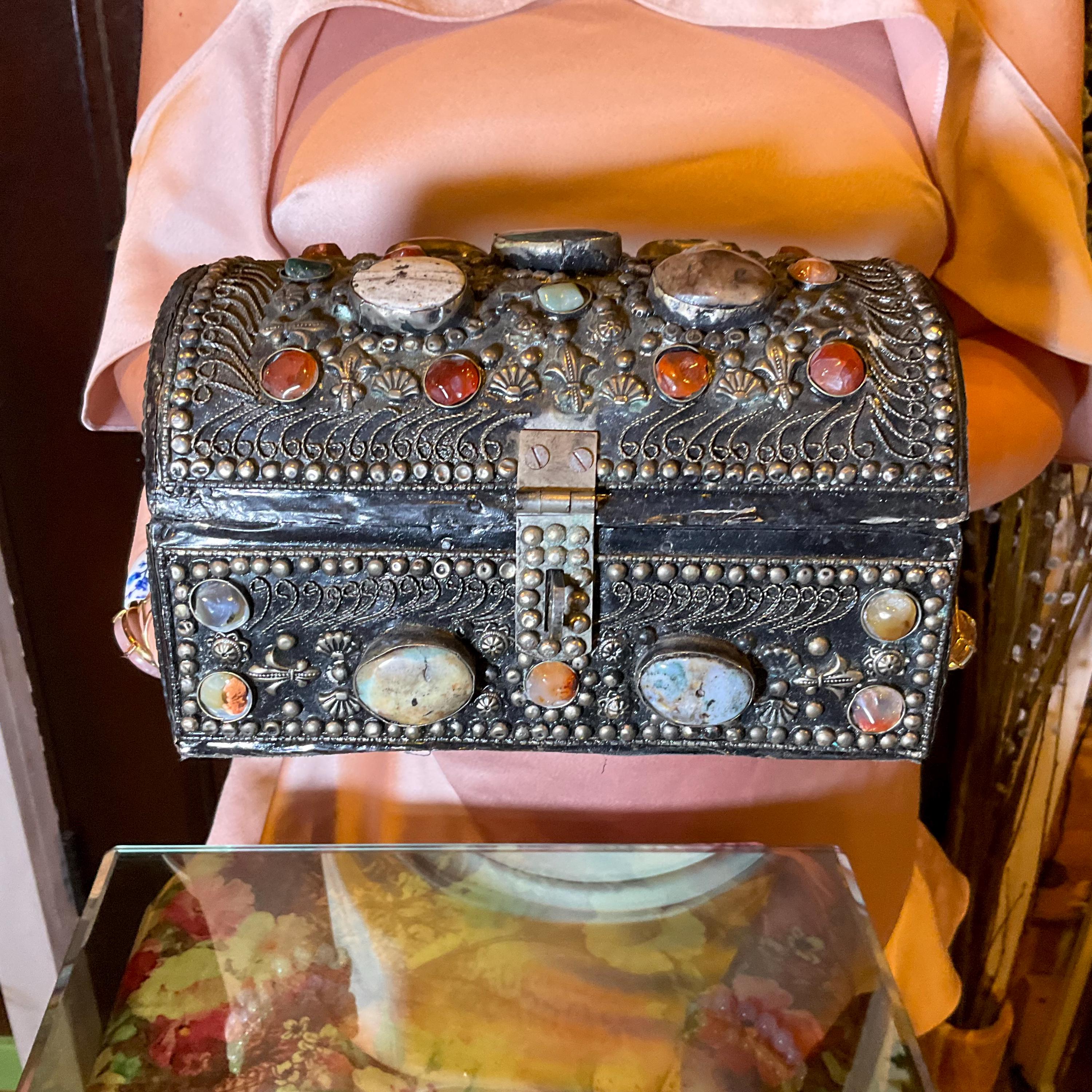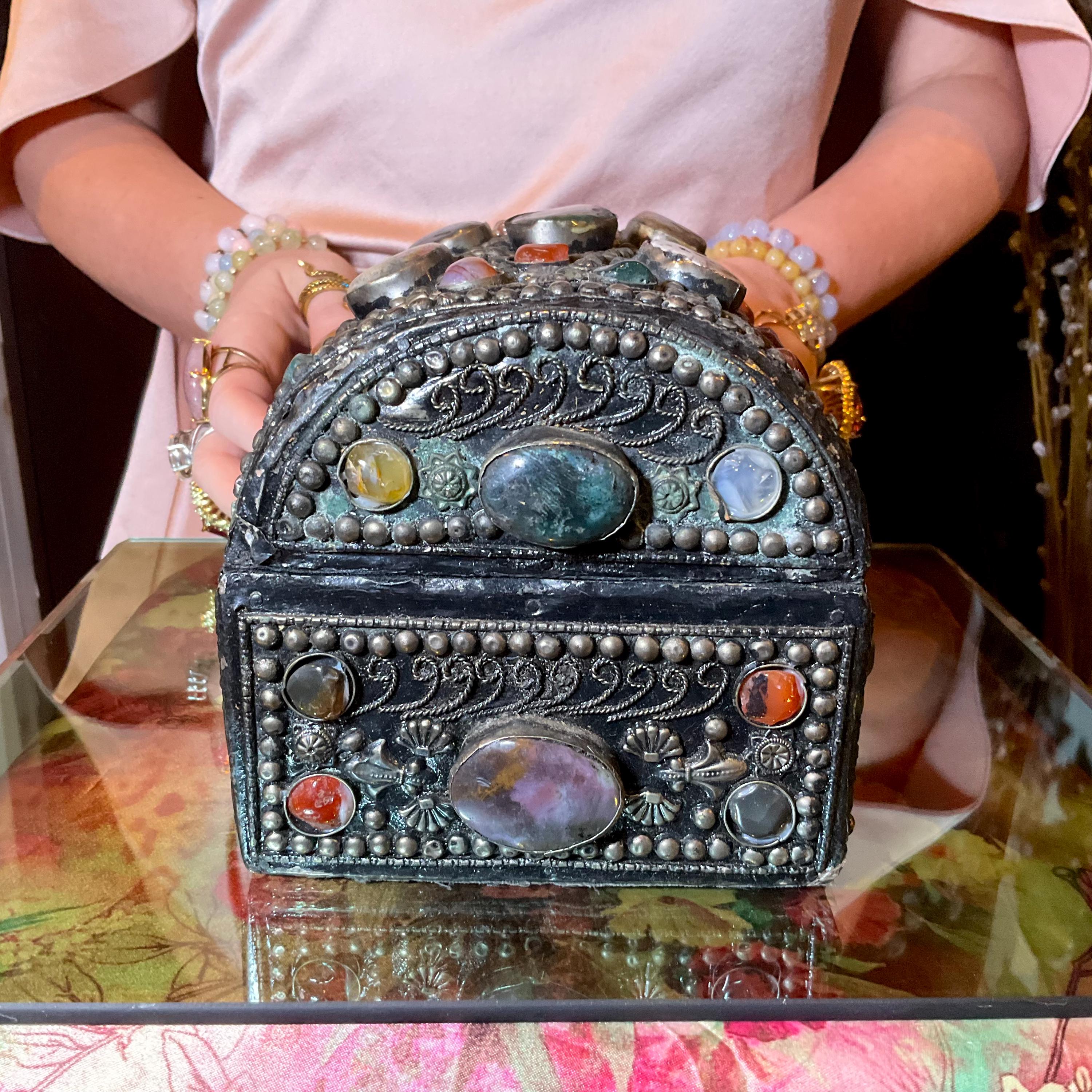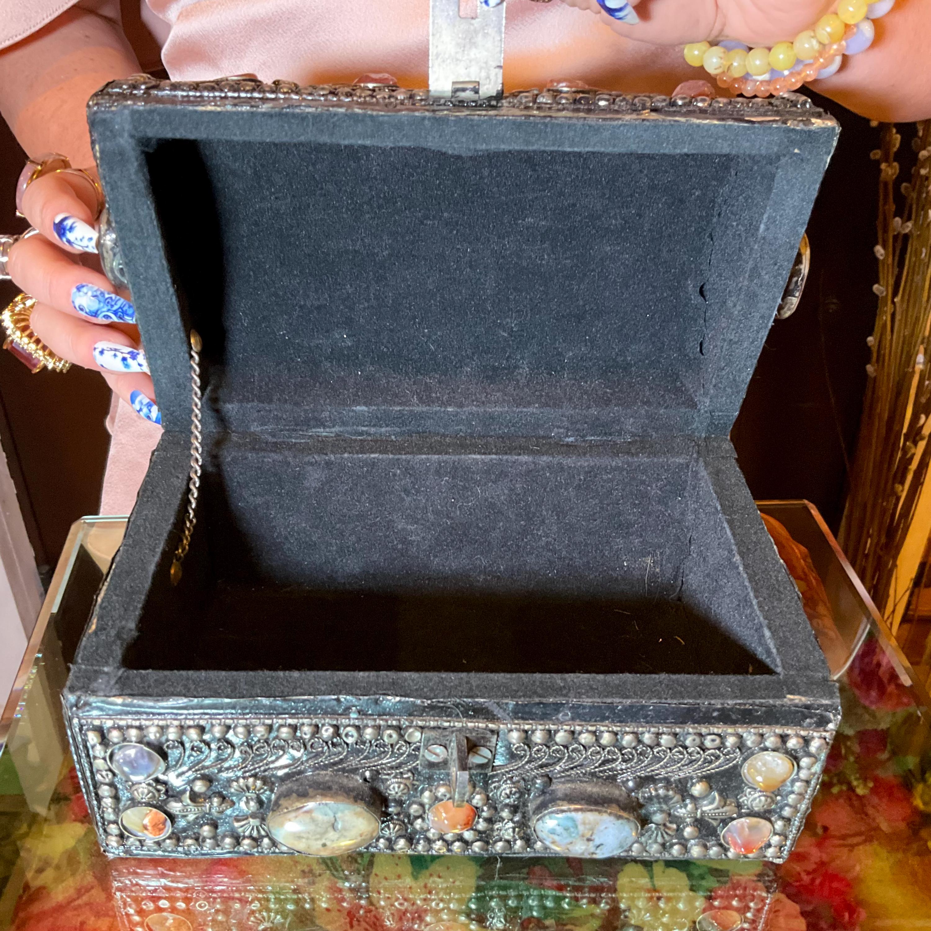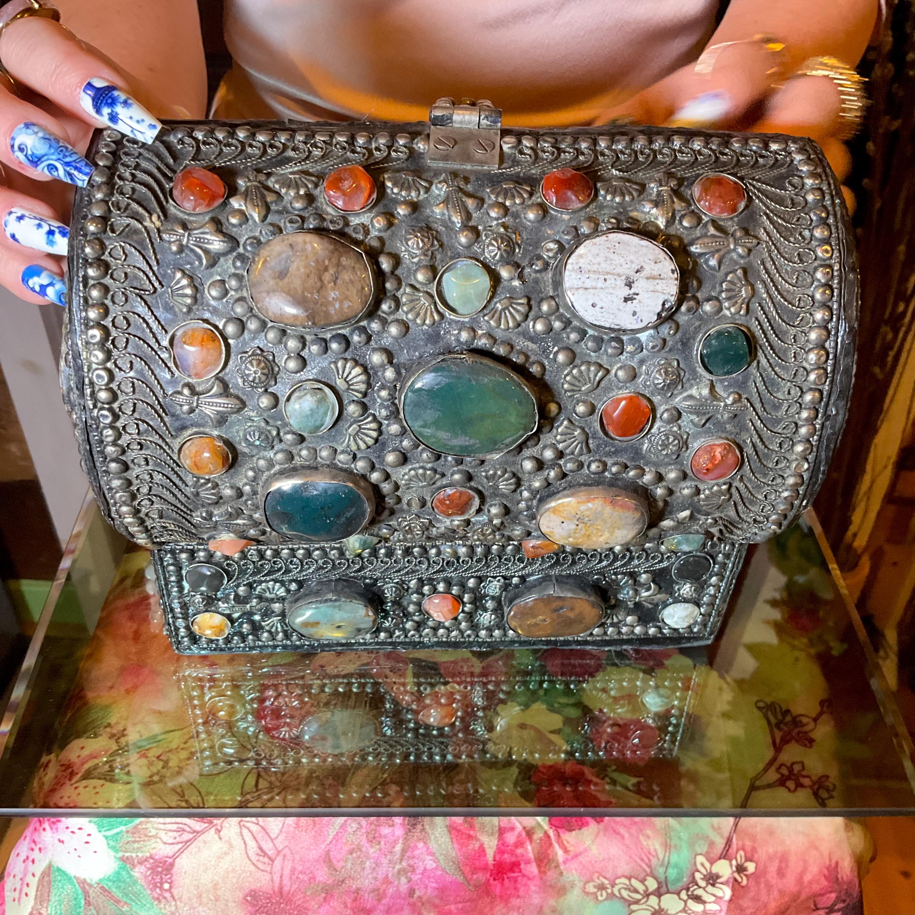 The Vintage Moroccan jewelry box is inlaid with semi-precious agate stones and covered with silvered metal filigree.