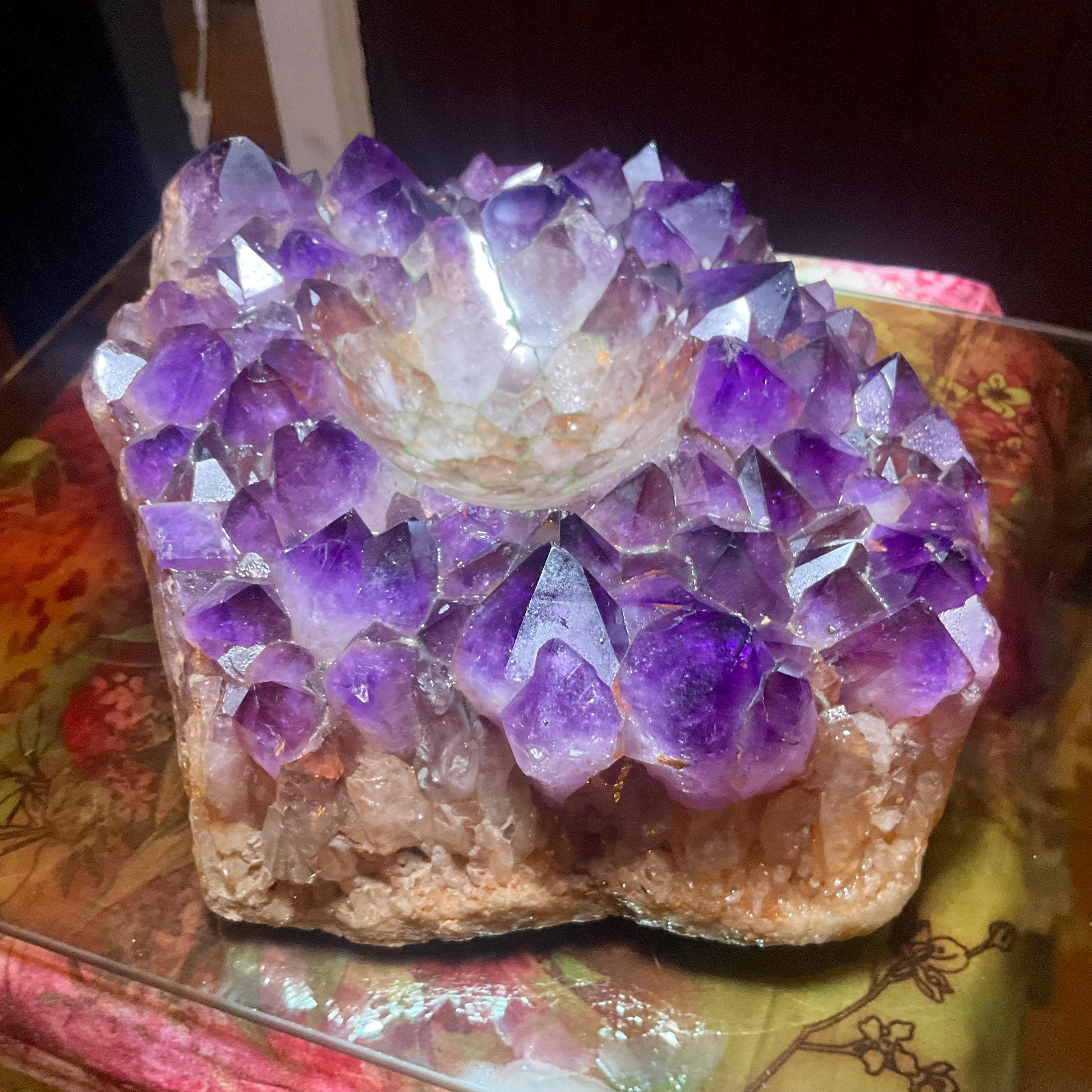 This is a beautiful deep purple Amethyst crystal bowl charging dish cluster.
