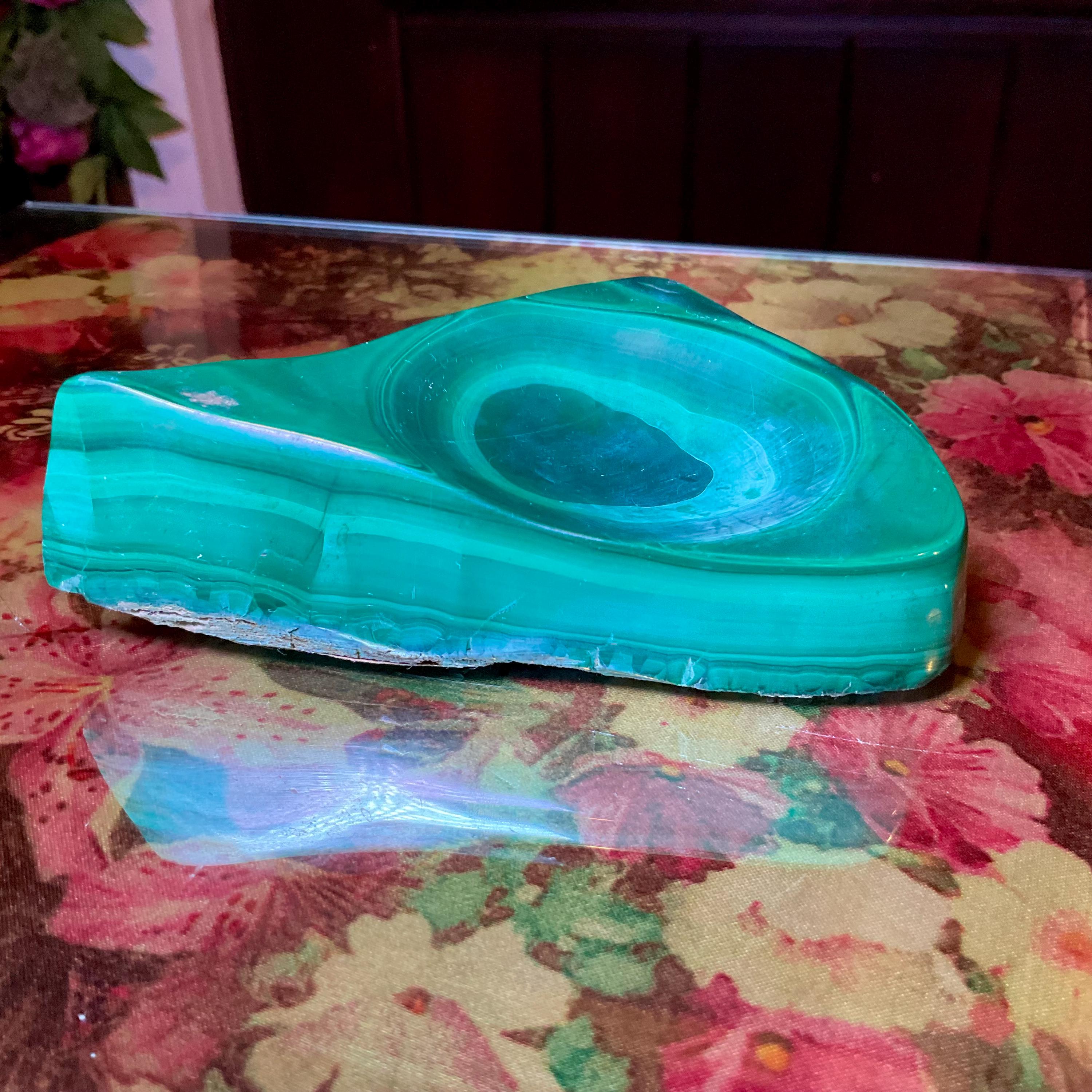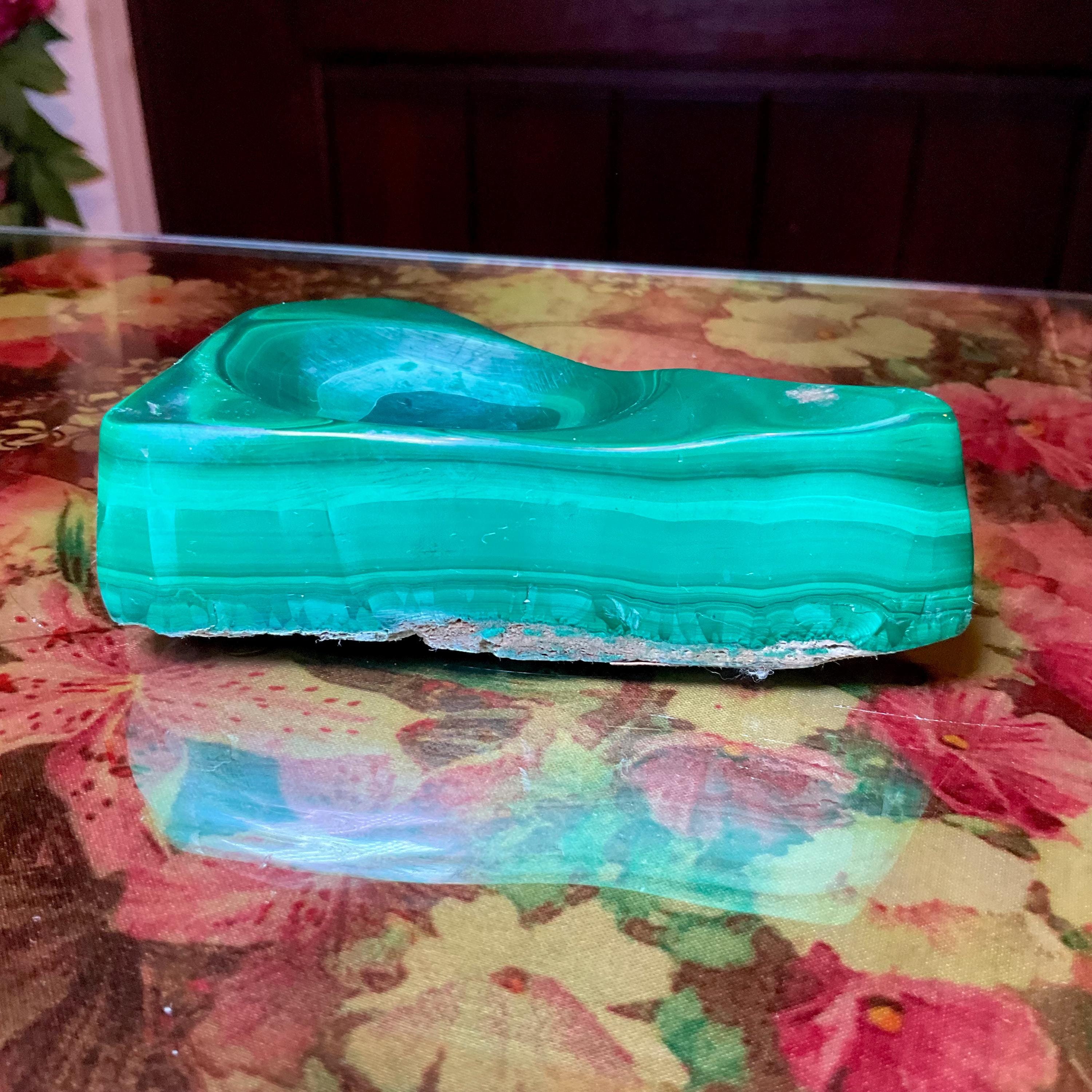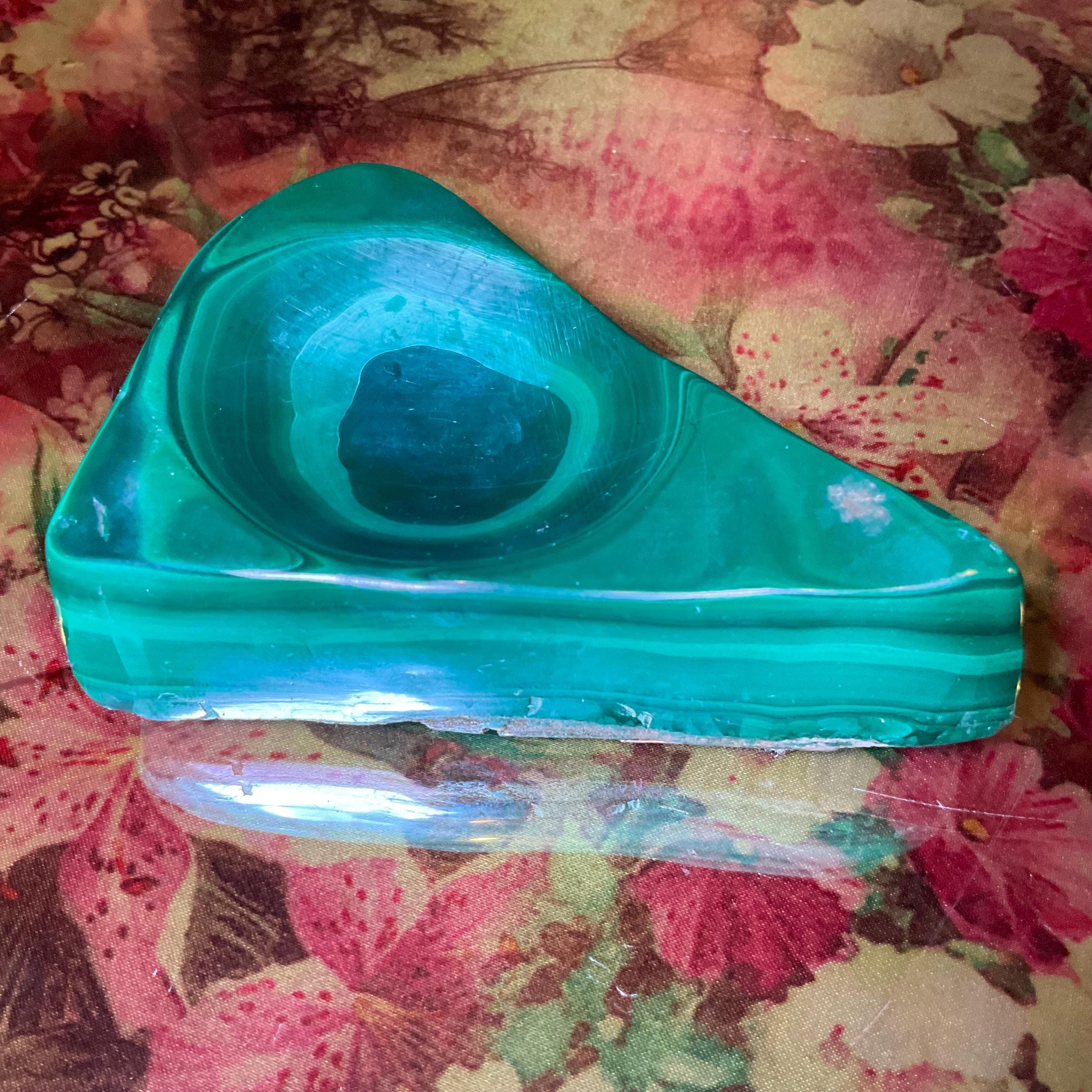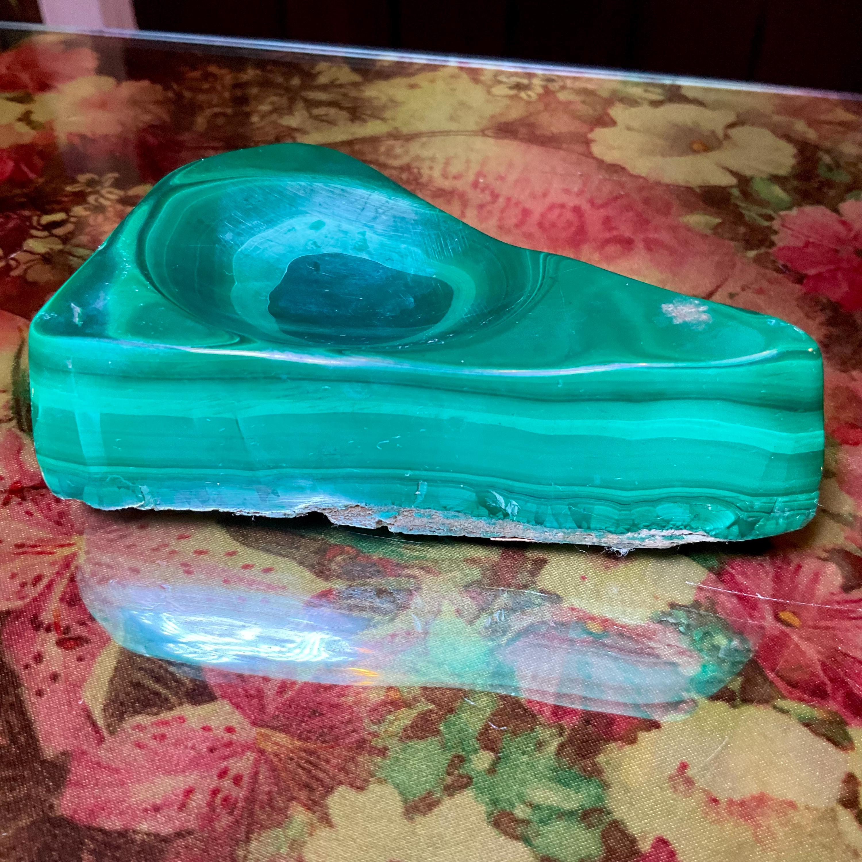 This gorgeous malachite free form stone dish is perfection the vibrant deep green colors swirling into beautiful patterns, is unique only to this mineral making it truly a remarkable piece for your collection.