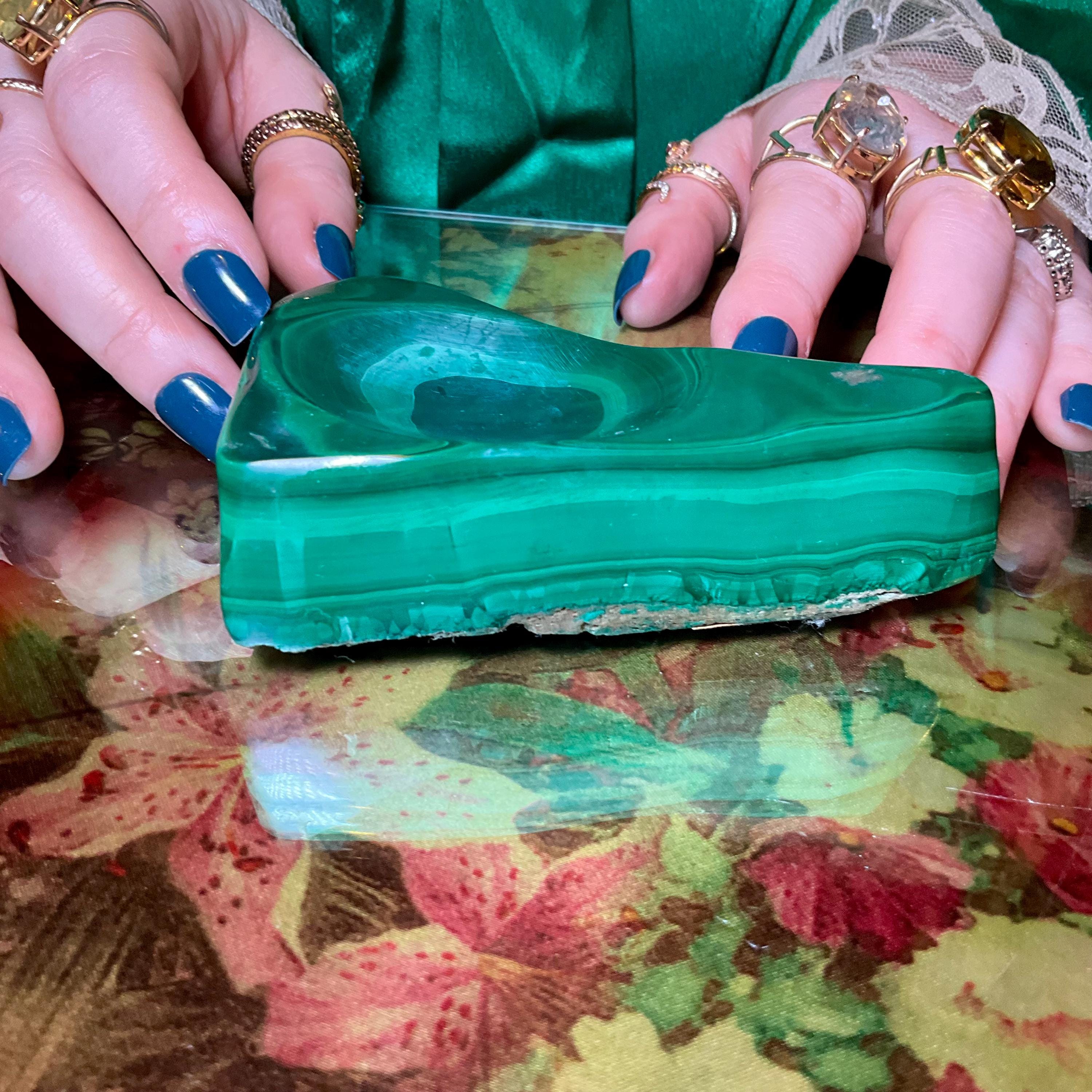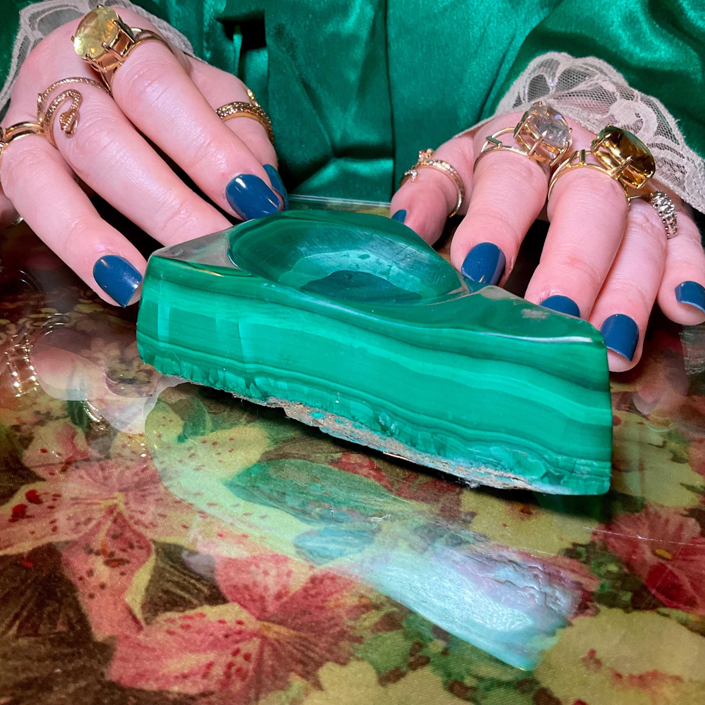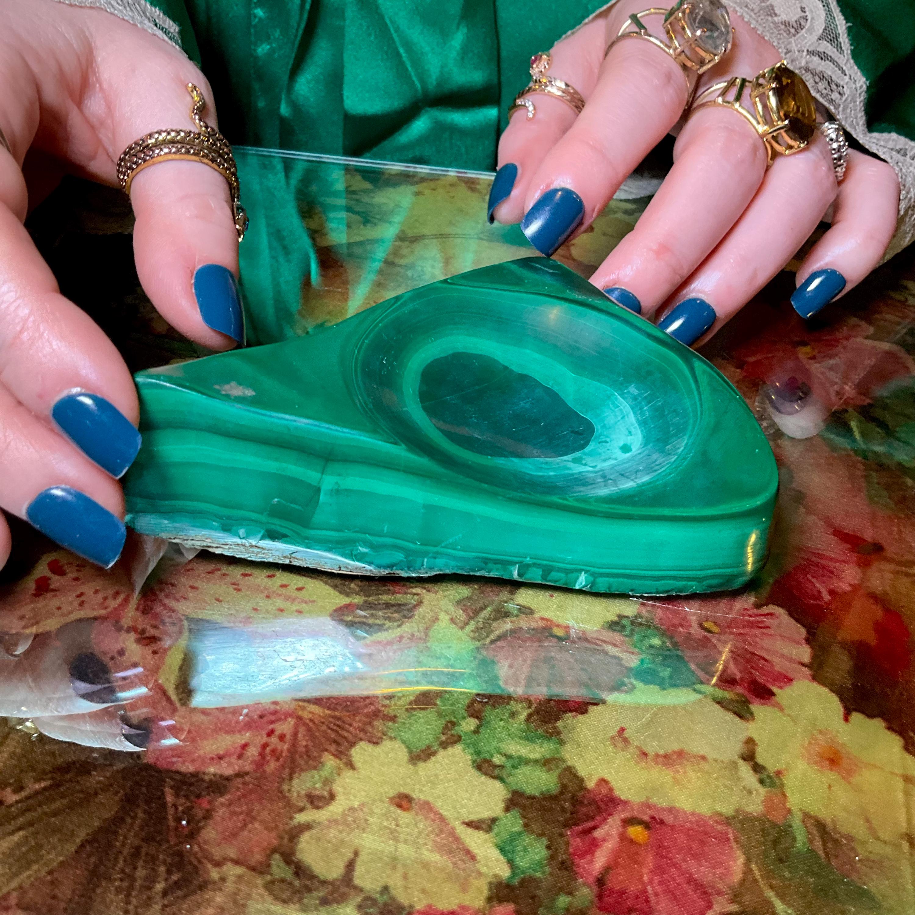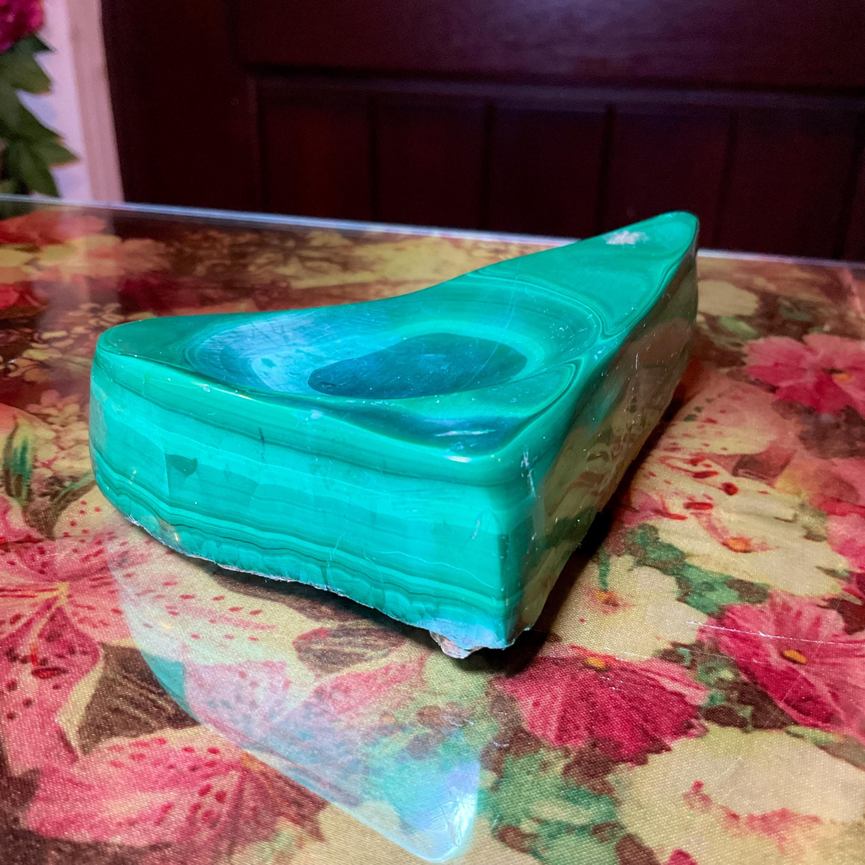 This gorgeous malachite free form stone dish is perfection the vibrant deep green colors swirling into beautiful patterns, is unique only to this mineral making it truly a remarkable piece for your collection.