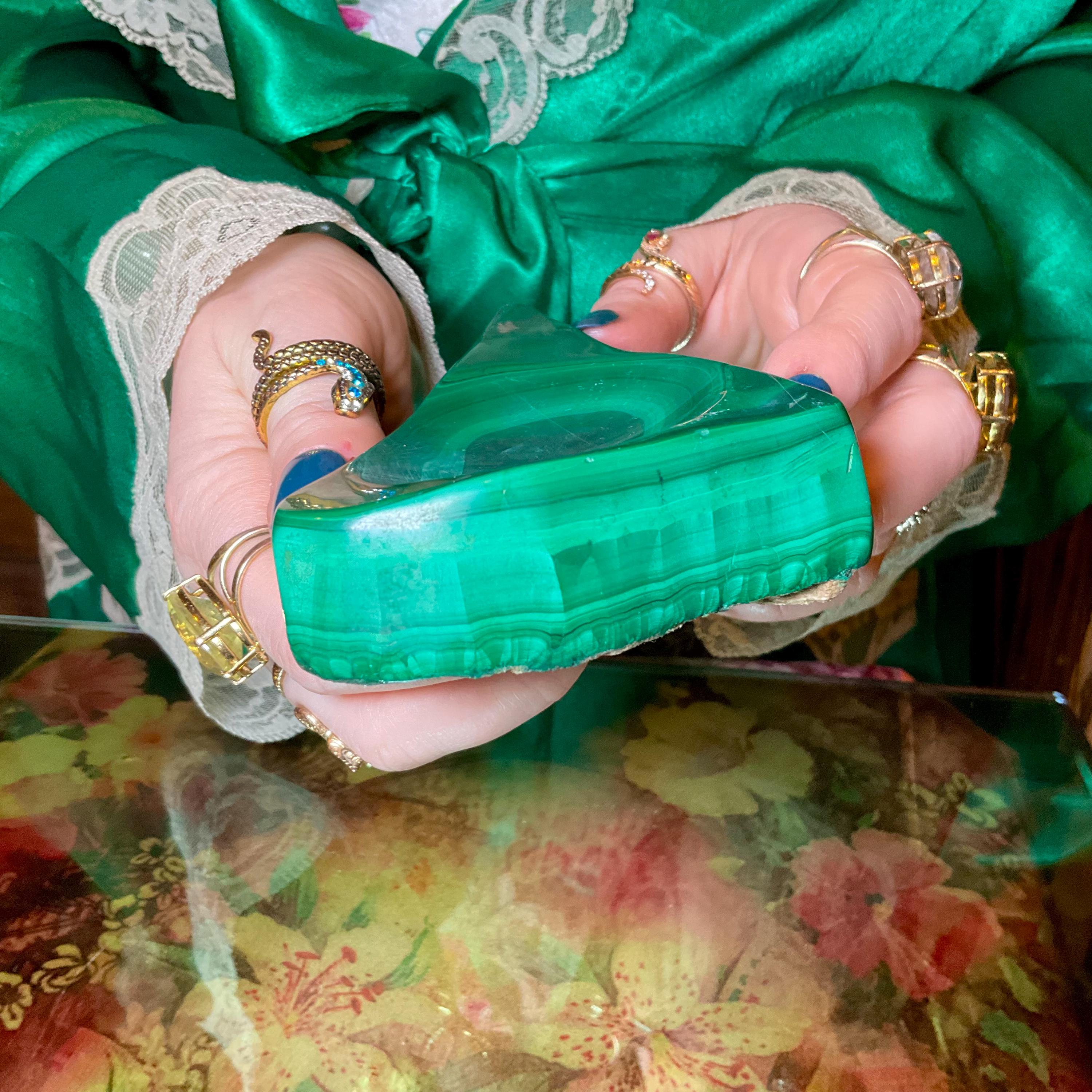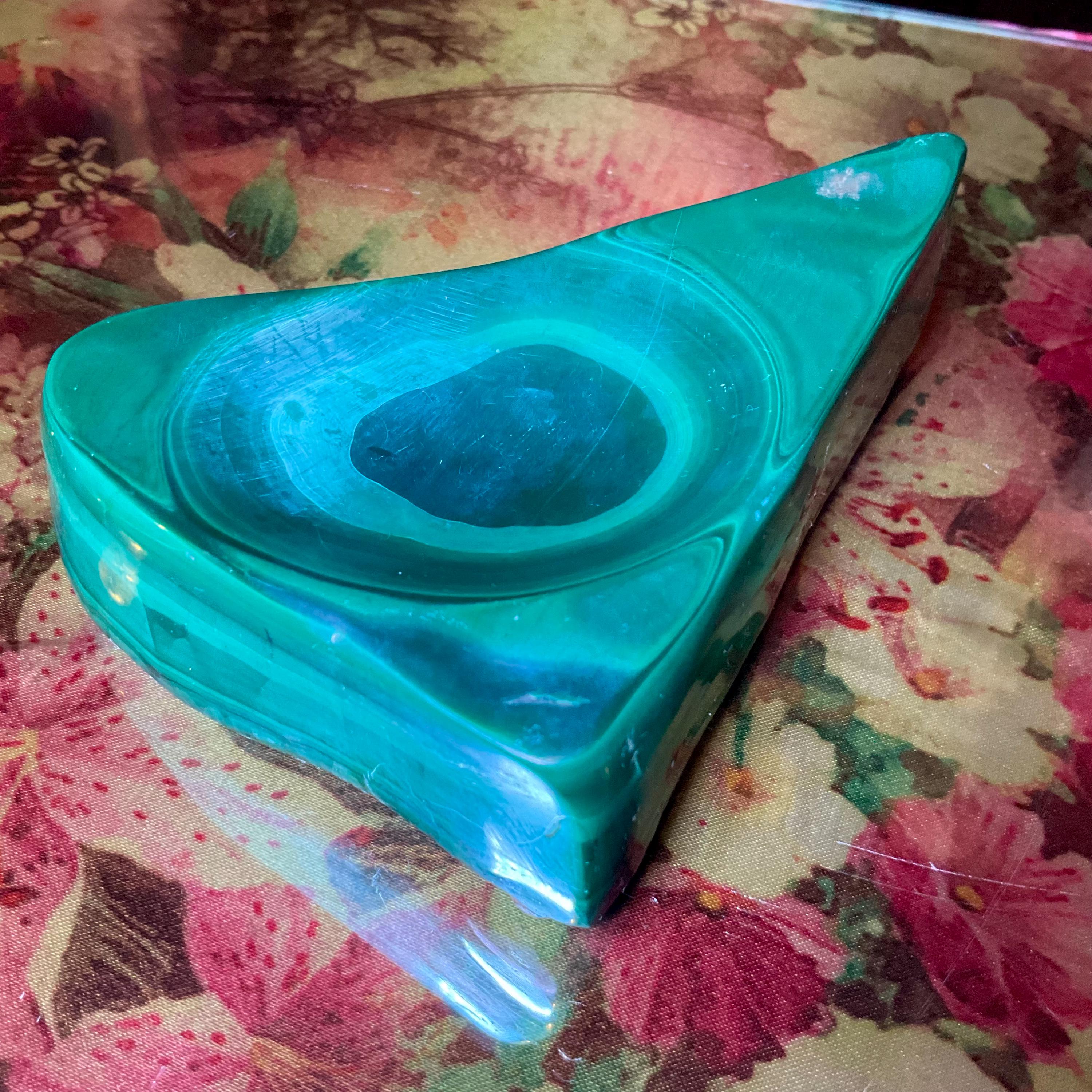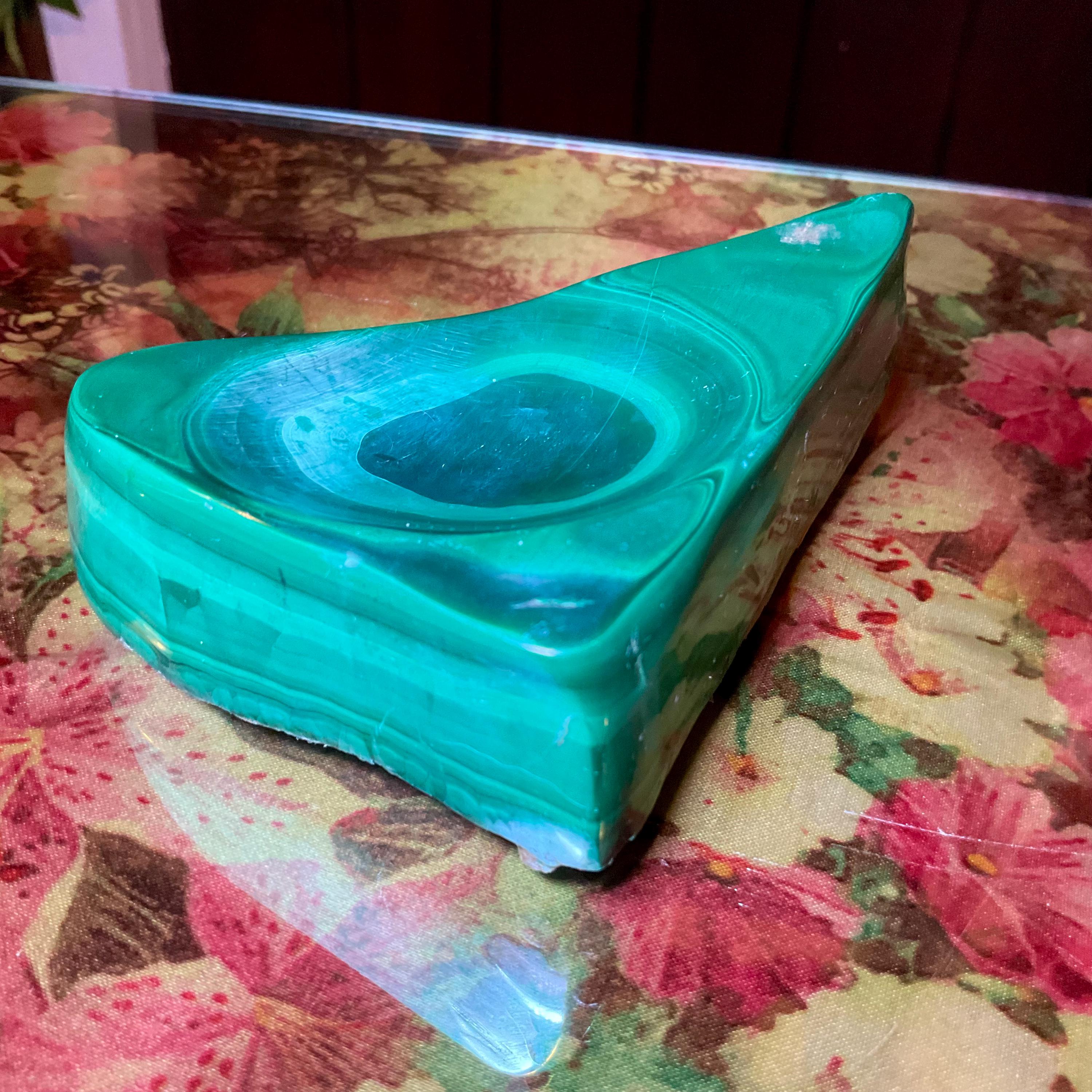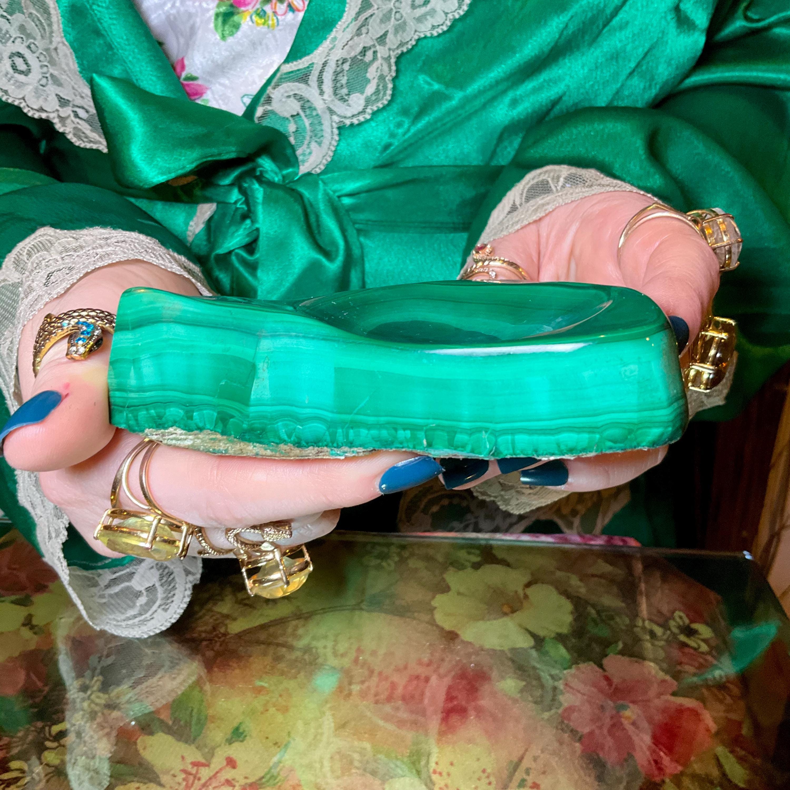 This gorgeous malachite free form stone dish is perfection the vibrant deep green colors swirling into beautiful patterns, is unique only to this mineral making it truly a remarkable piece for your collection.