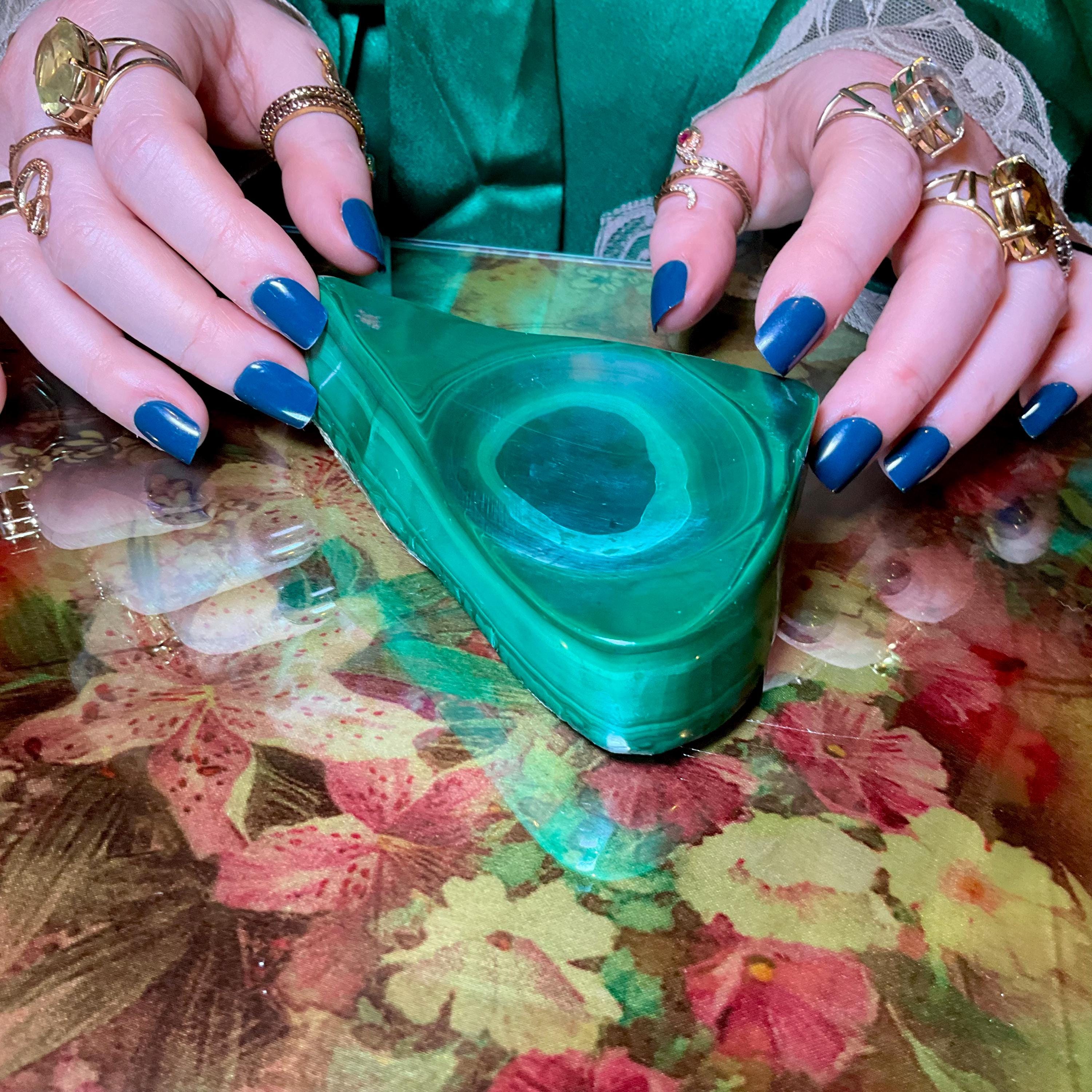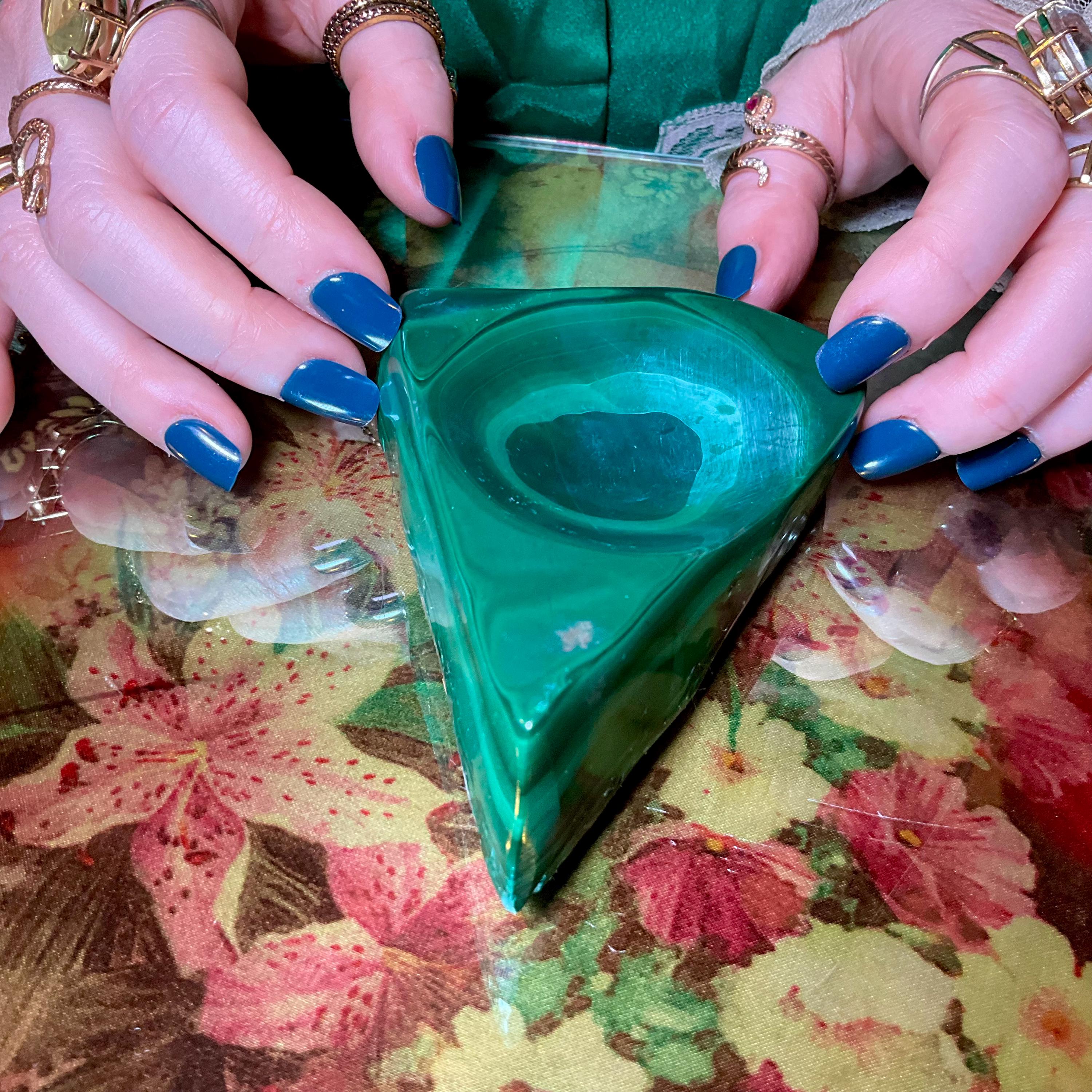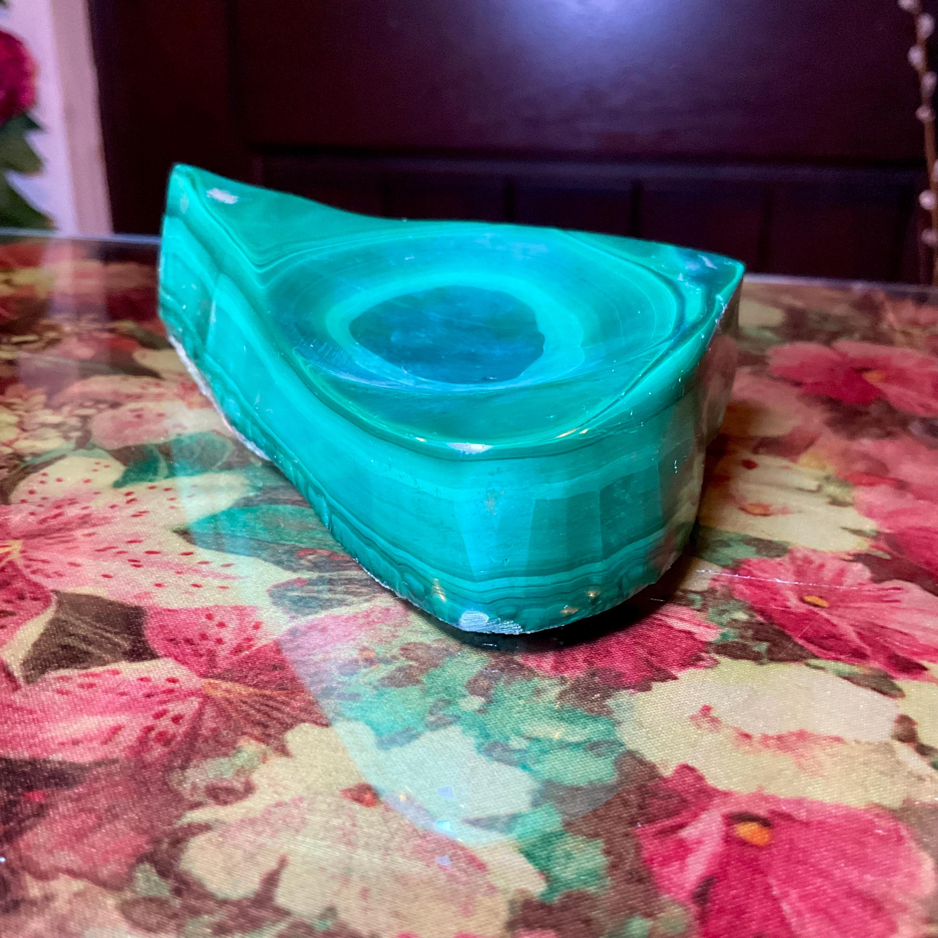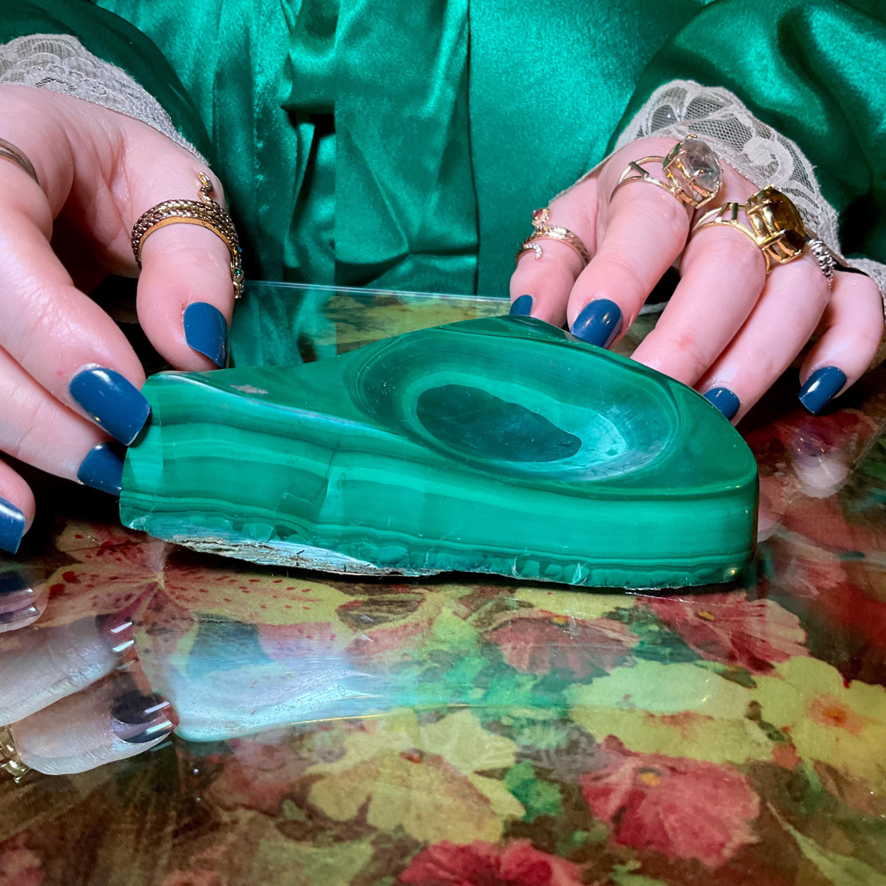 This gorgeous malachite free form stone dish is perfection the vibrant deep green colors swirling into beautiful patterns, is unique only to this mineral making it truly a remarkable piece for your collection.