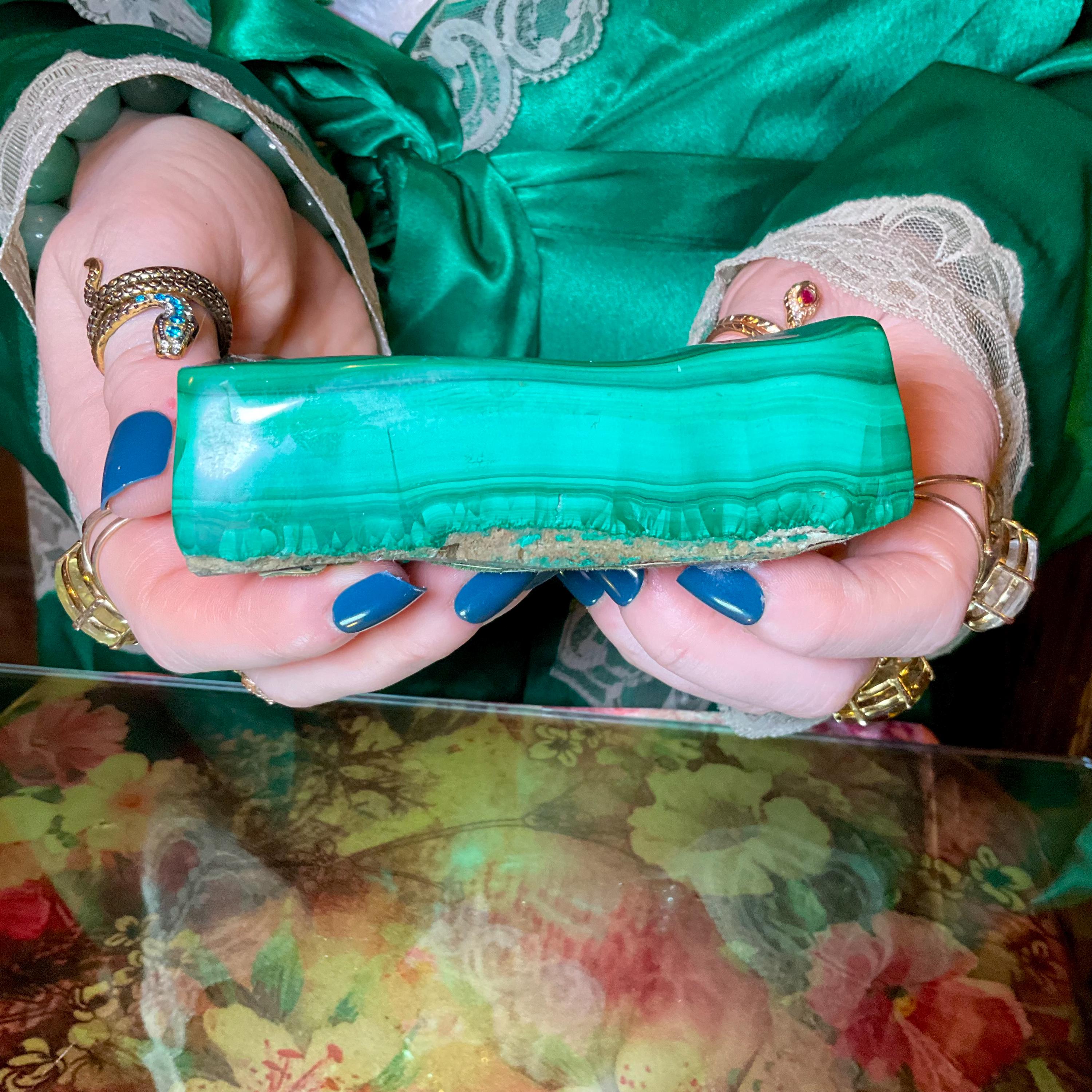 This piece of vintage Congo Malachite is so beautiful, so thick and its natural patina is not like the modern Malachite from China ~ its colors are so rich, and the detail of the stone is hand carved, making it a one-of-a-kind creation.