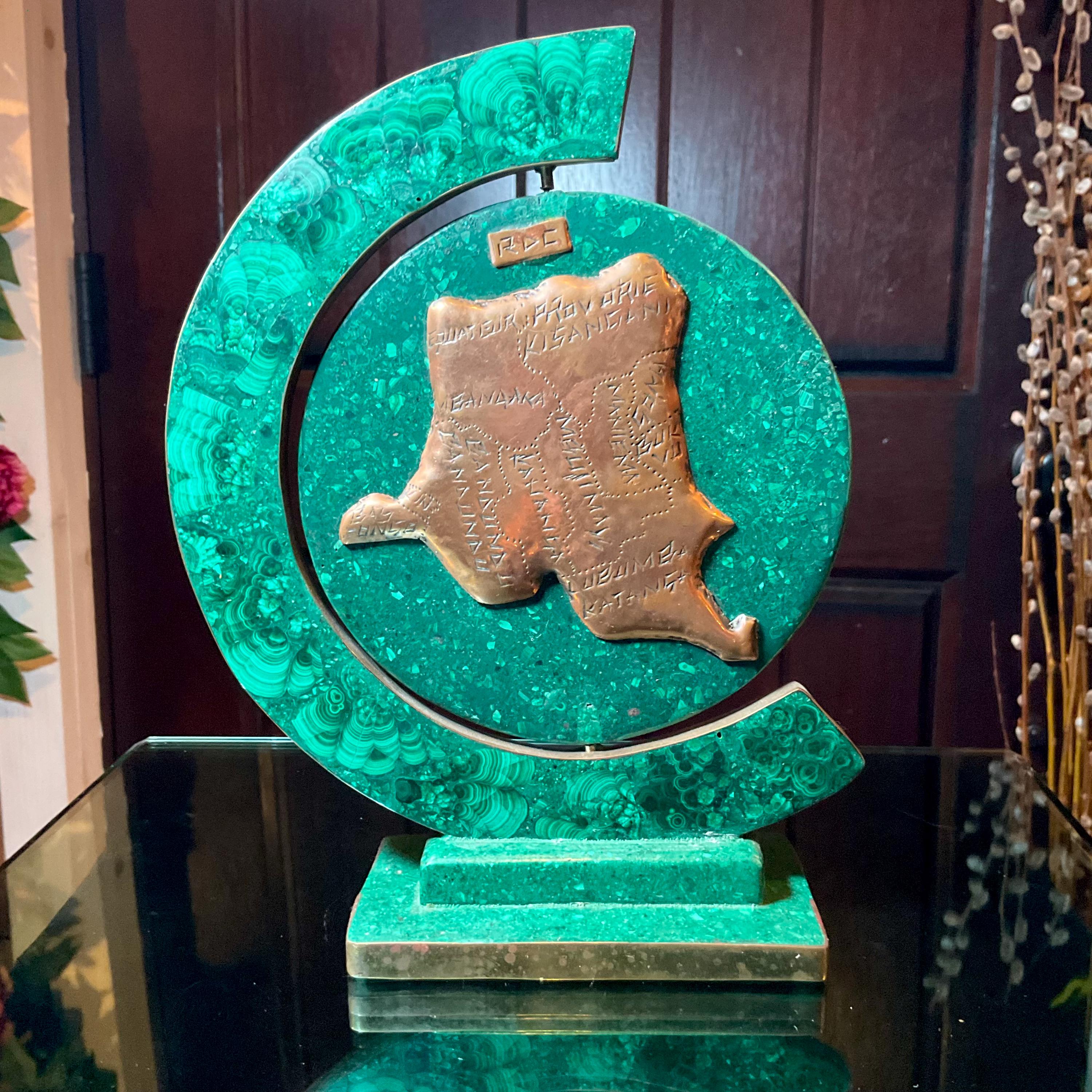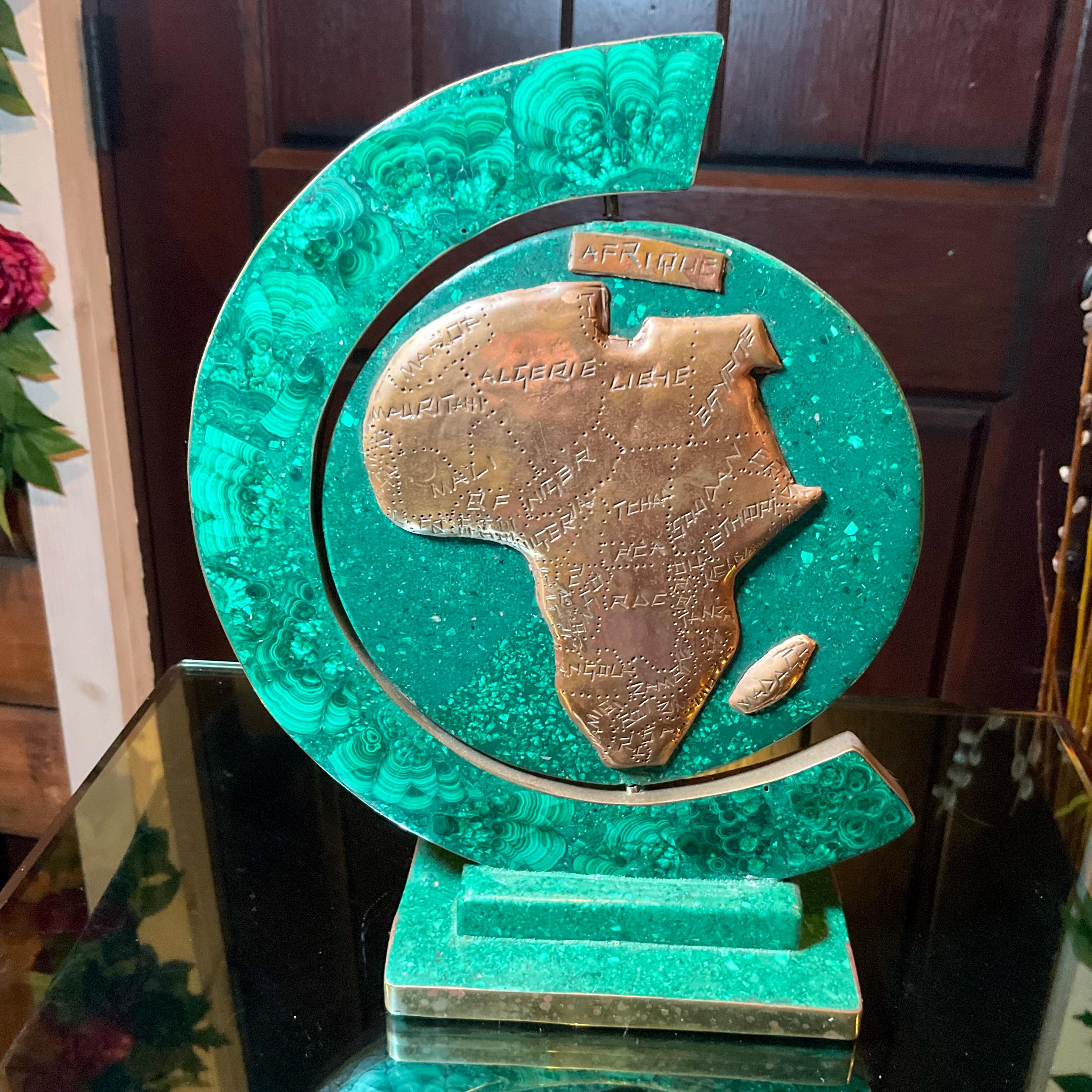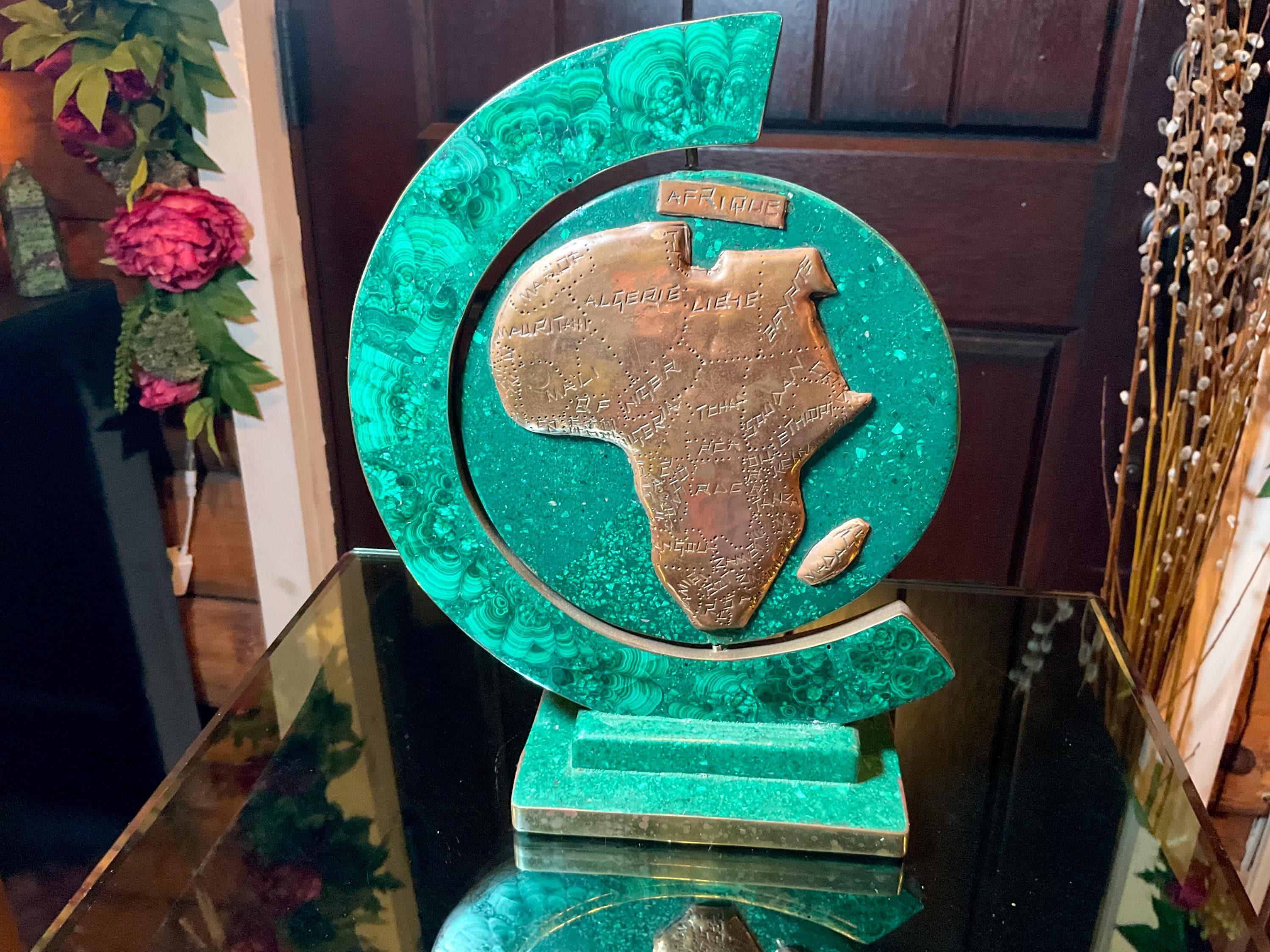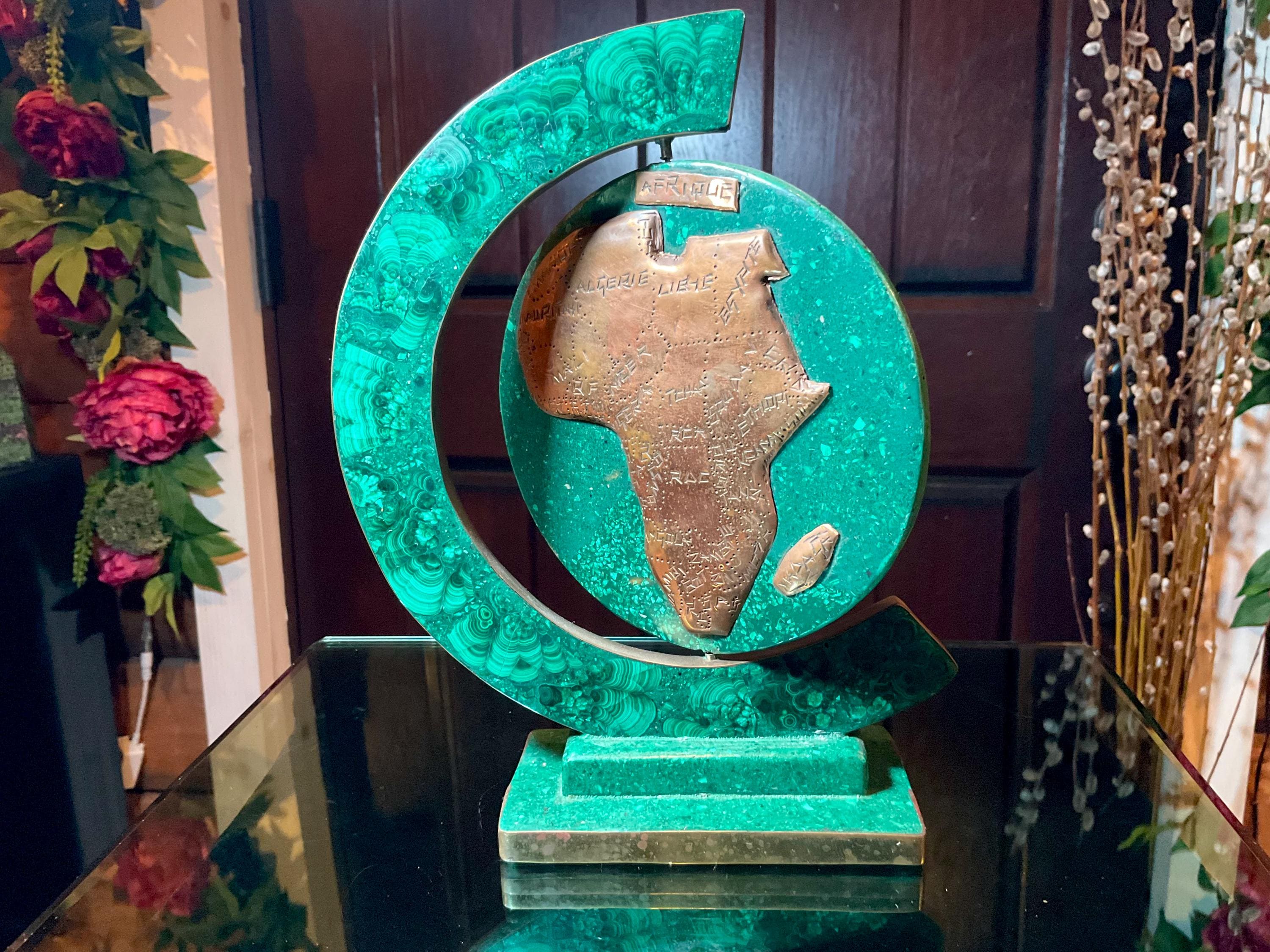 This Vintage Malachite & Copper Map of Africa is two-sided, one side is the map of Africa, the other side is a map of the 'Republic of Congo" it is self-standing trimmed in copper.