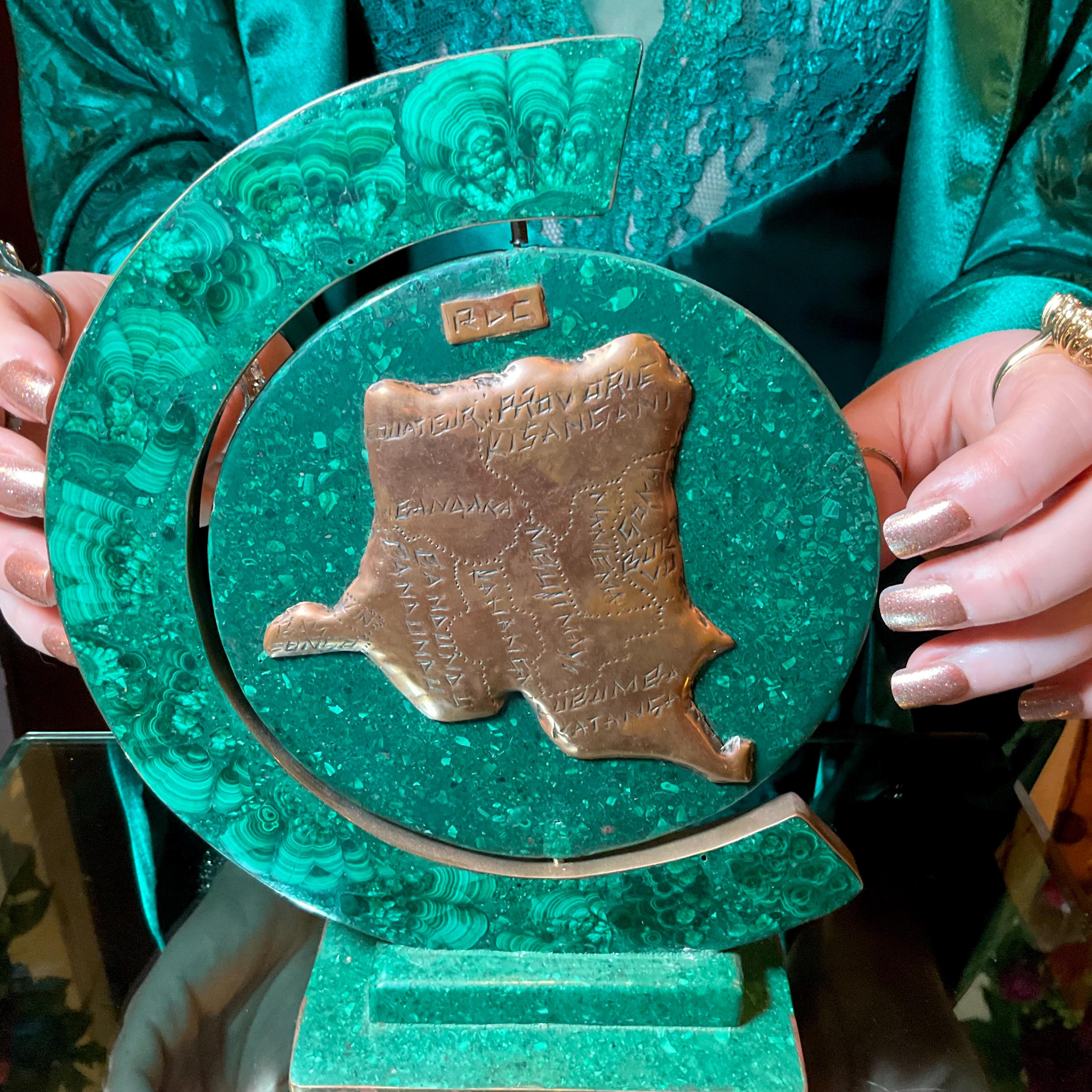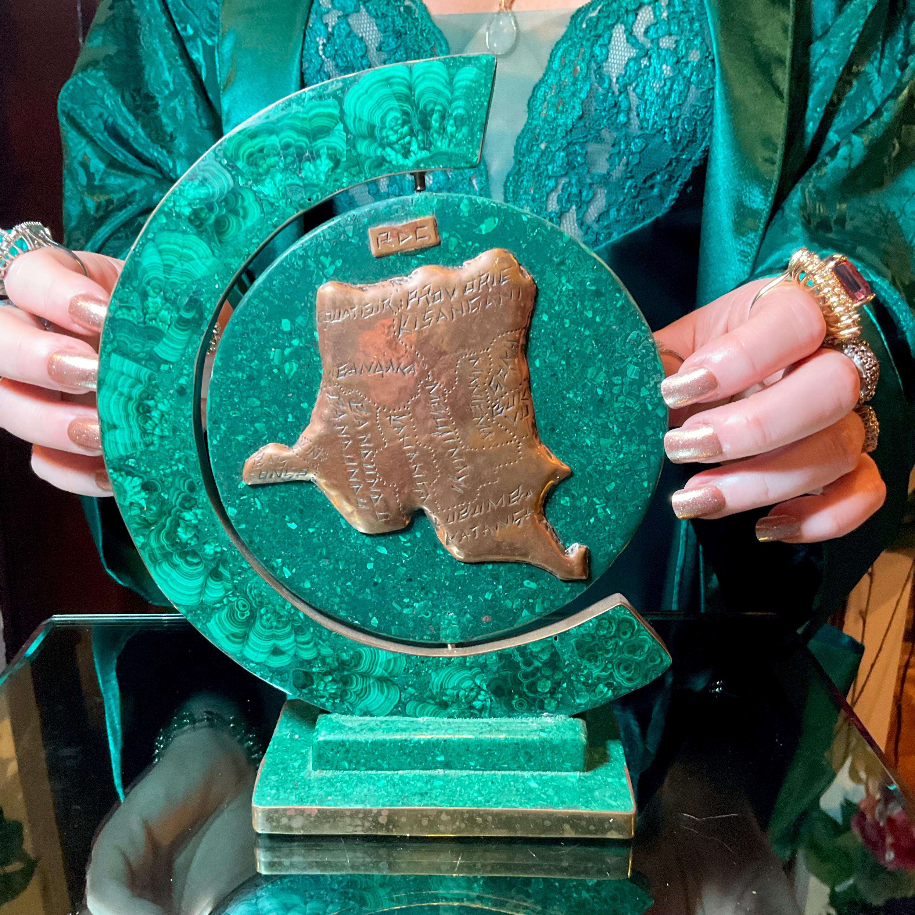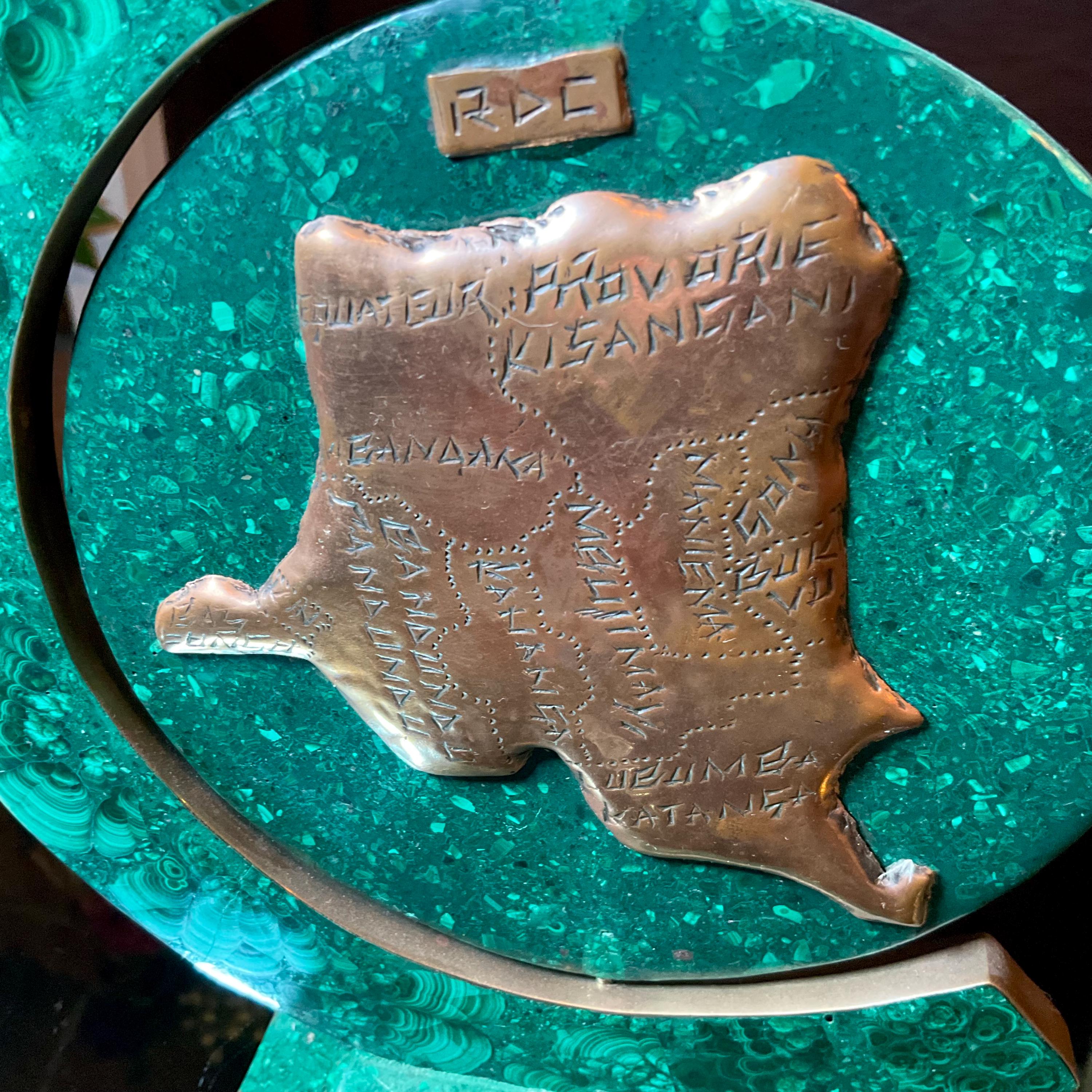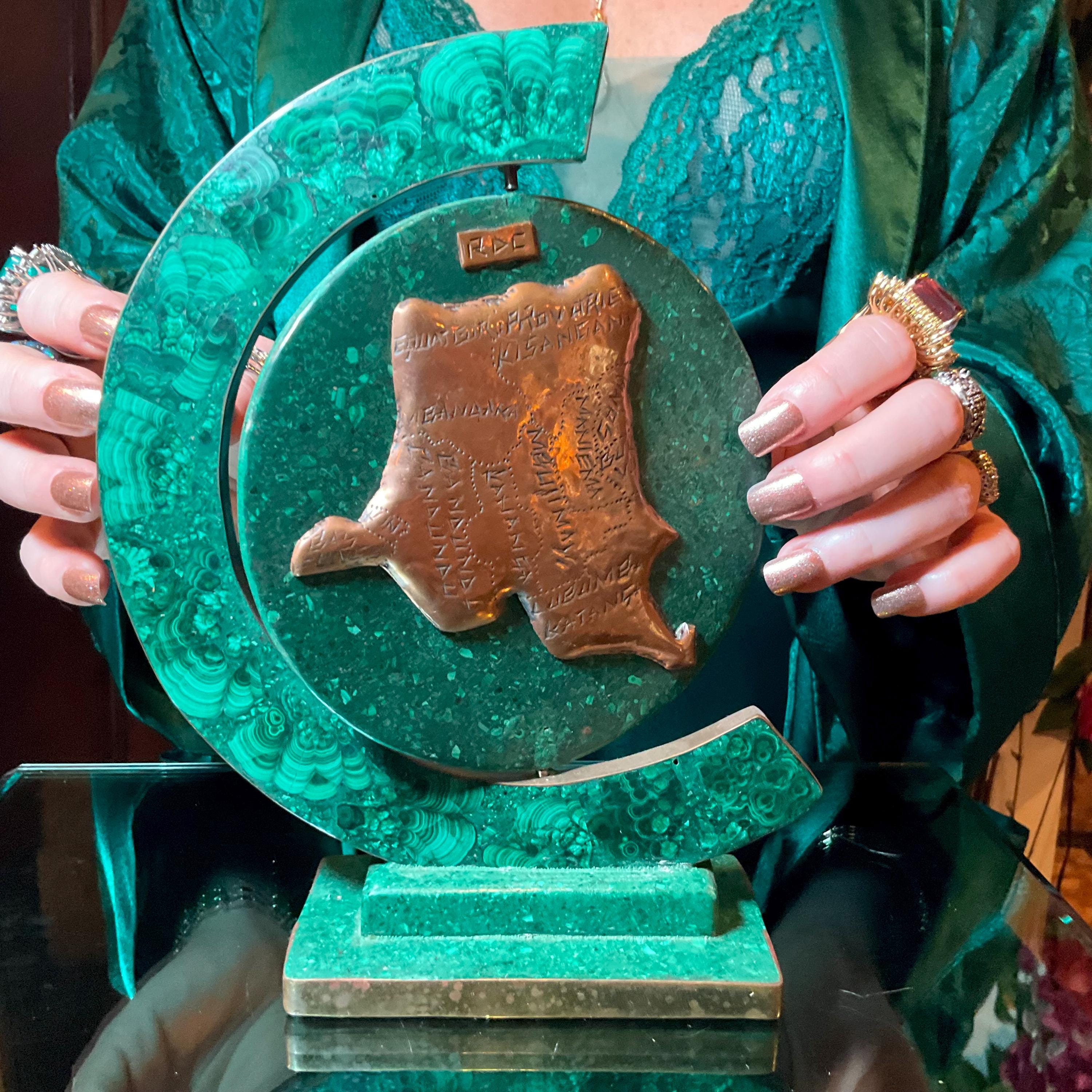 This Vintage Malachite & Copper Map of Africa is two-sided, one side is the map of Africa, the other side is a map of the 'Republic of Congo" it is self-standing trimmed in copper.