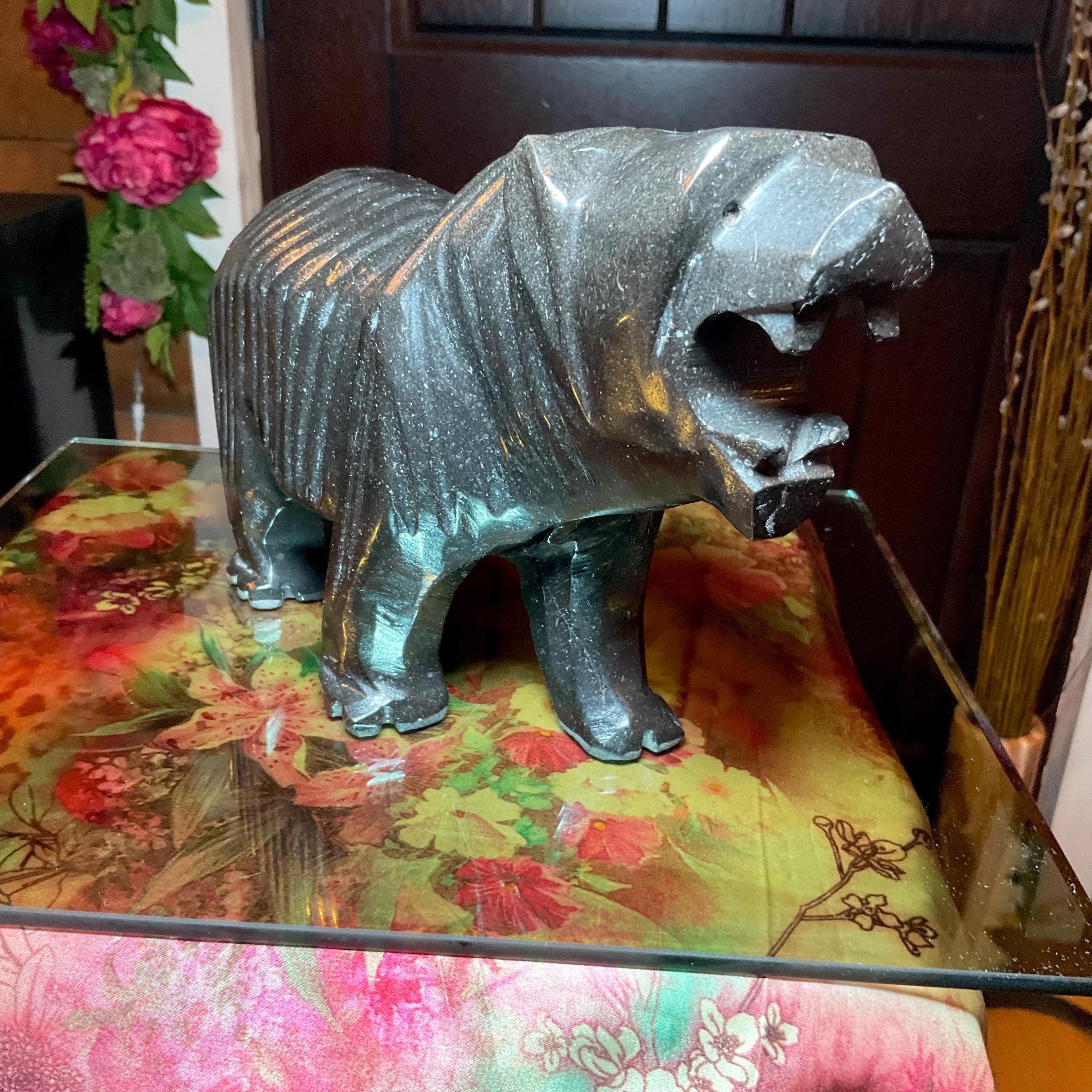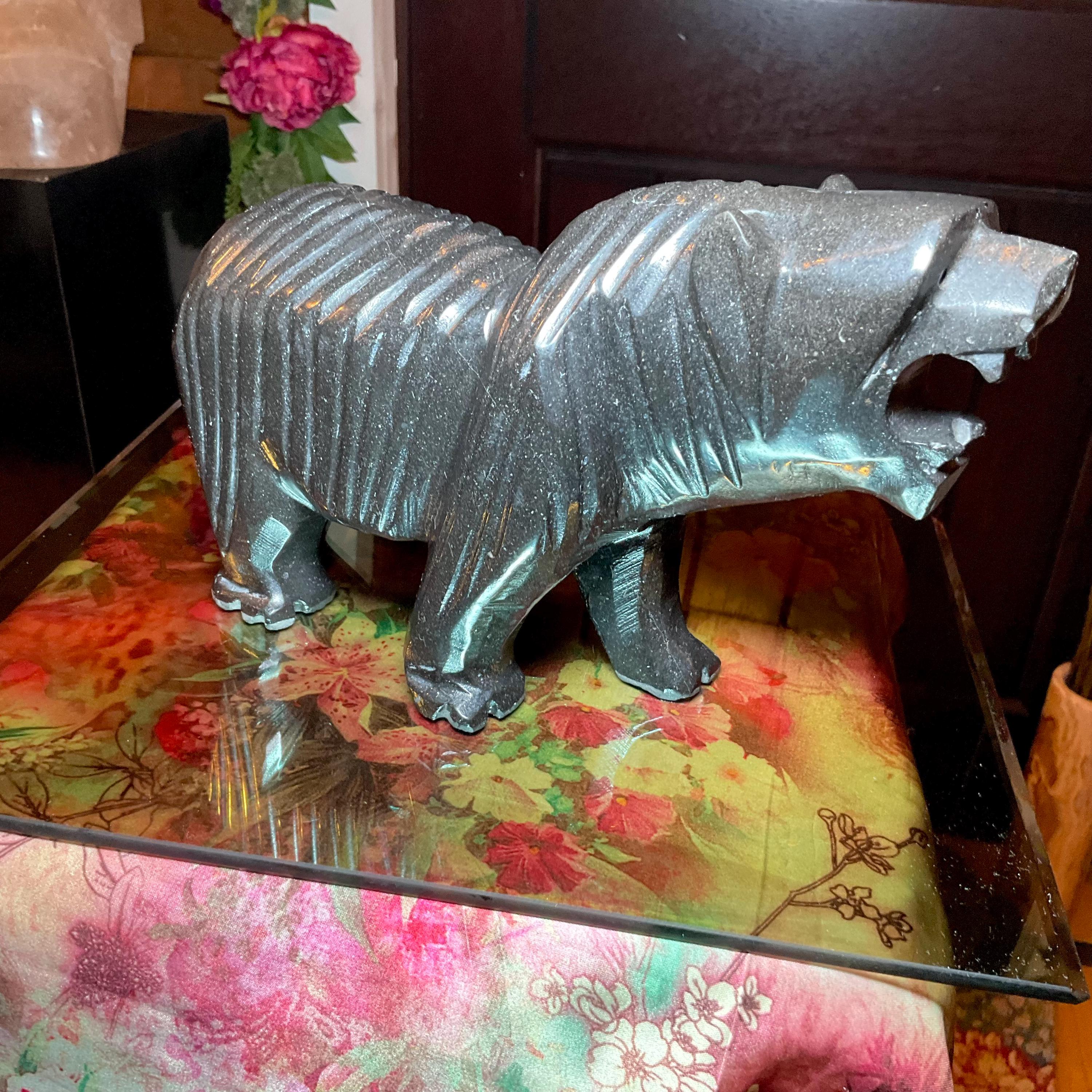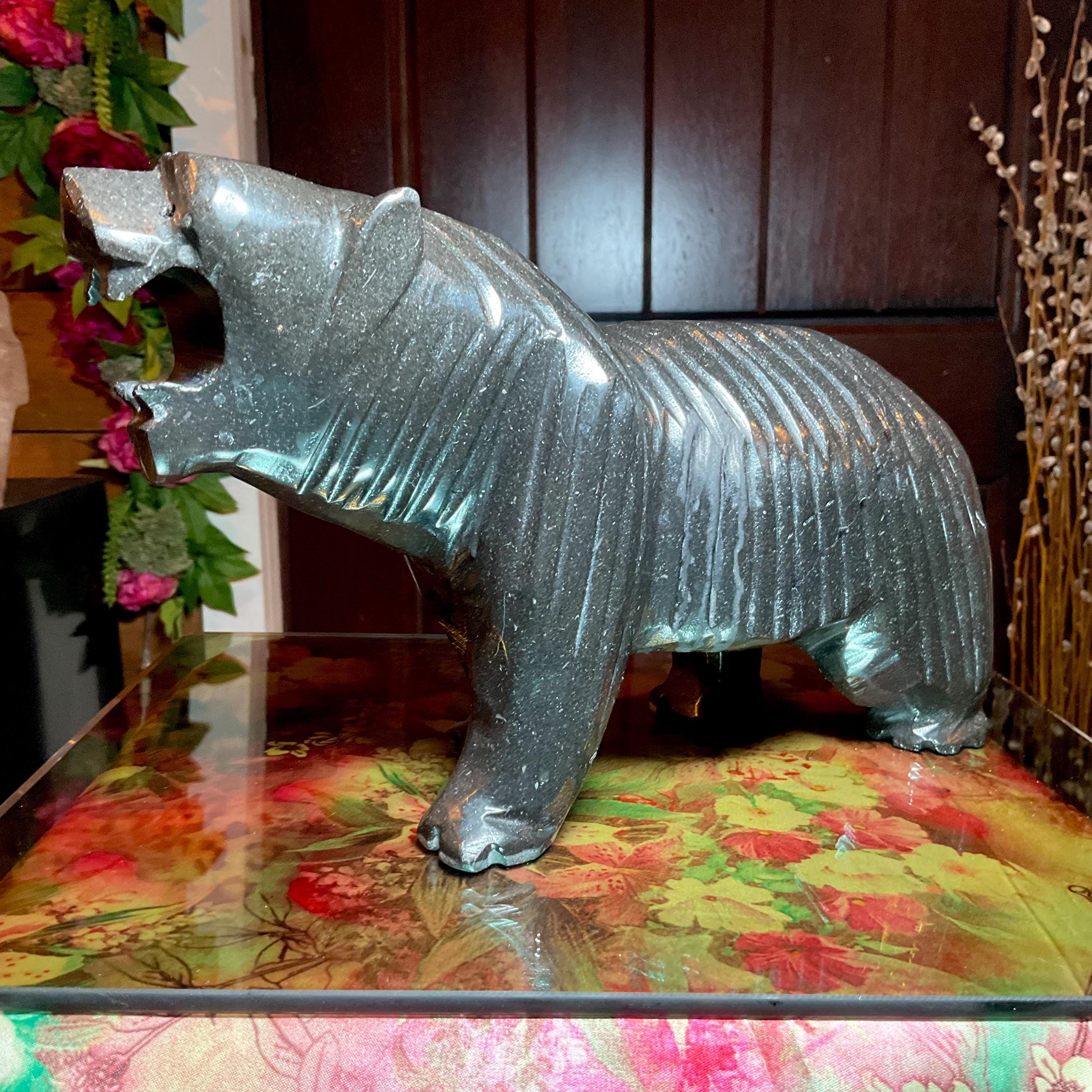 This Vintage Black Tourmaline Grizzly Bear Carved Sculpture is a unique and impressive piece that weighs 7 pounds and measures 11 inches in length, 3 inches wide and 5 inches tall and it was beautifully hand carved a long time ago making this a great display item.