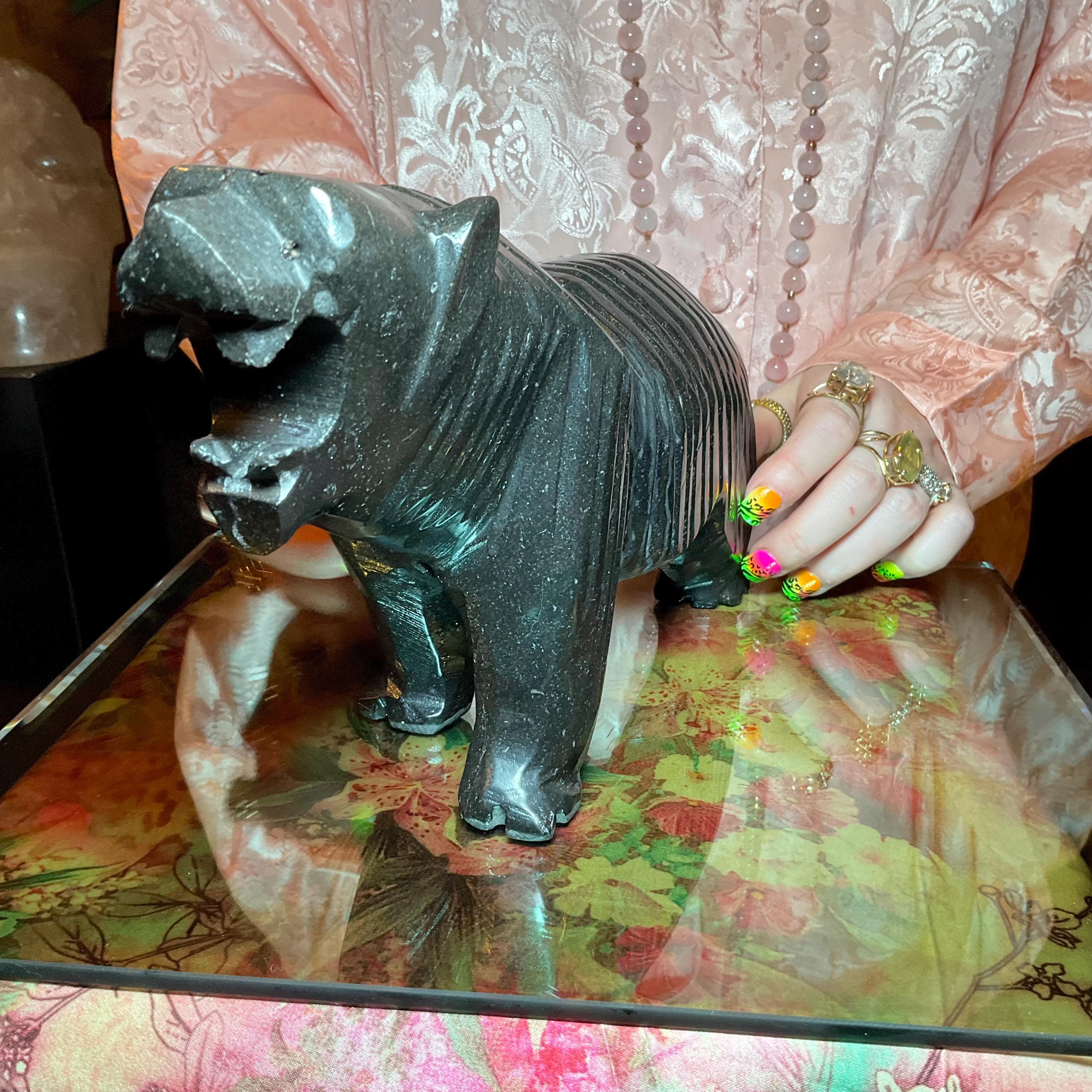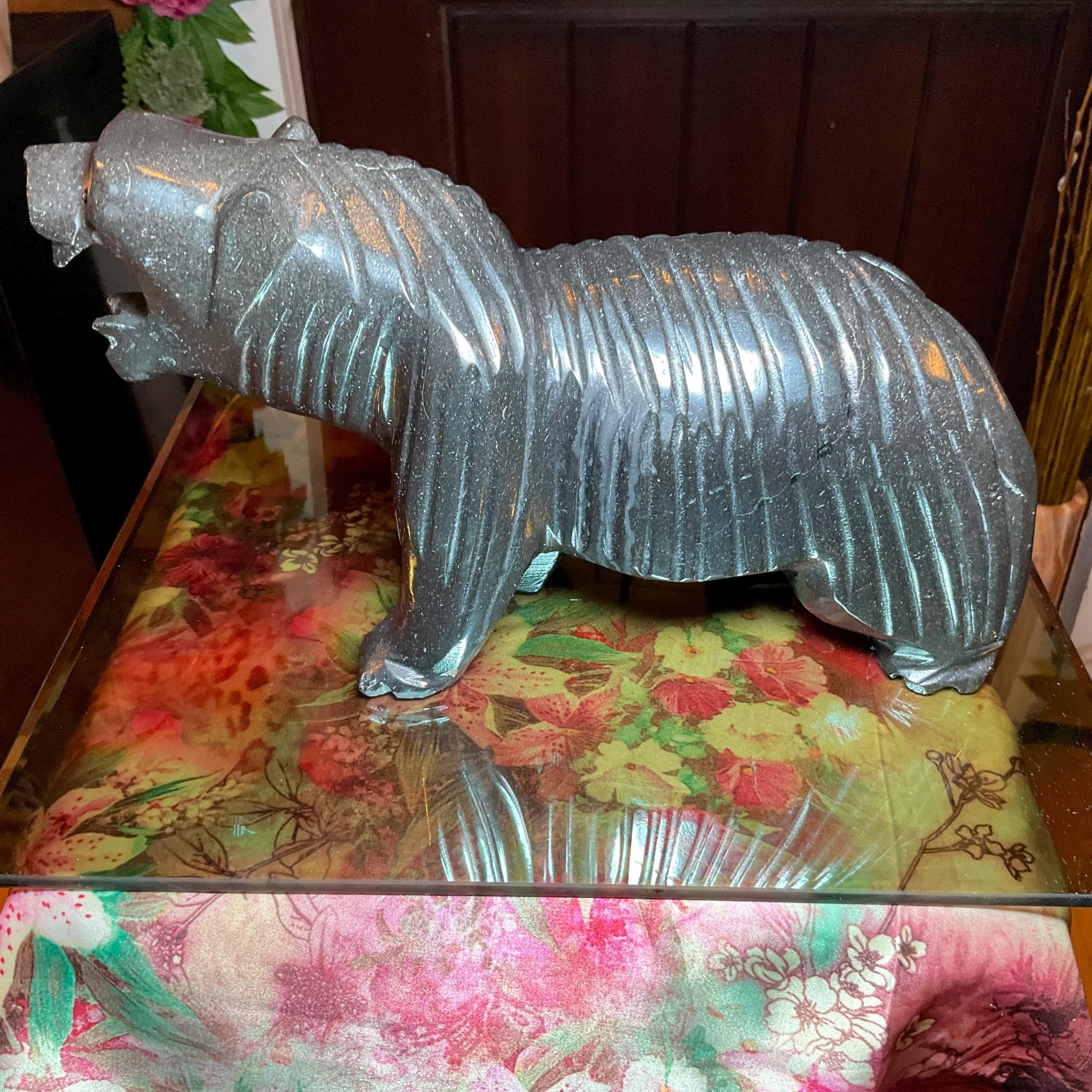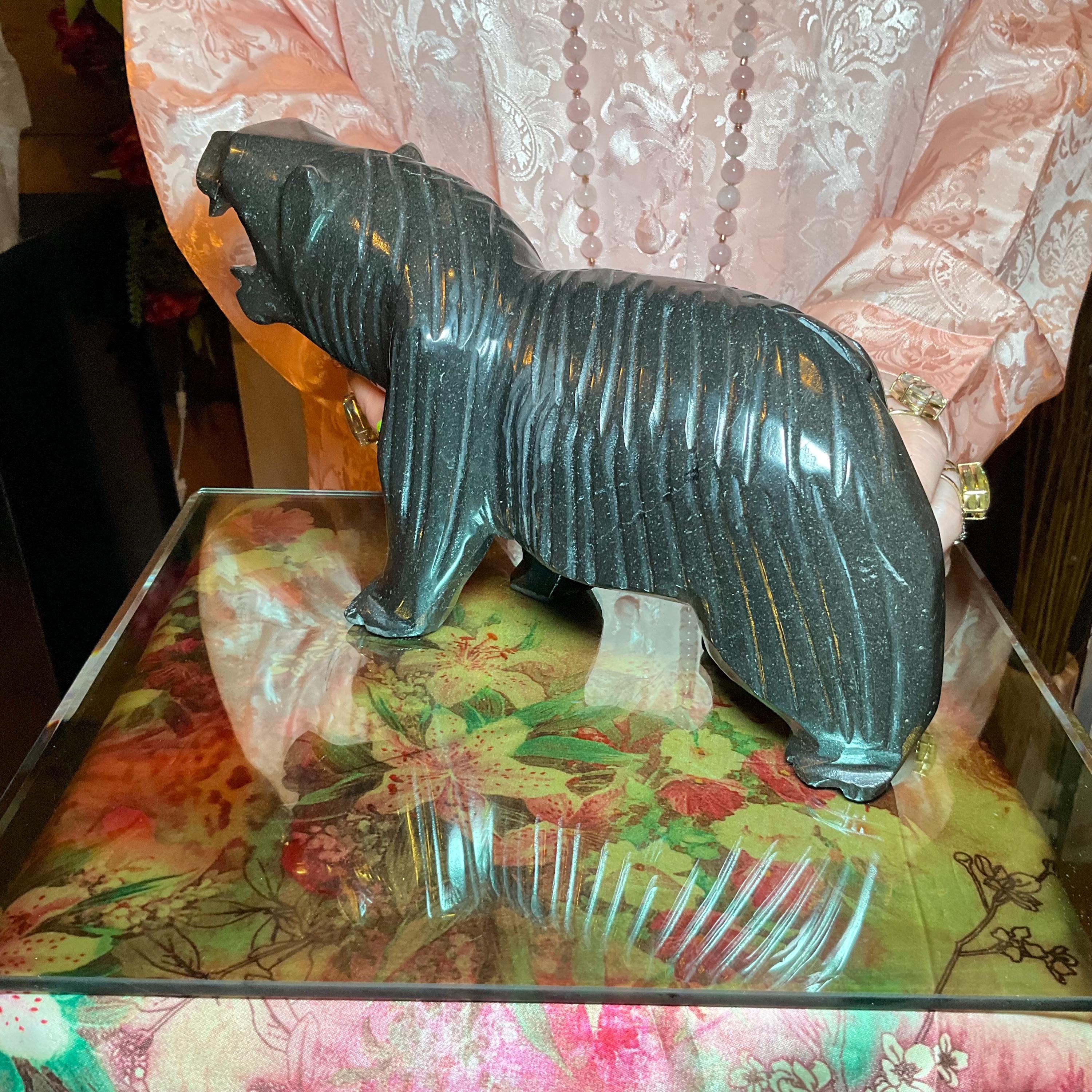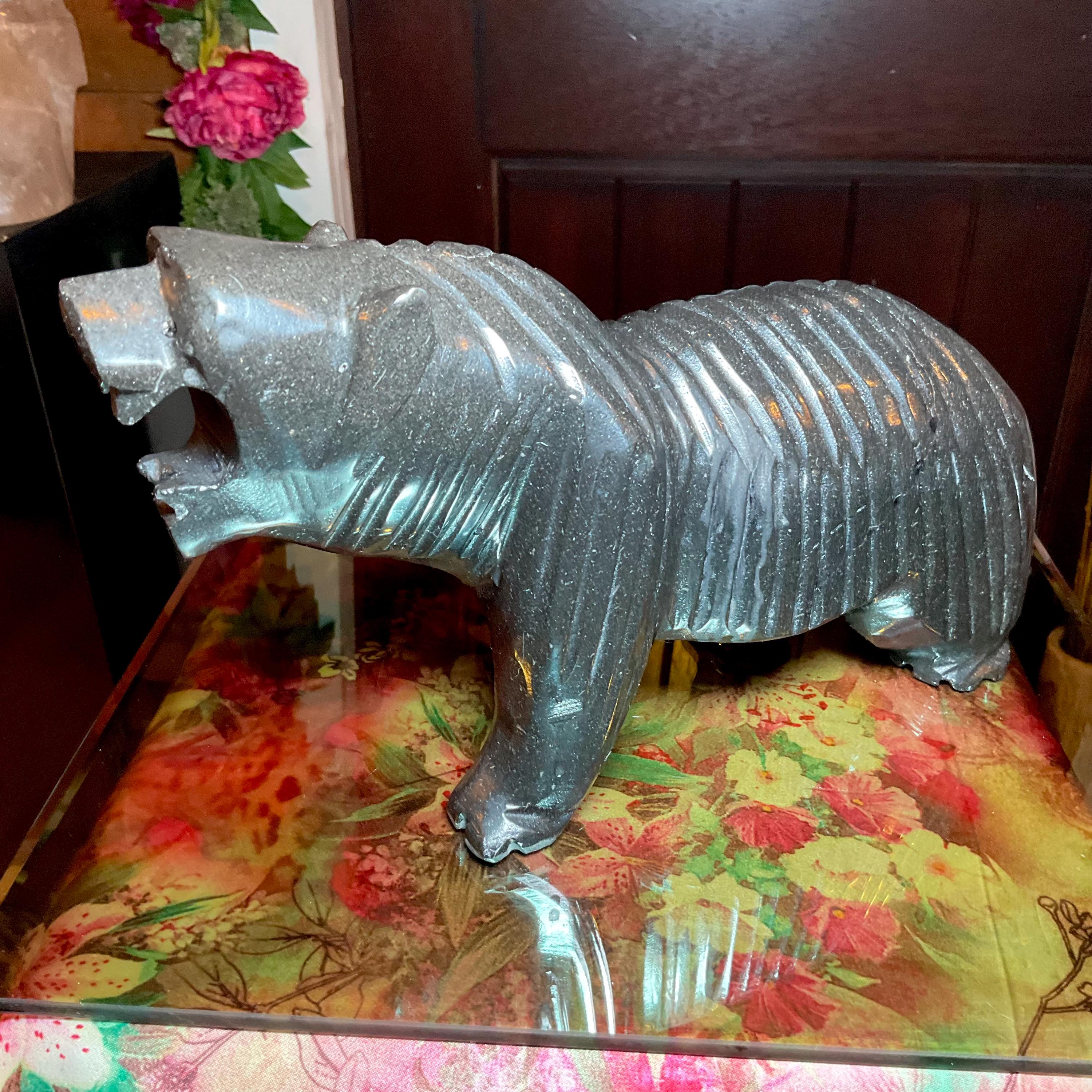 Vintage Black Tourmaline Bear Large 7 Lb.~ 11" Long ~ Art Sculpture Hand Carved Museum Quality ~ Swirling Sparkling Colors