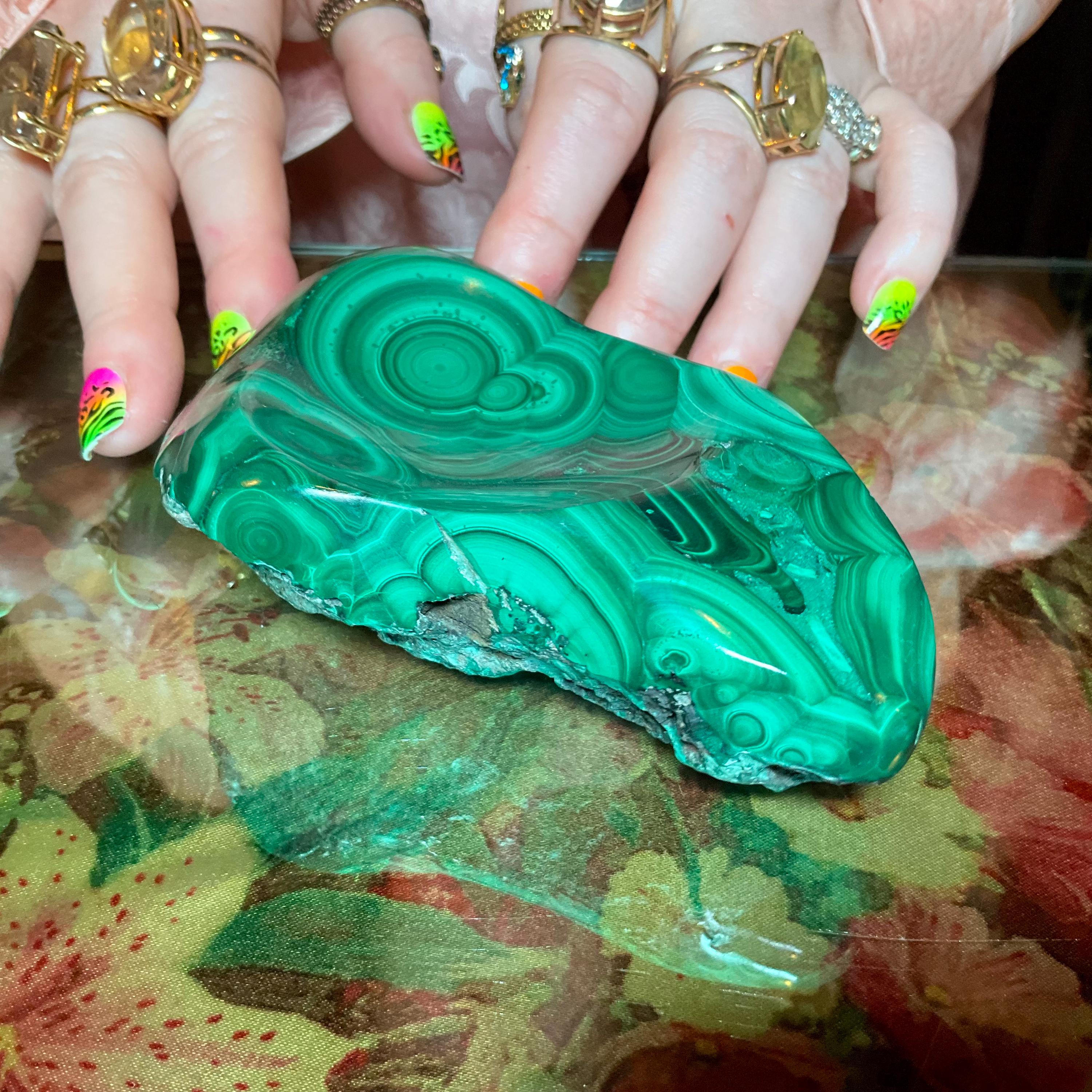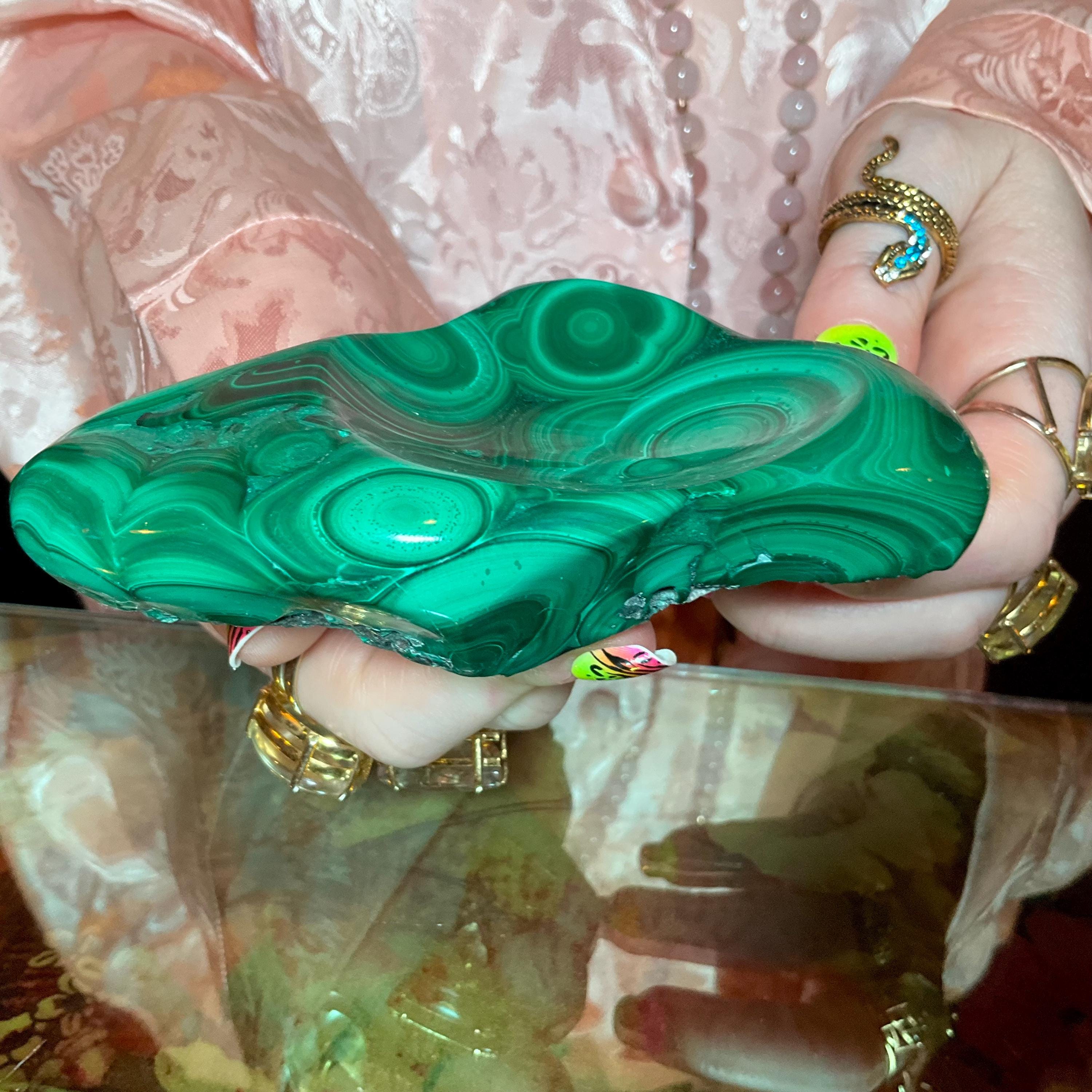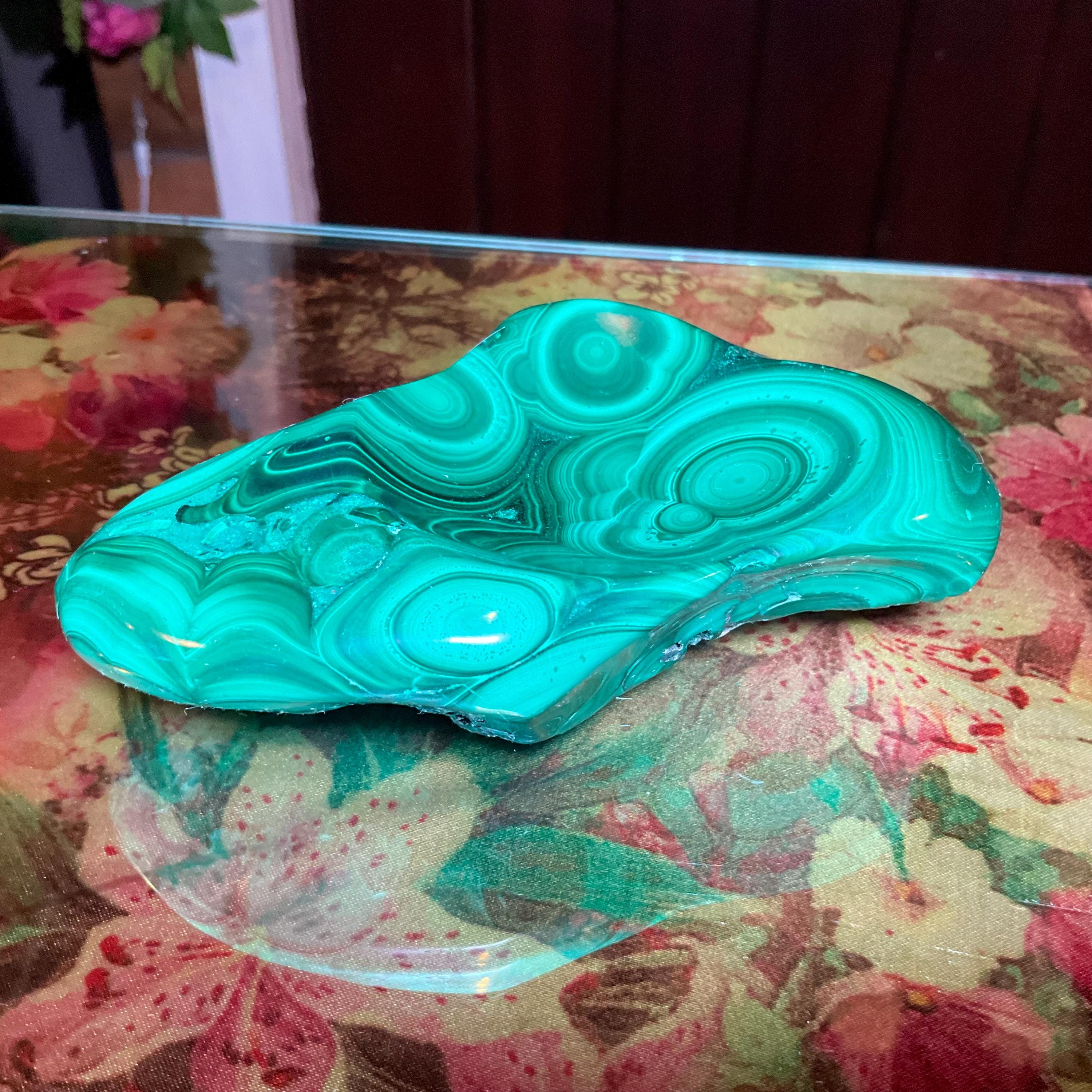 This gorgeous malachite display Polished Stone trinket jewelry Dish Bowl is perfection the vibrant deep green colors swirling into beautiful patterns, is unique only to this mineral making it truly a remarkable piece for your collection.