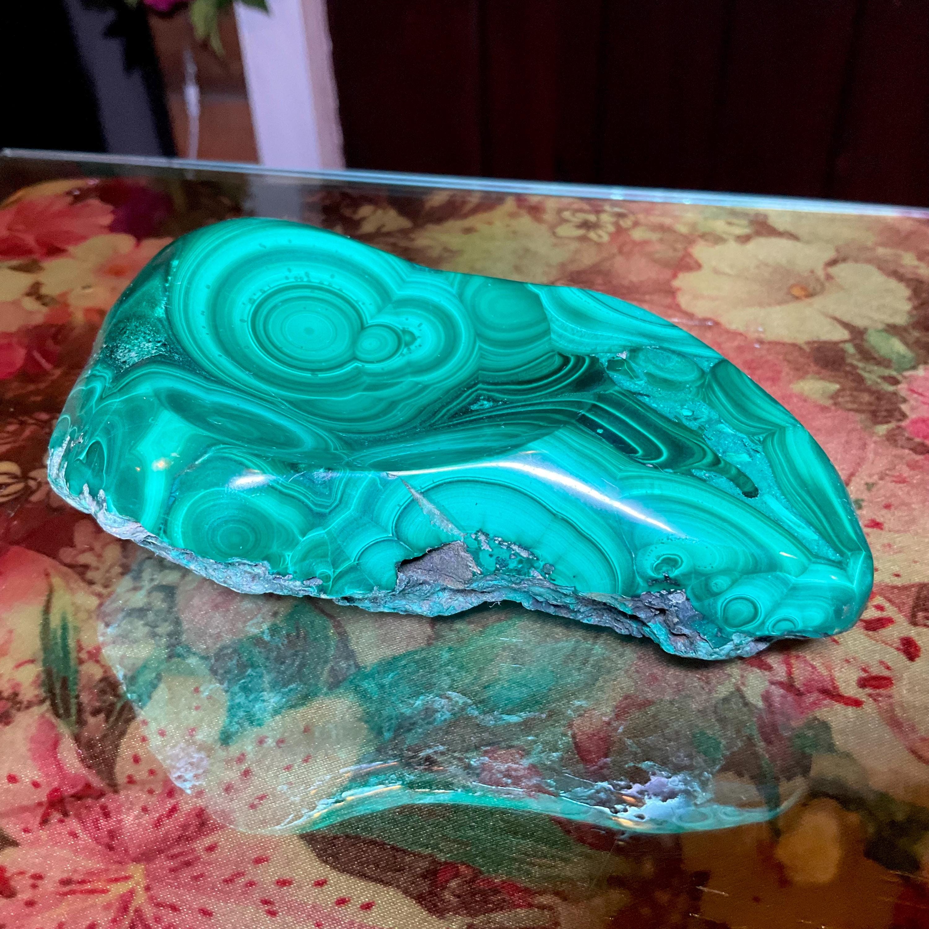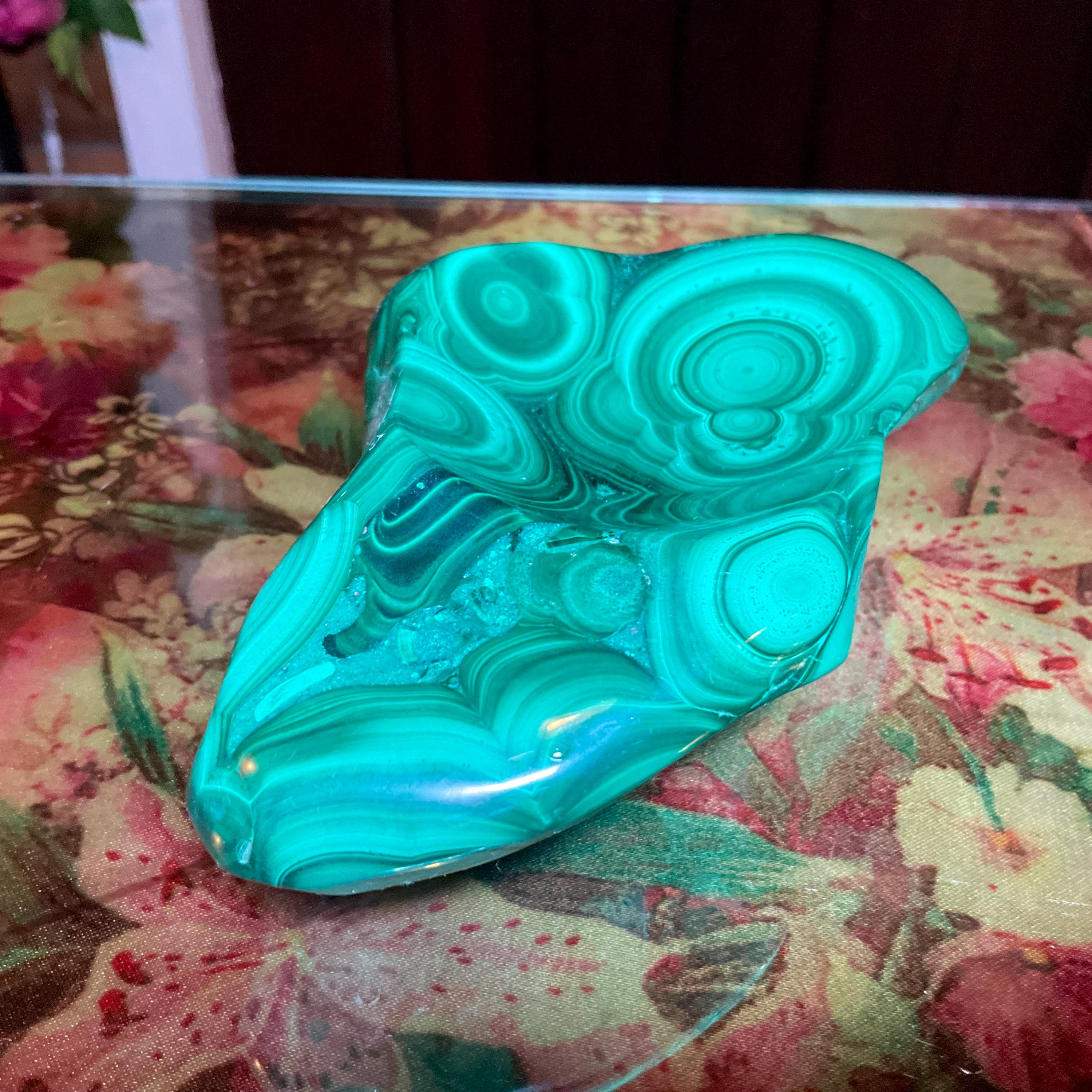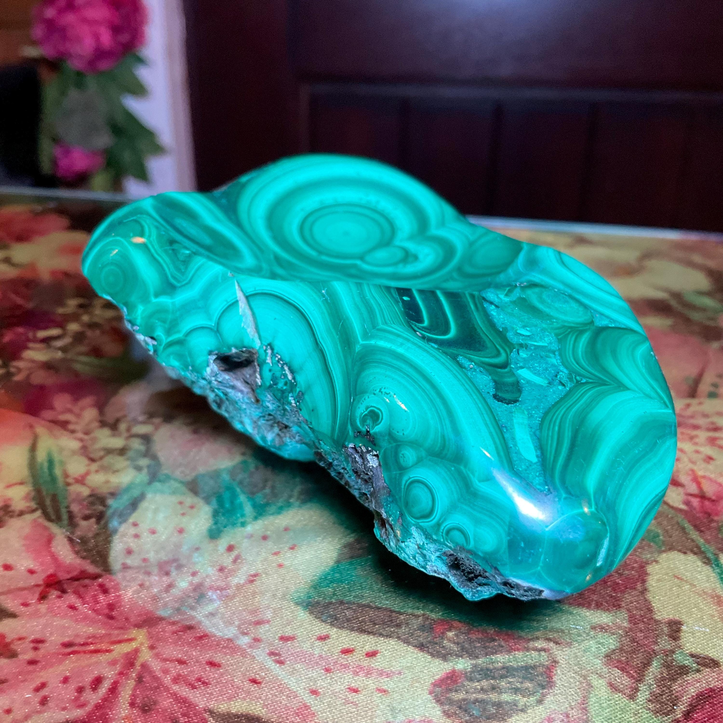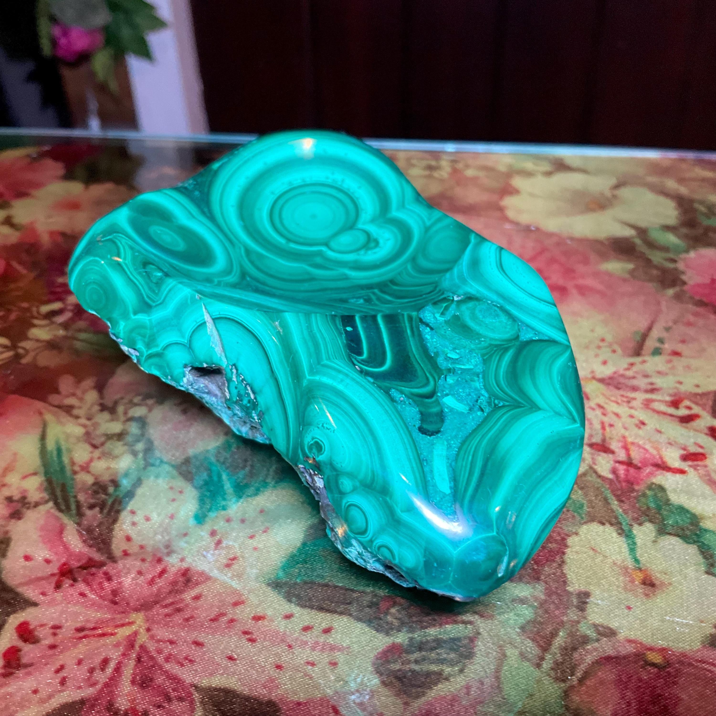 This piece of vintage Congo Malachite is so beautiful, so thick and its natural patina is not like the modern Malachite from China ~ its colors are so rich, and the detail of the stone is hand carved, making it a one-of-a-kind creation.