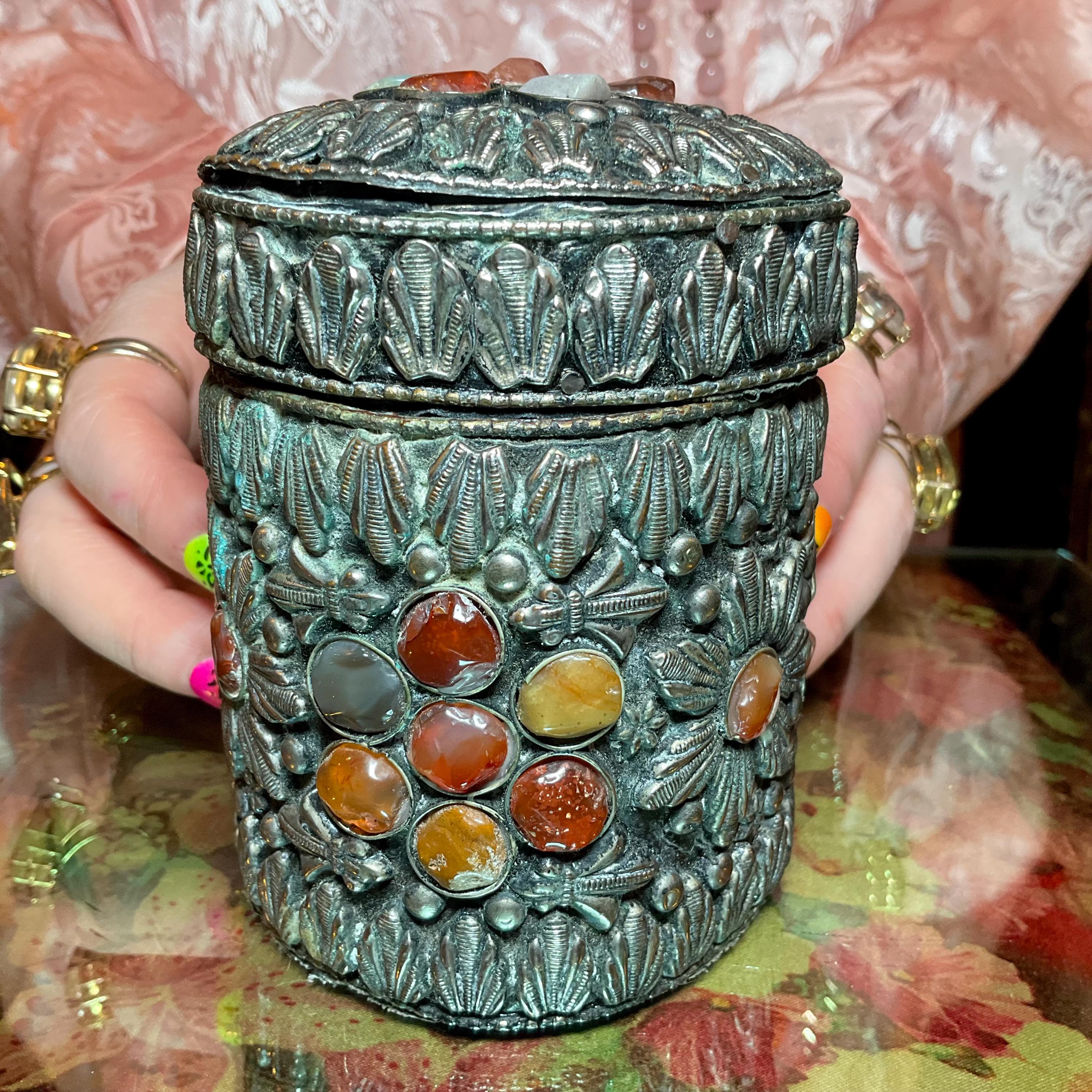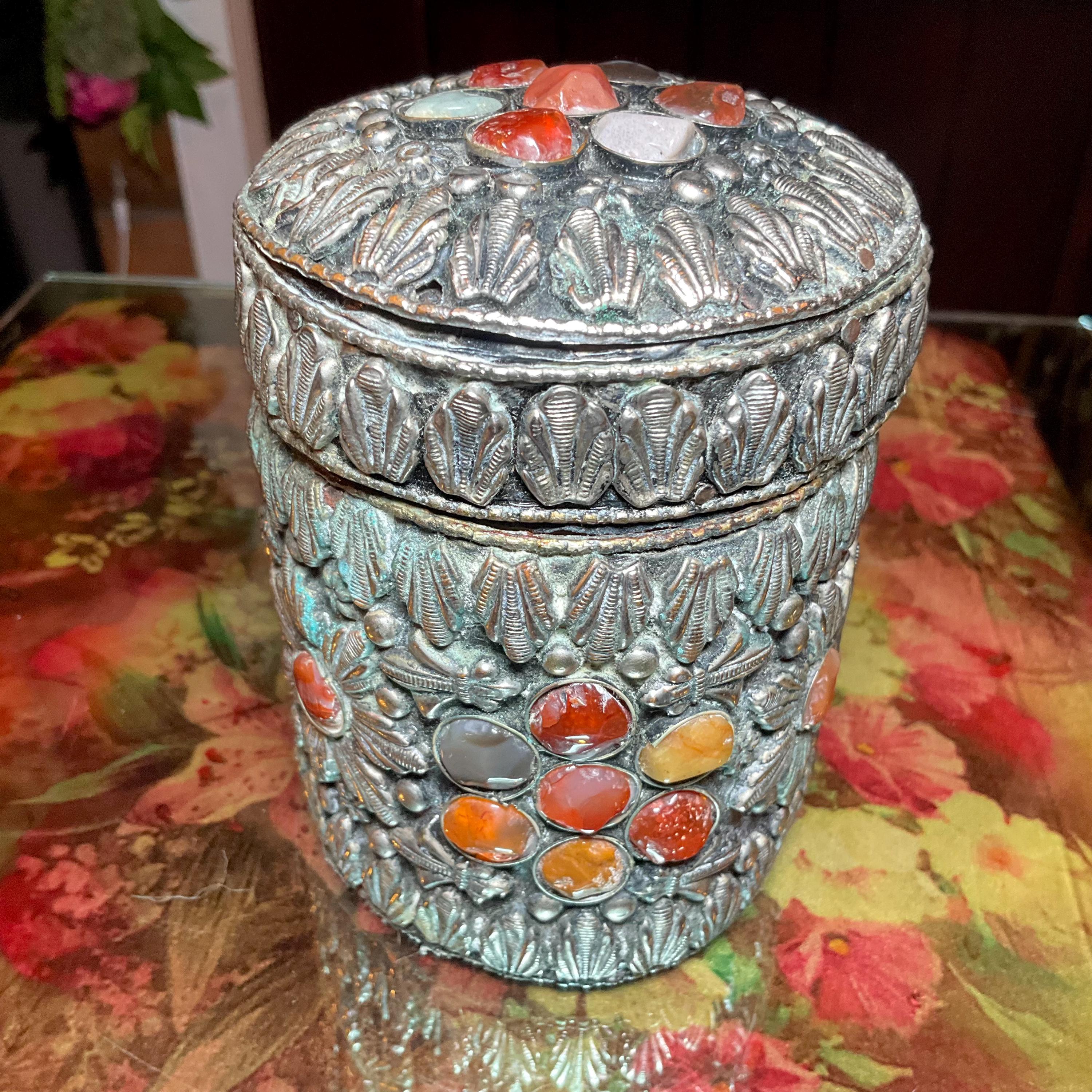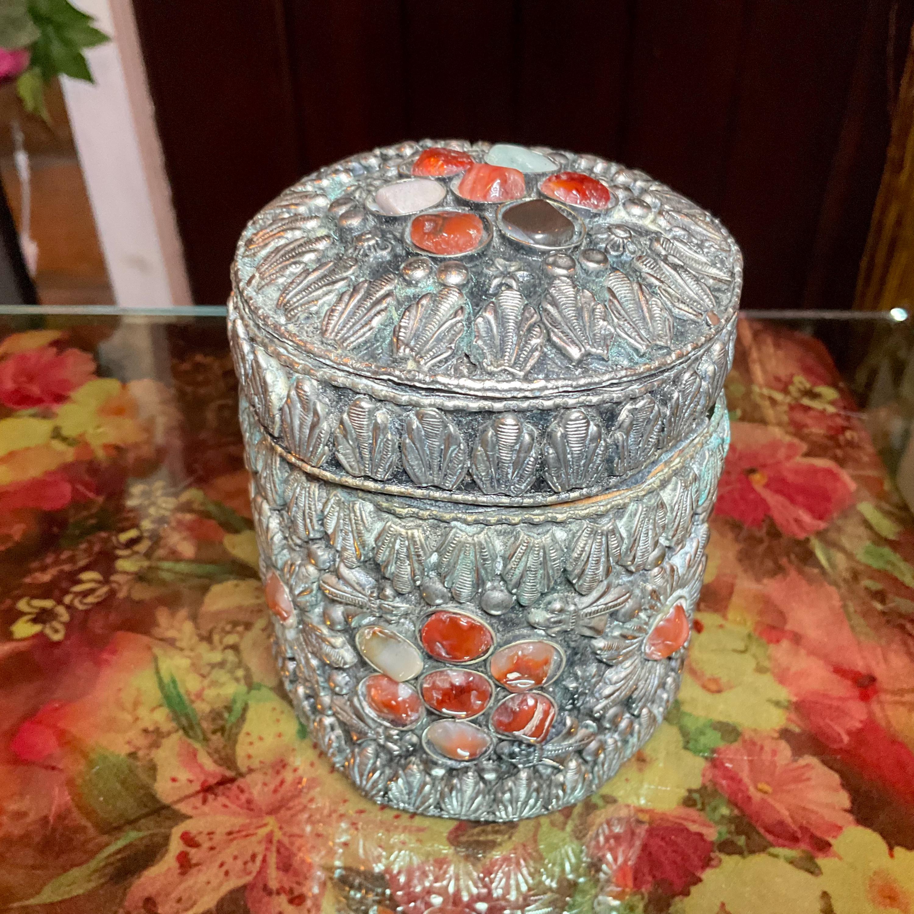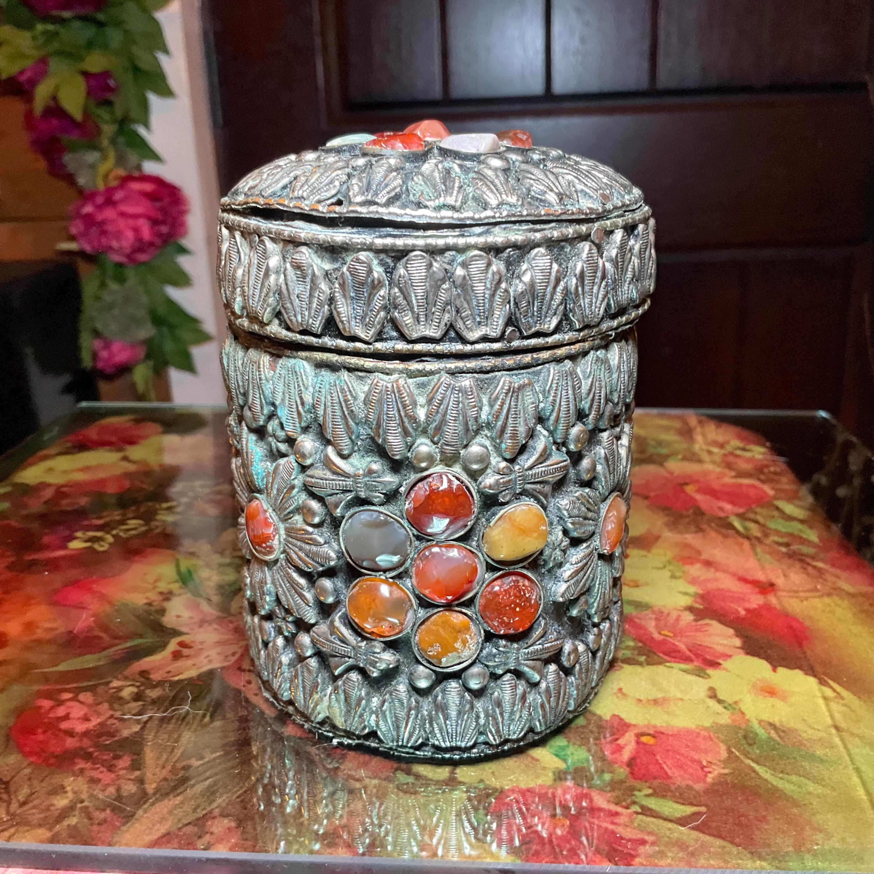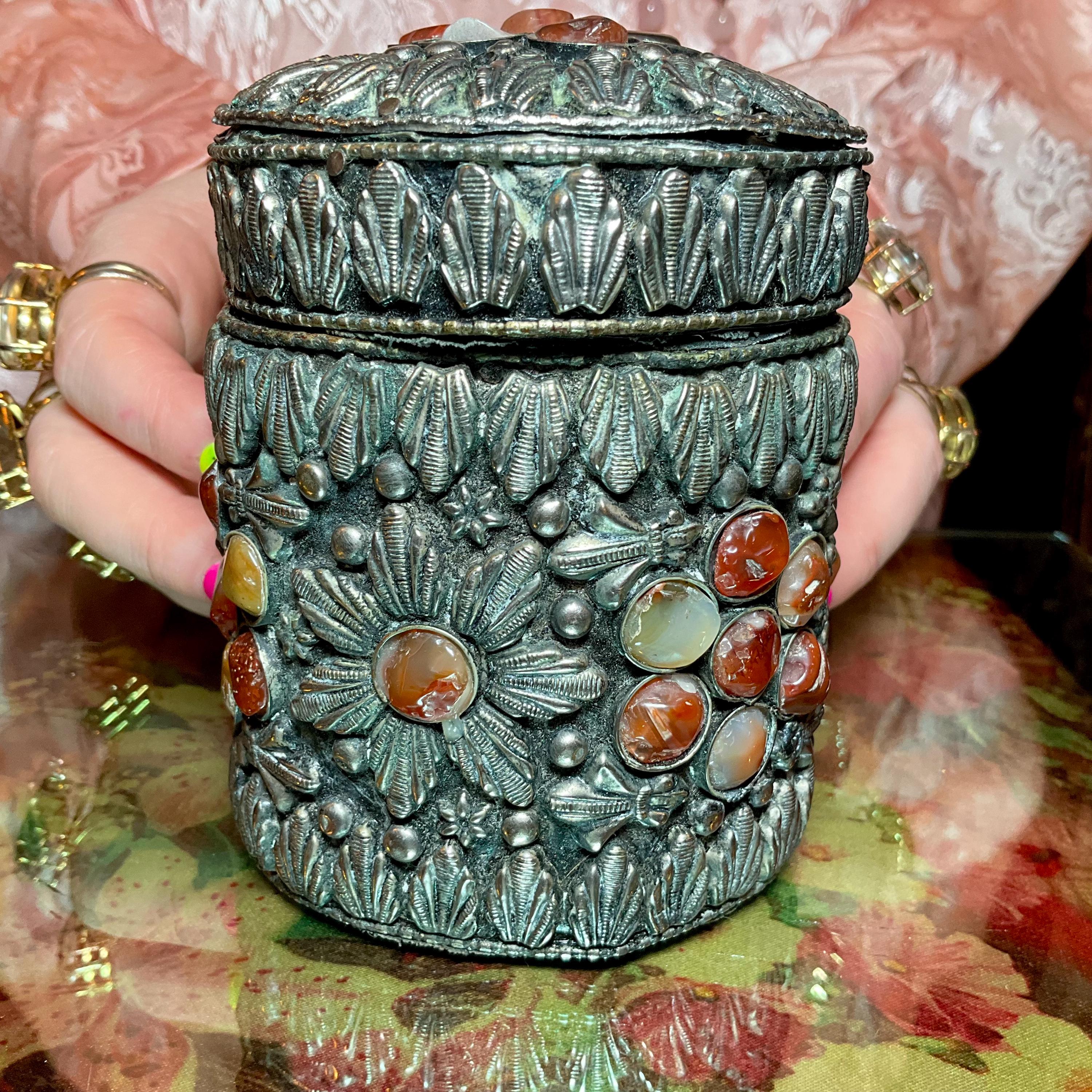 Vintage Agate Inlaid Moroccan Jewelry Trinket/Box ~ Cylinder Shape Dome Top w/ Semi Precious Stones ~ 4" Tall ~ Handmade Metalwork Art