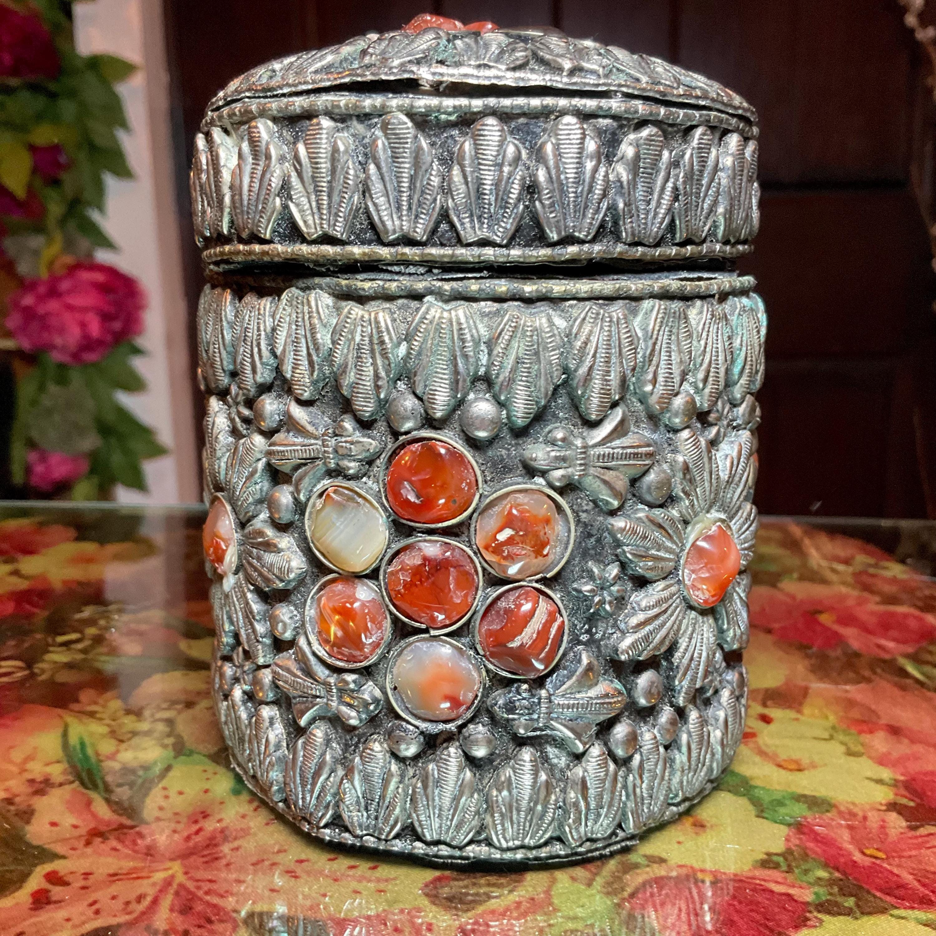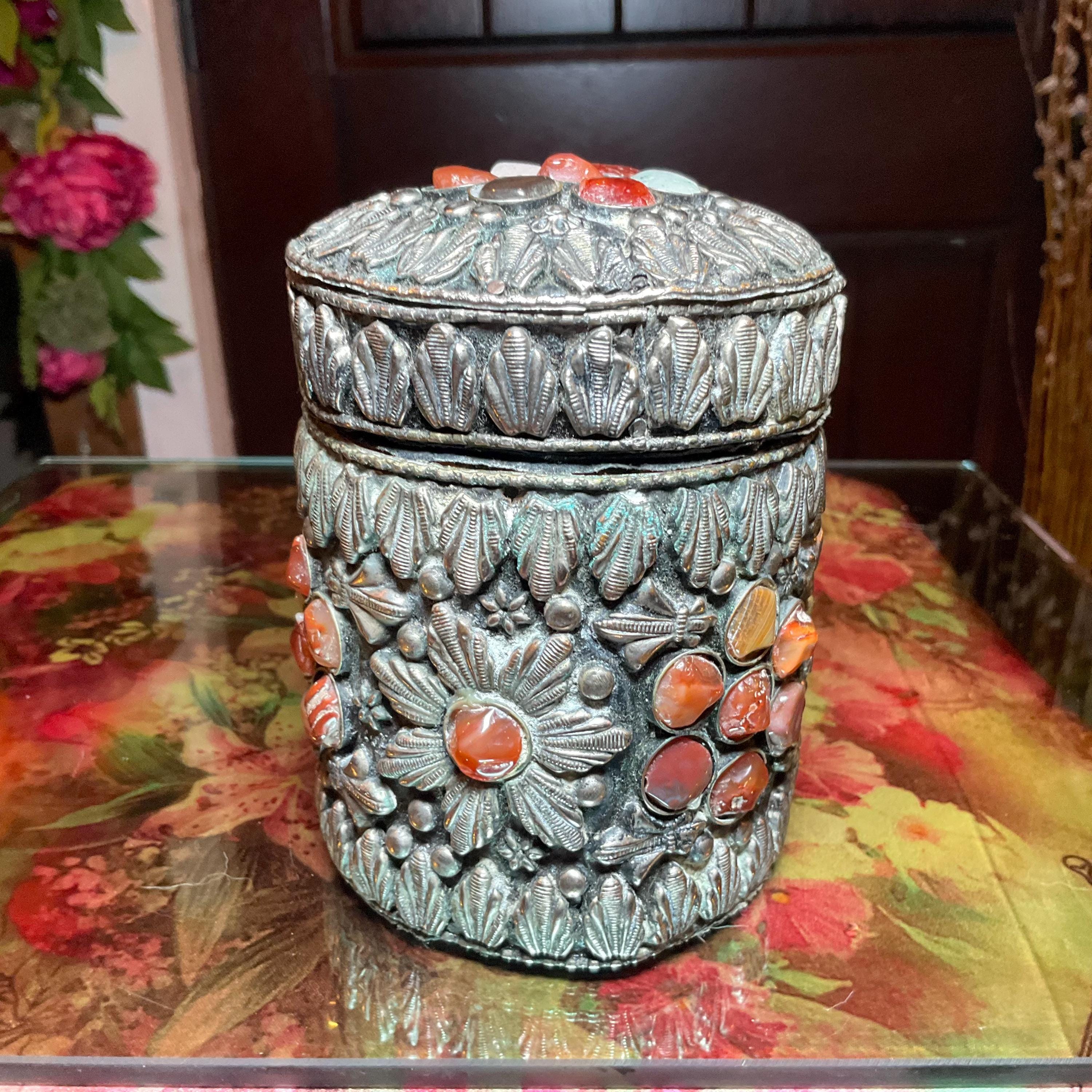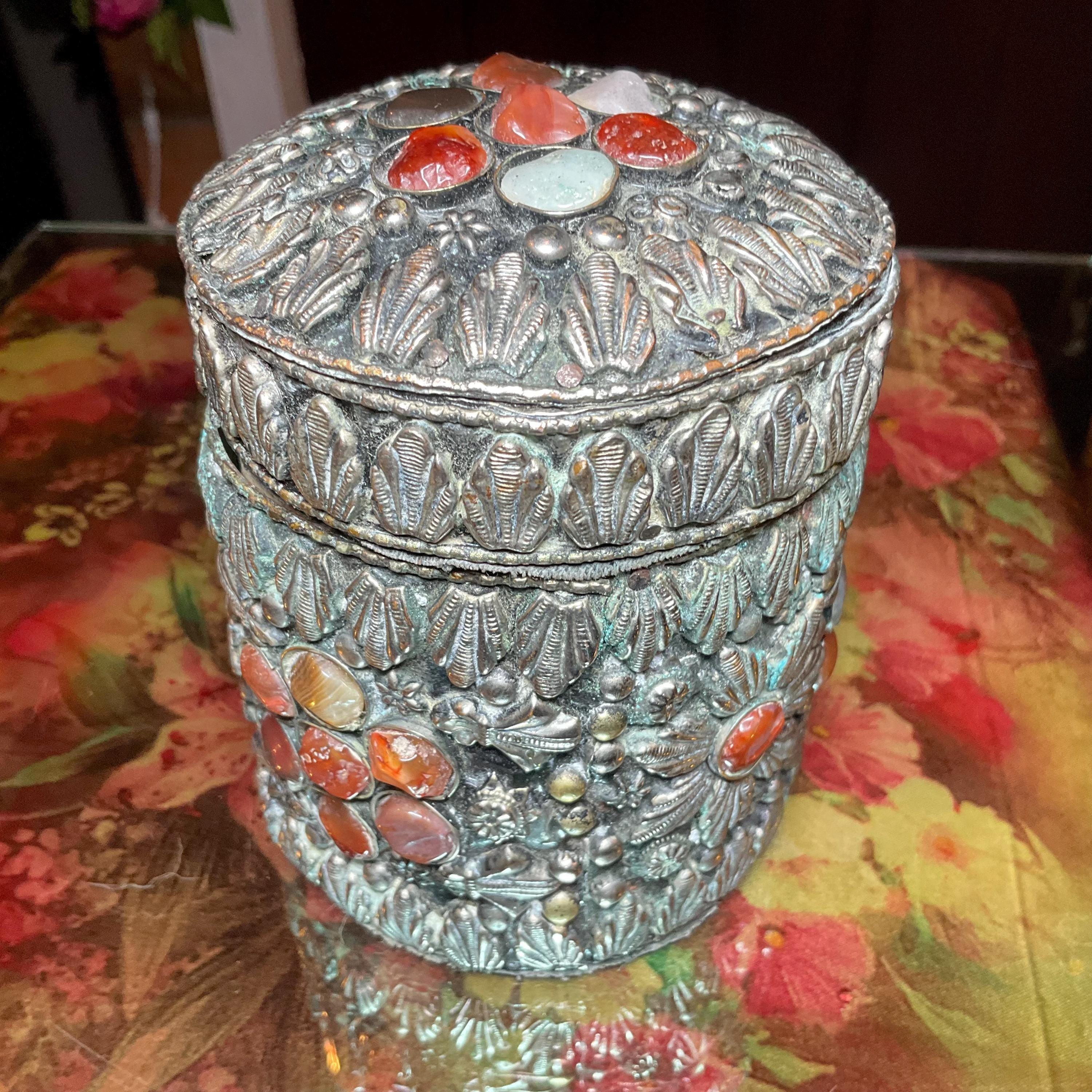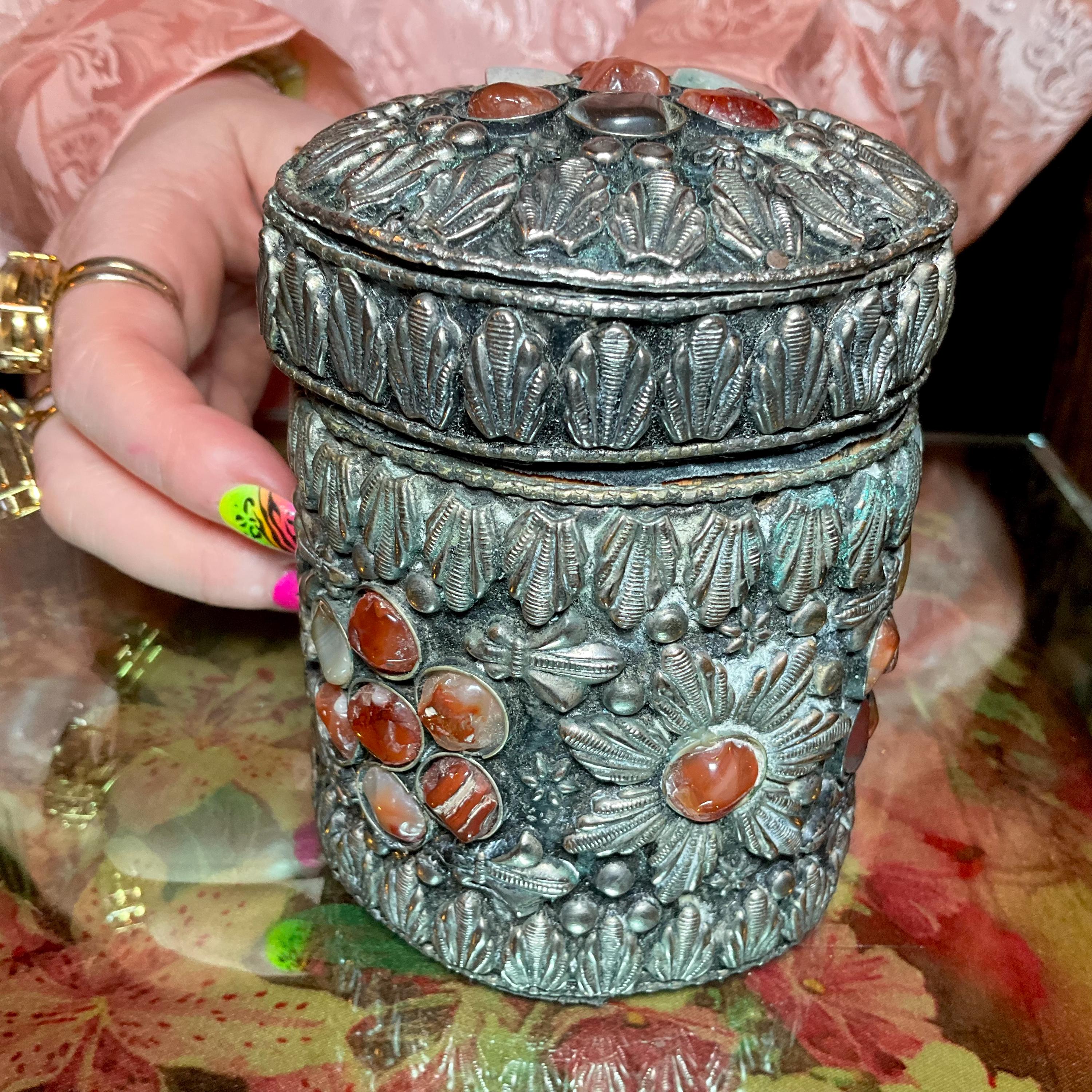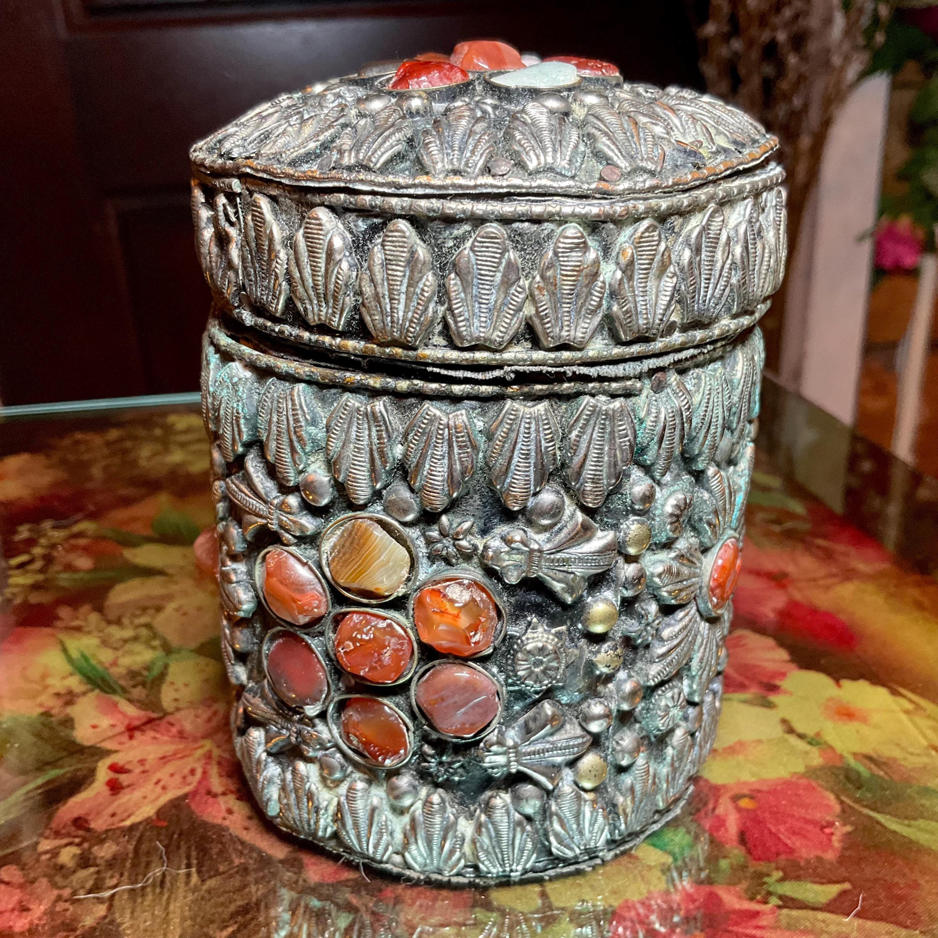 Vintage Agate Inlaid Moroccan Jewelry Trinket/Box ~ Cylinder Shape Dome Top w/ Semi Precious Stones ~ 4" Tall ~ Handmade Metalwork Art