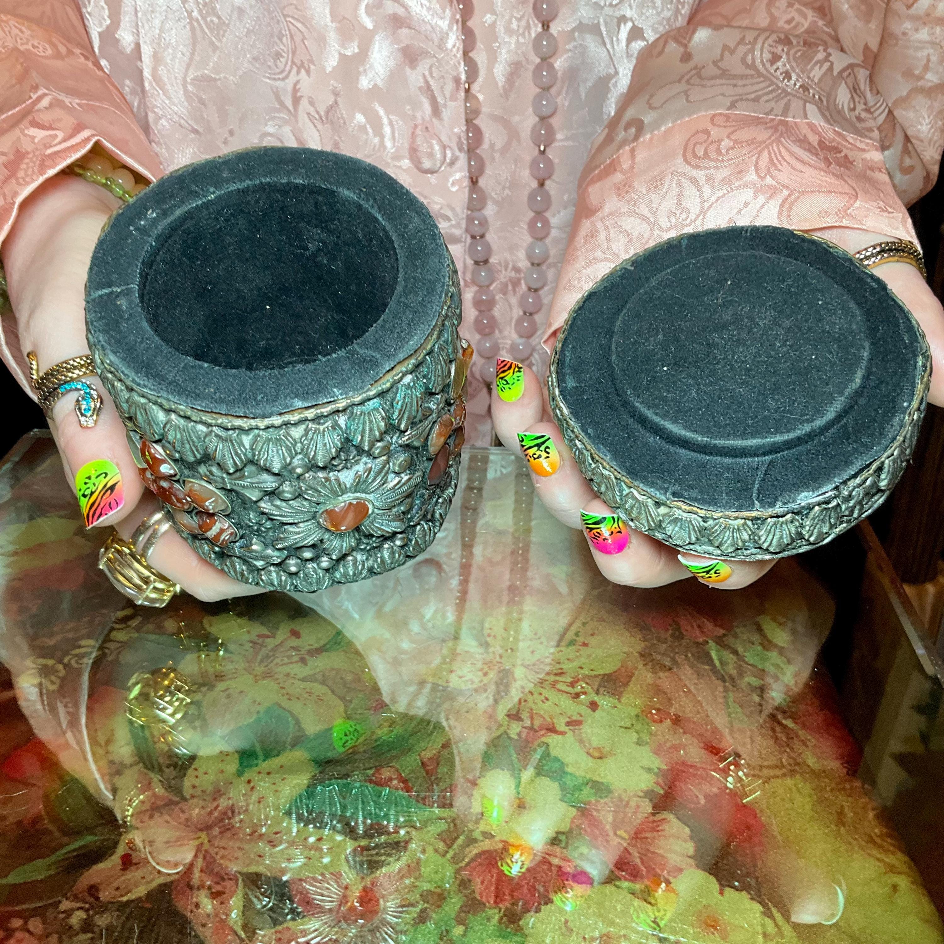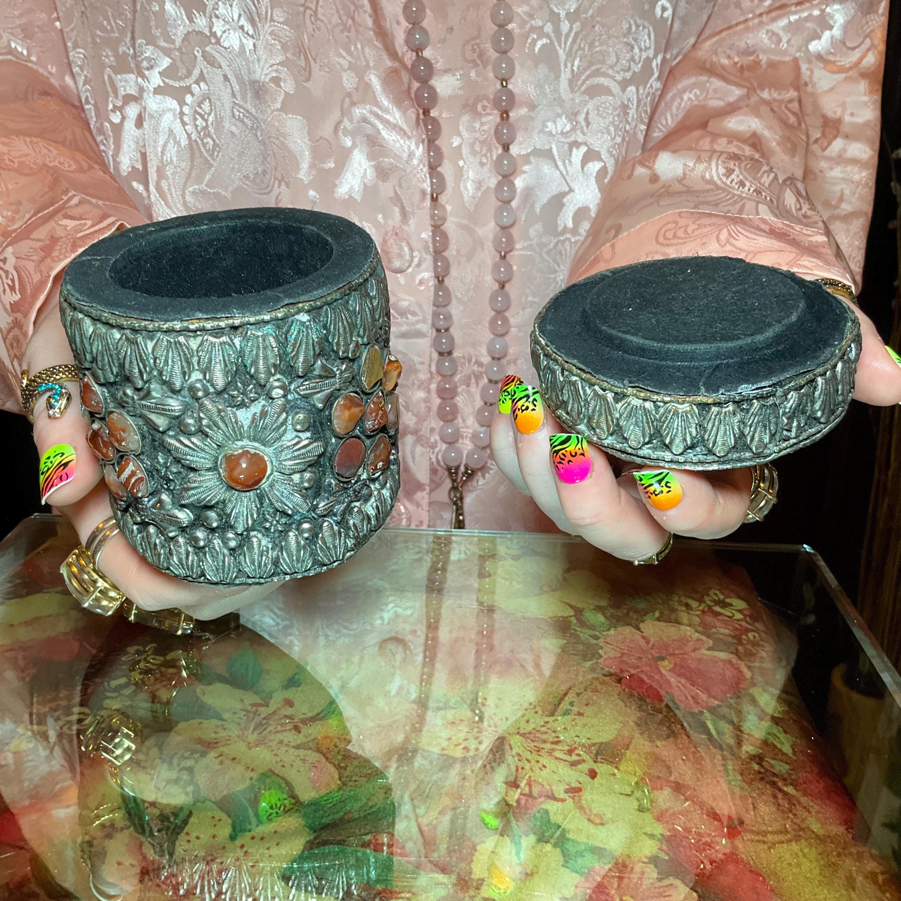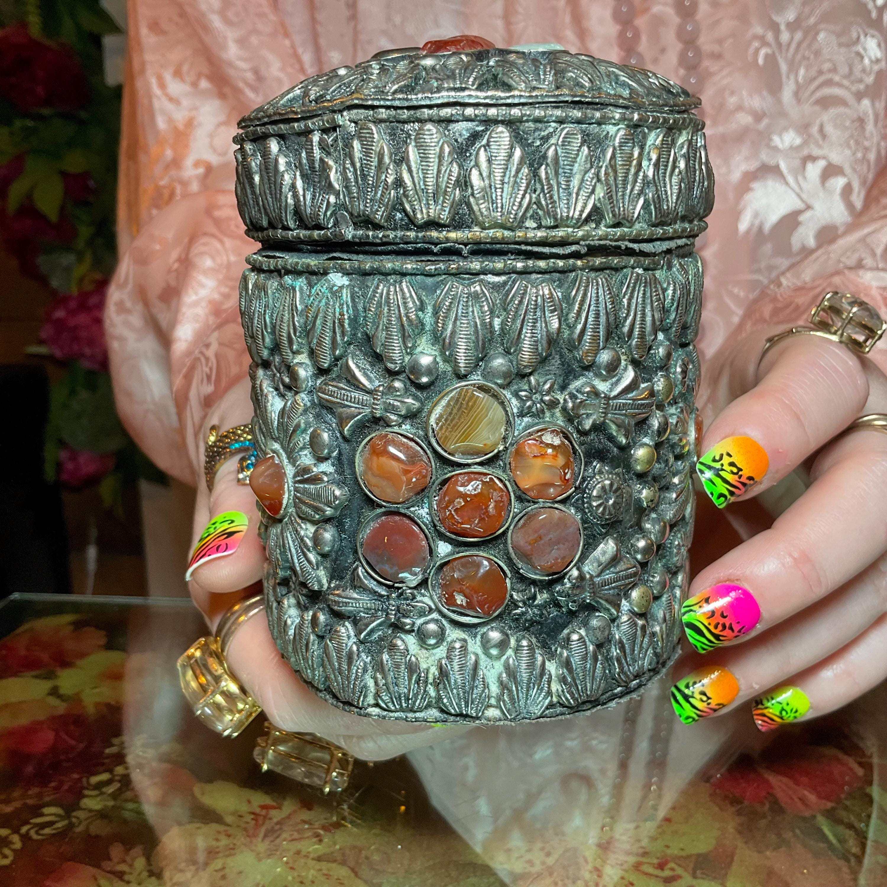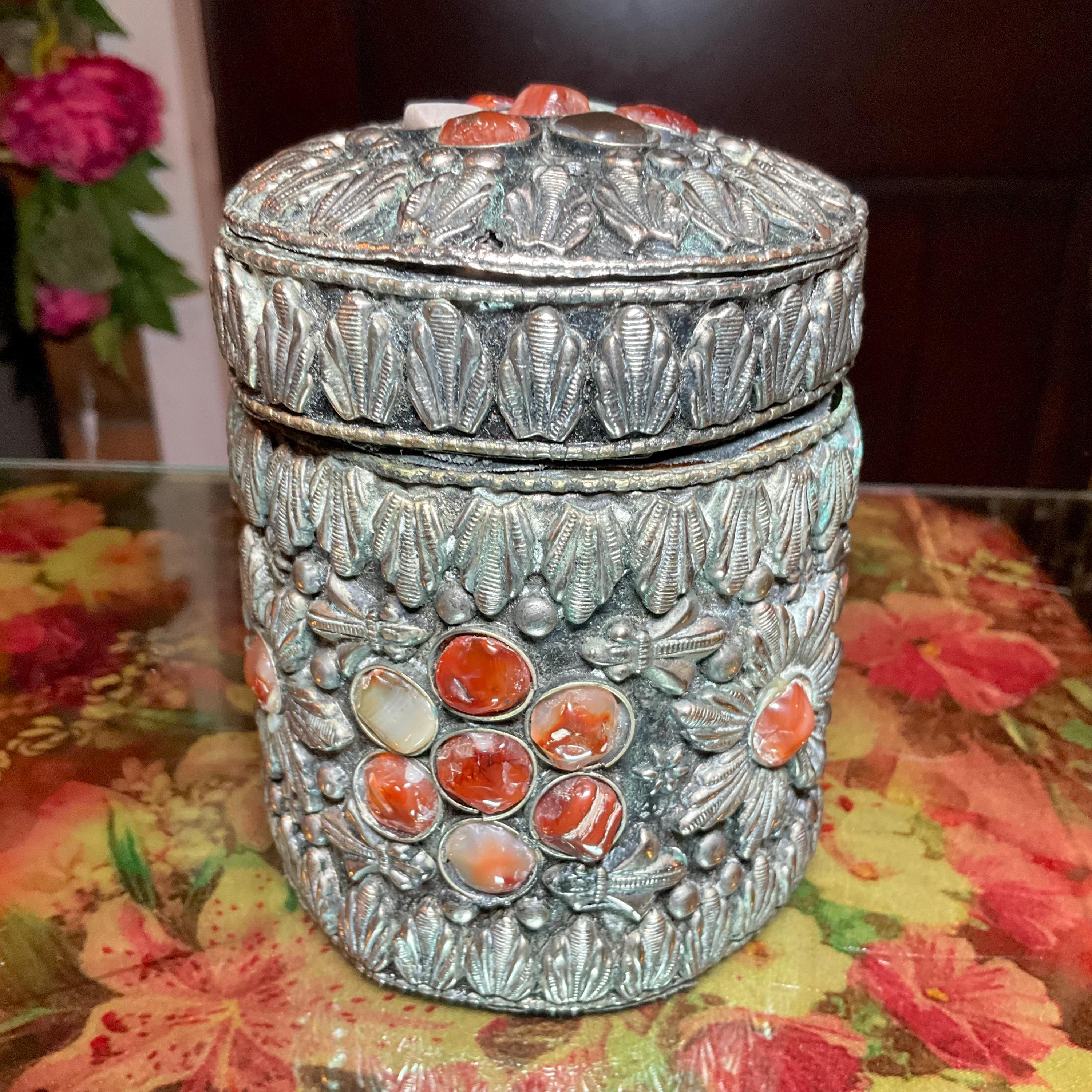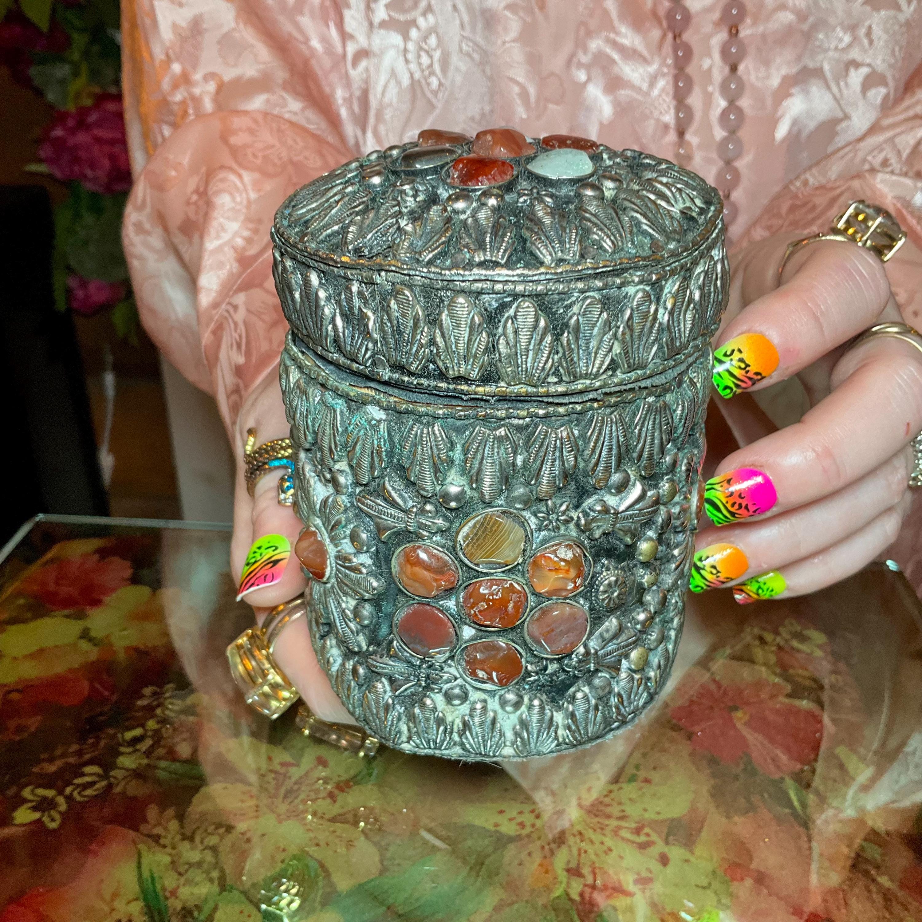Vintage Agate Inlaid Moroccan Jewelry Trinket/Box ~ Cylinder Shape Dome Top w/ Semi Precious Stones ~ 4" Tall ~ Handmade Metalwork Art