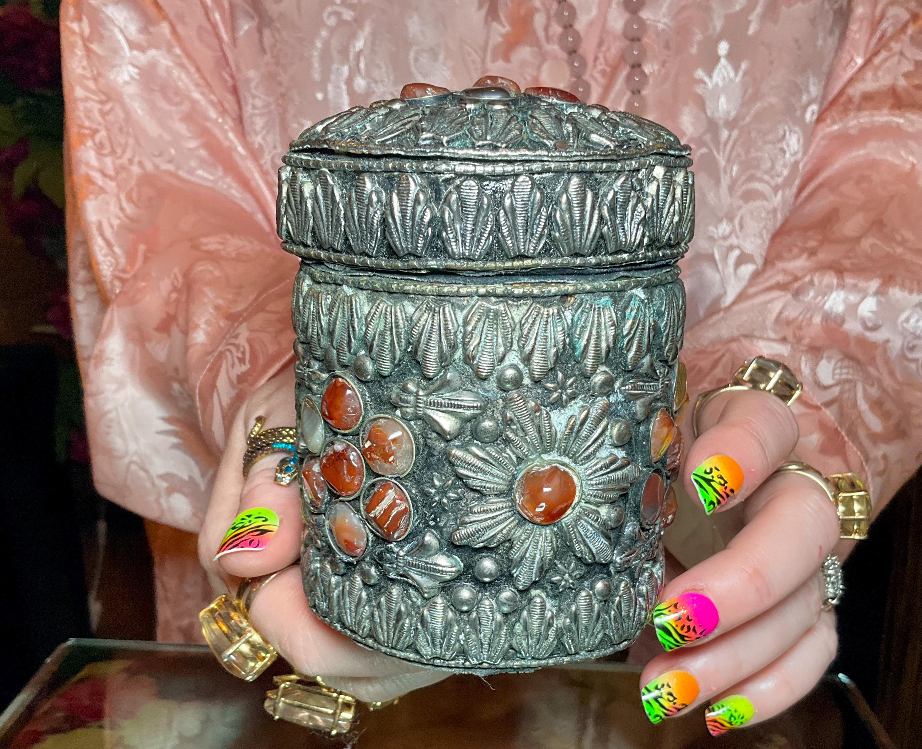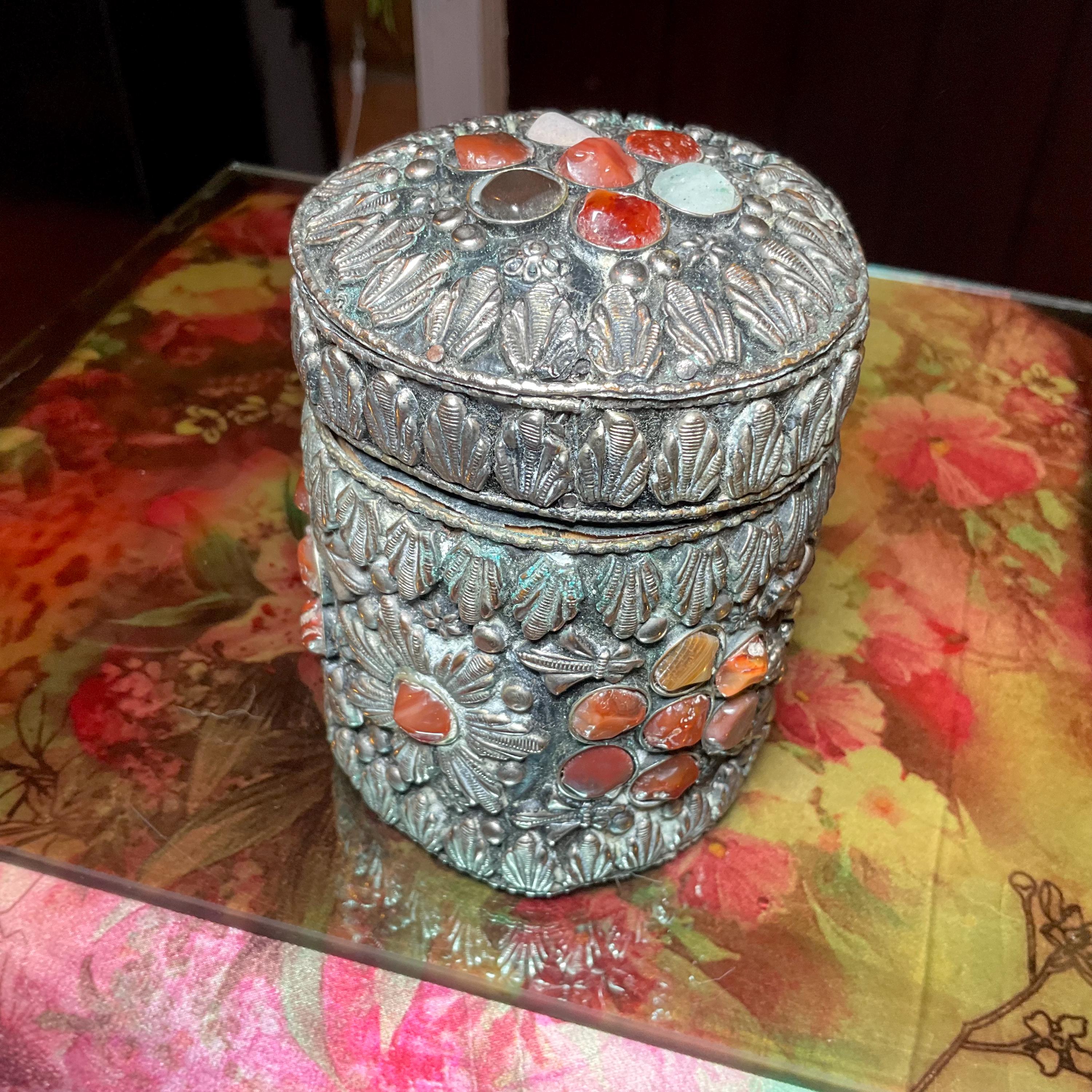 The vintage Moroccan jewelry box is inlaid with semi-precious agate stones and covered with silvered metal filigree.