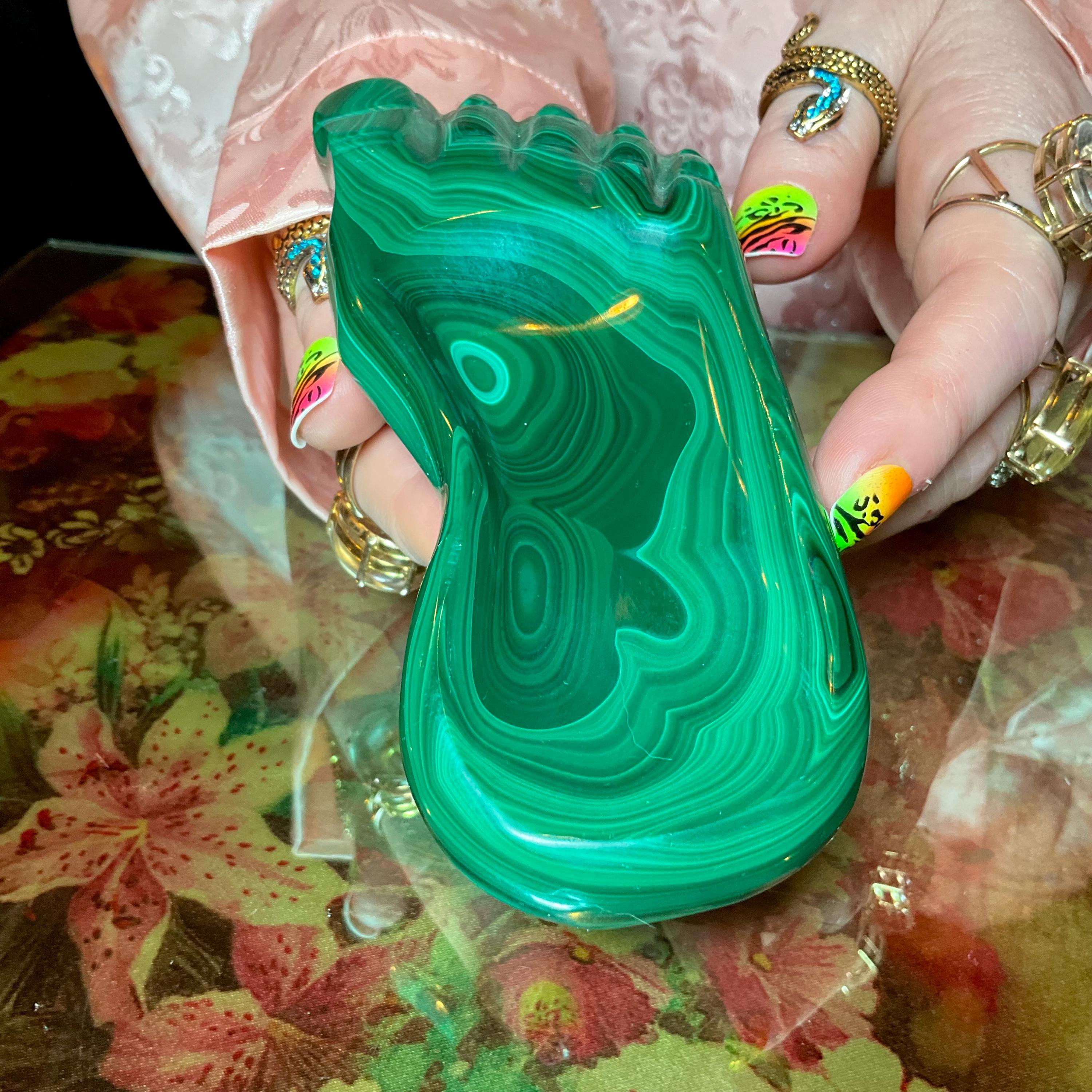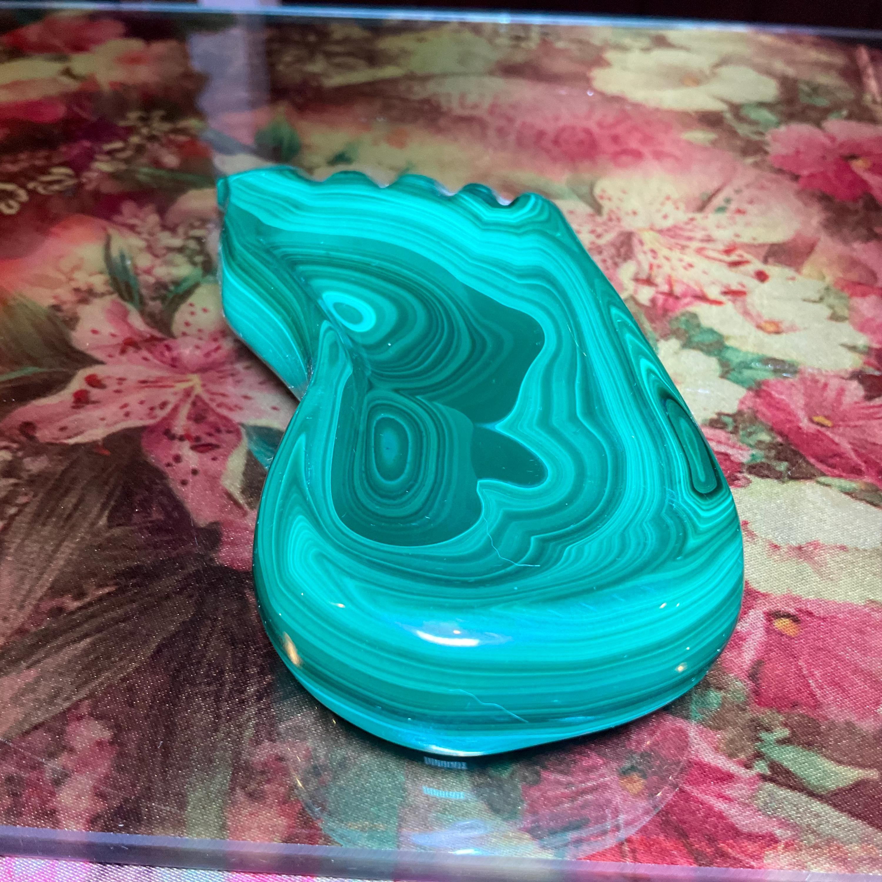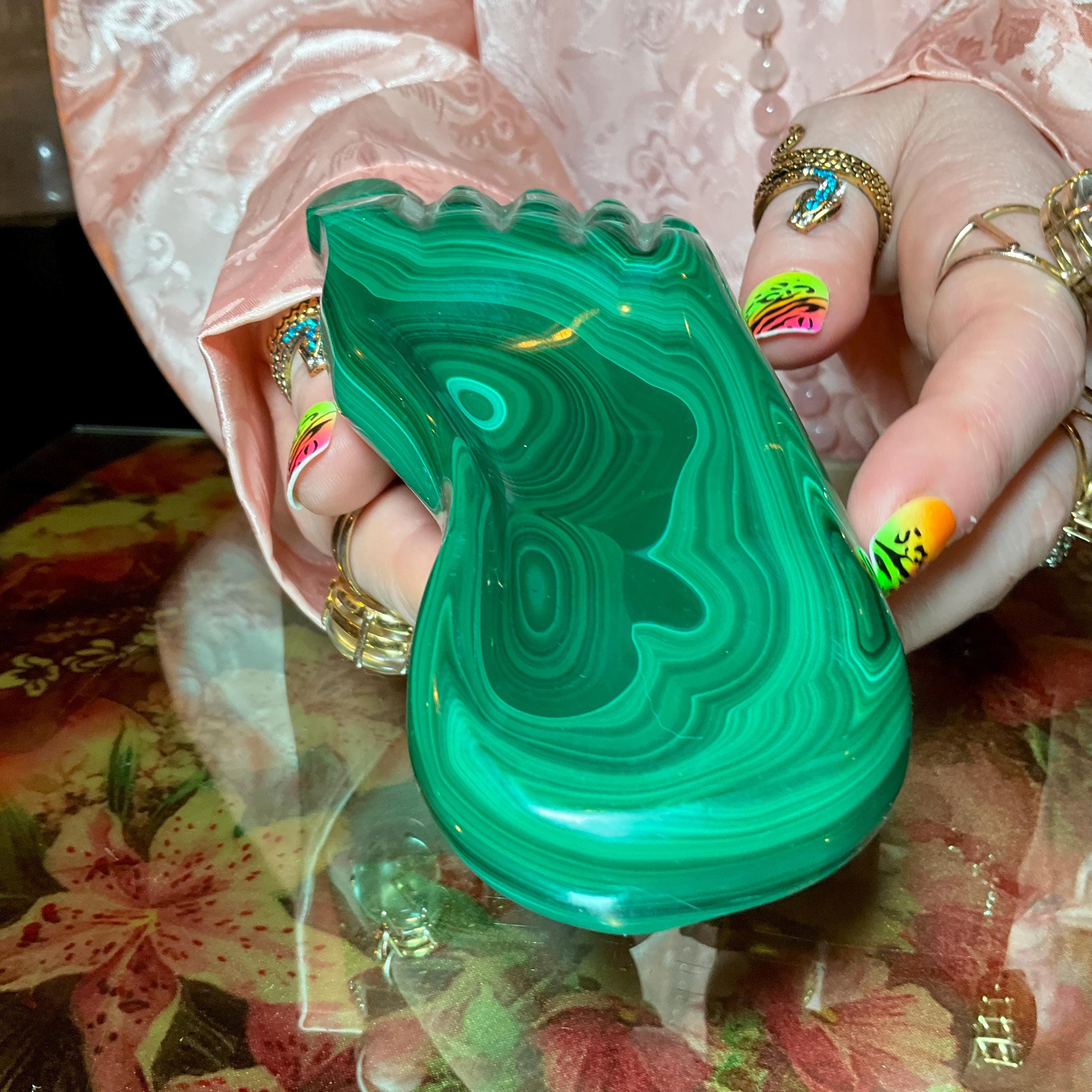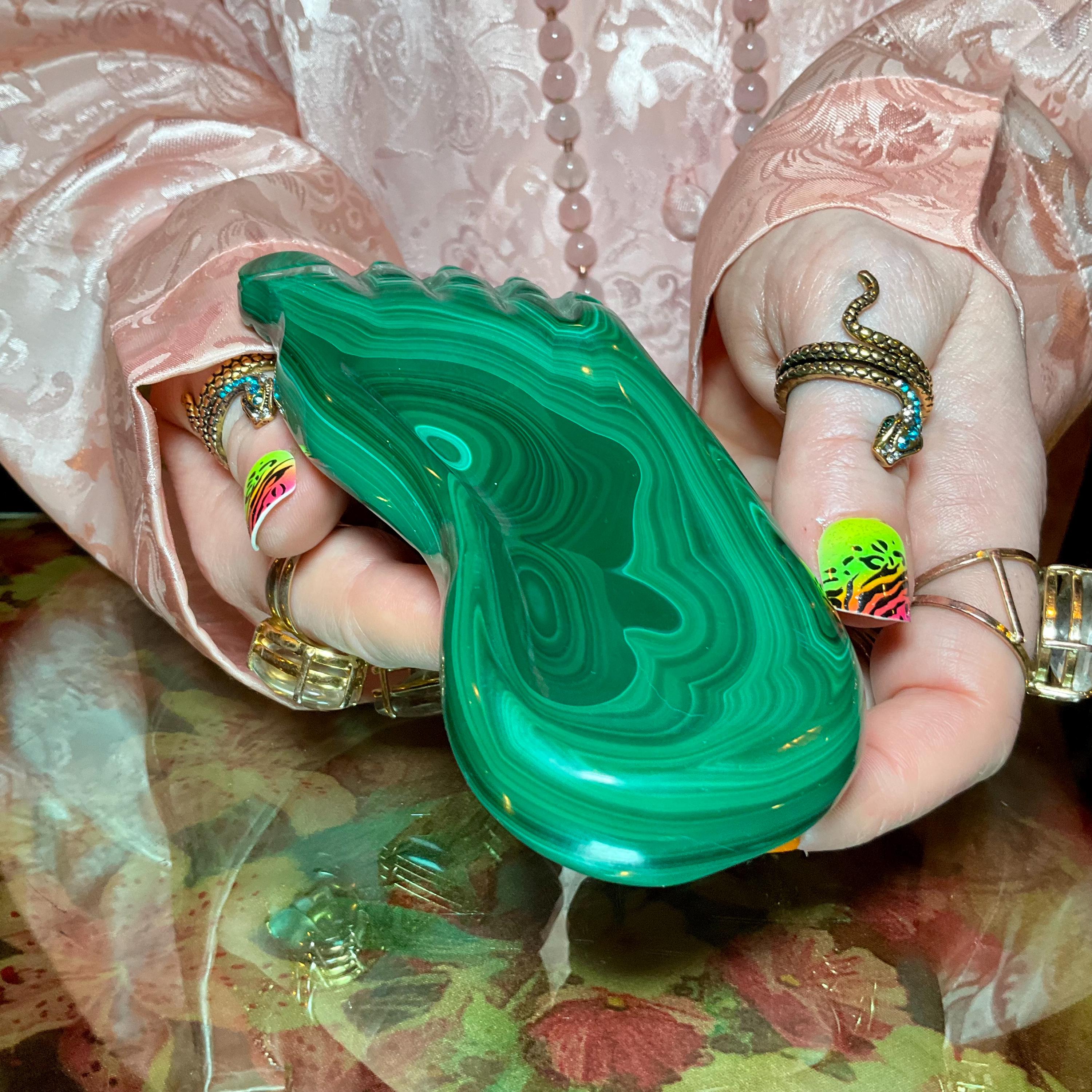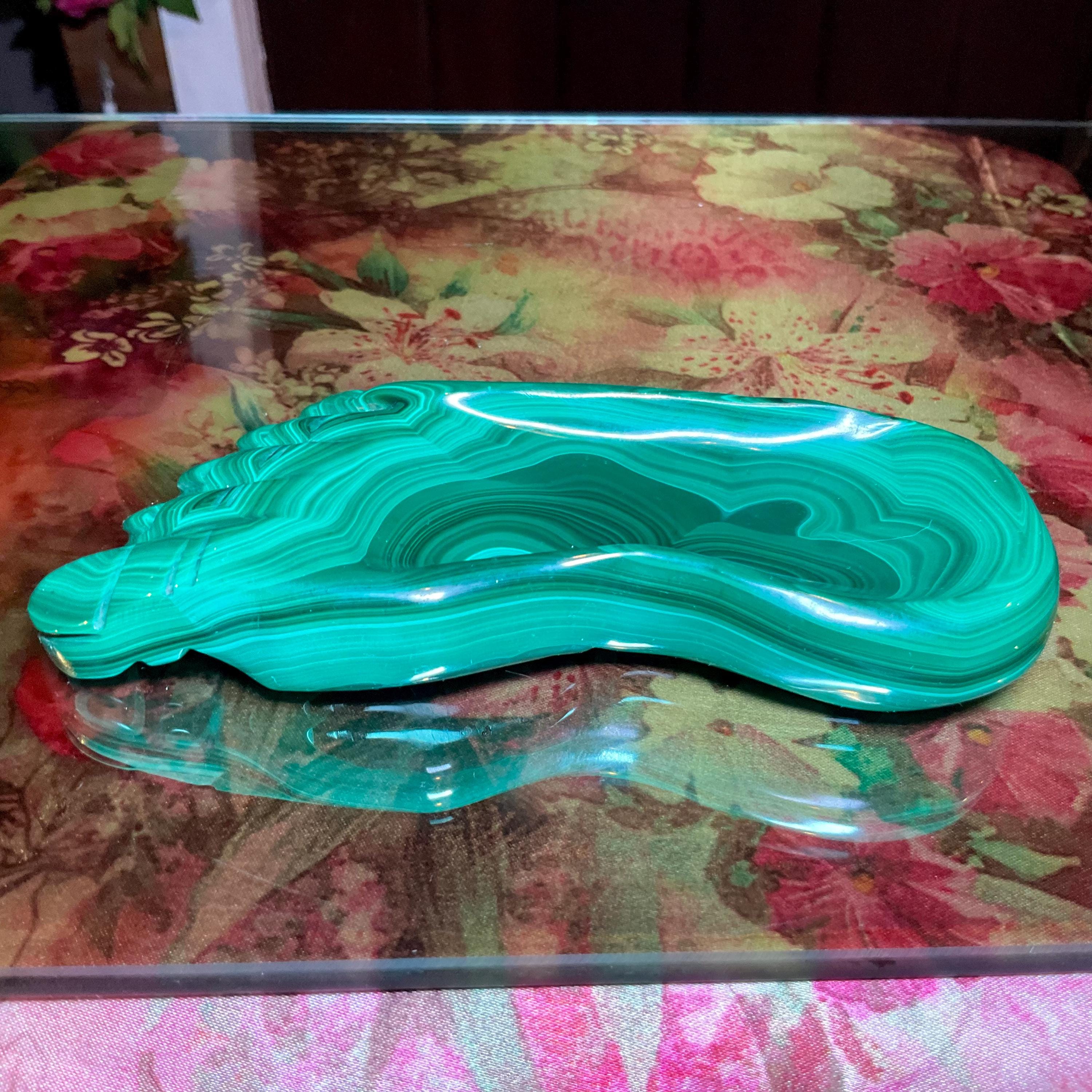 This gorgeous malachite free form stone dish is perfection the vibrant deep green colors swirling into beautiful patterns, is unique only to this mineral making it truly a remarkable piece for your collection.