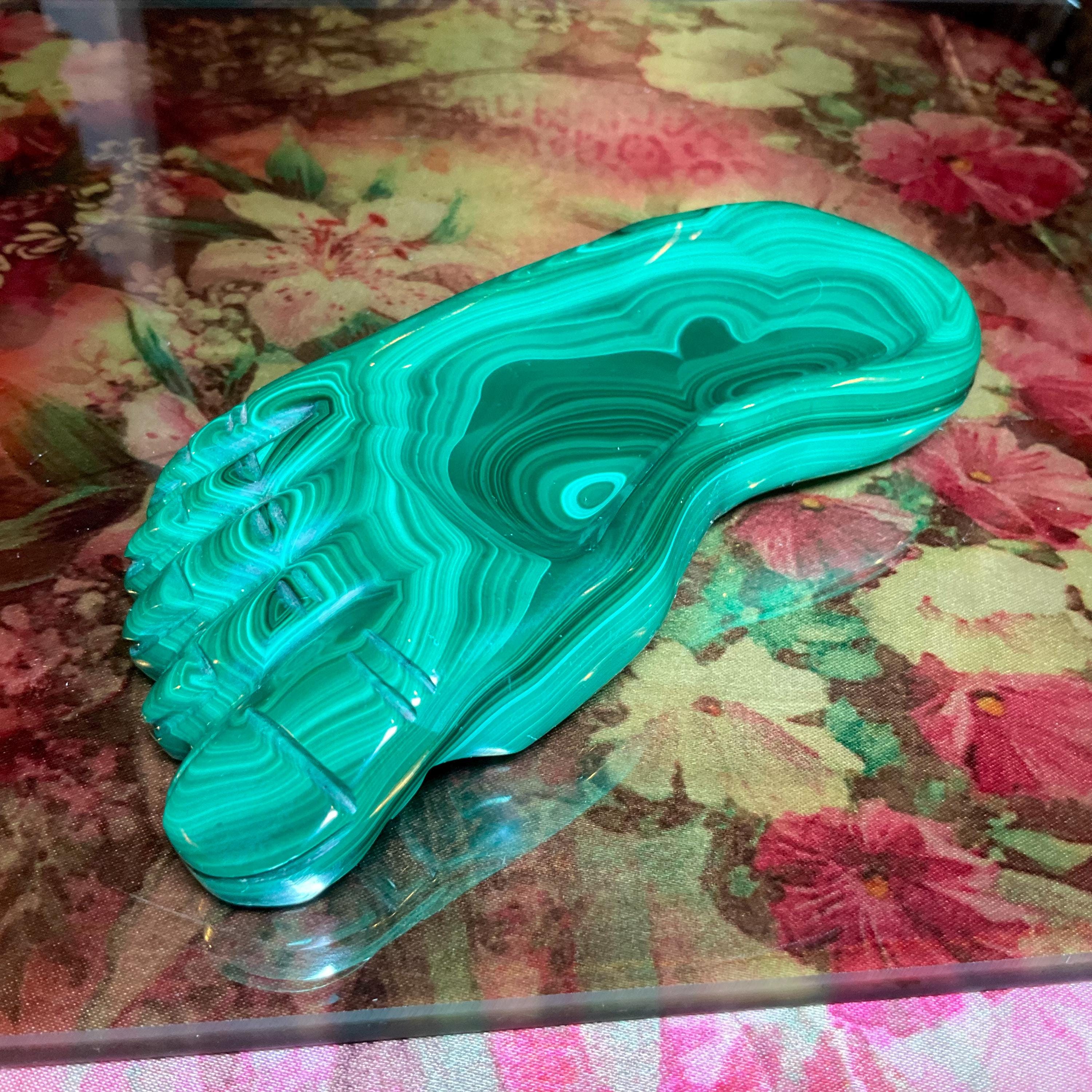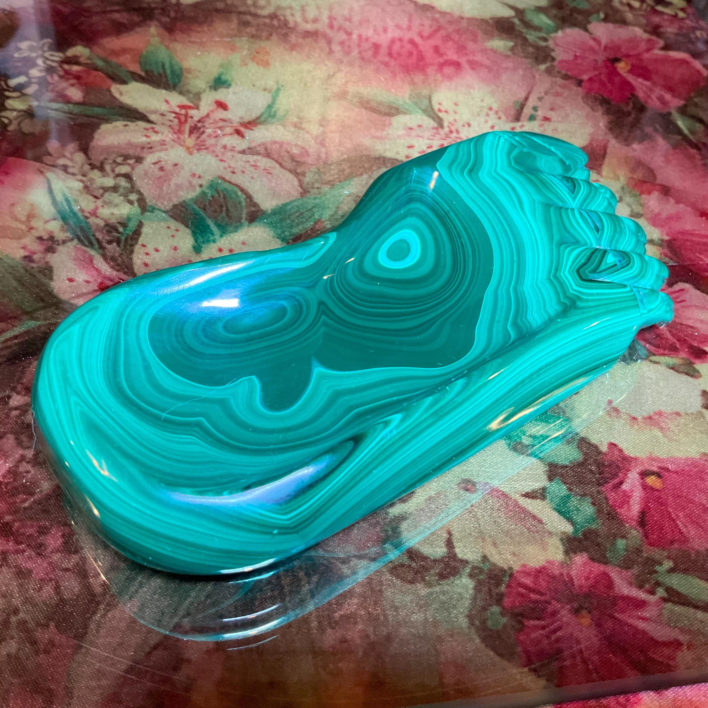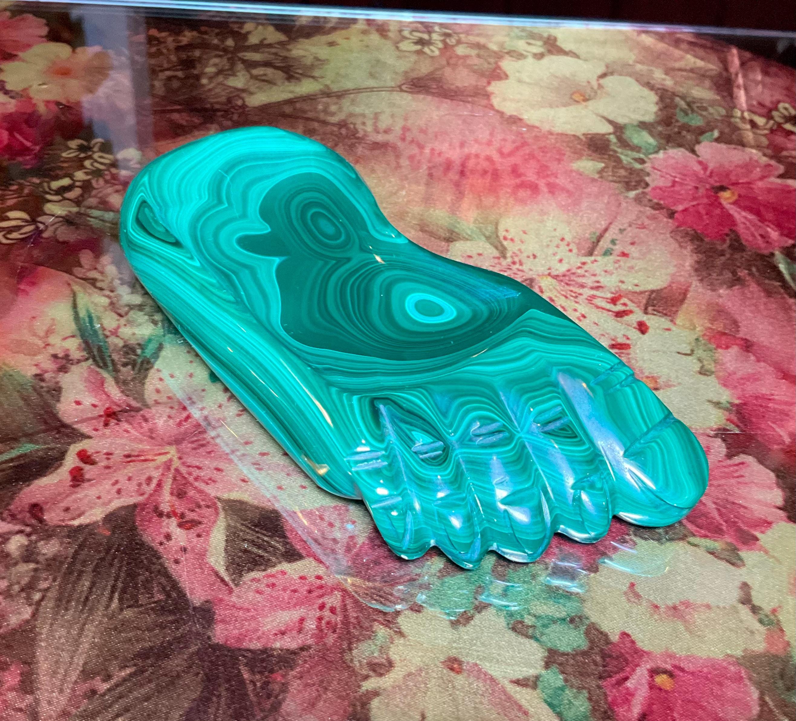 Beautiful detailed and unique Green African Congo Mineral Specimen exquisitely carved in the shape of a foot.