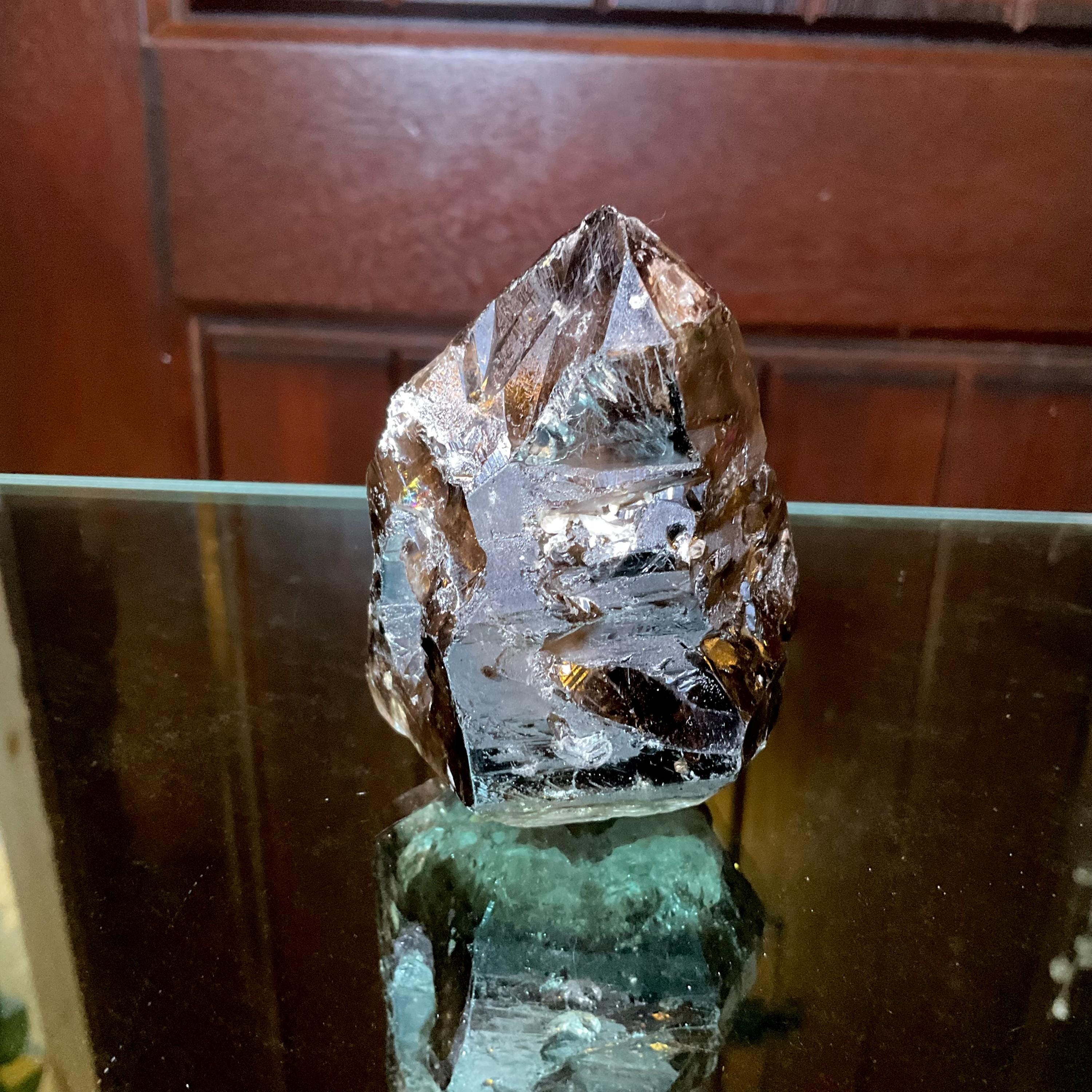 This is the wildest crystal you will ever own; it is a Skeletal Brazilian Smokey Quartz Crystal point cluster, with spectacular rainbow inclusions throughout.