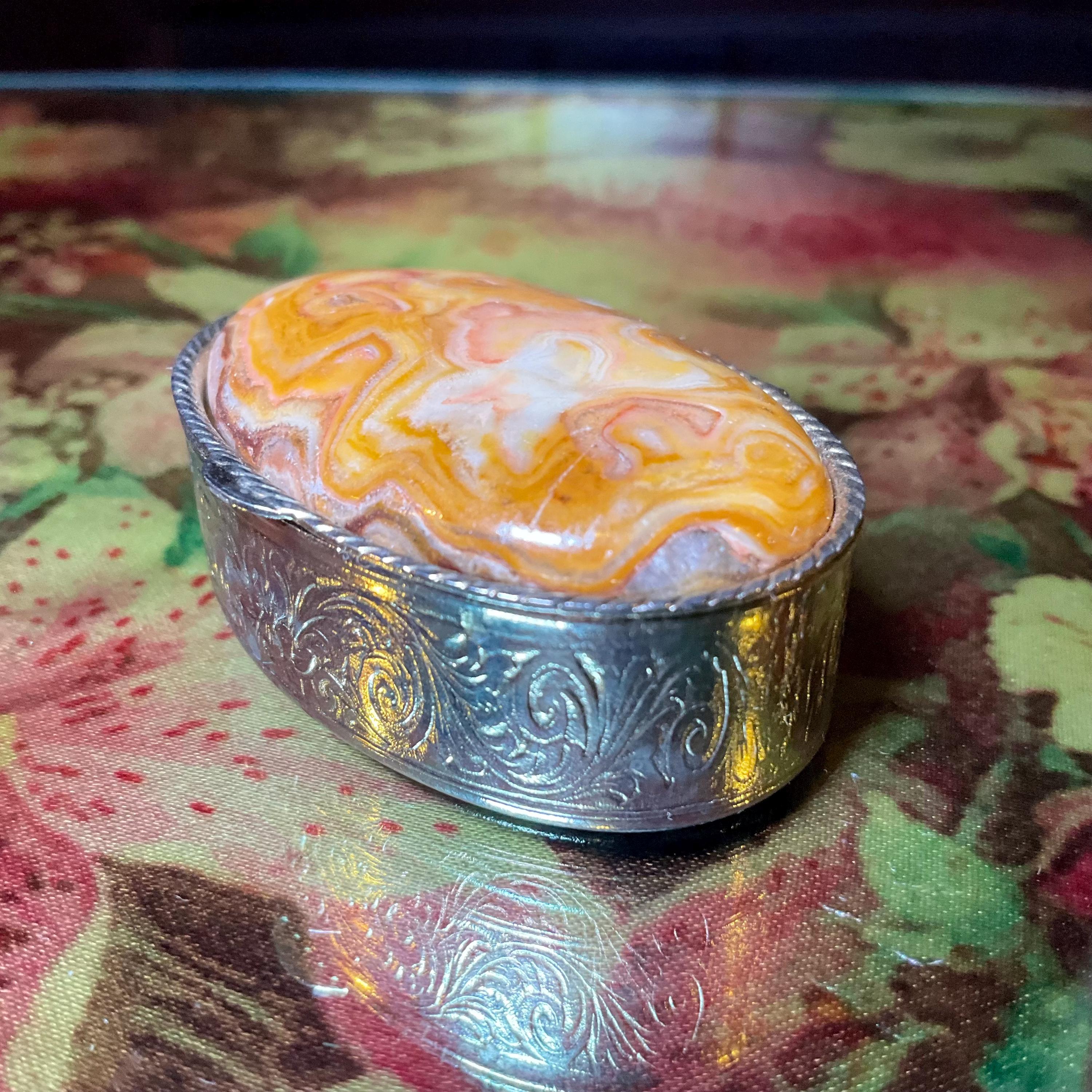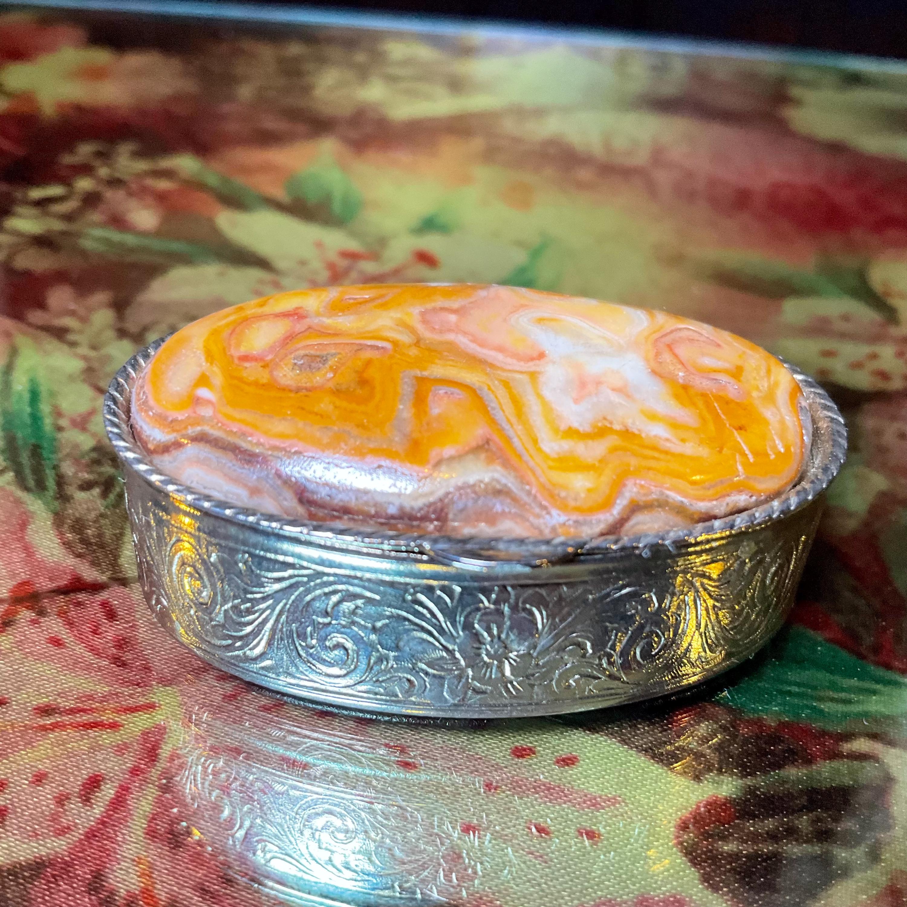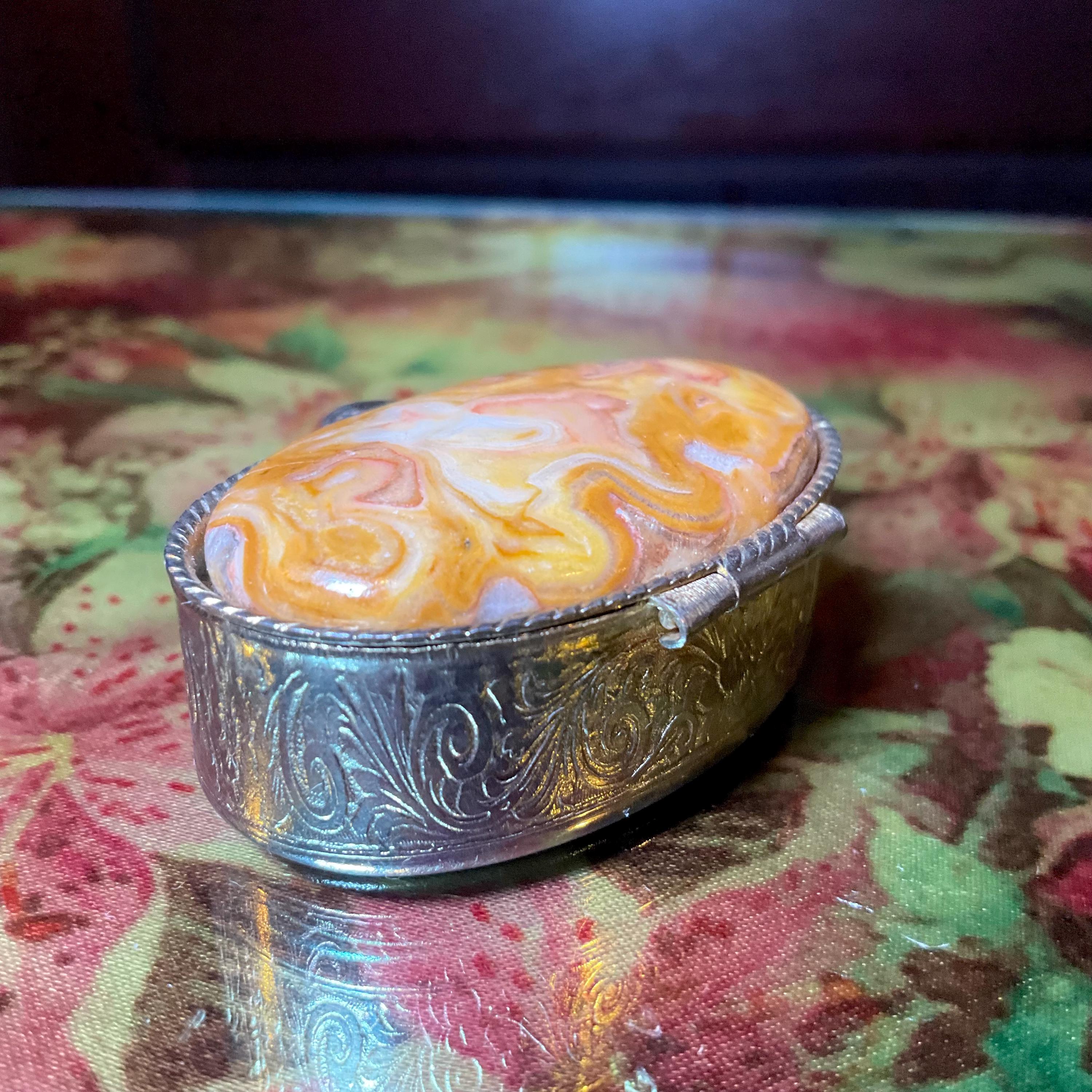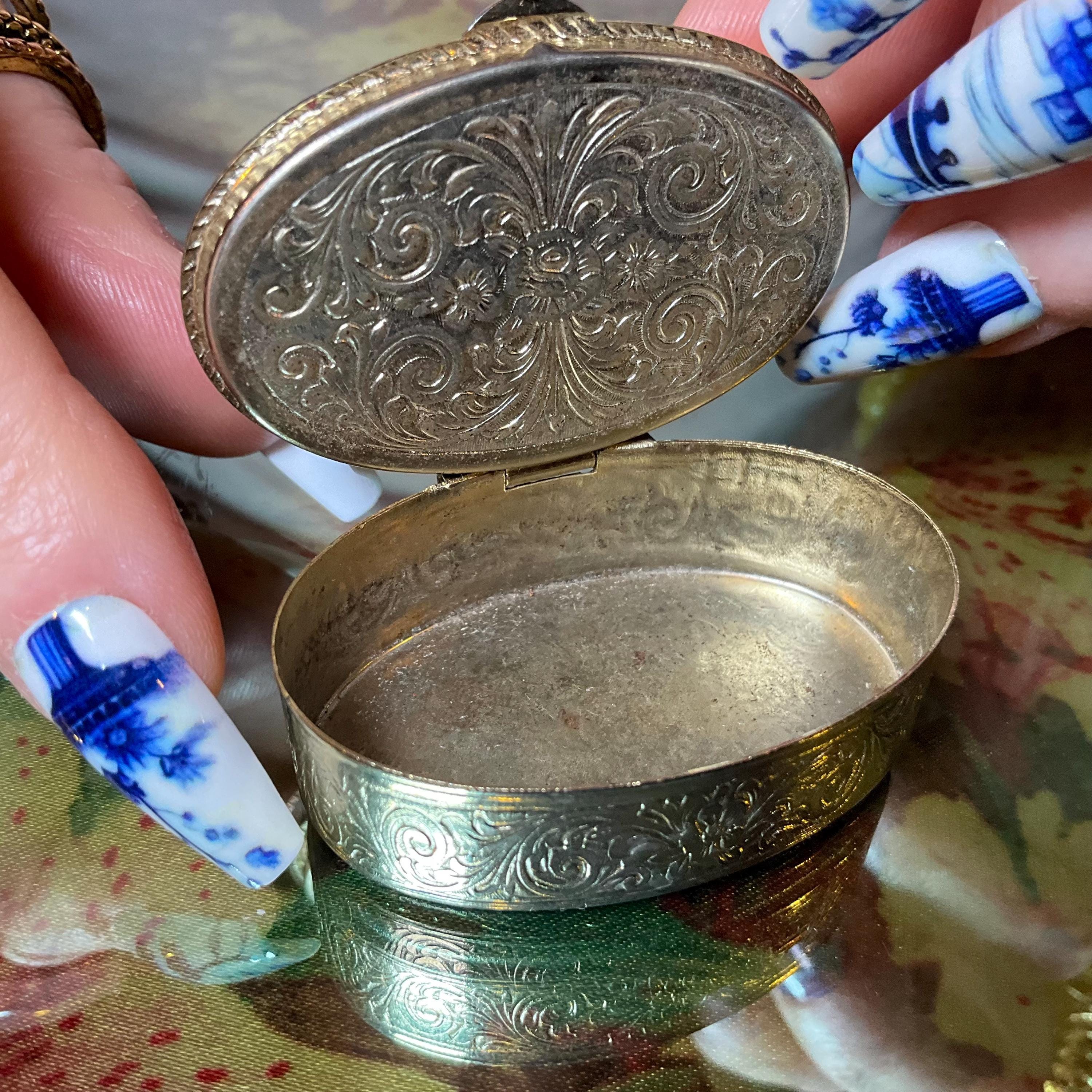 The Vintage Afghan Jade Pill Box and it is beautifully hand-crafted box with silver etching throughout.