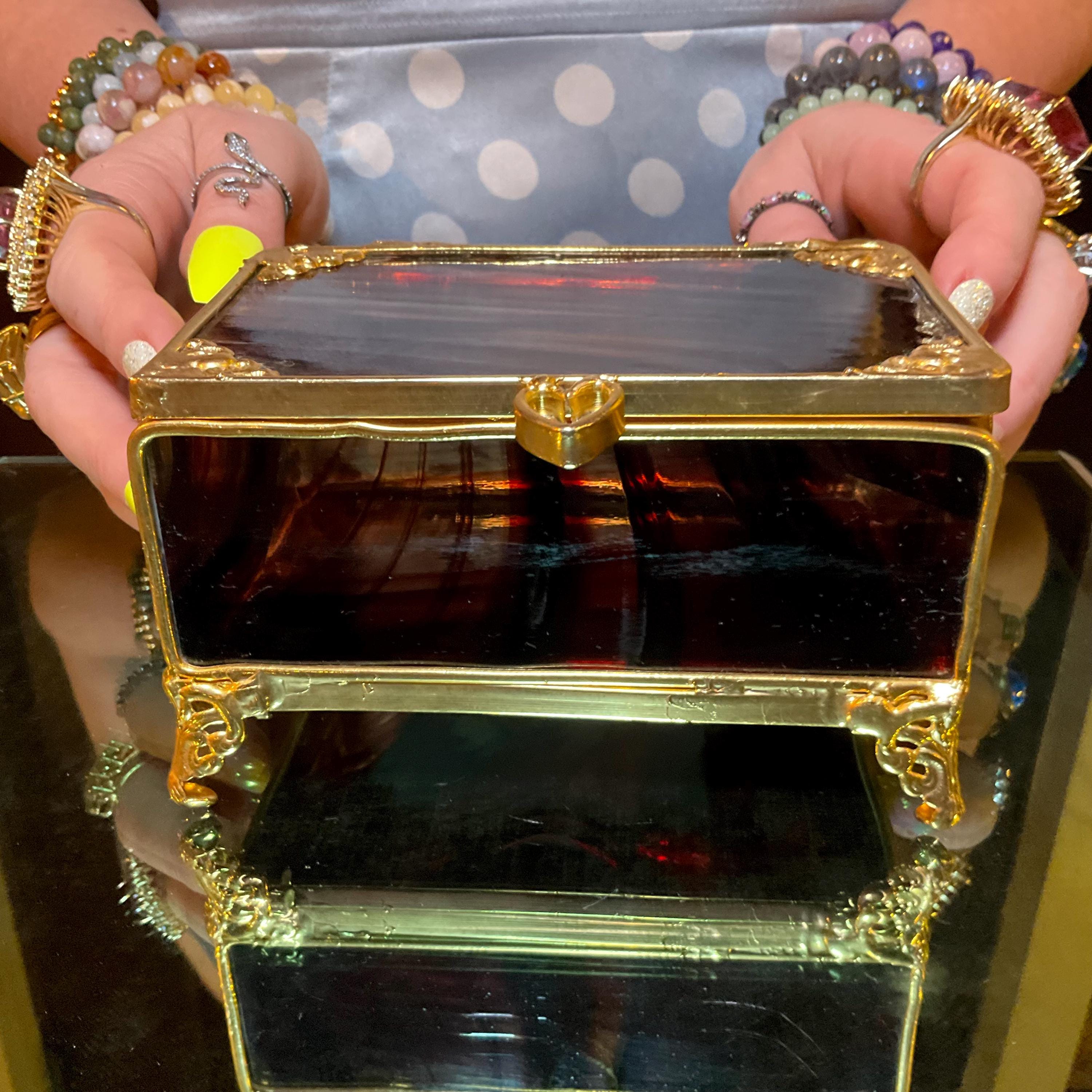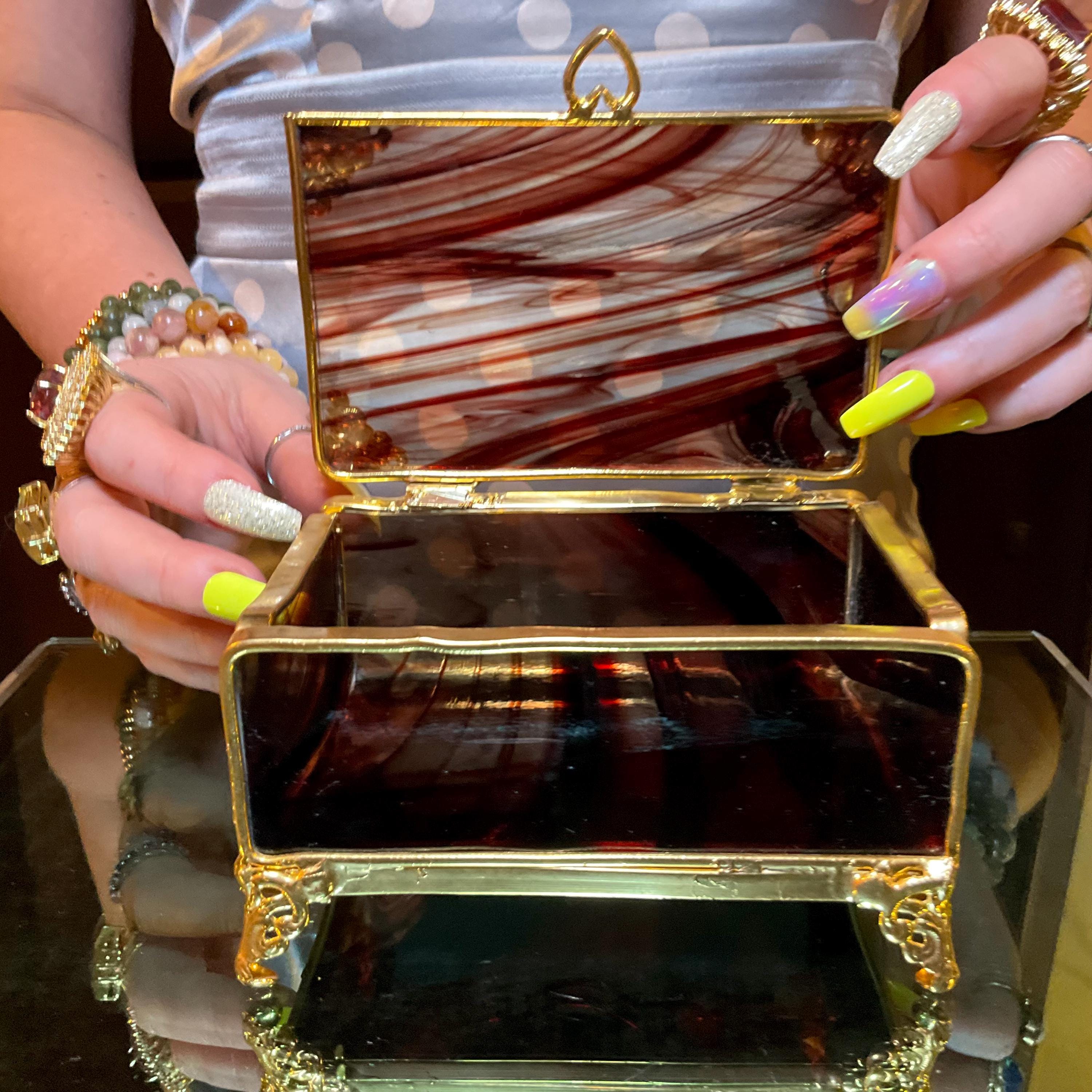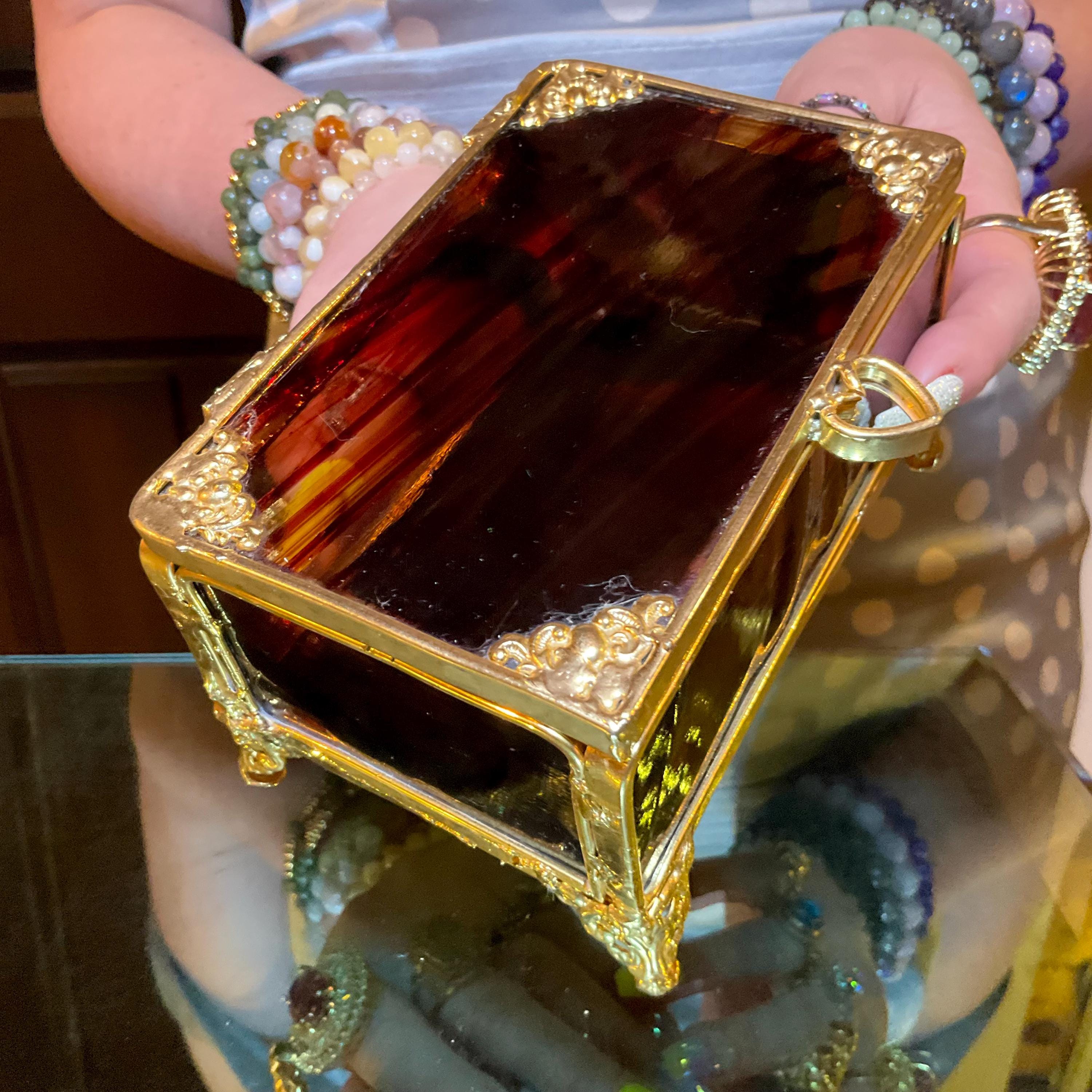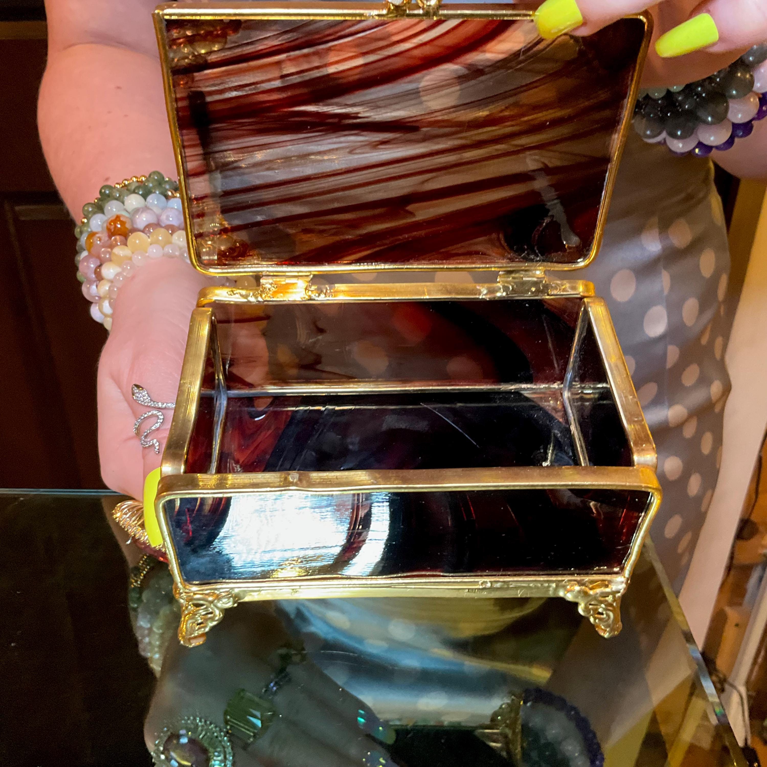 This gilt gold & purple Fluorite jewelry box has the most stunning gorgeous swirling- transparent purple banded patterns throughout.