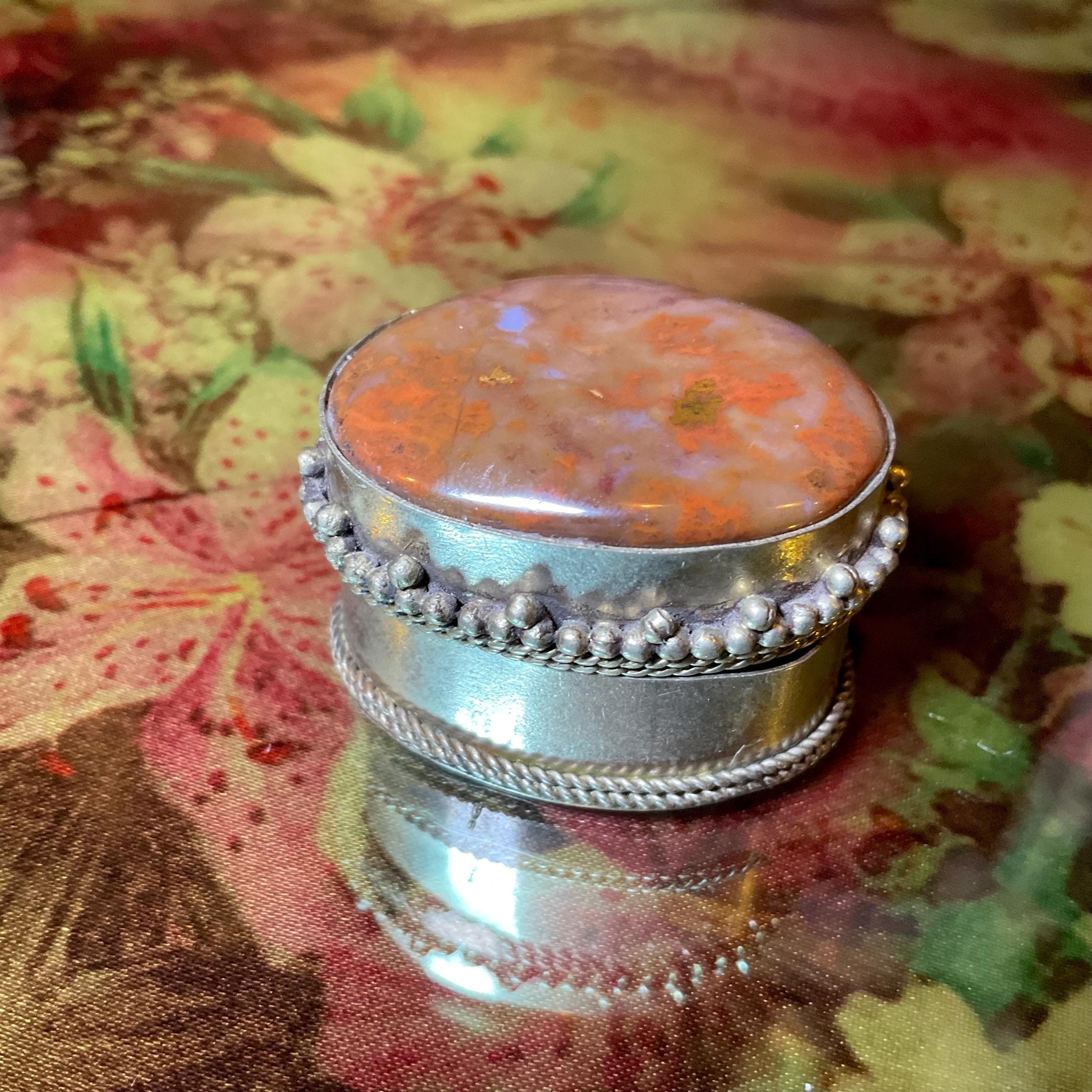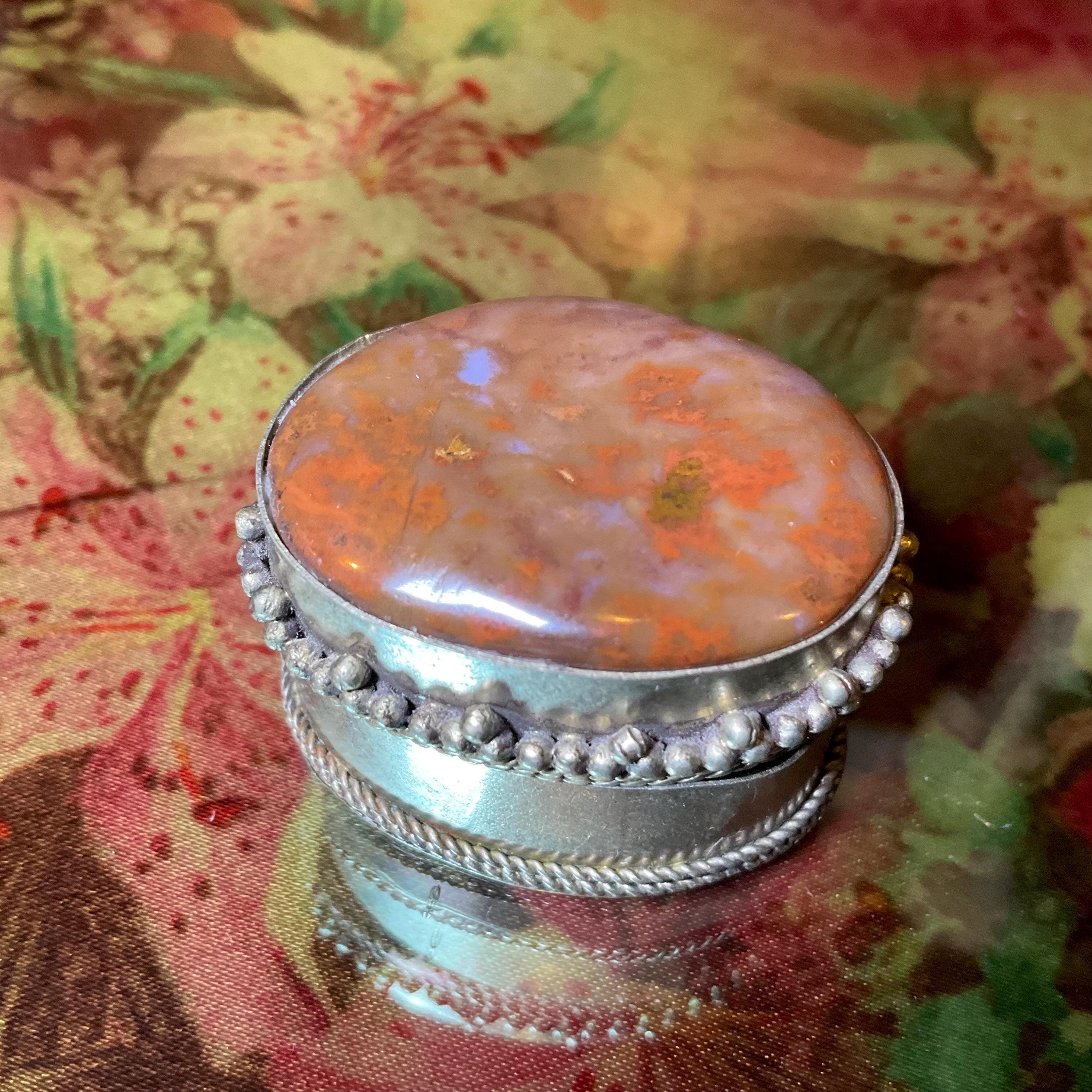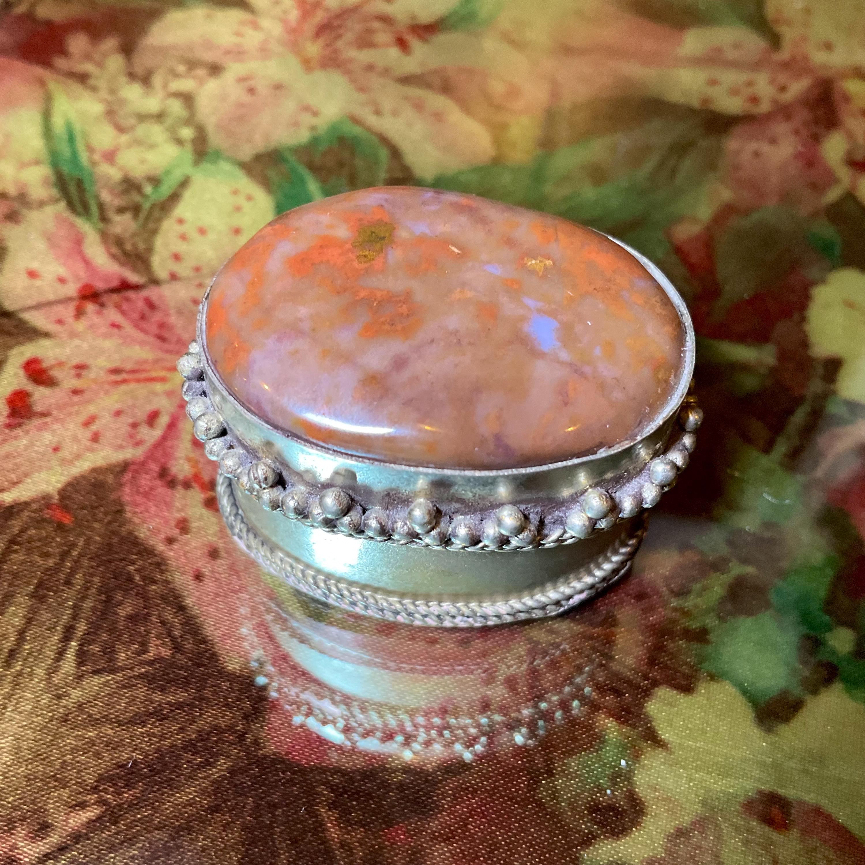If you love vintage hand carved Fire Moss Agate, then this beautiful Snuff/Pill Box is for you.