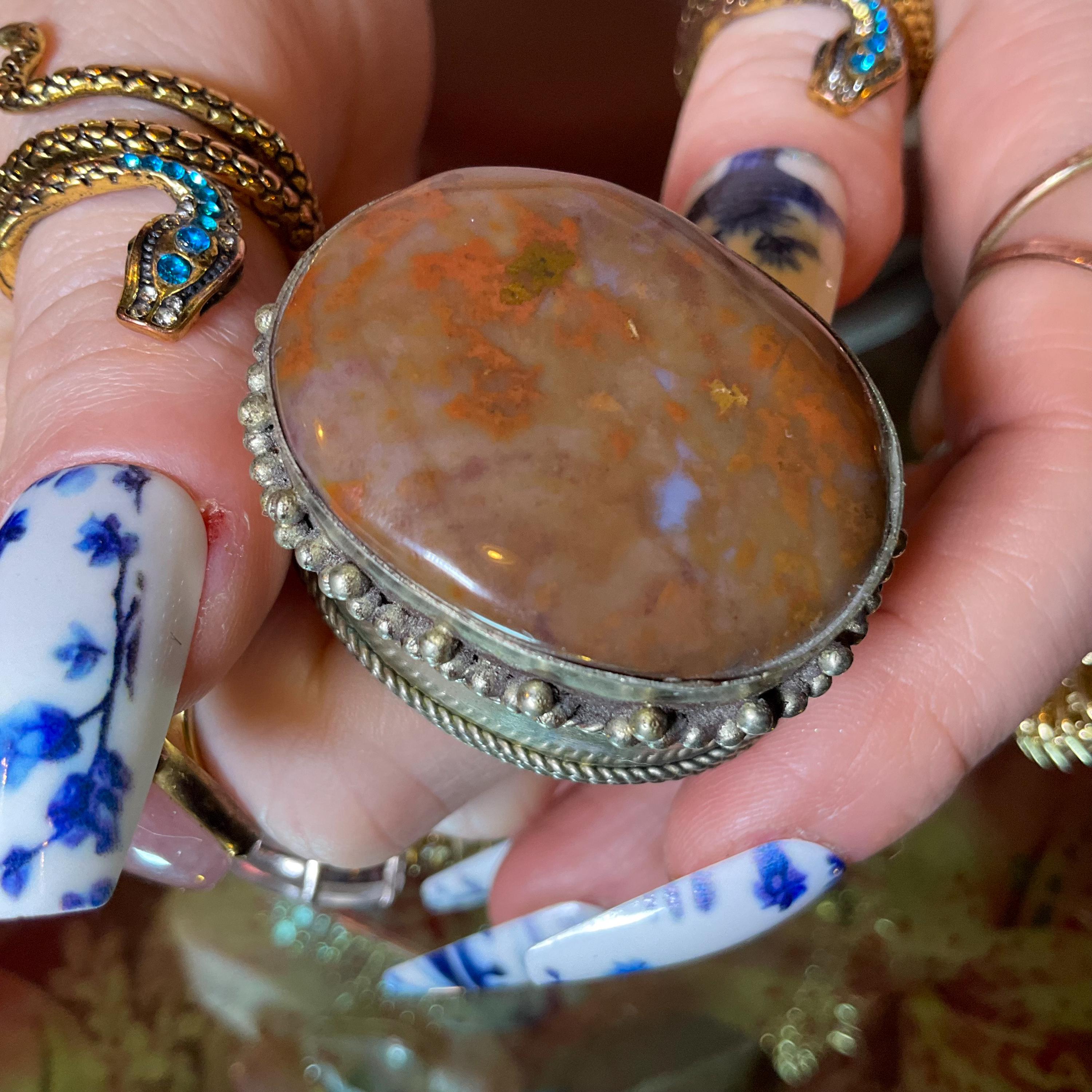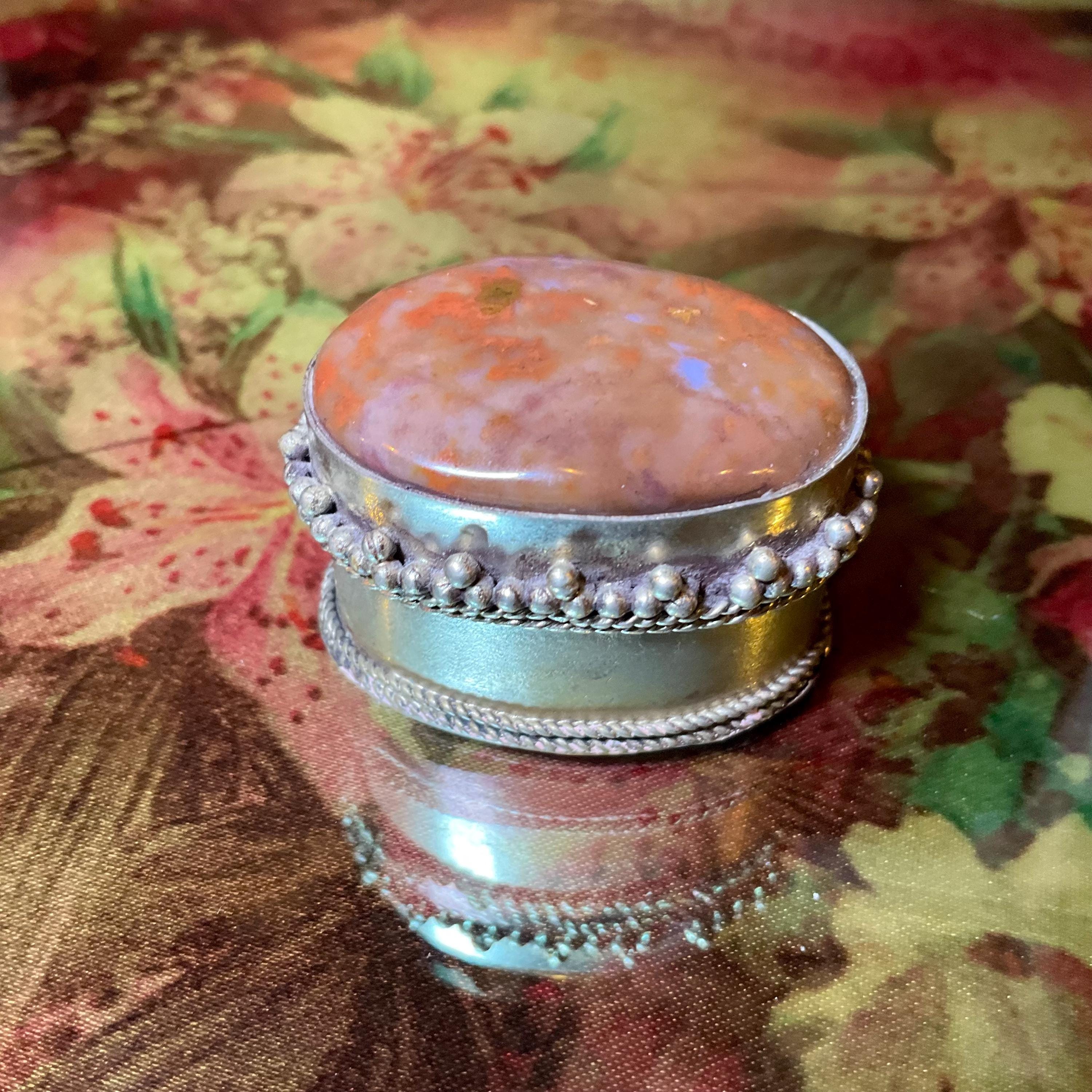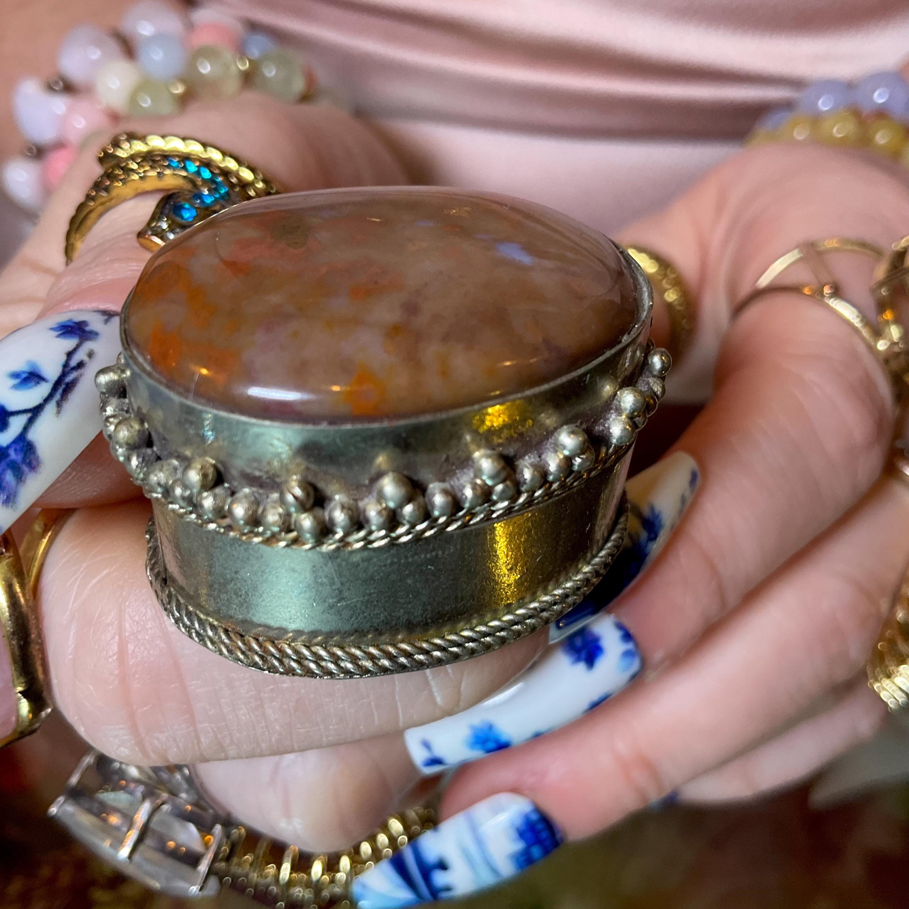 If you love vintage hand carved Fire Moss Agate, then this beautiful Snuff/Pill Box is for you.