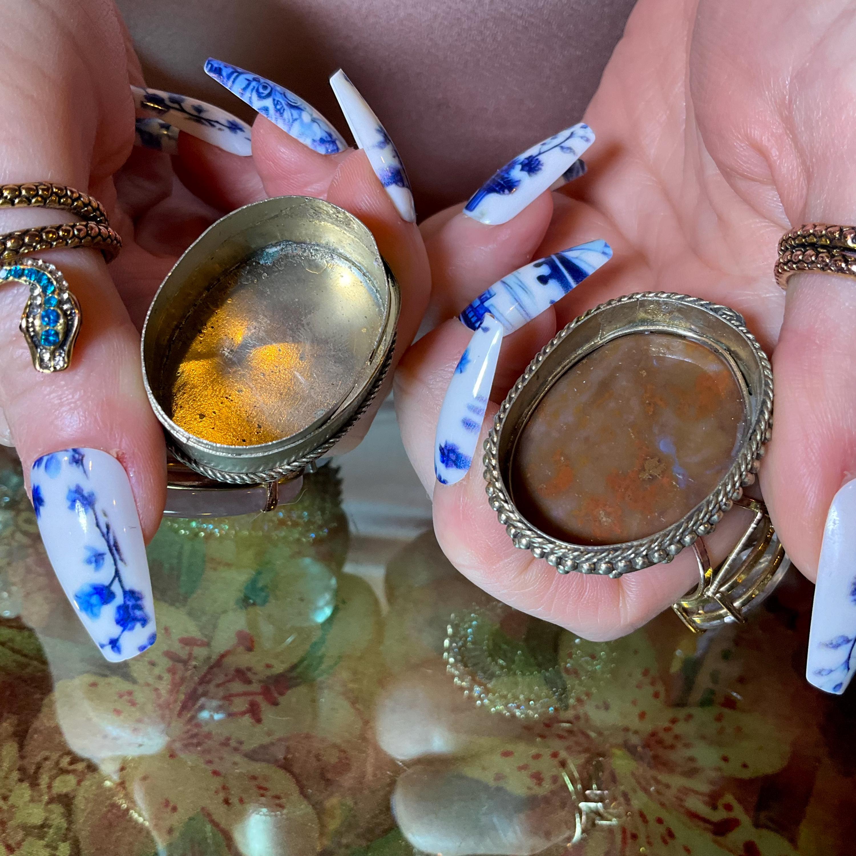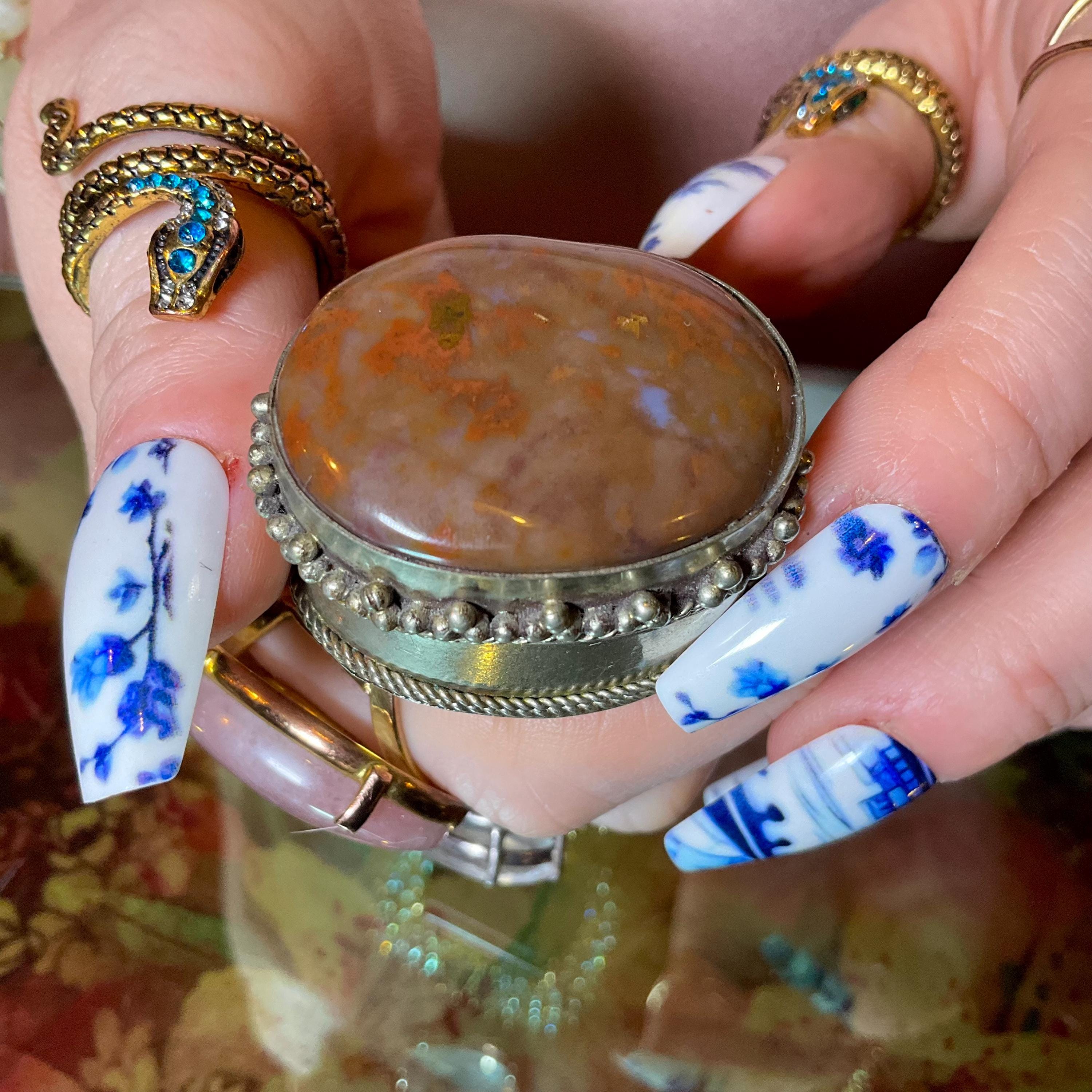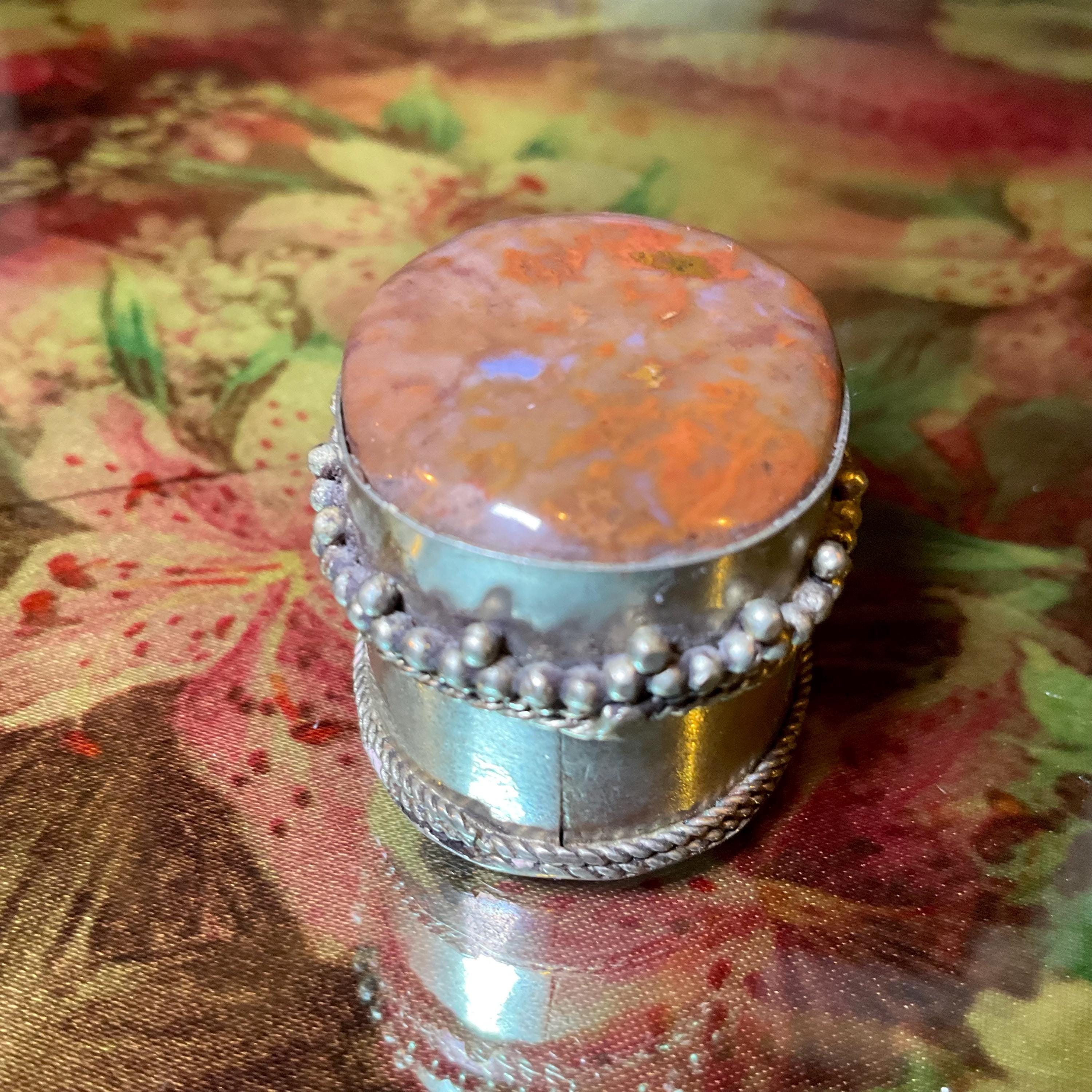 The vintage Fire Moss Agate Snuff/Pill Box weighs, 1 ounce and it is beautifully hand-crafted.