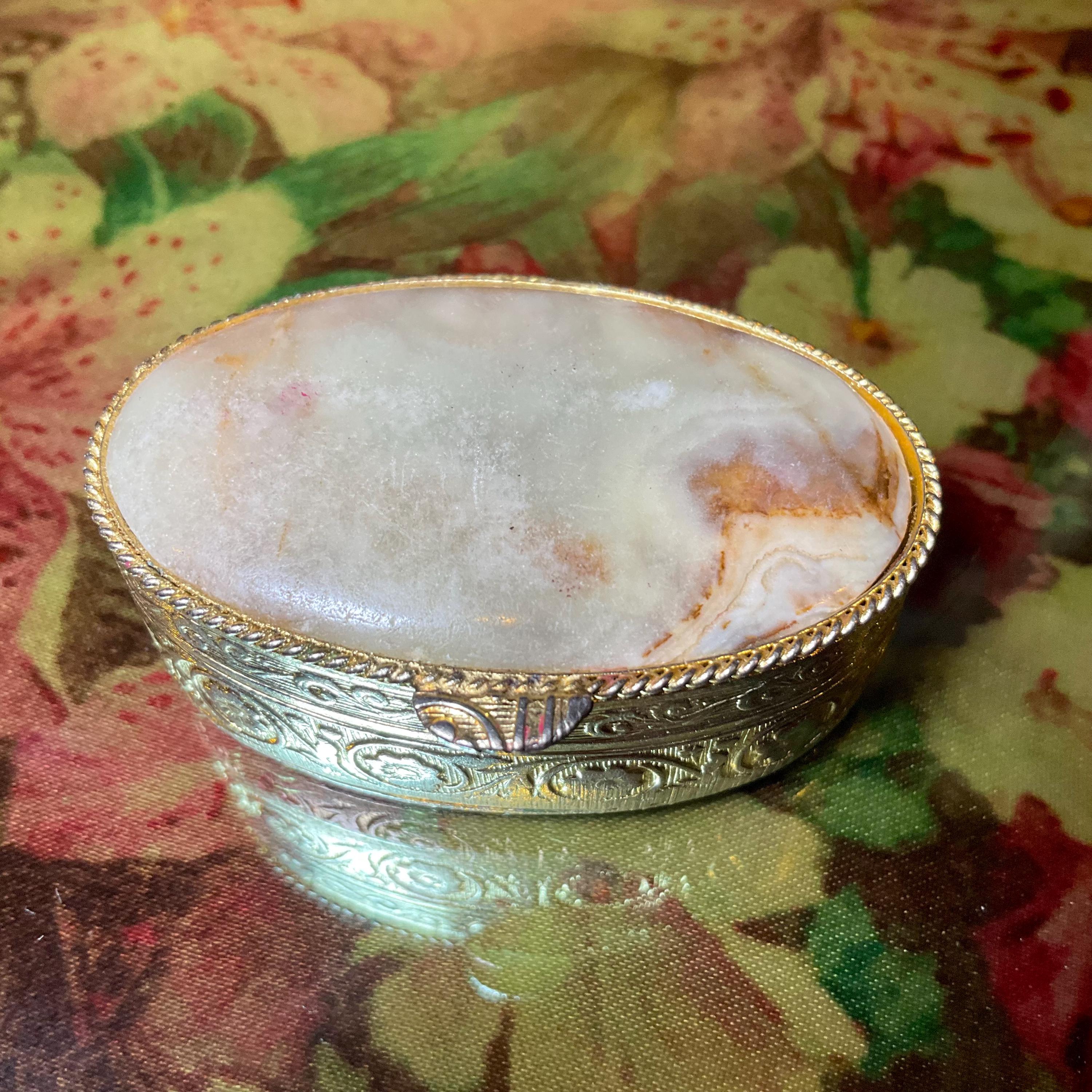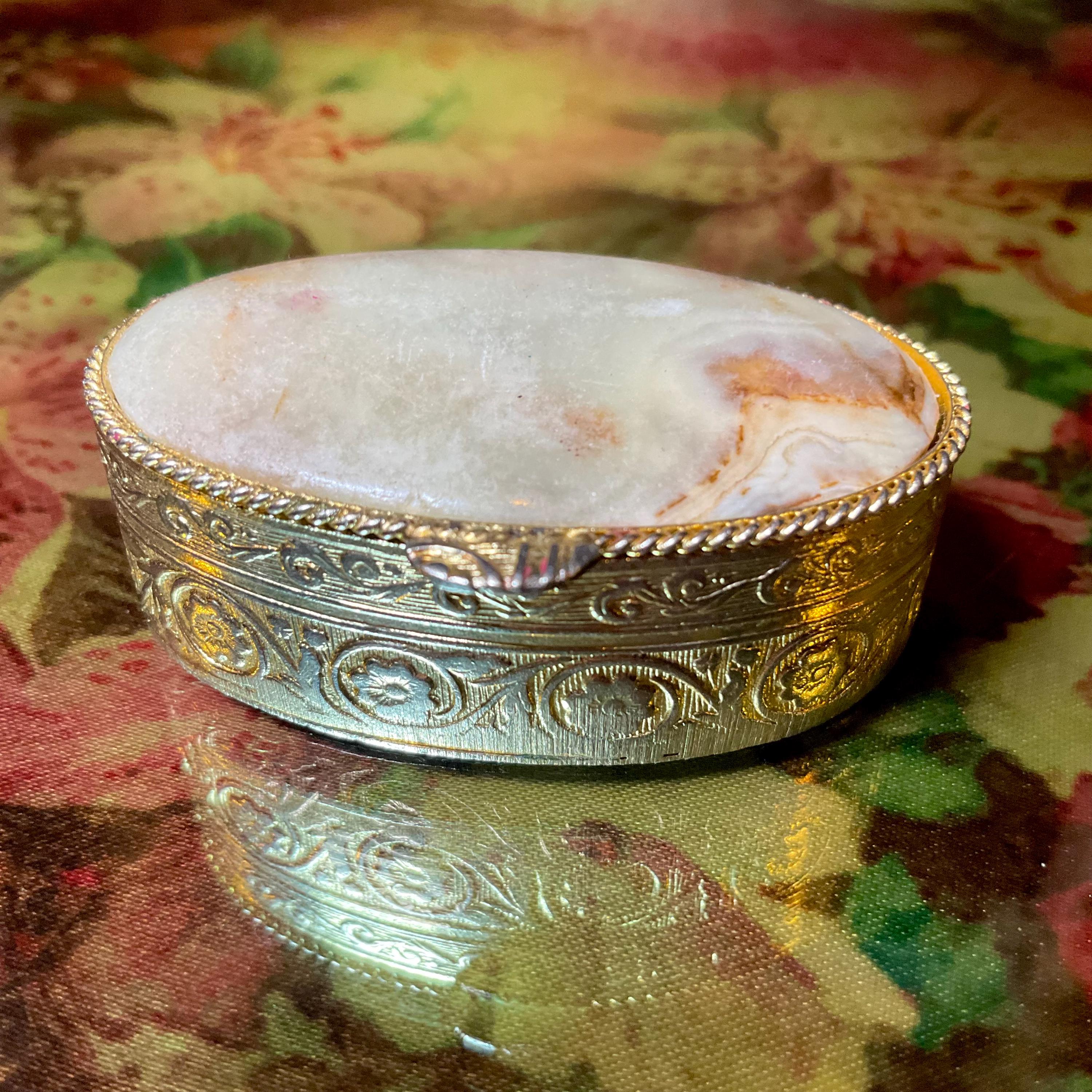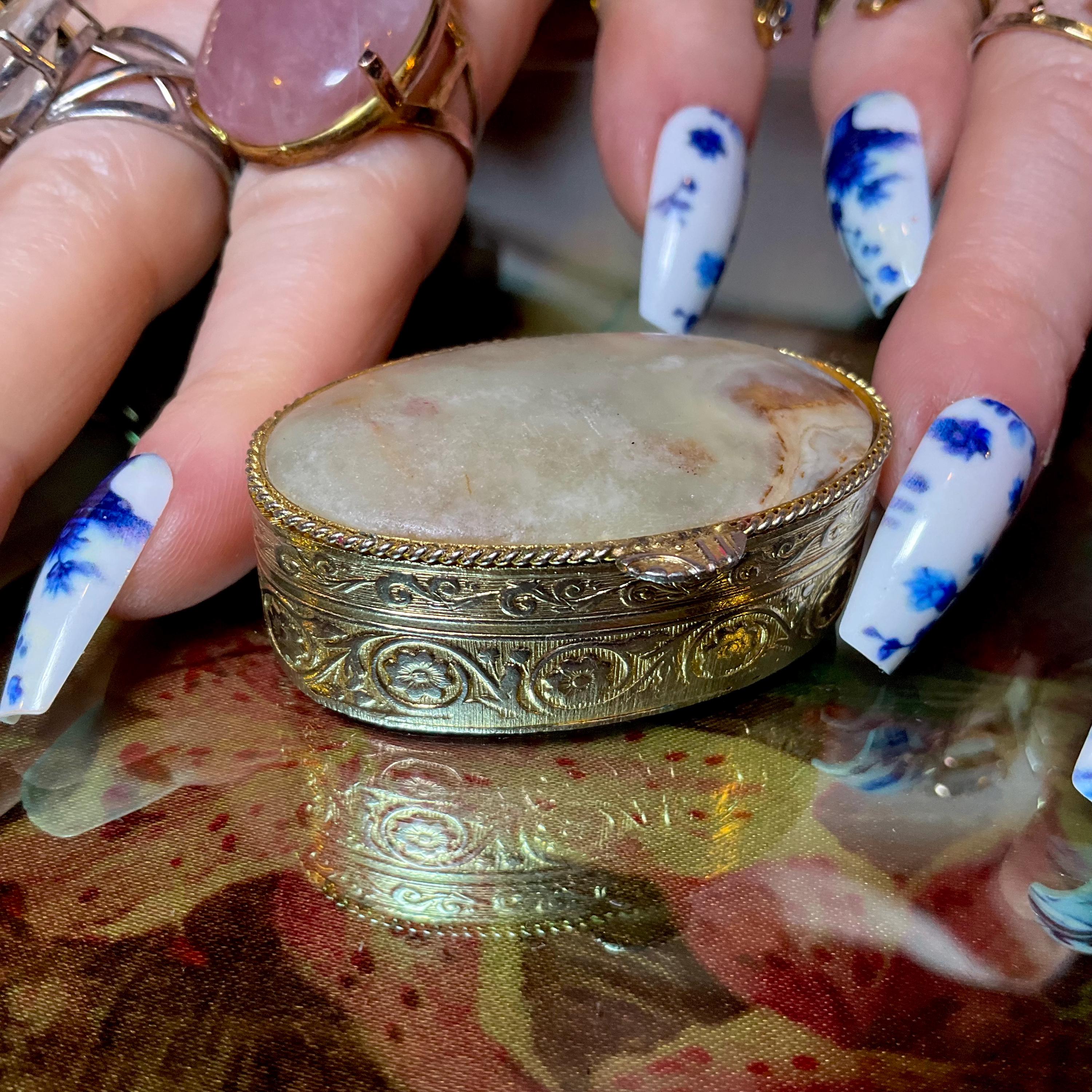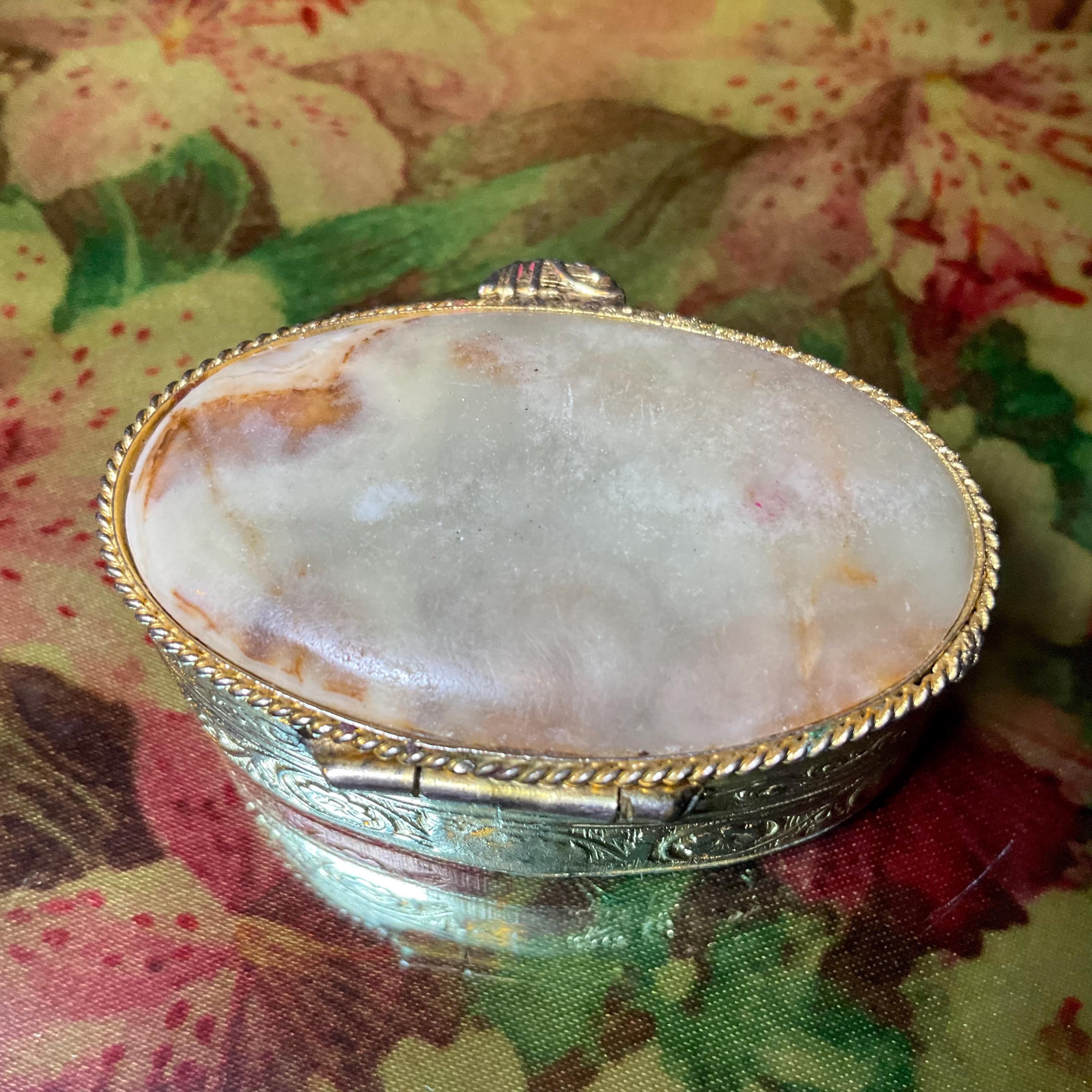 The Vintage Afghan Jade Pill Box and it is beautifully hand-crafted box with silver etching throughout.