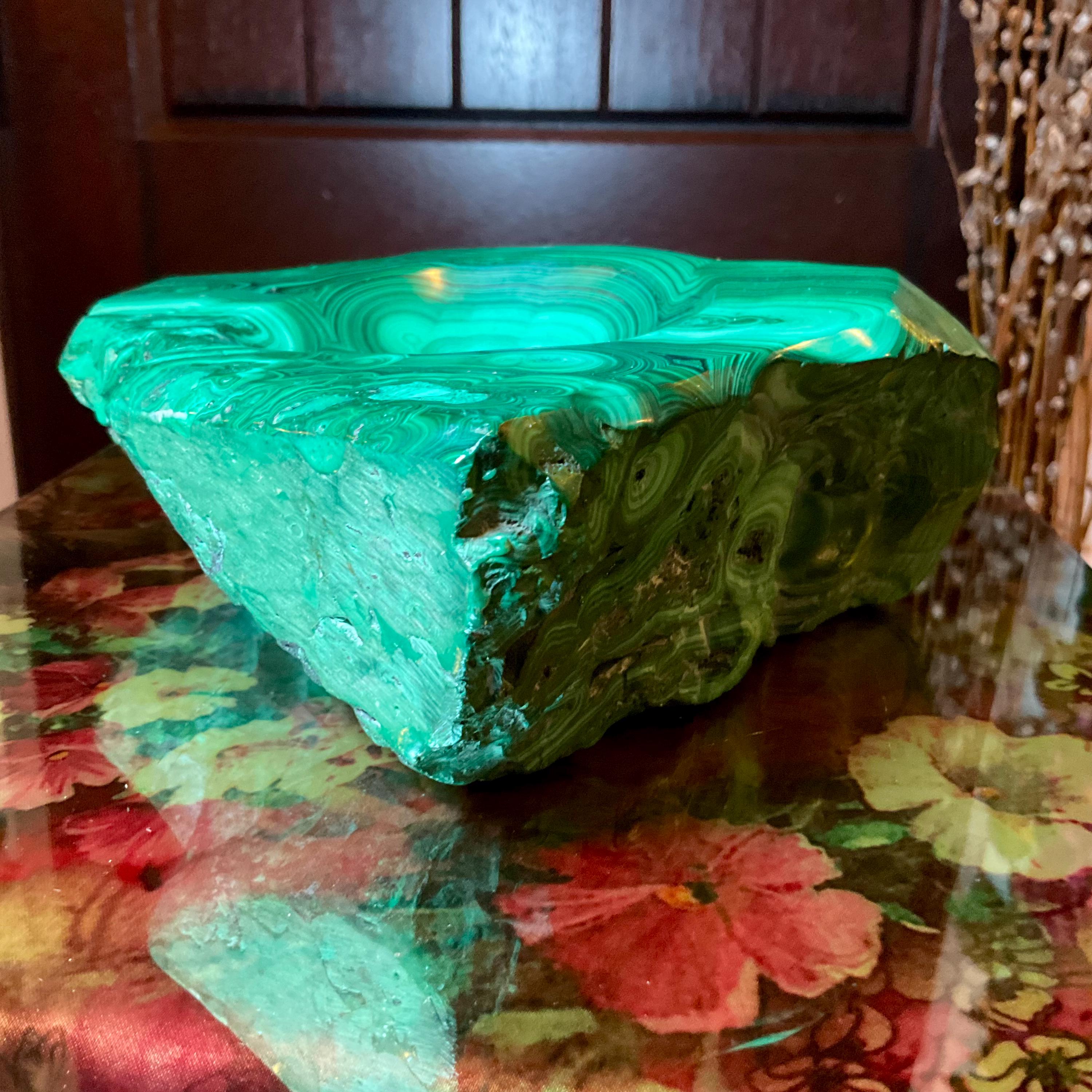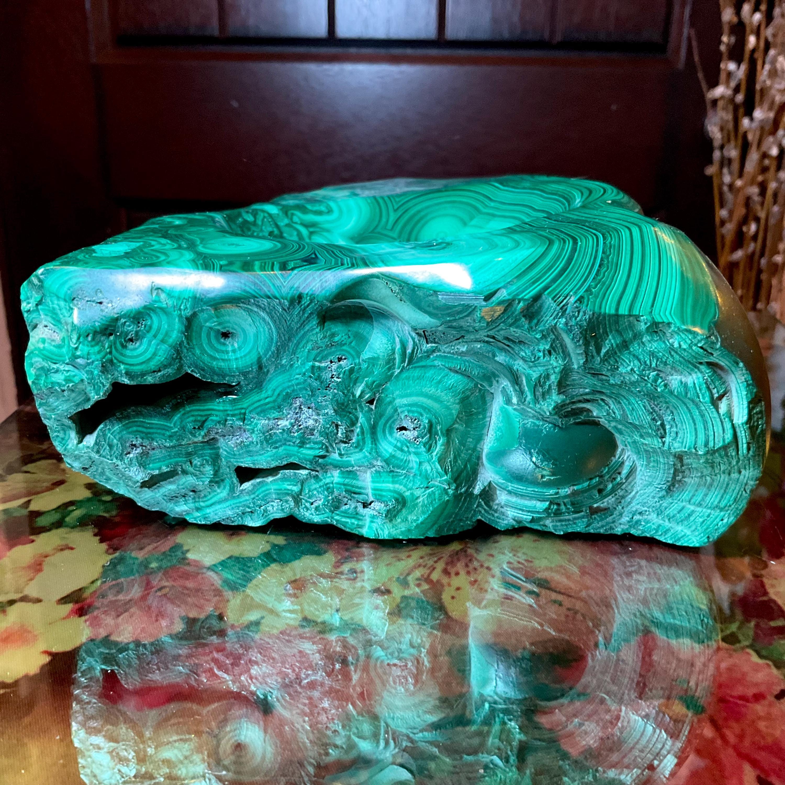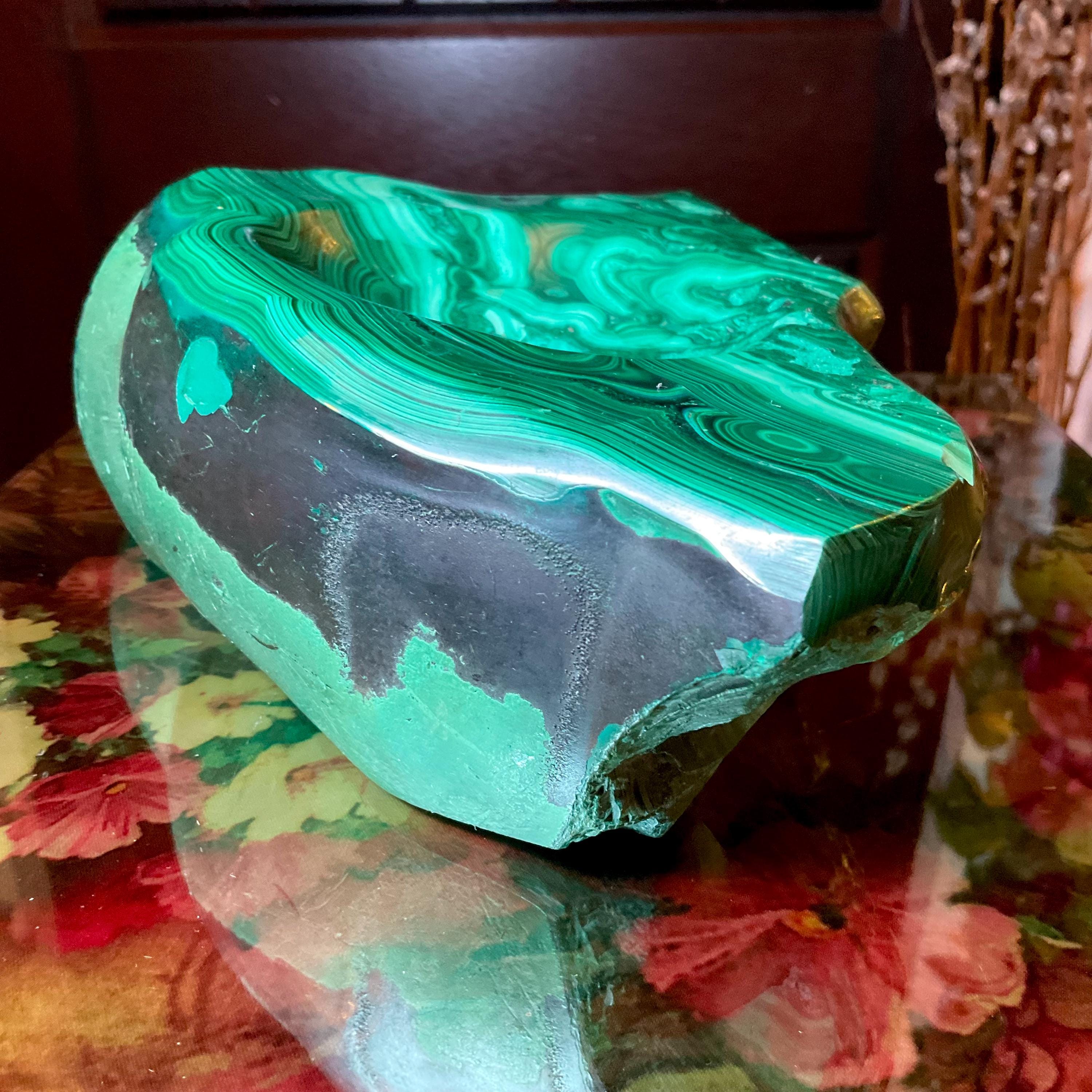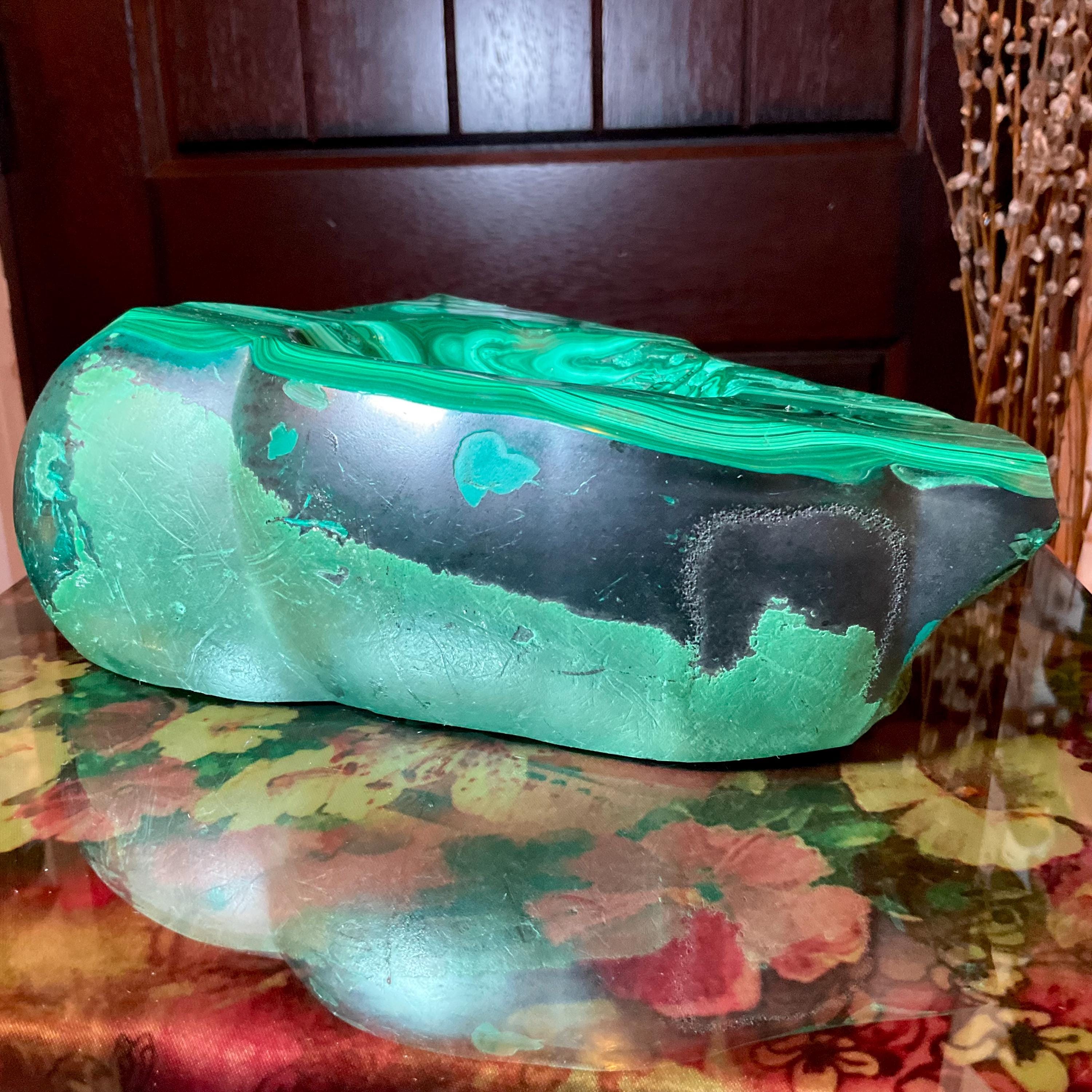 This piece of vintage Congo Malachite is so beautiful, so thick and its natural patina is not like the modern Malachite from China ~ its colors are so rich, and the detail of the stone is hand carved, making it a one-of-a-kind creation.