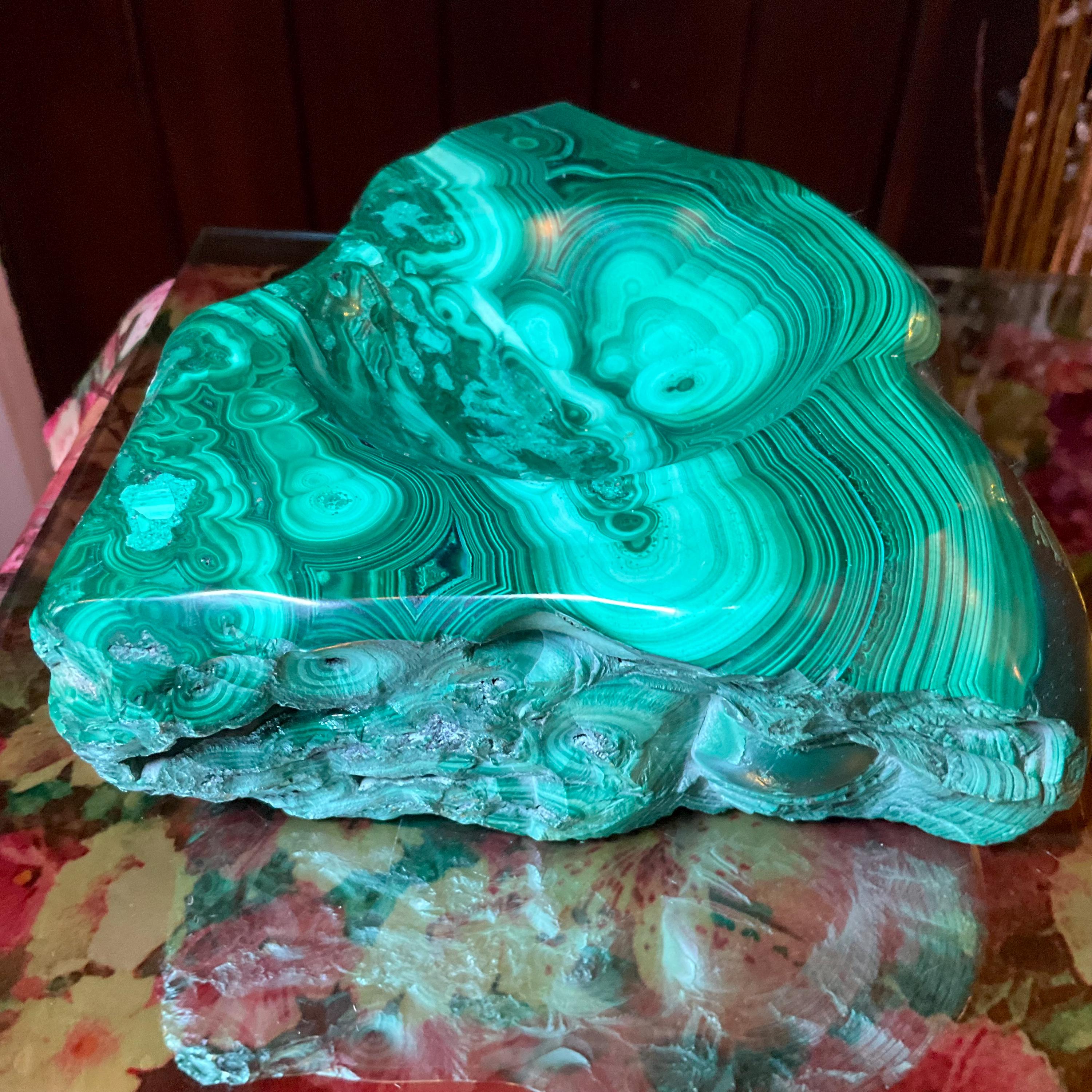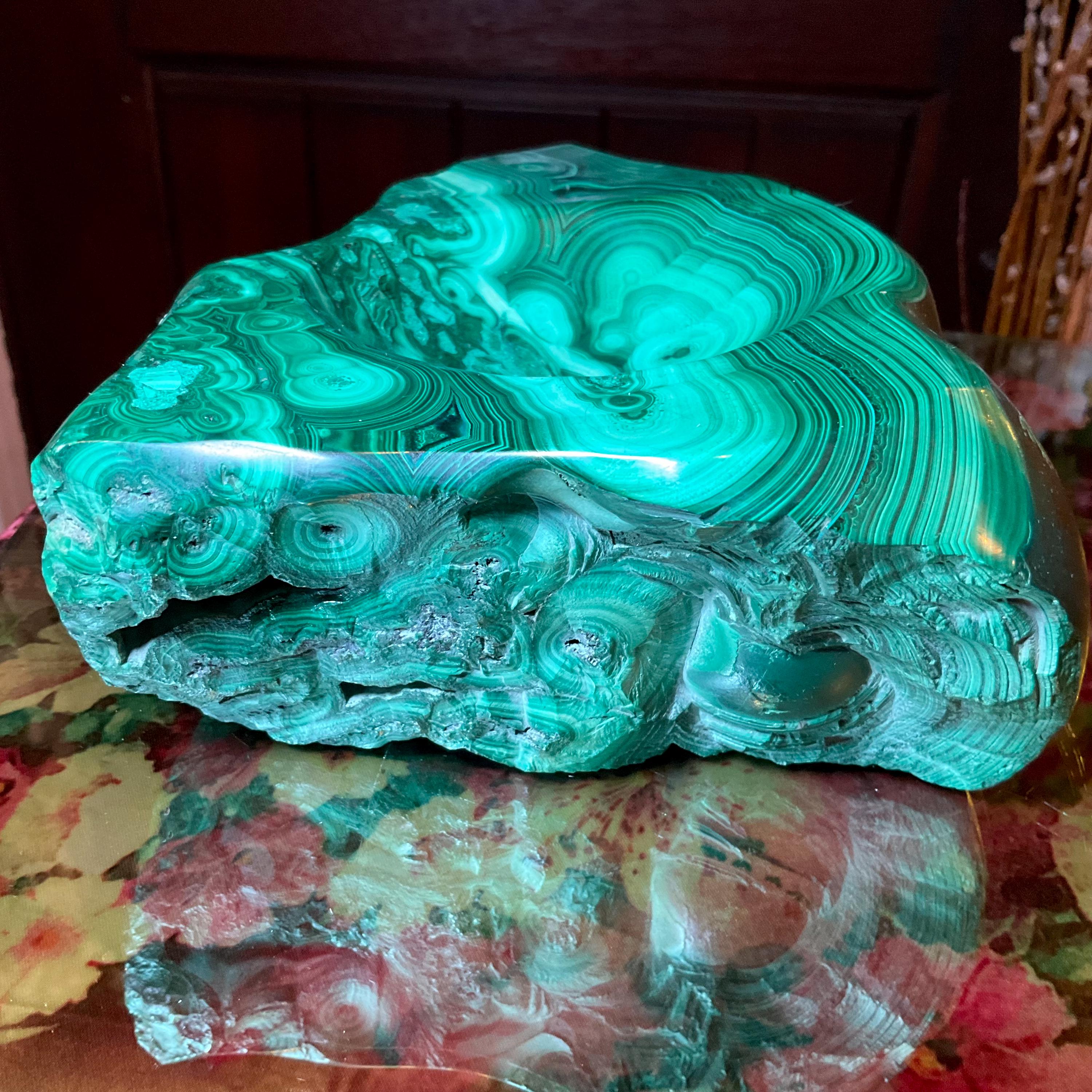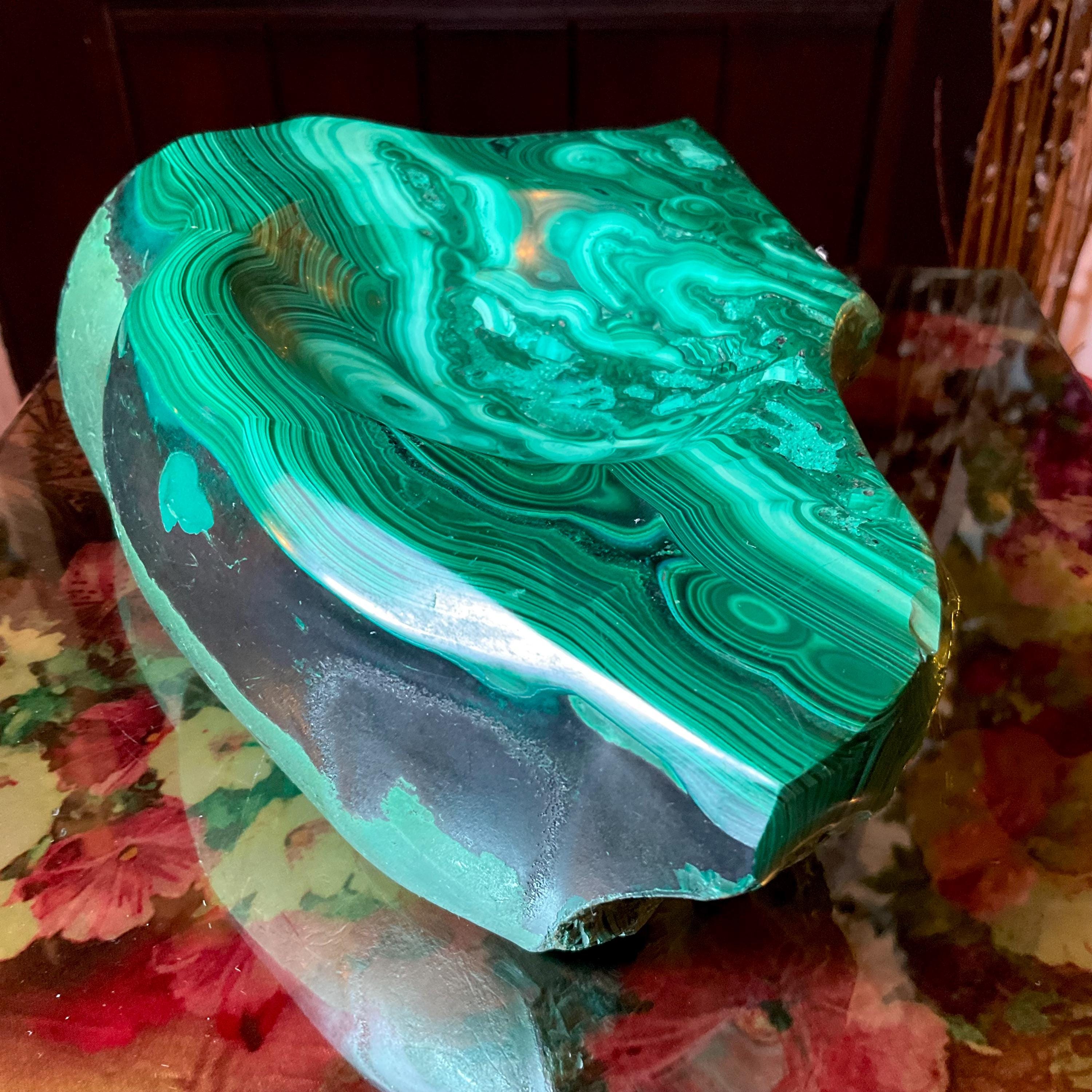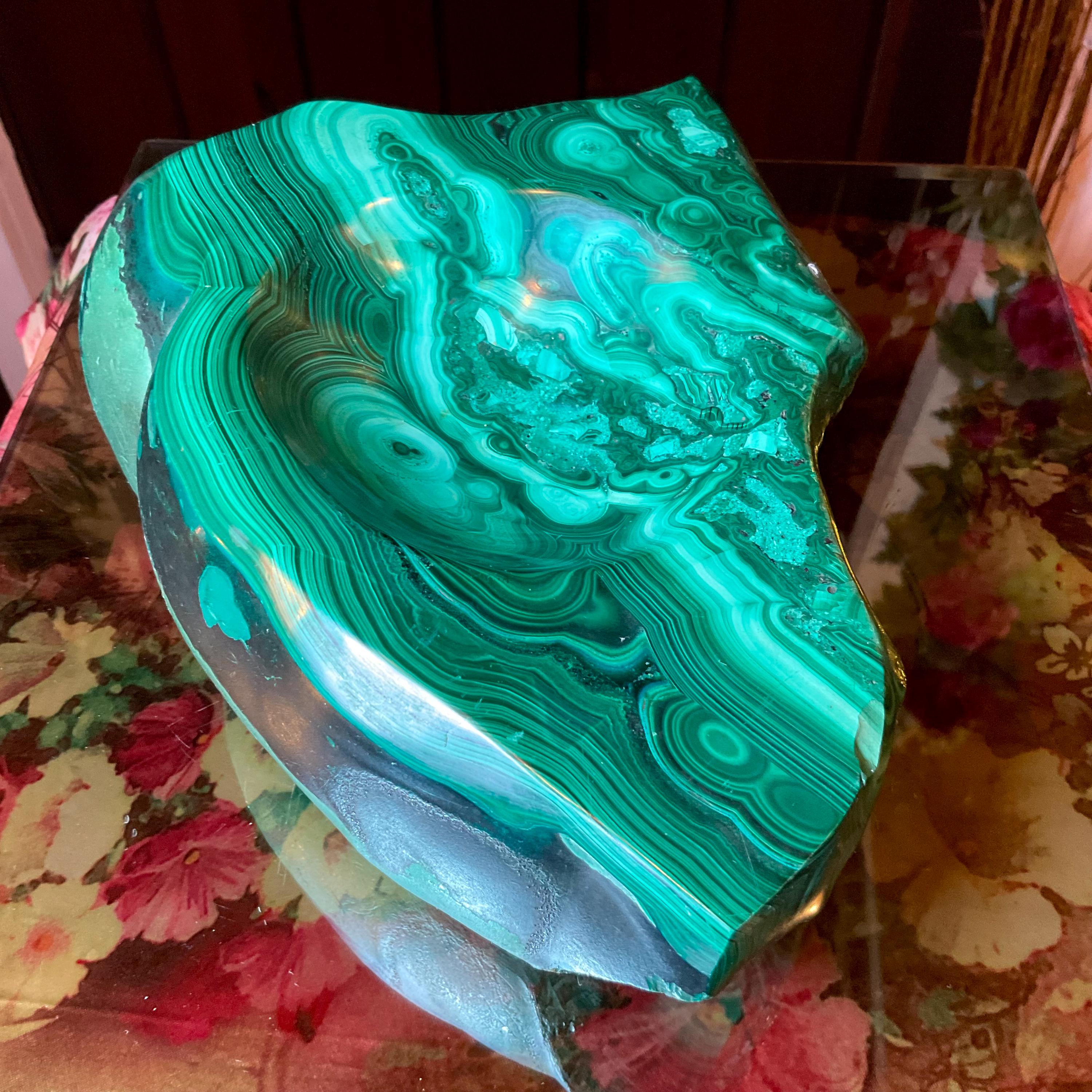 This piece of vintage Congo Malachite is so beautiful, so thick and its natural patina is not like the modern Malachite from China ~ its colors are so rich, and the detail of the stone is hand carved, making it a one-of-a-kind creation.