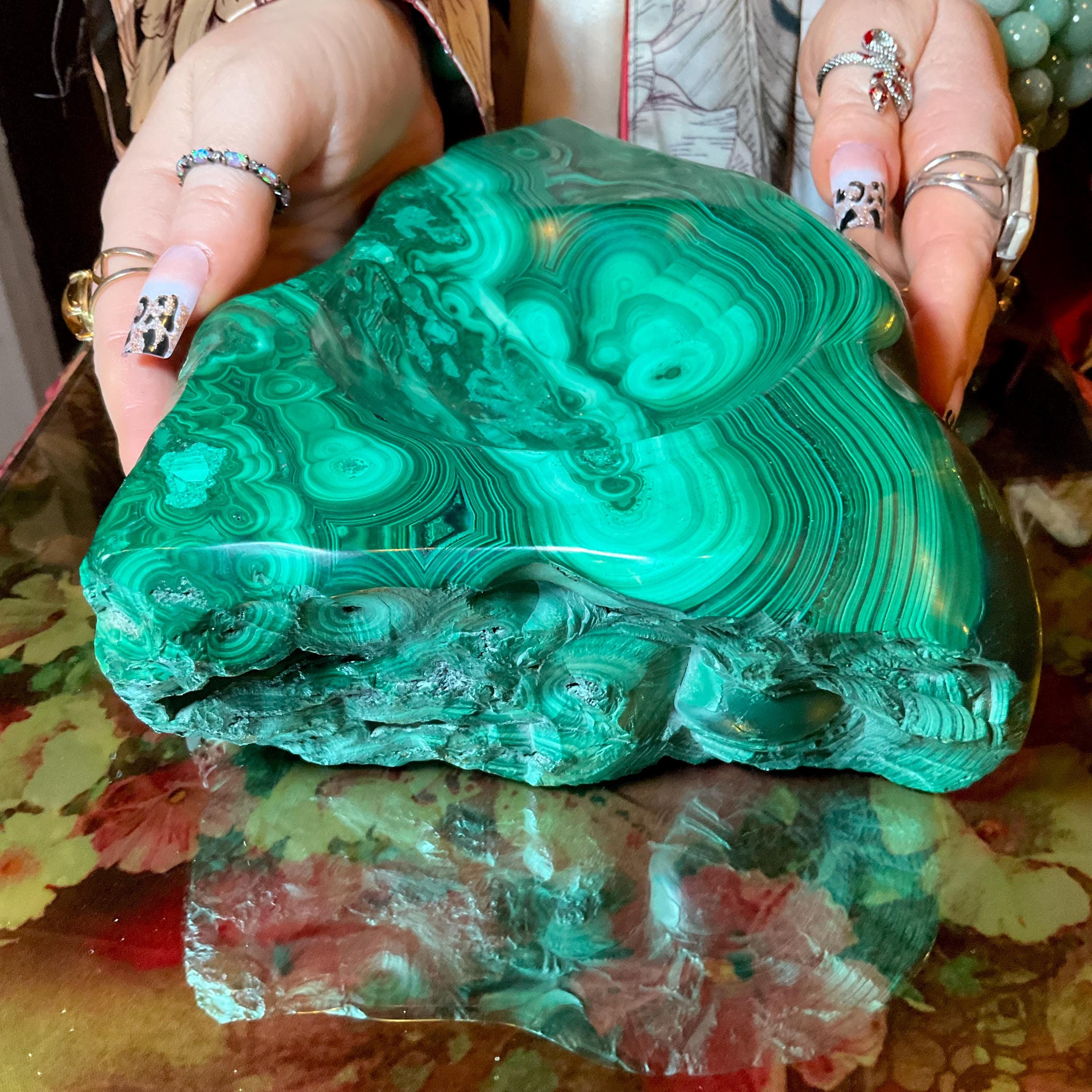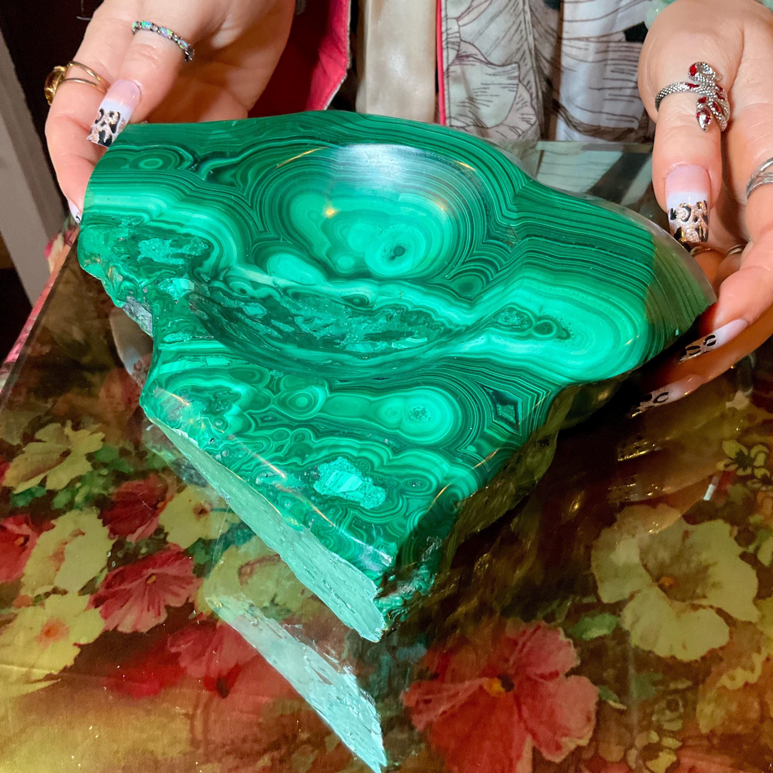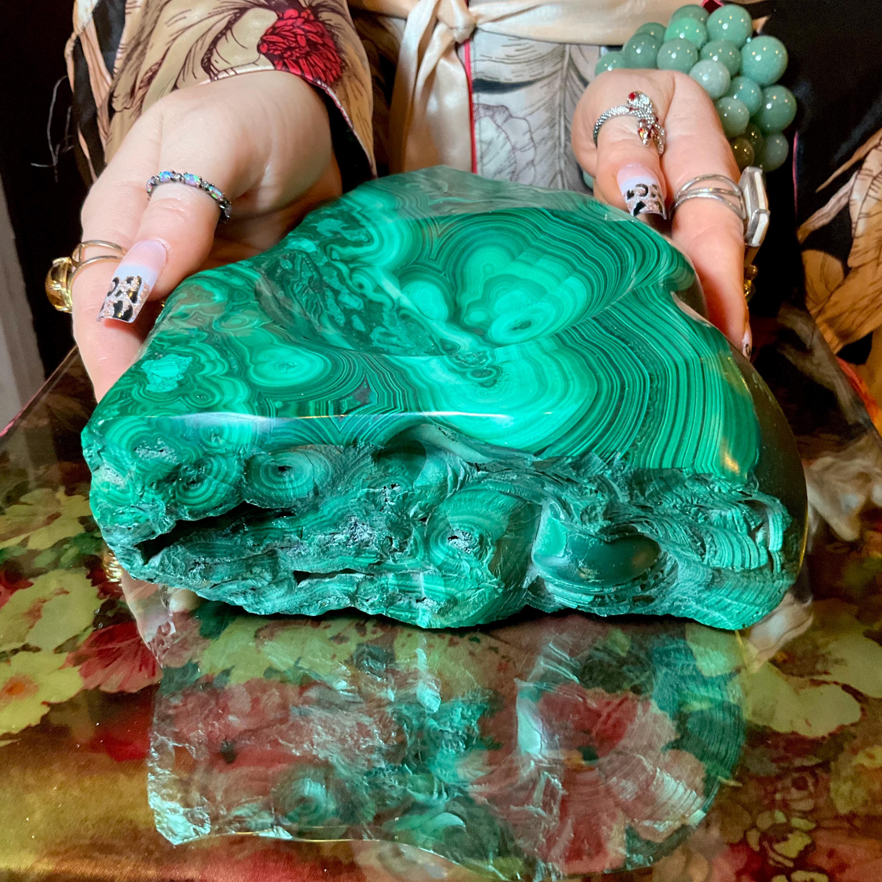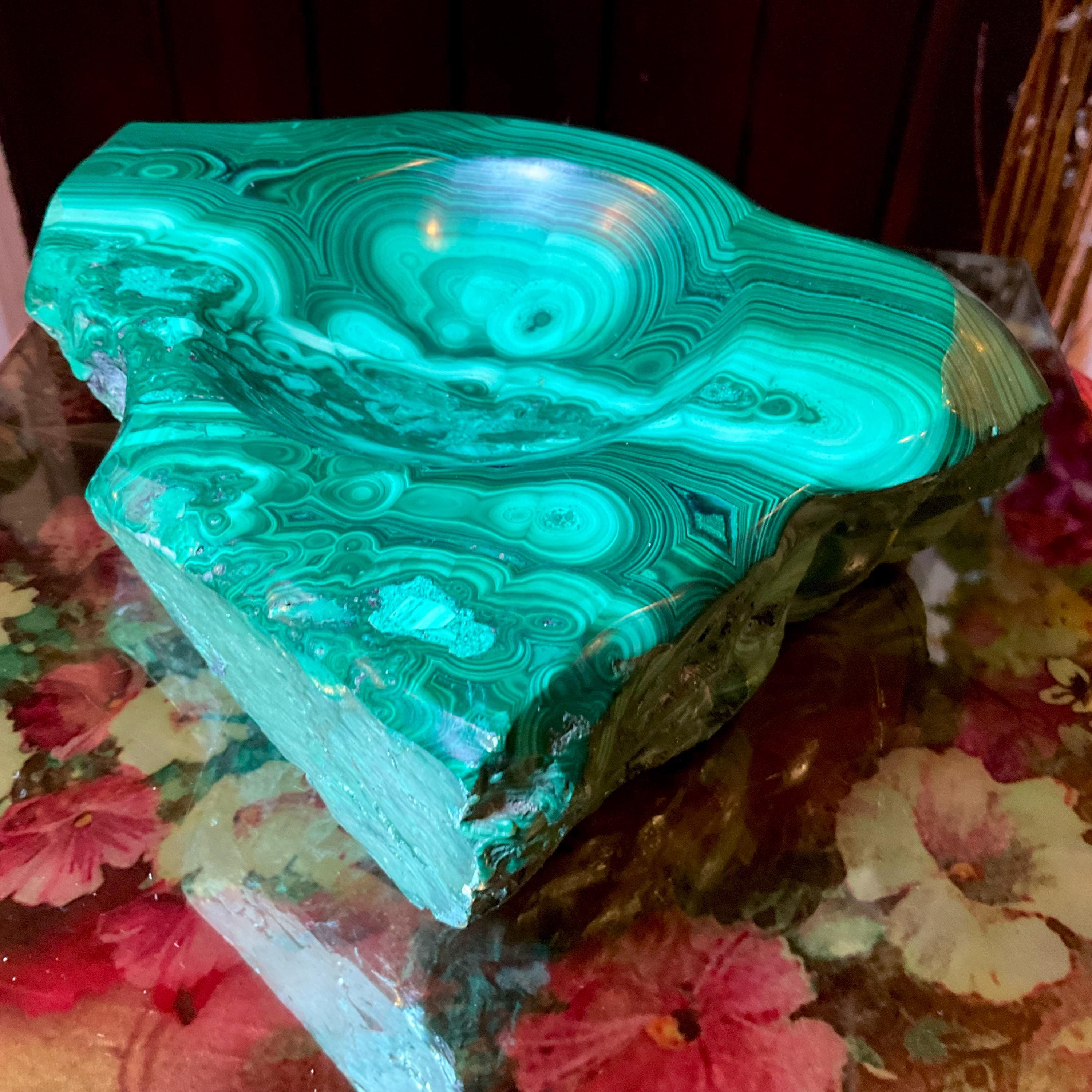This piece of vintage Congo Malachite is so beautiful, so thick and its natural patina is not like the modern Malachite from China ~ its colors are so rich, and the detail of the stone is hand carved, making it a one-of-a-kind creation.