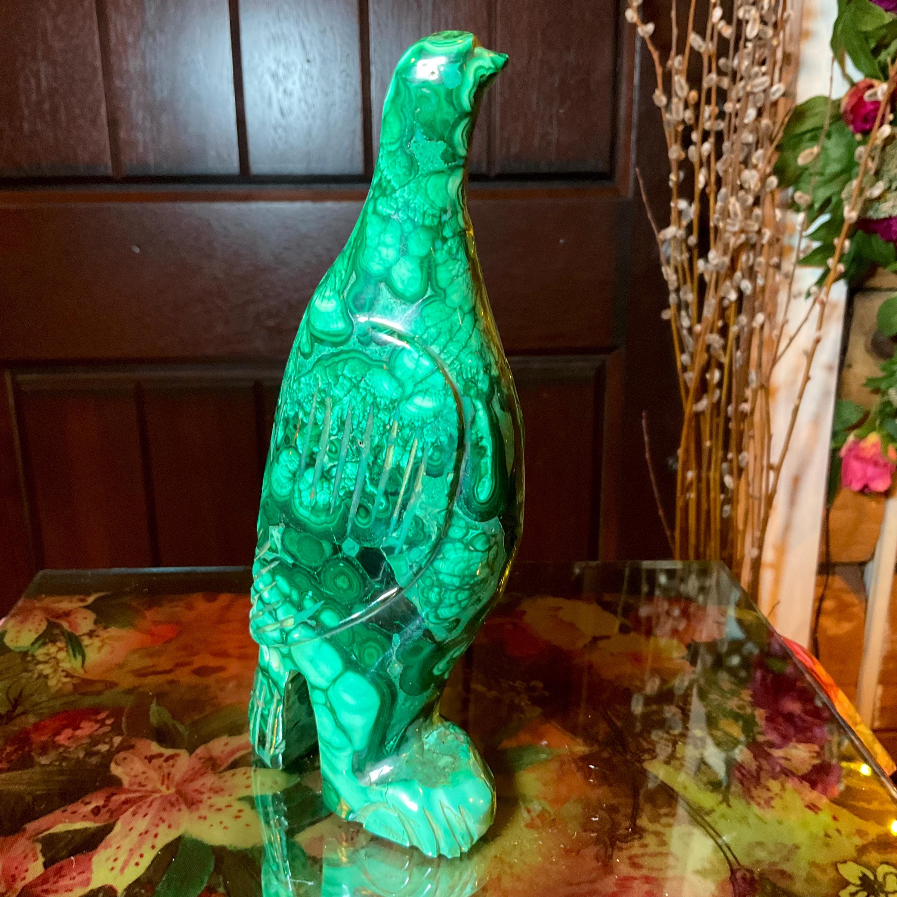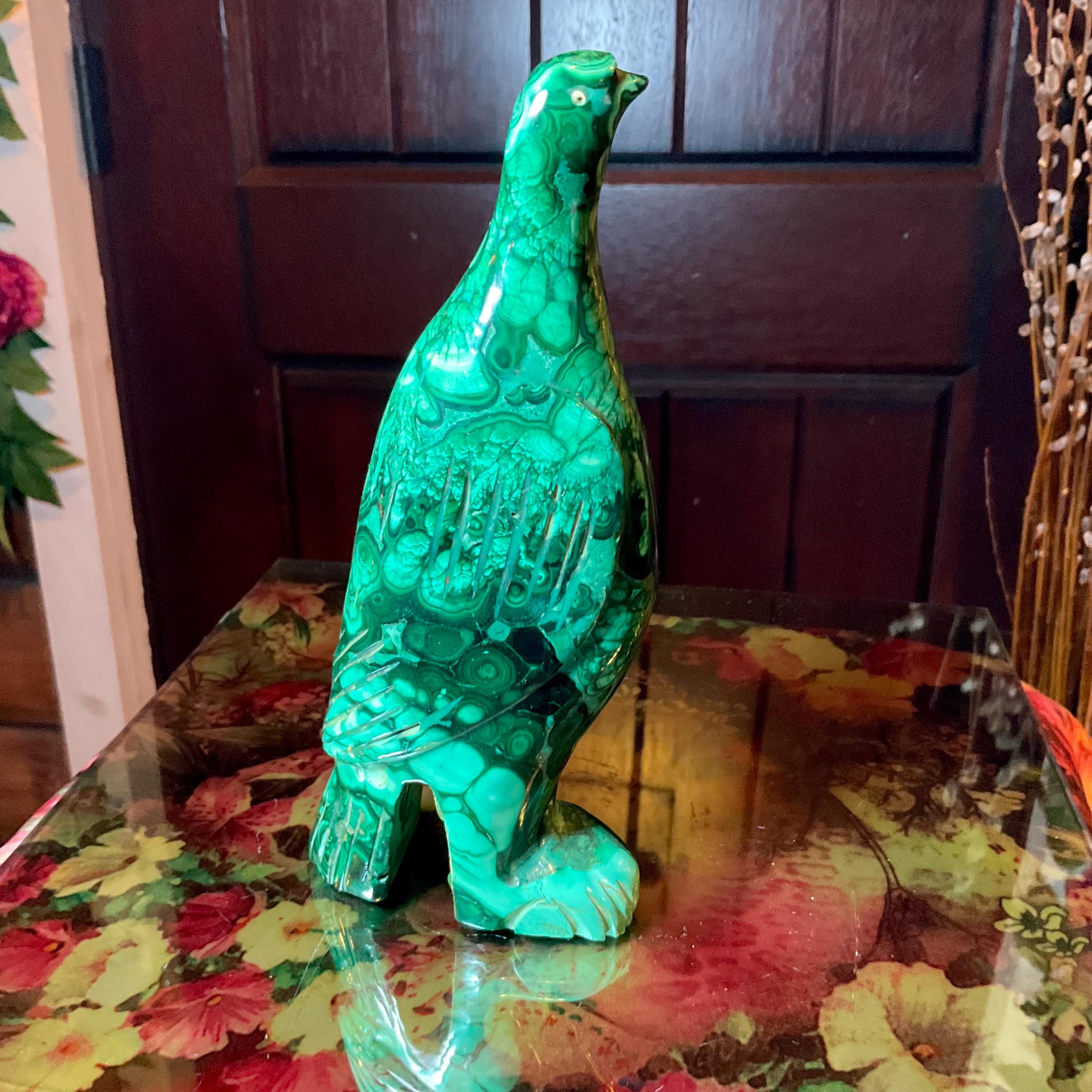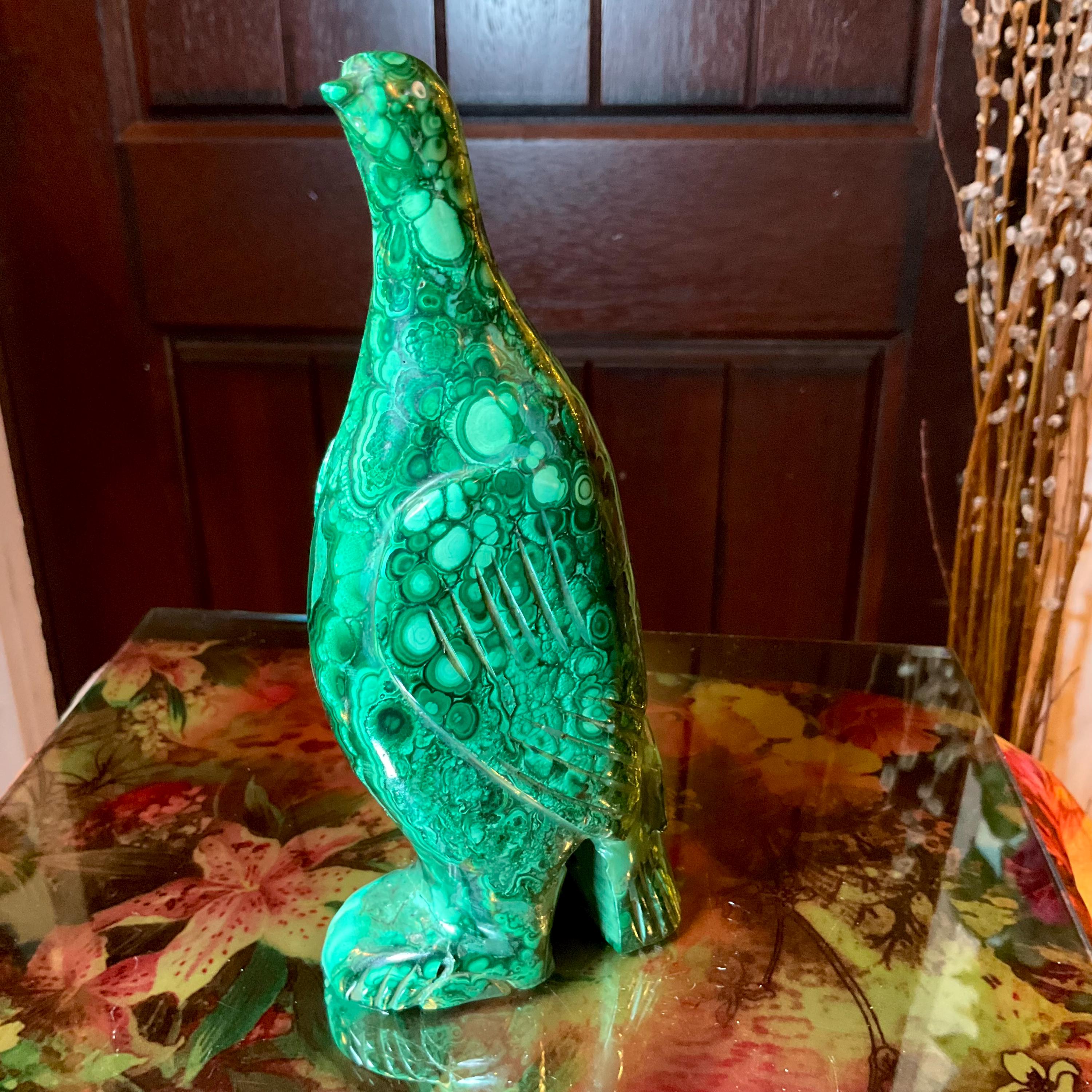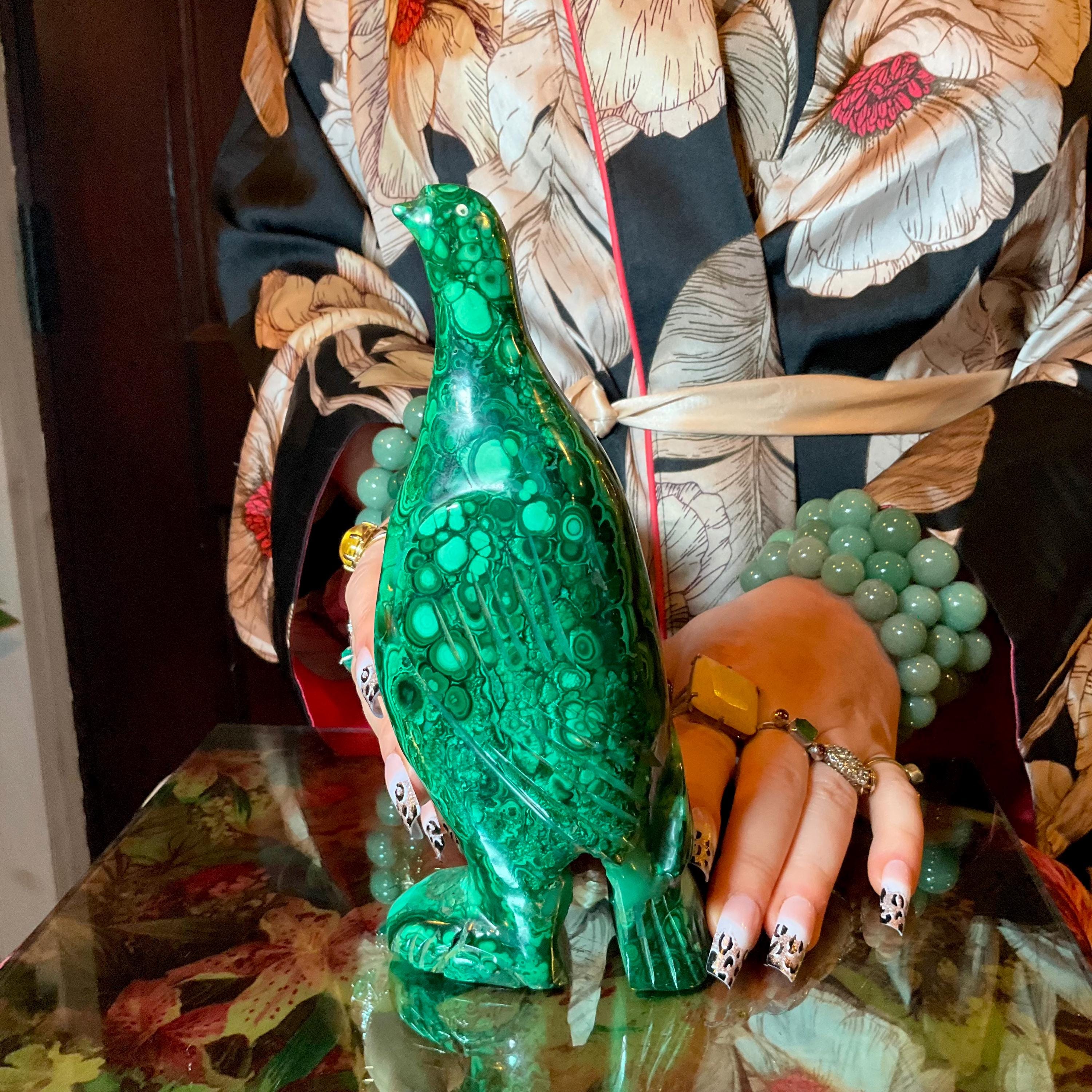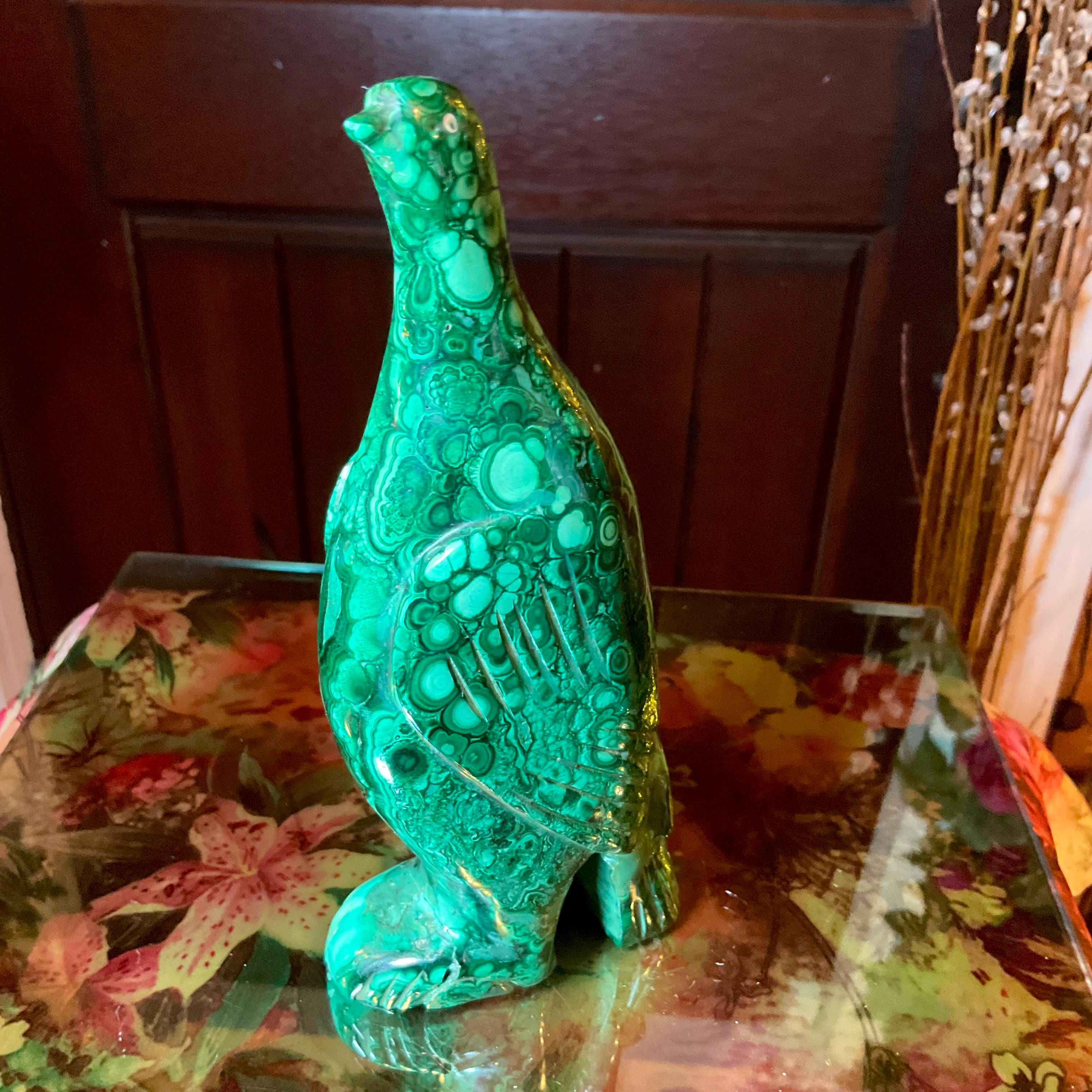 This is a one-of-a-kind carved malachite bird and comes from Congo.