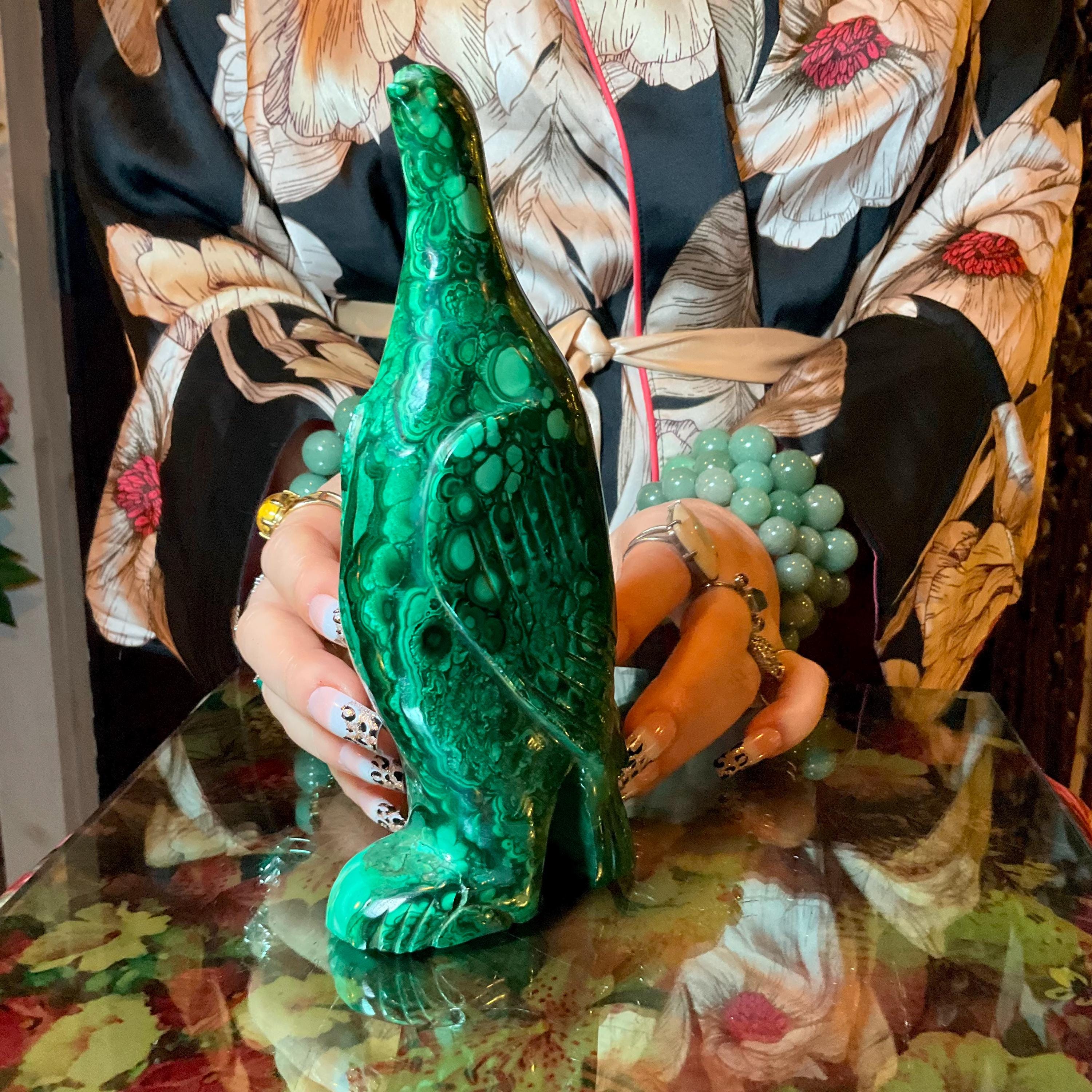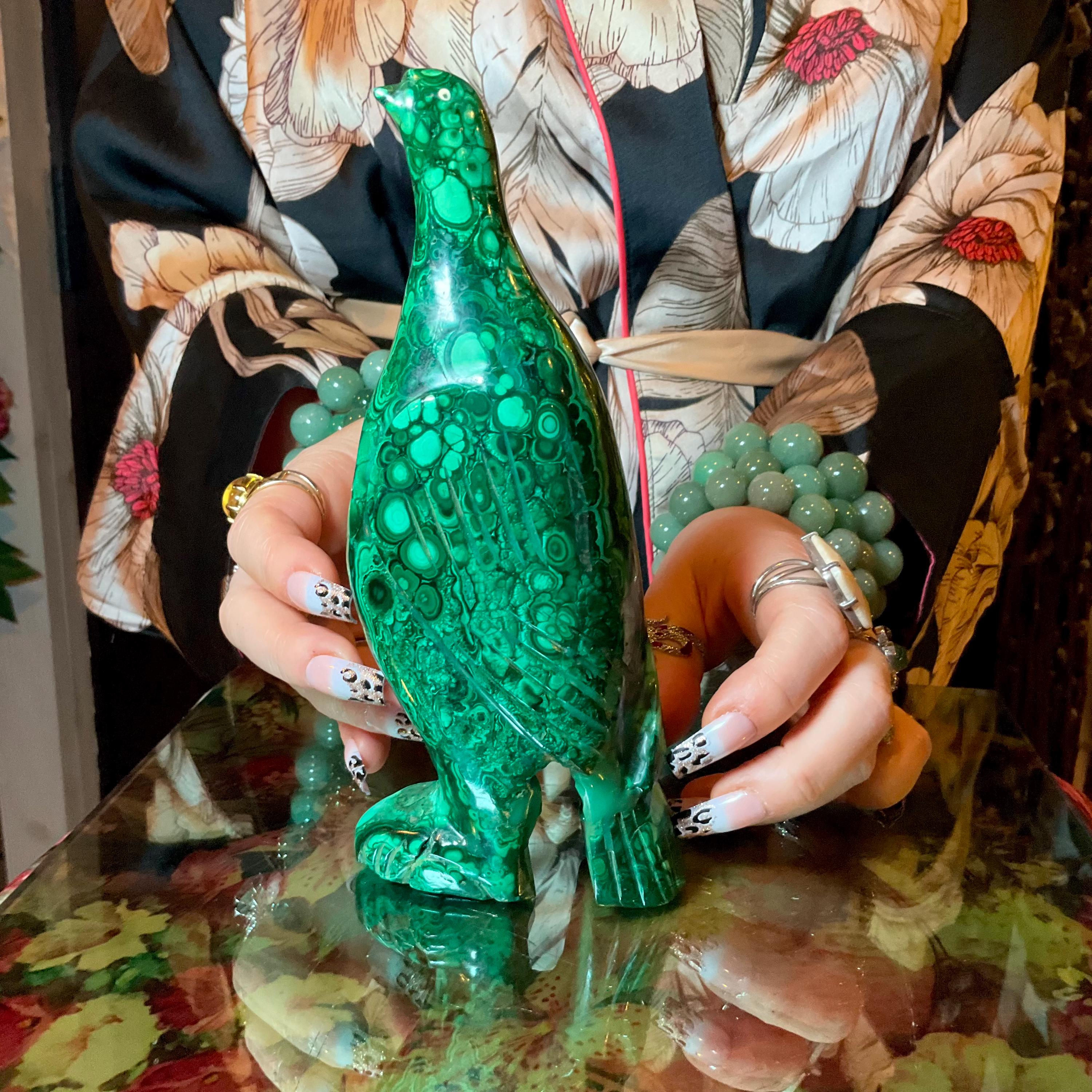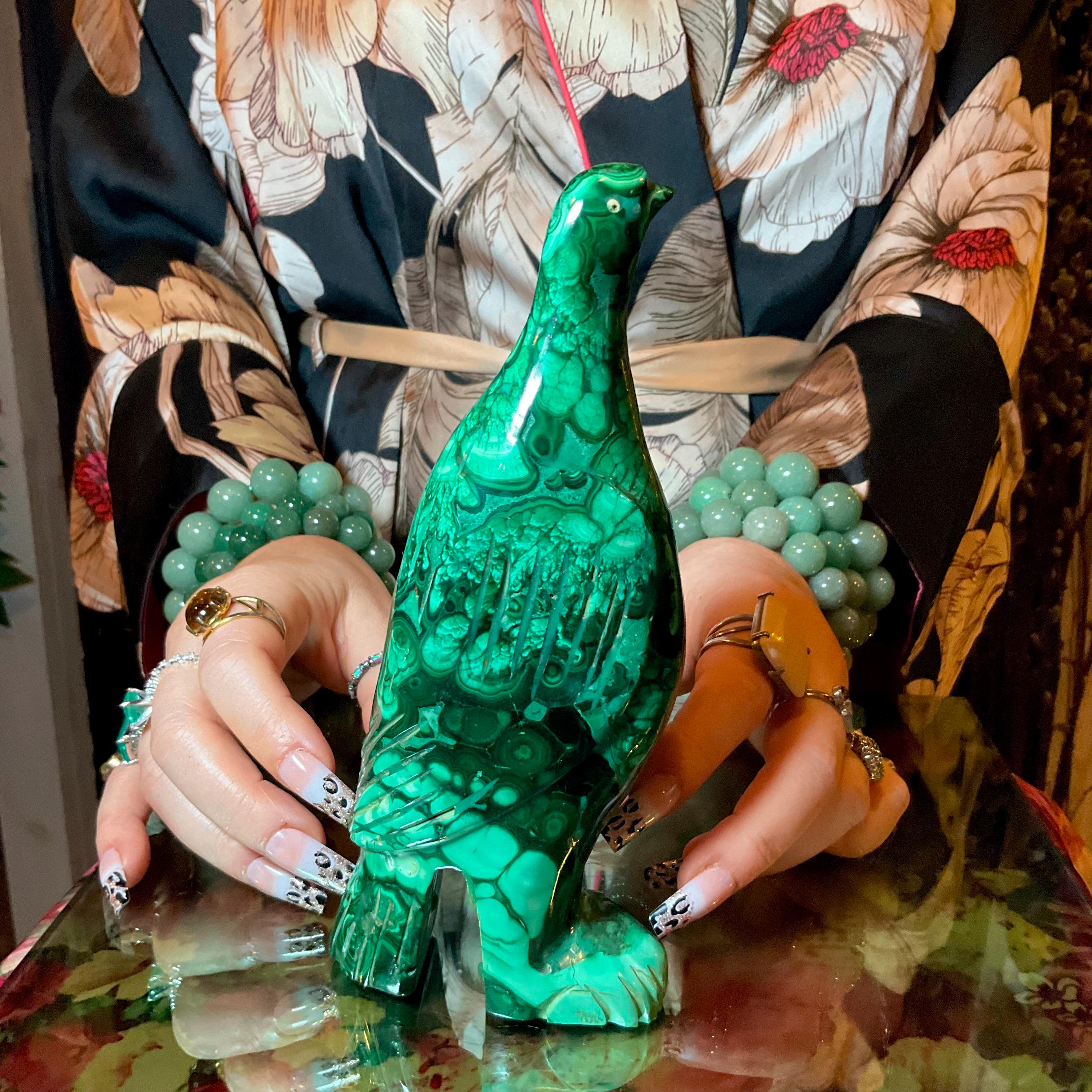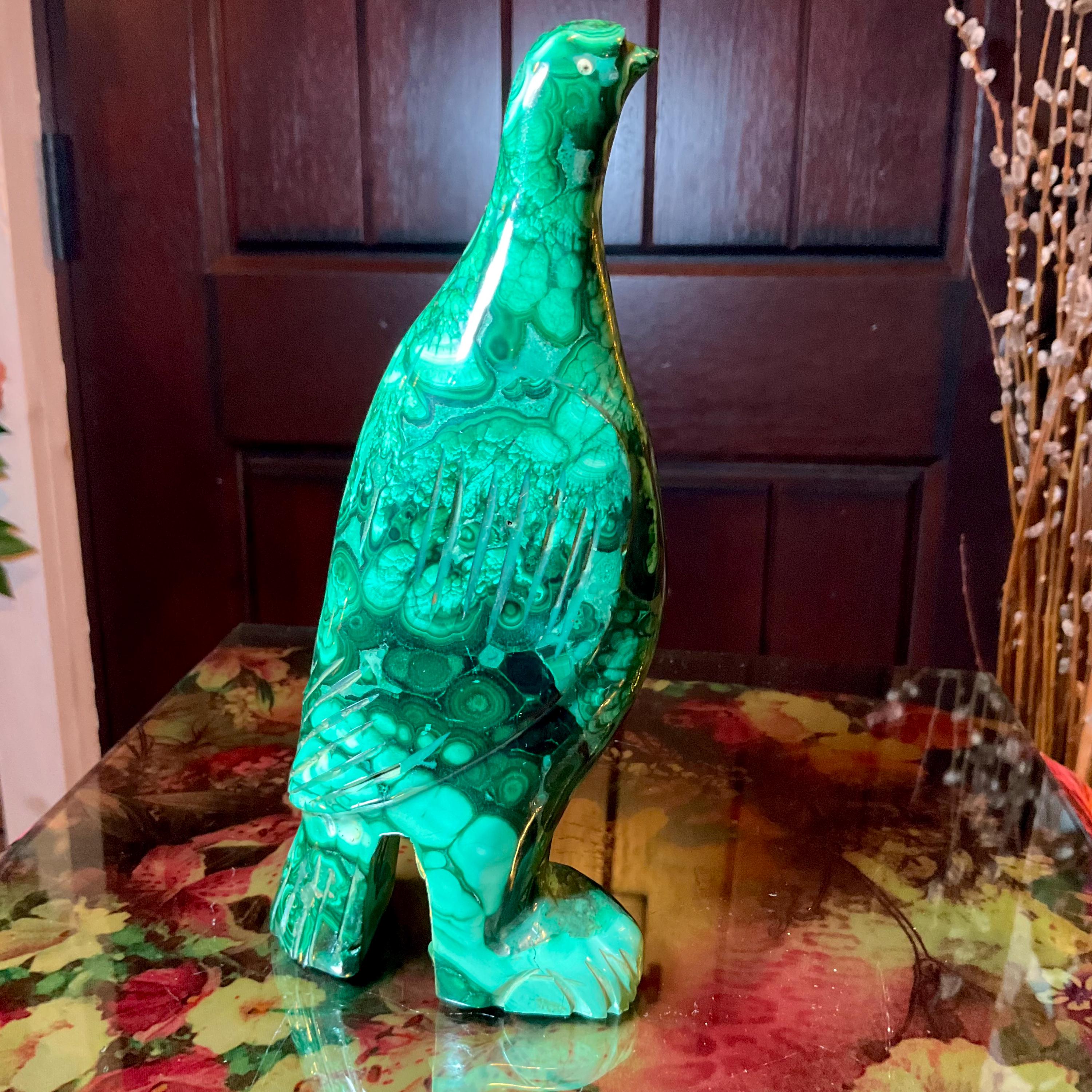 This is a one-of-a-kind carved malachite bird and comes from Congo.
