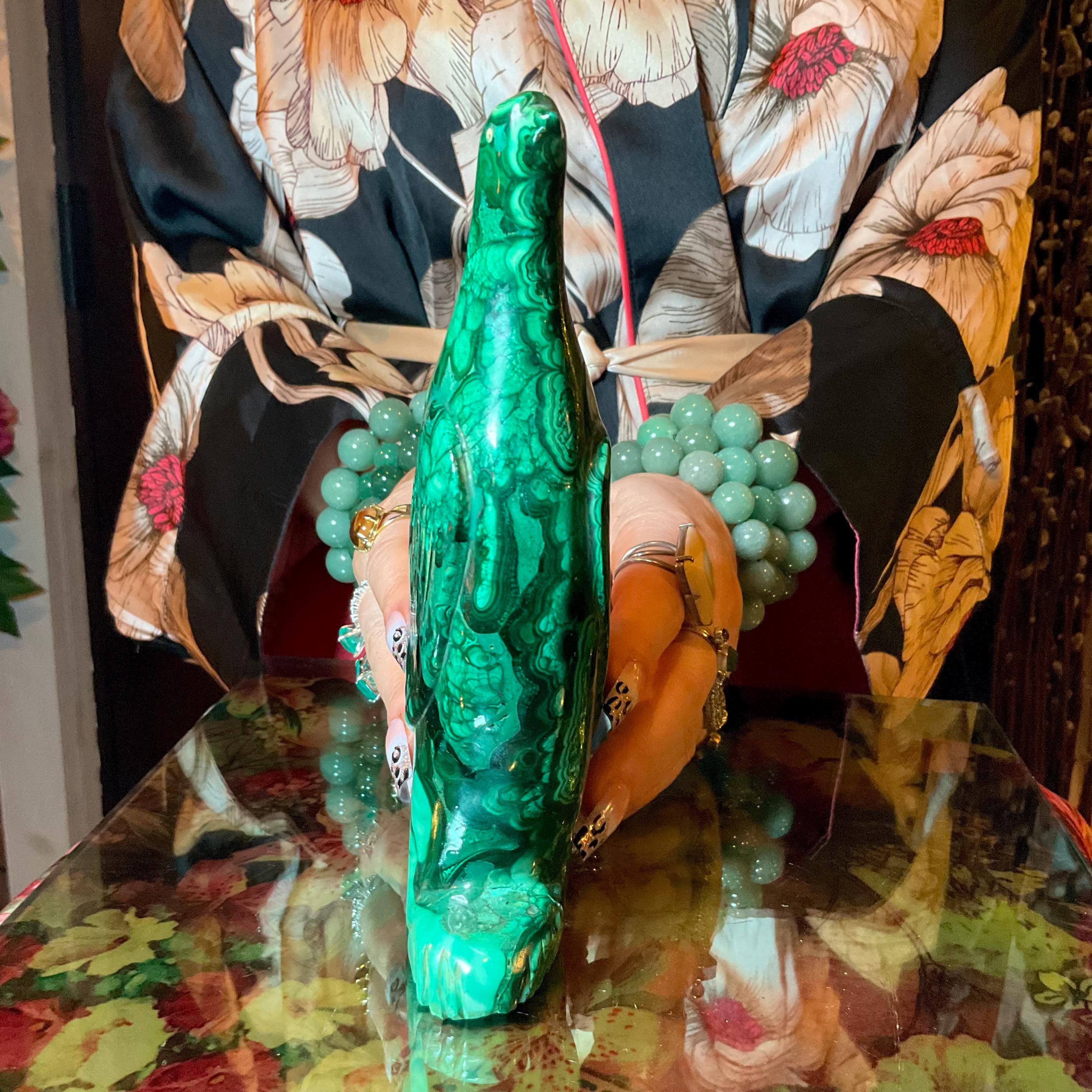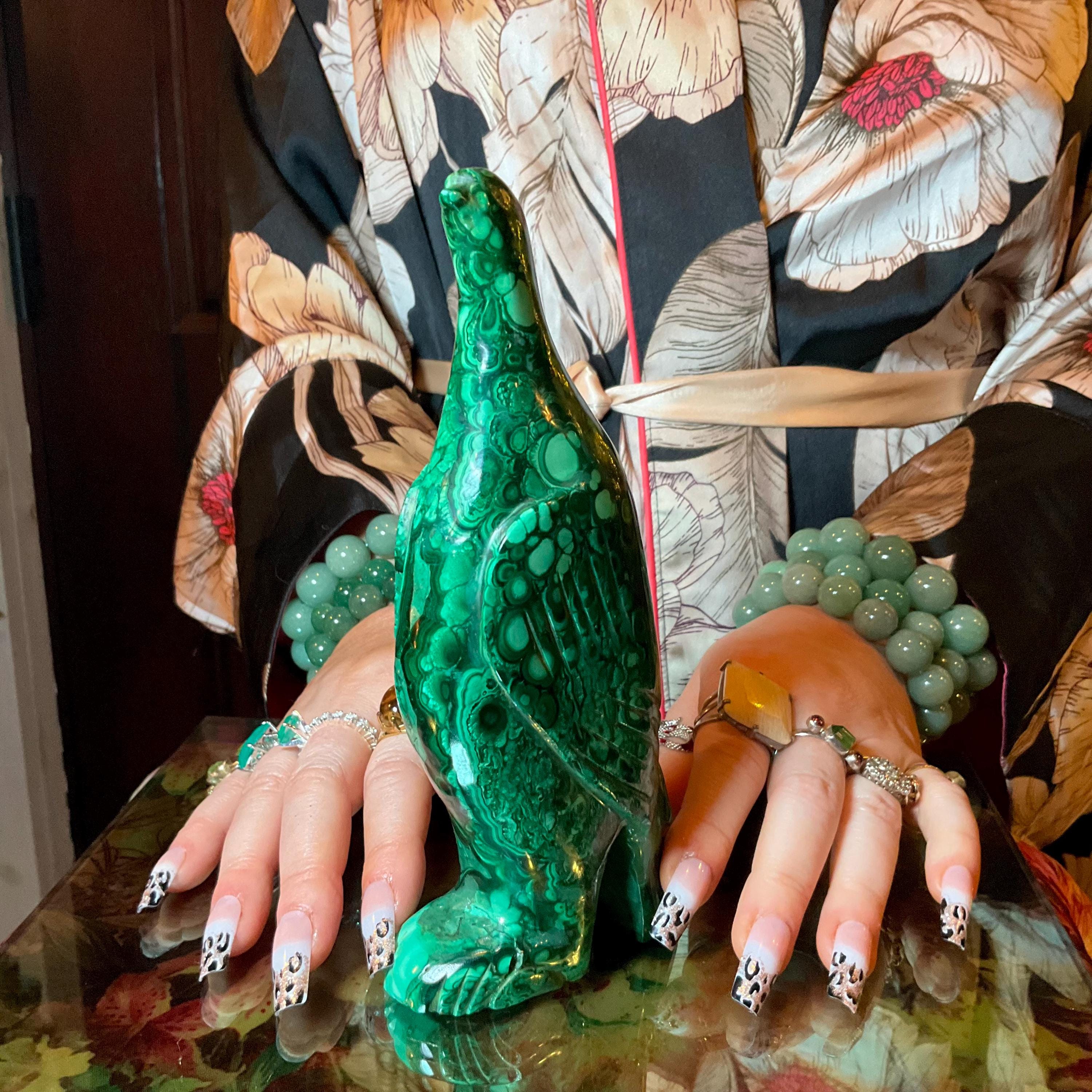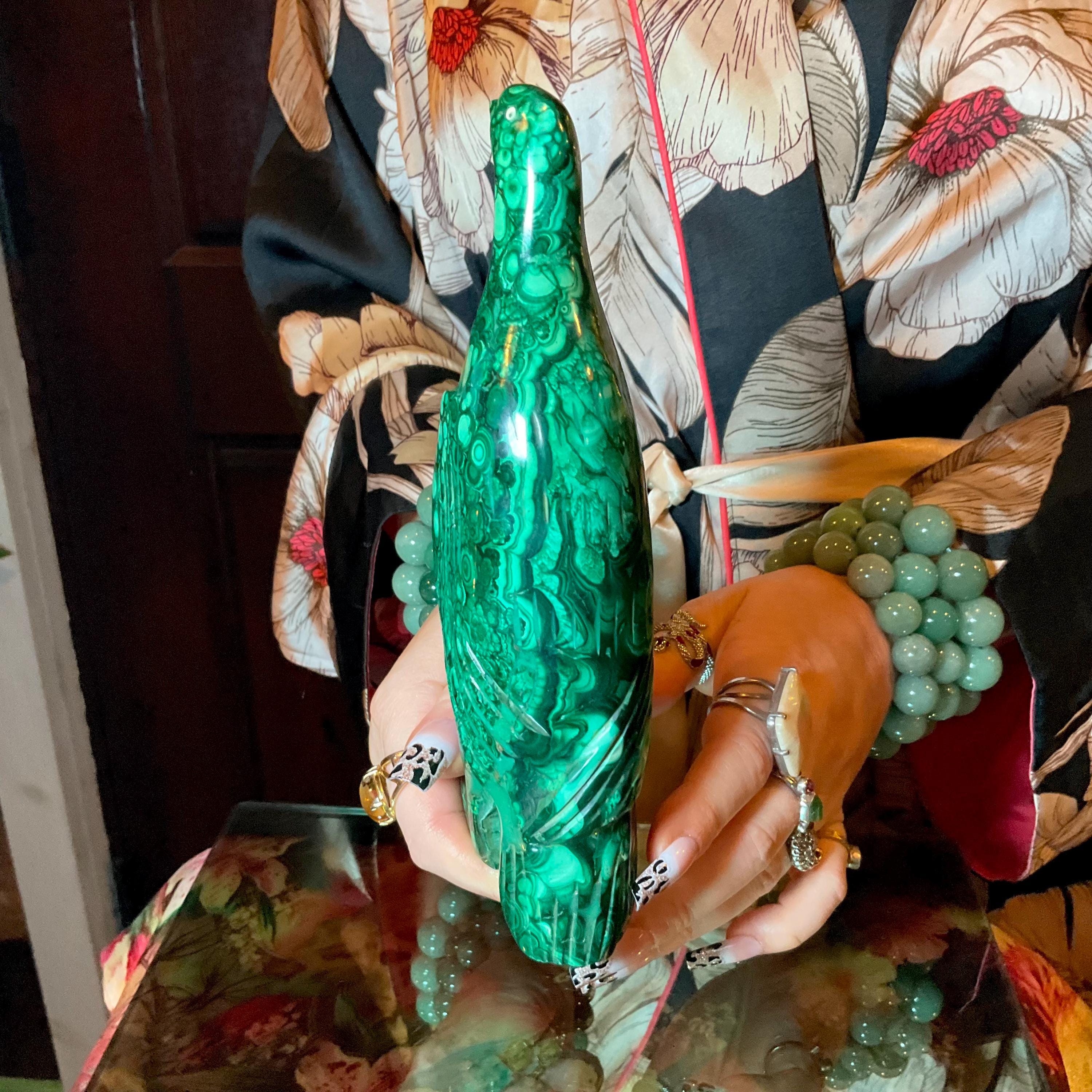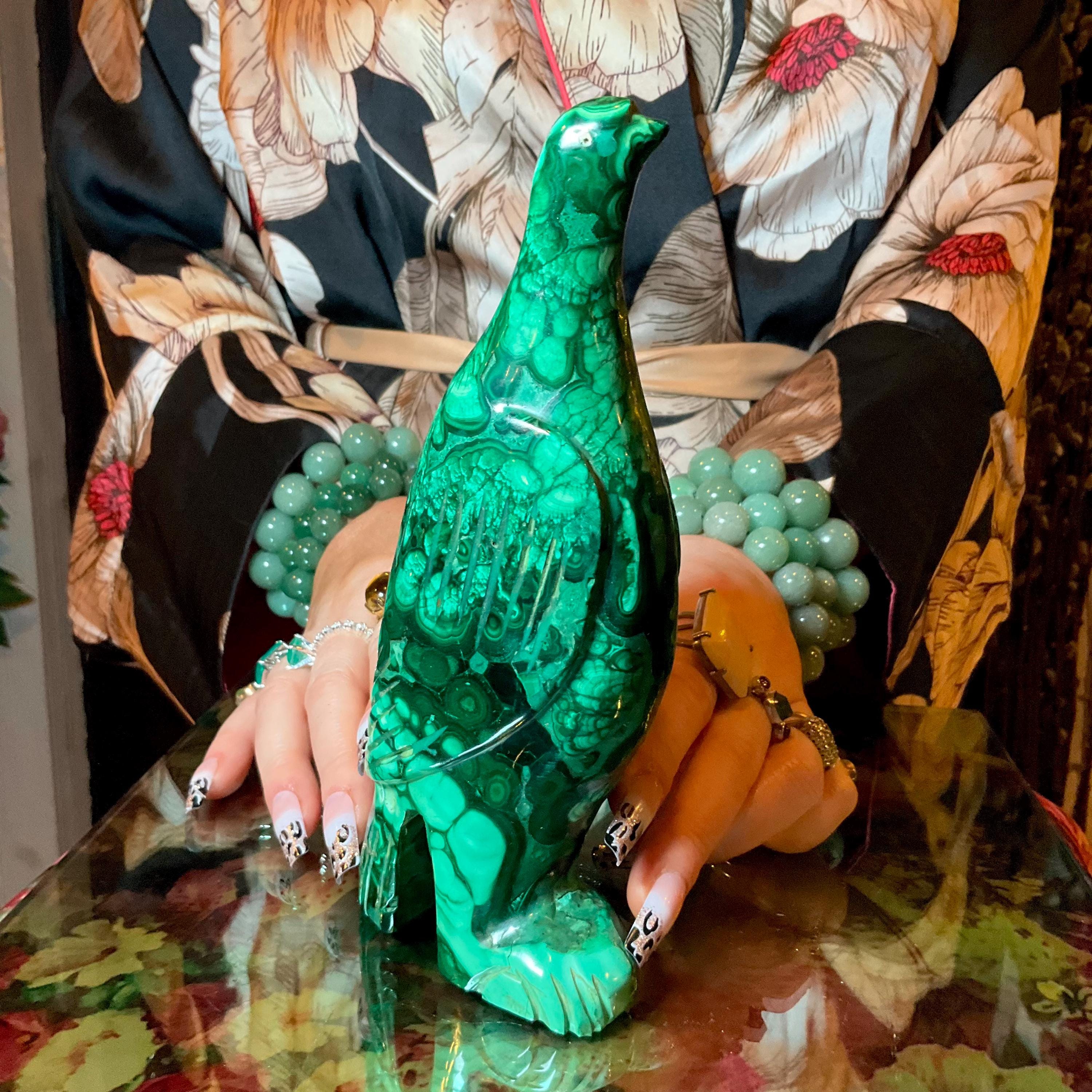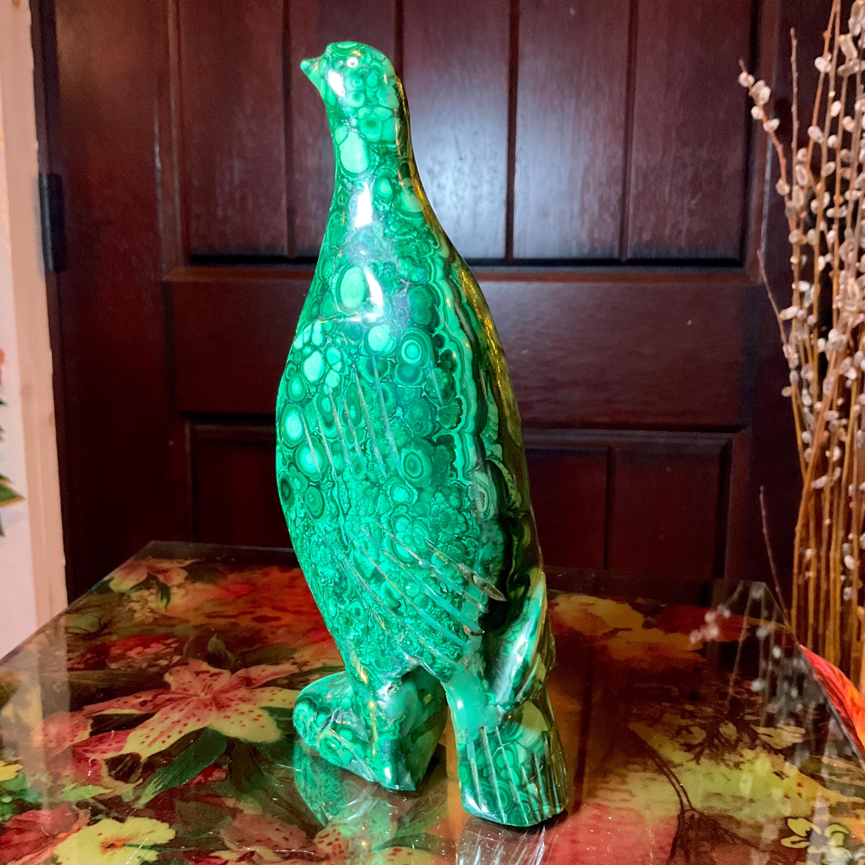 This is a one-of-a-kind carved malachite bird and comes from Congo.