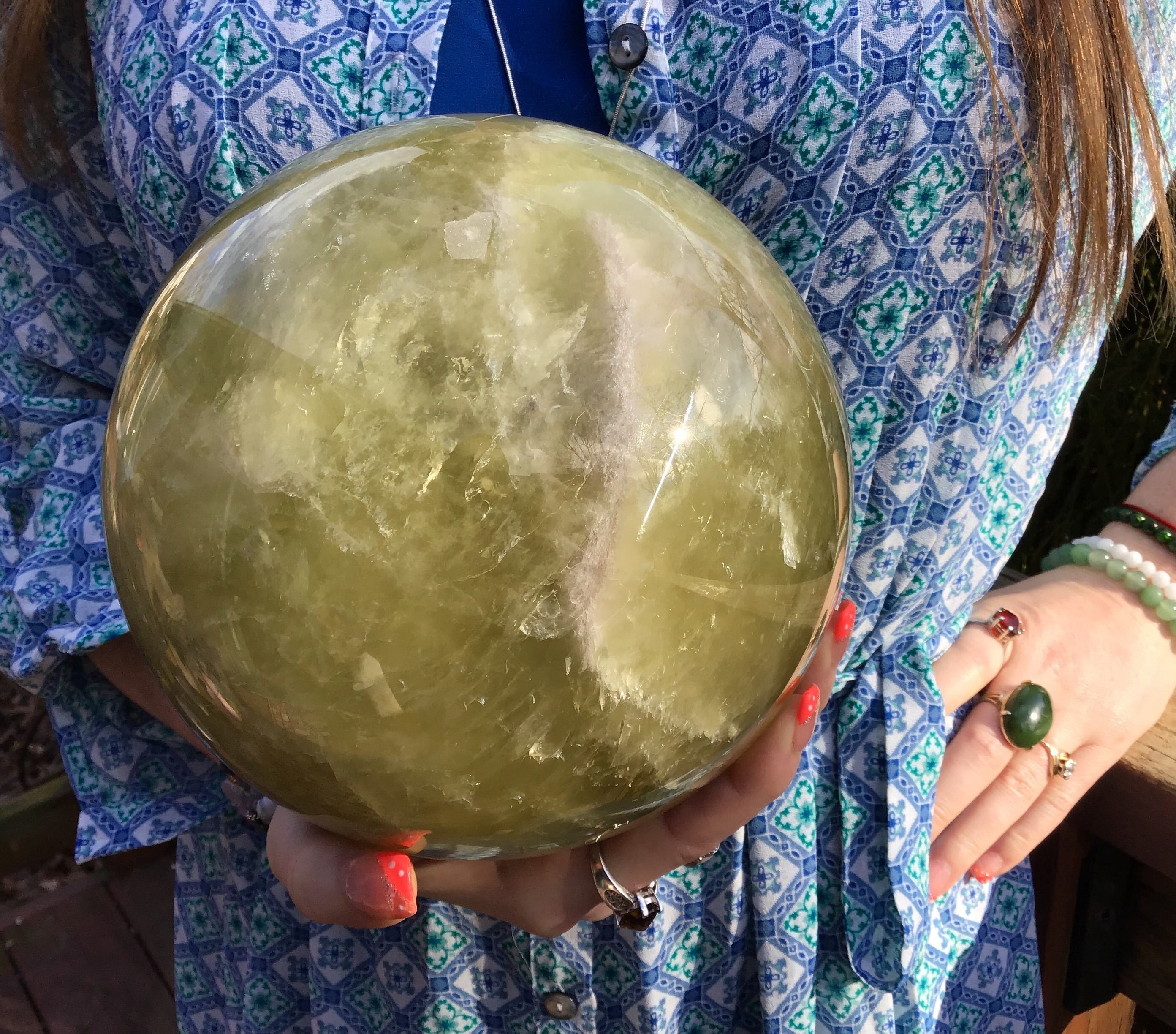 I am very happy to pass along this massive 13-pound yellow Citrine quartz crystal ball, which has been privately owned by my husband and me.