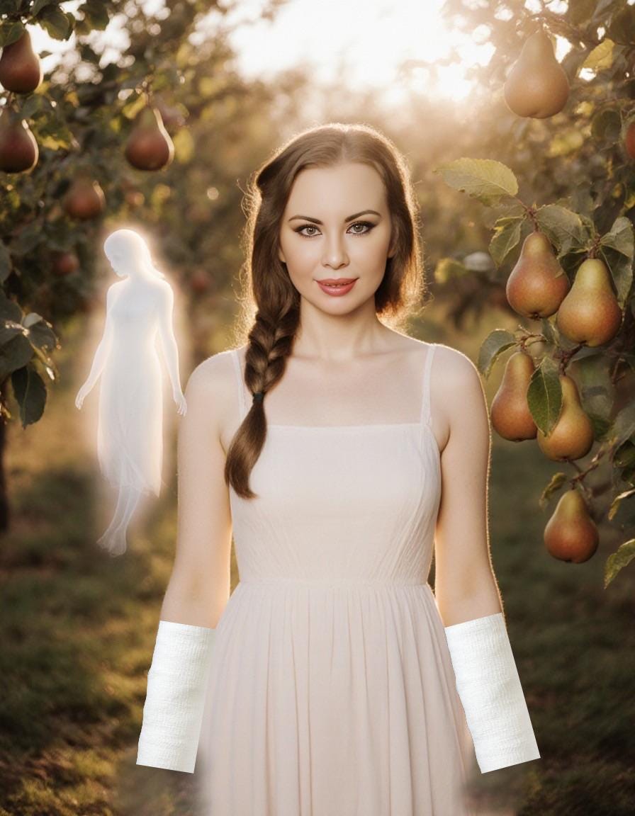 When she gets into the enchanting pear grove, she has a sense that it is watched over closely, and that every pear is numbered and accounted for. Β The kindly angelic spirit bends over one of the boughs of the pear tree, so that the handless maiden can reach up with her mouth and eat a single delicious pear.